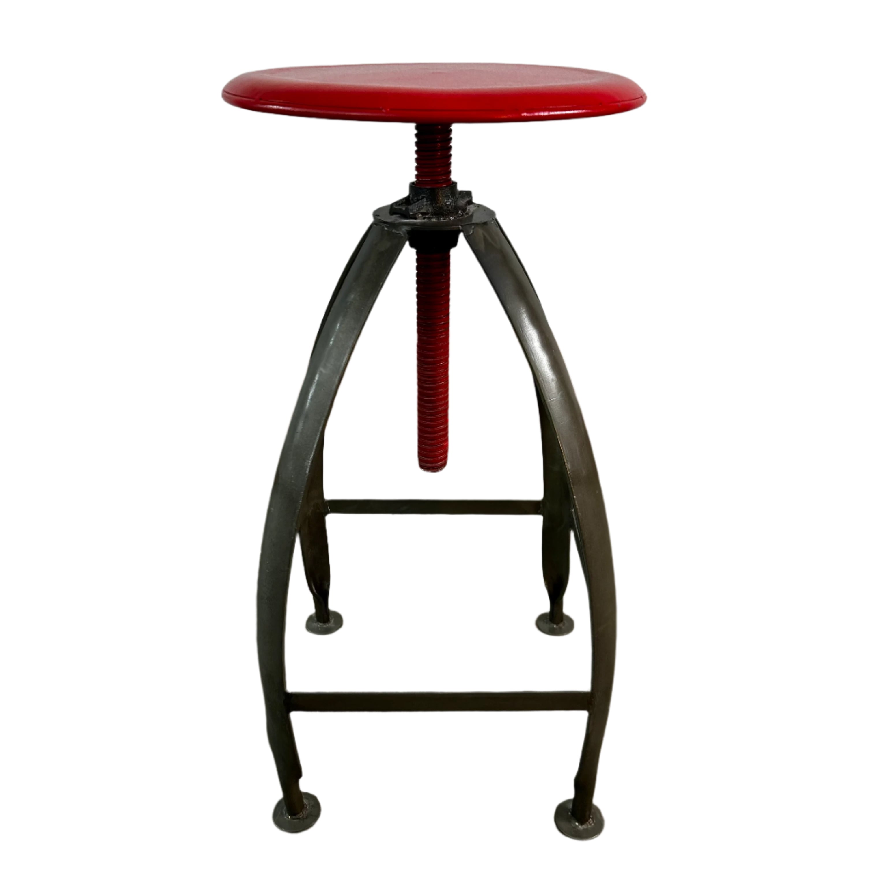 Metal stool, industrial in style, swivel seat, red top and screw. Stool is heavy weight and strong, legs have metal pads at the bottom.