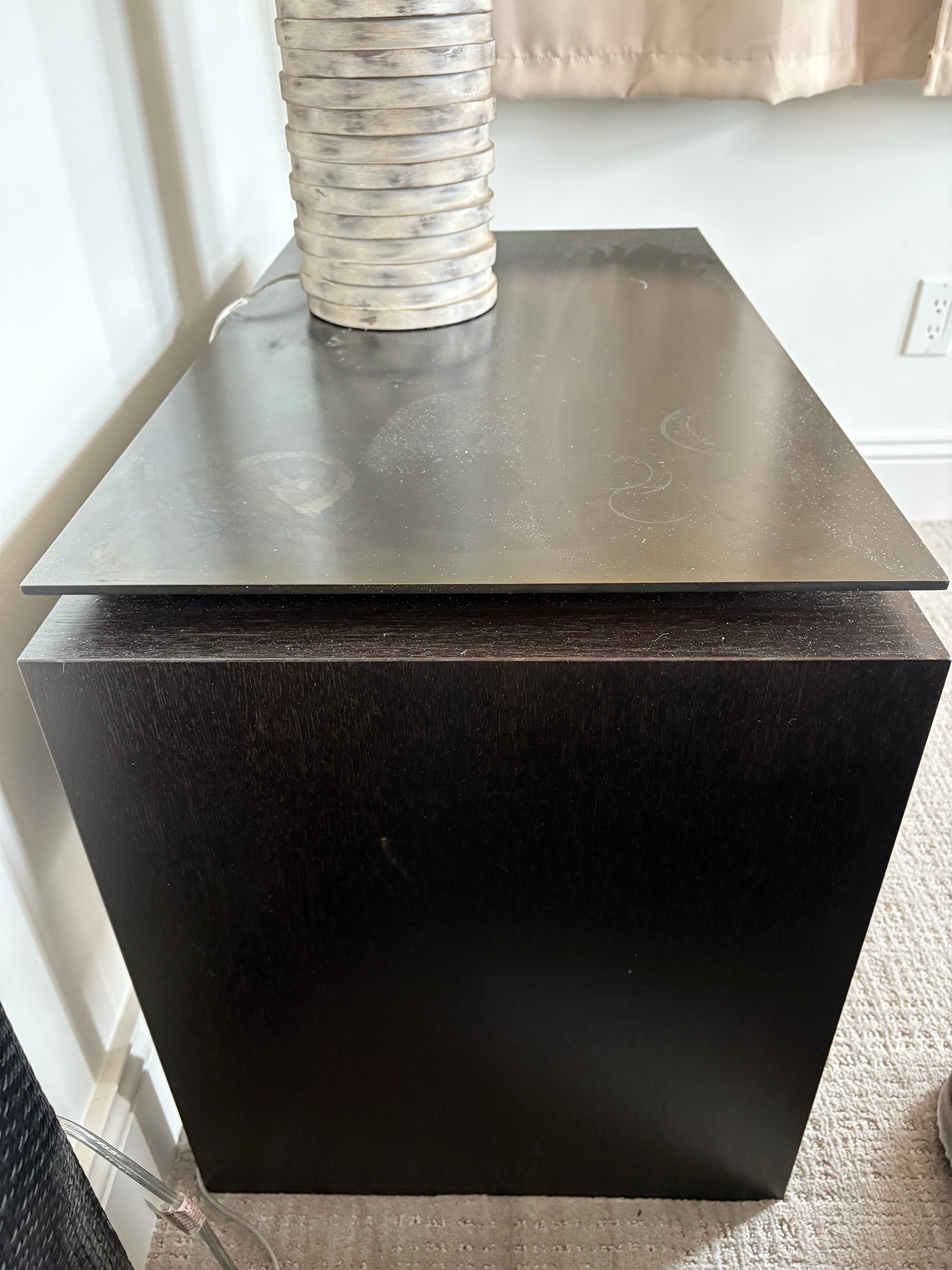 Metal Top & Wood Night Stands or End Tables. Sold as a pair. Note: bed and lamps in gallery images sold separately.