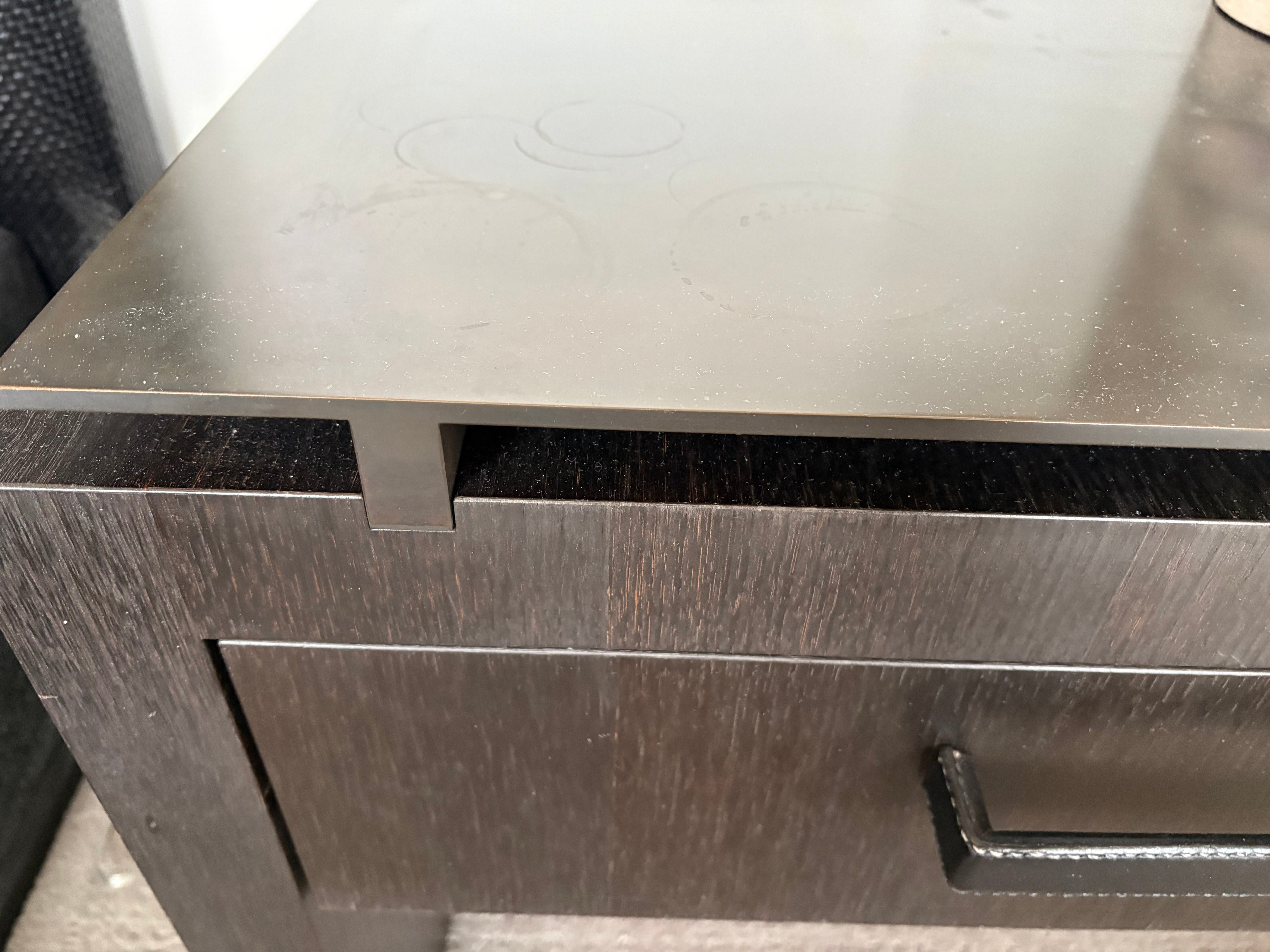 Condition: gently used, excellent. Shows some minor cup rings on top of the metal. Frameworks are structurally sound. Drawers pull easily.