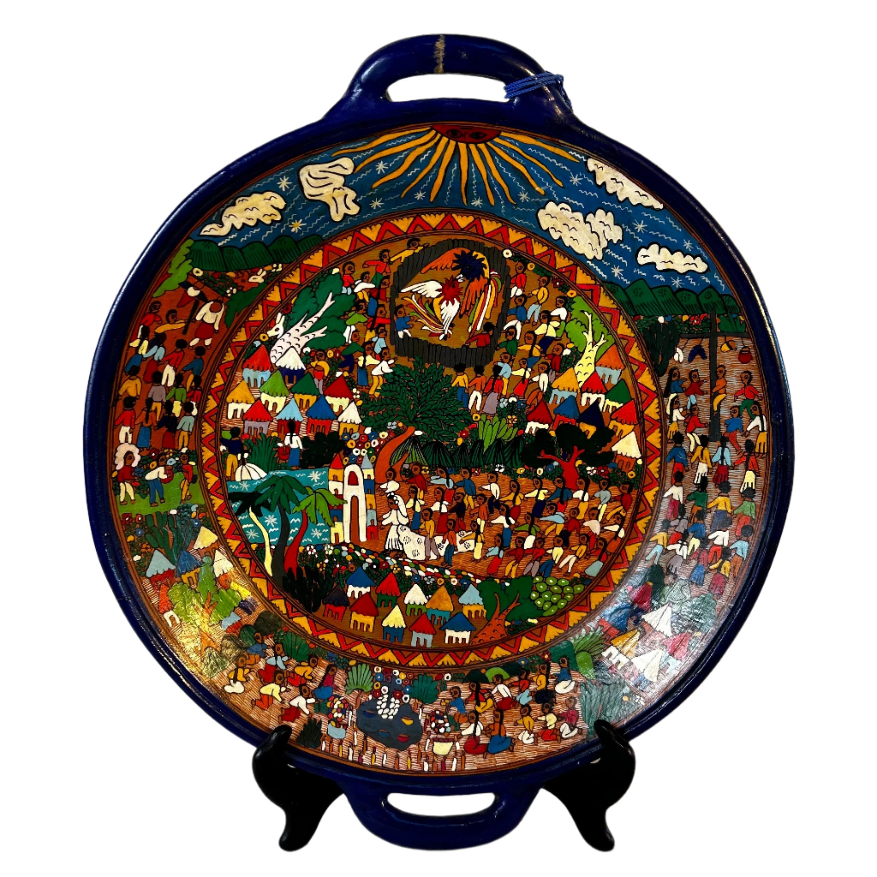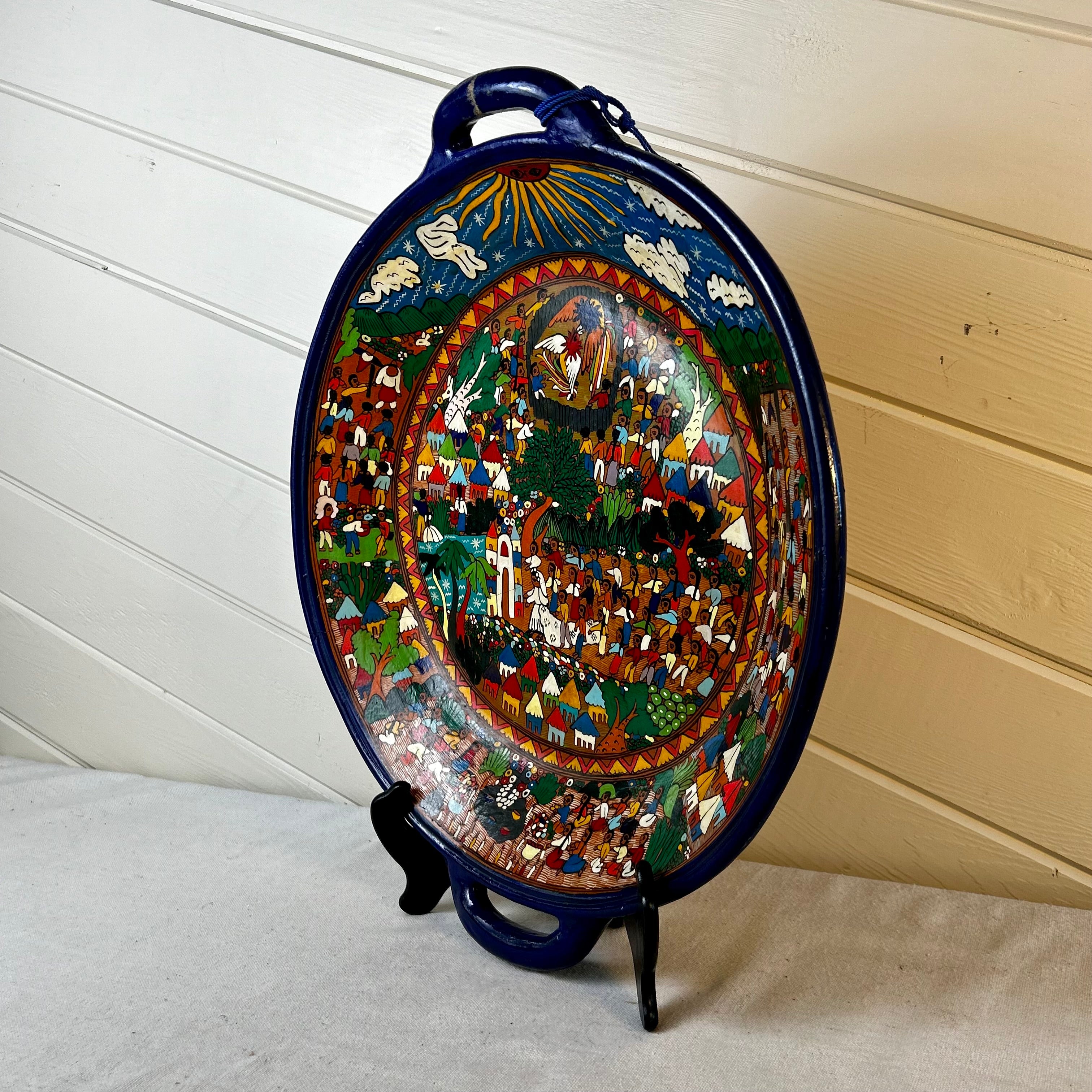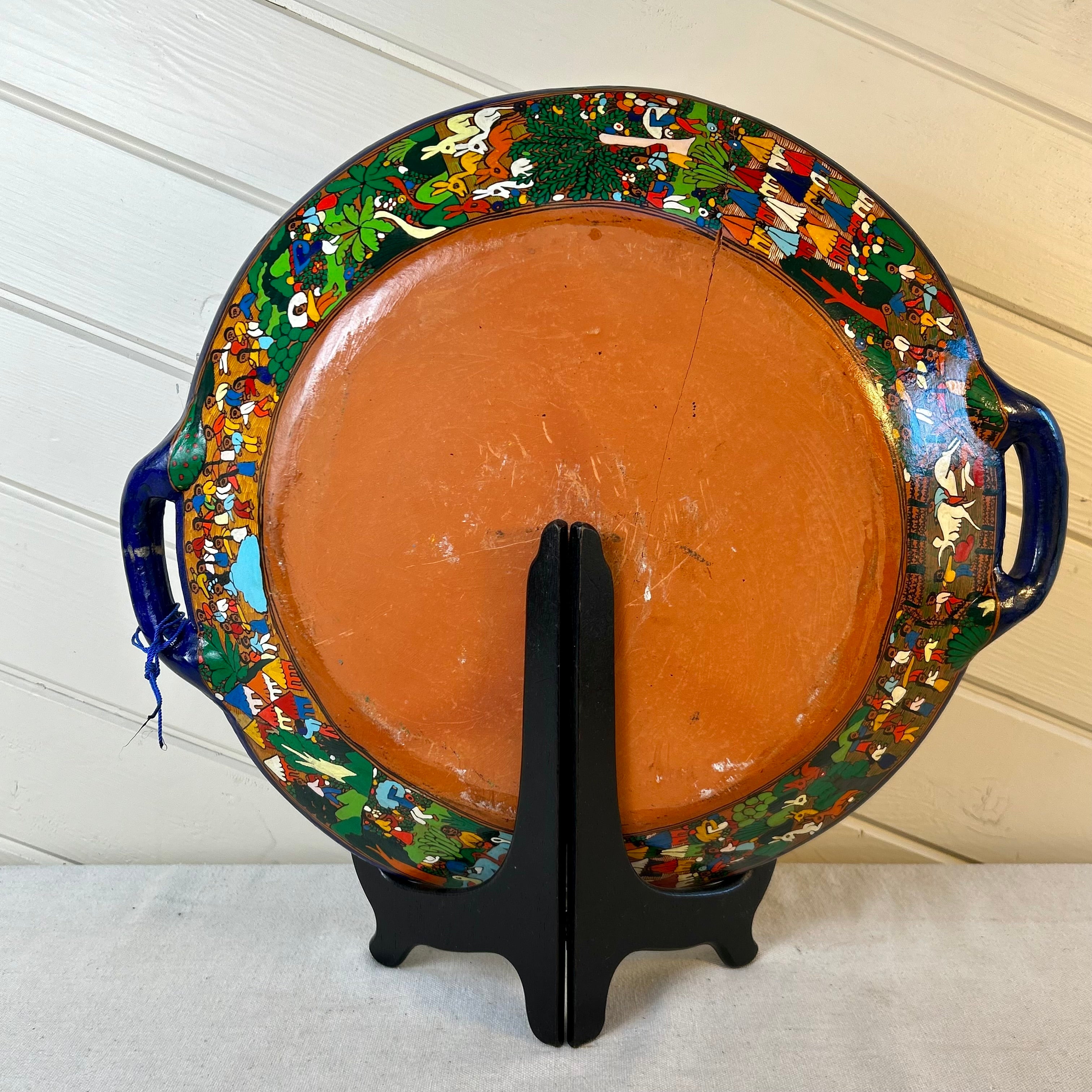 Mexican Serving Platter, Hand Painted on Wood Stand. Features intricately painted scene depicting daily life in multiple bright colors.
