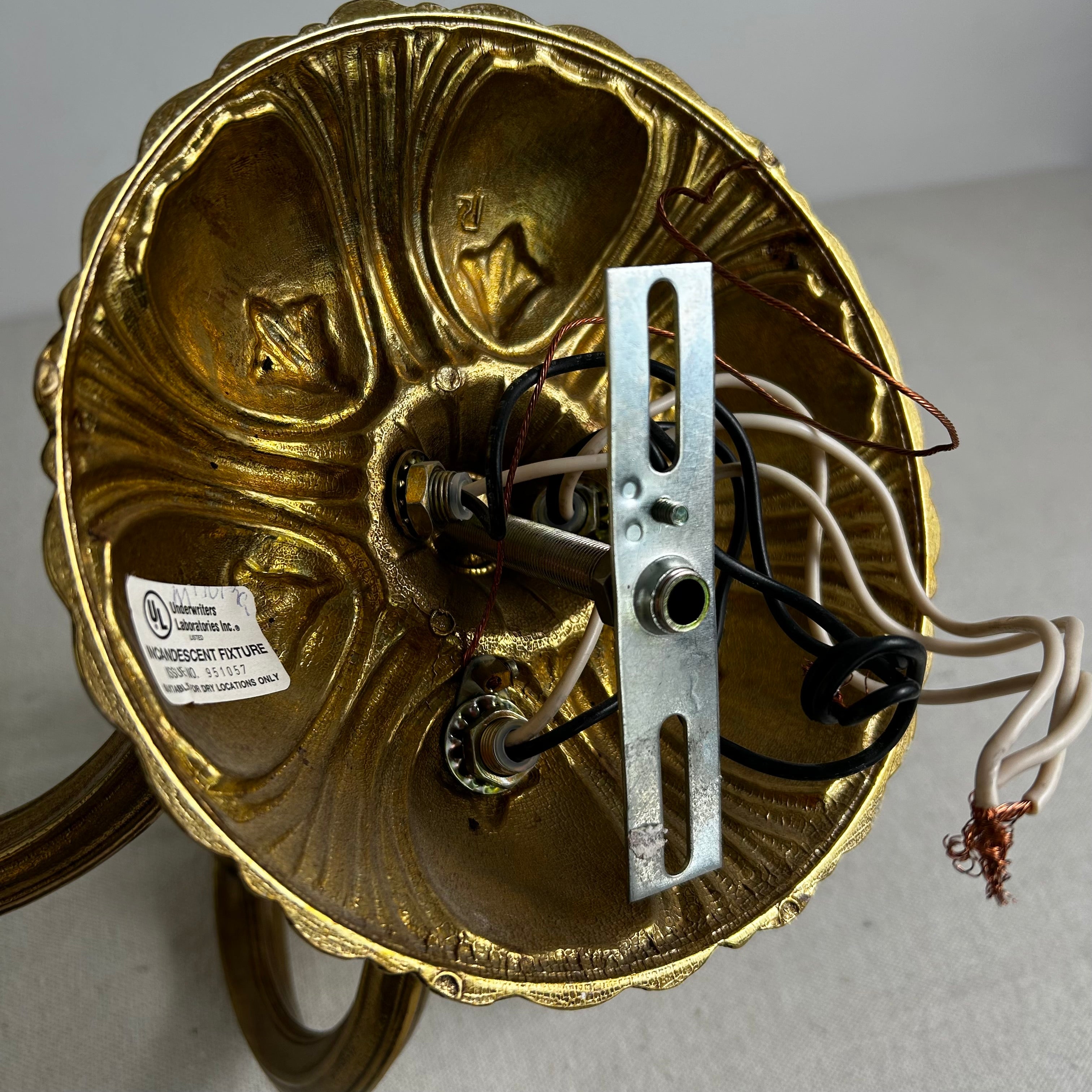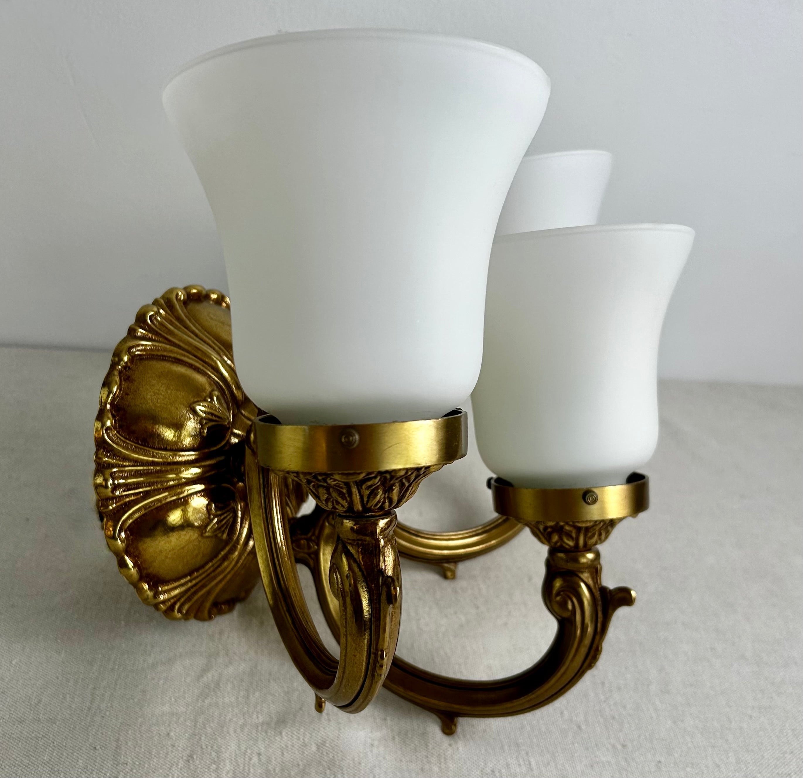 Minka wall sconce light, three frosted glass shades, brass base/arms, Ornate in style. Shades are included in price.