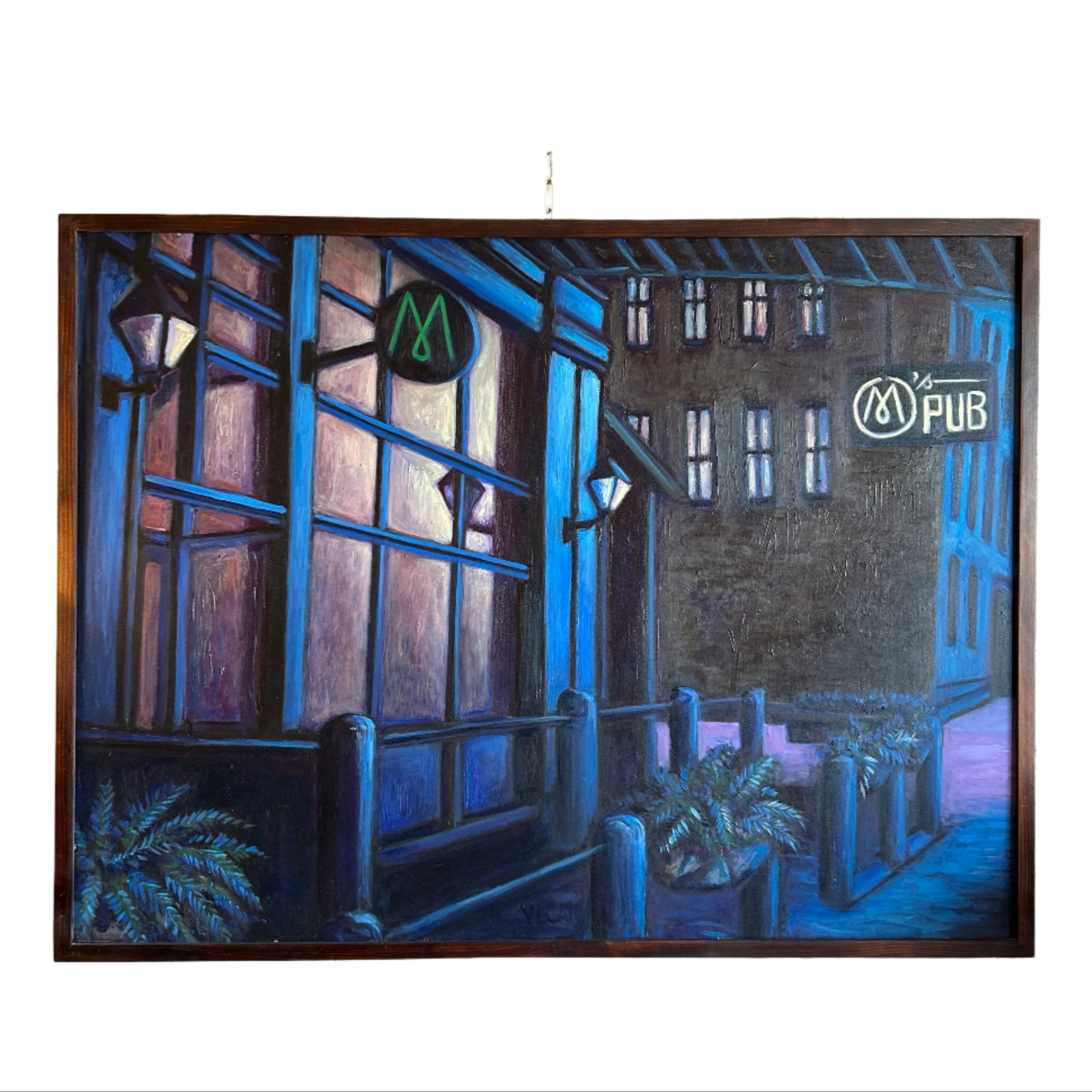 Jeremy Vlican, "M's Pub Nocturne" painting, original work, oil on canvas (possibly acrylic). Vlican is an Omaha, NE based artist.