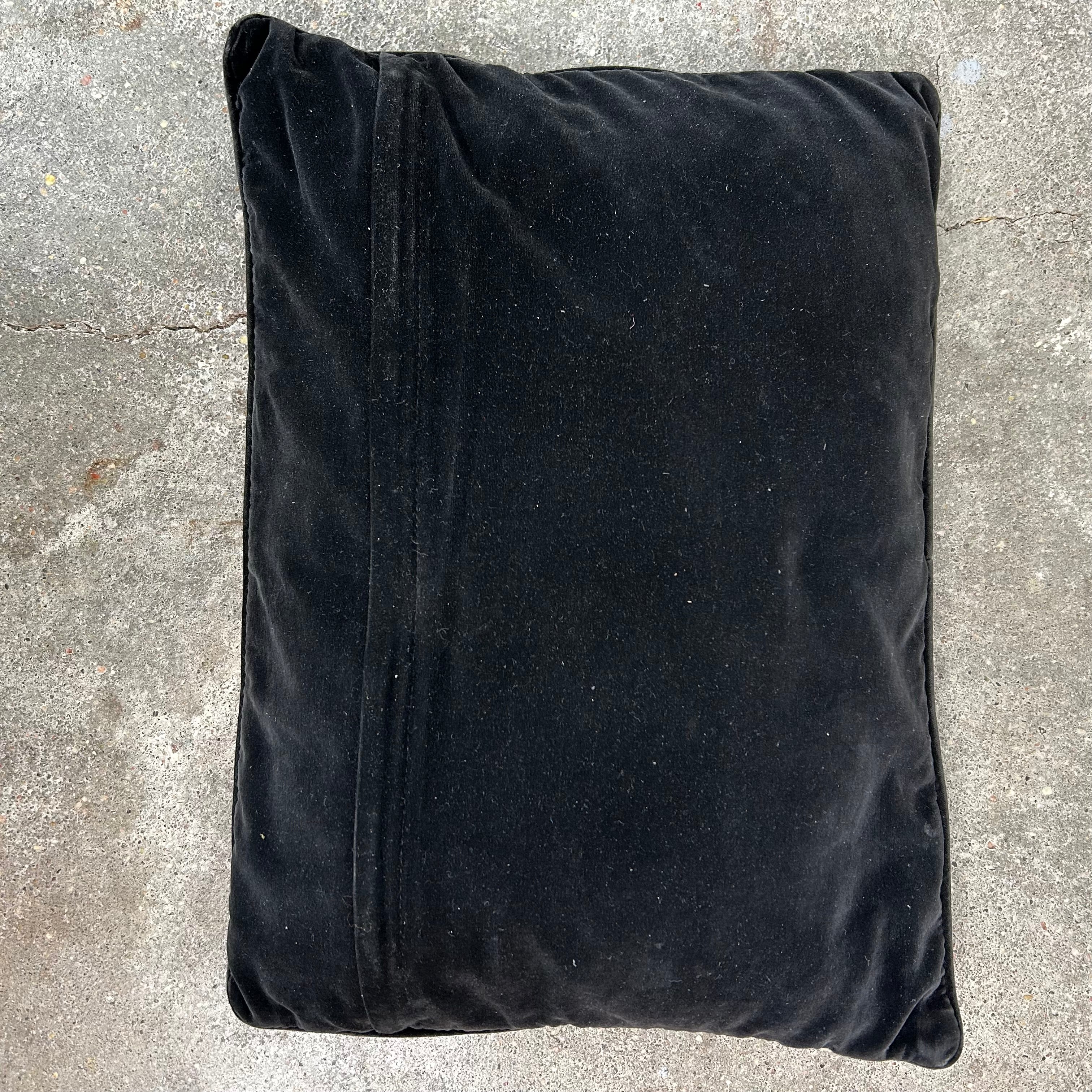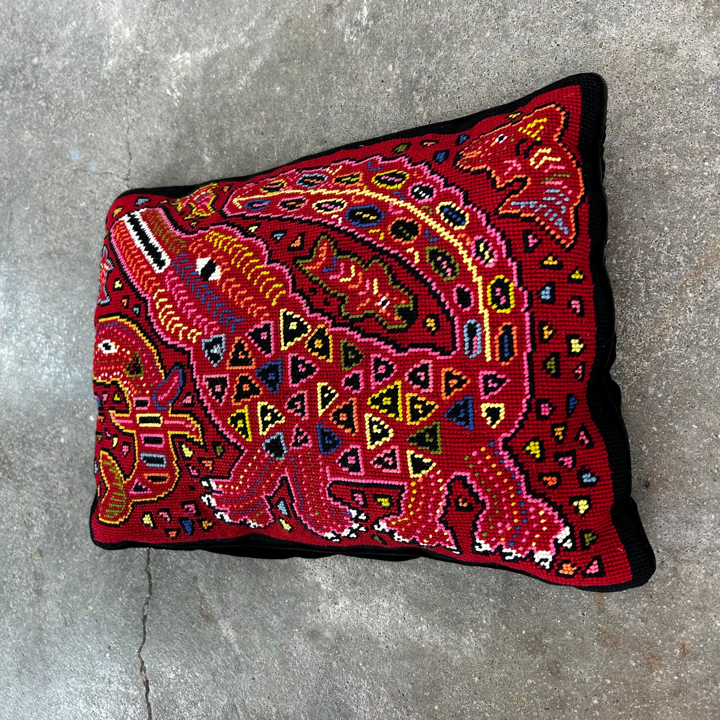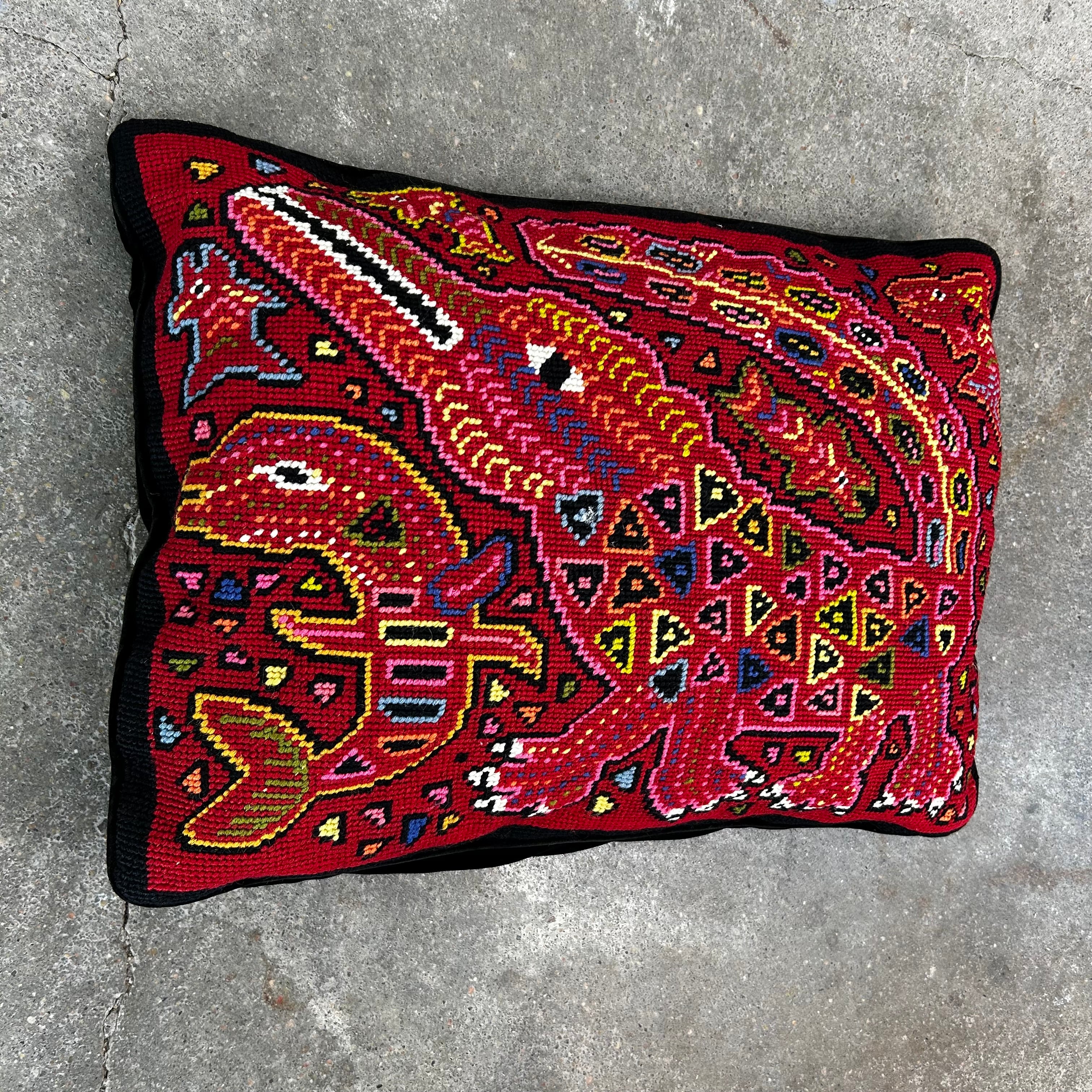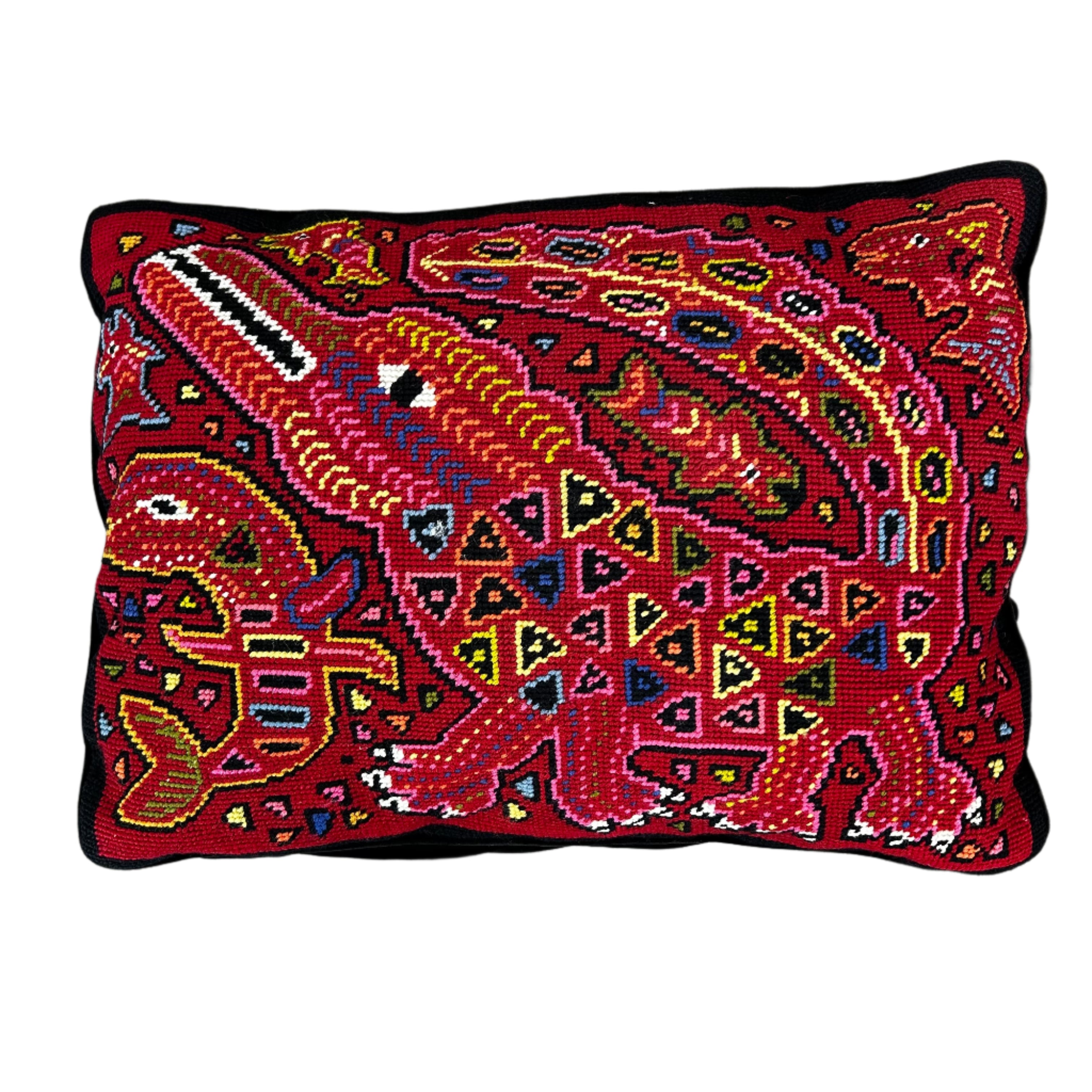 Needlepoint pillow of an alligator with velvet back, primarily in colors of red.