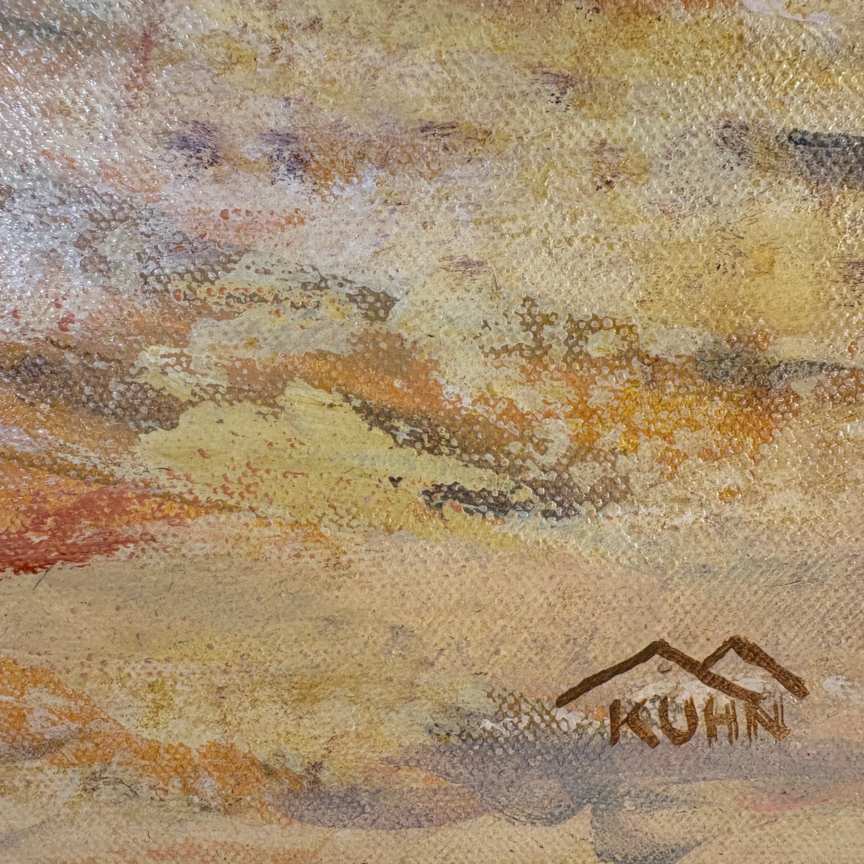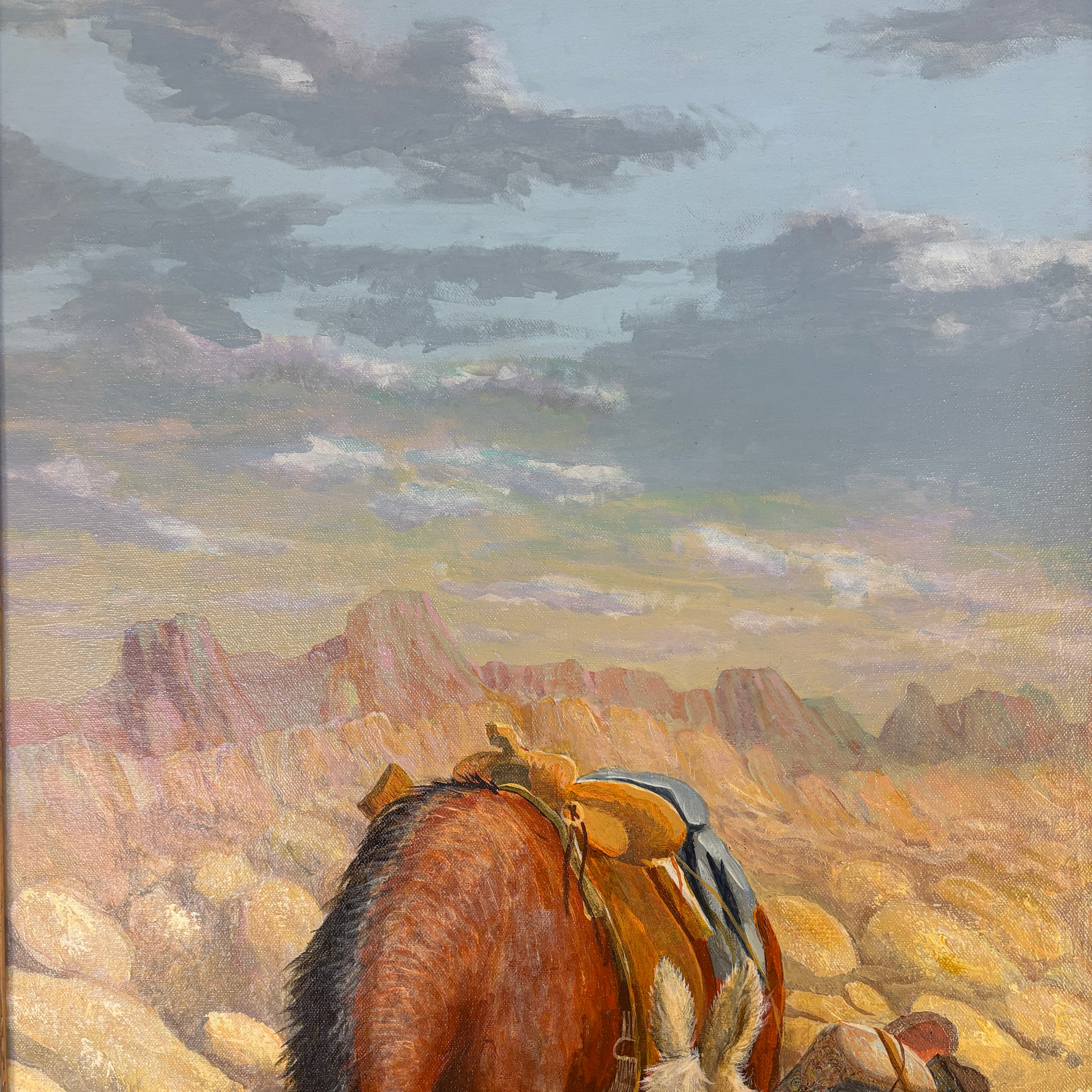 Original Art, Acrylic on Canvas, Artist: Kuhn, "Waterbreak" Horse, Cowboy and Mule. Framed.