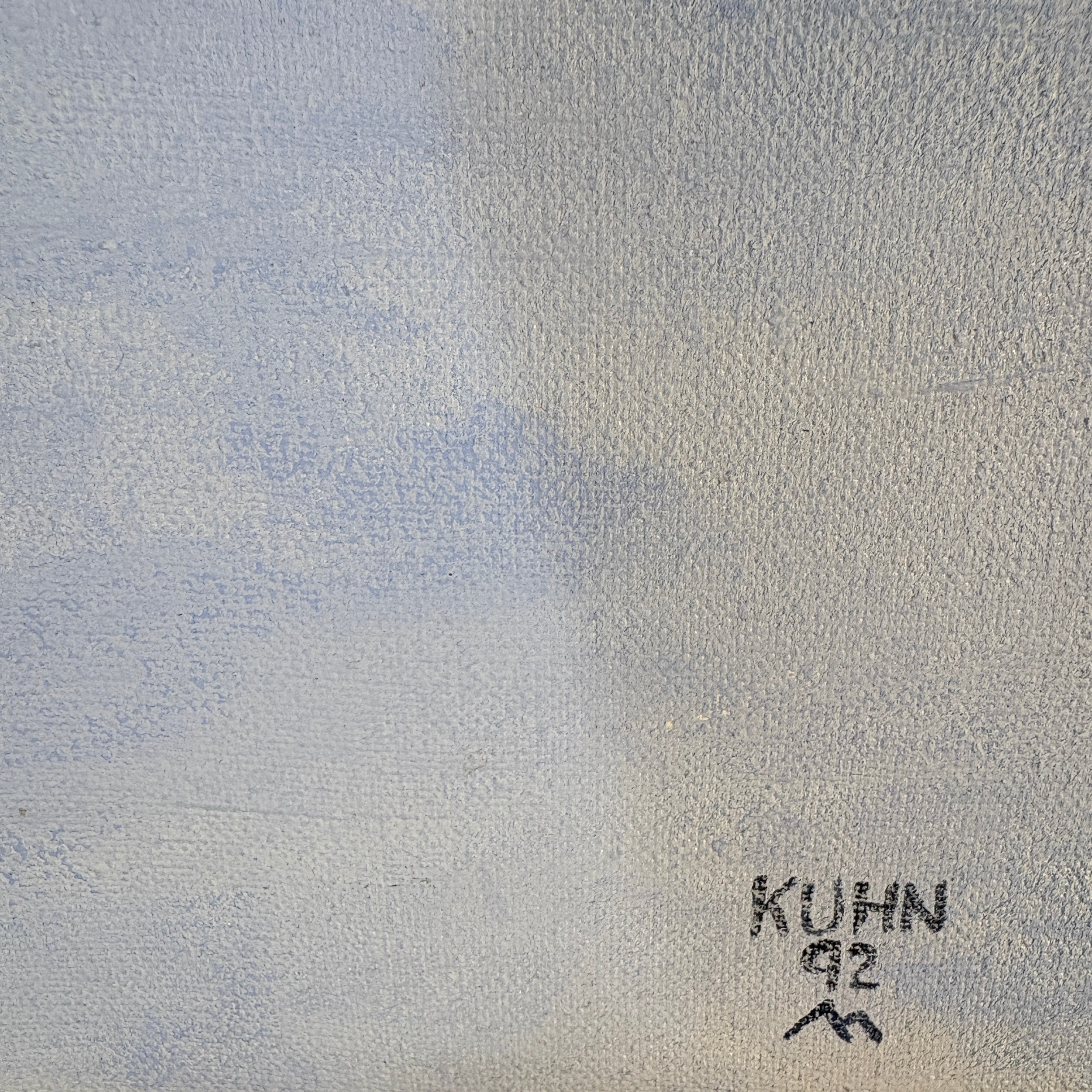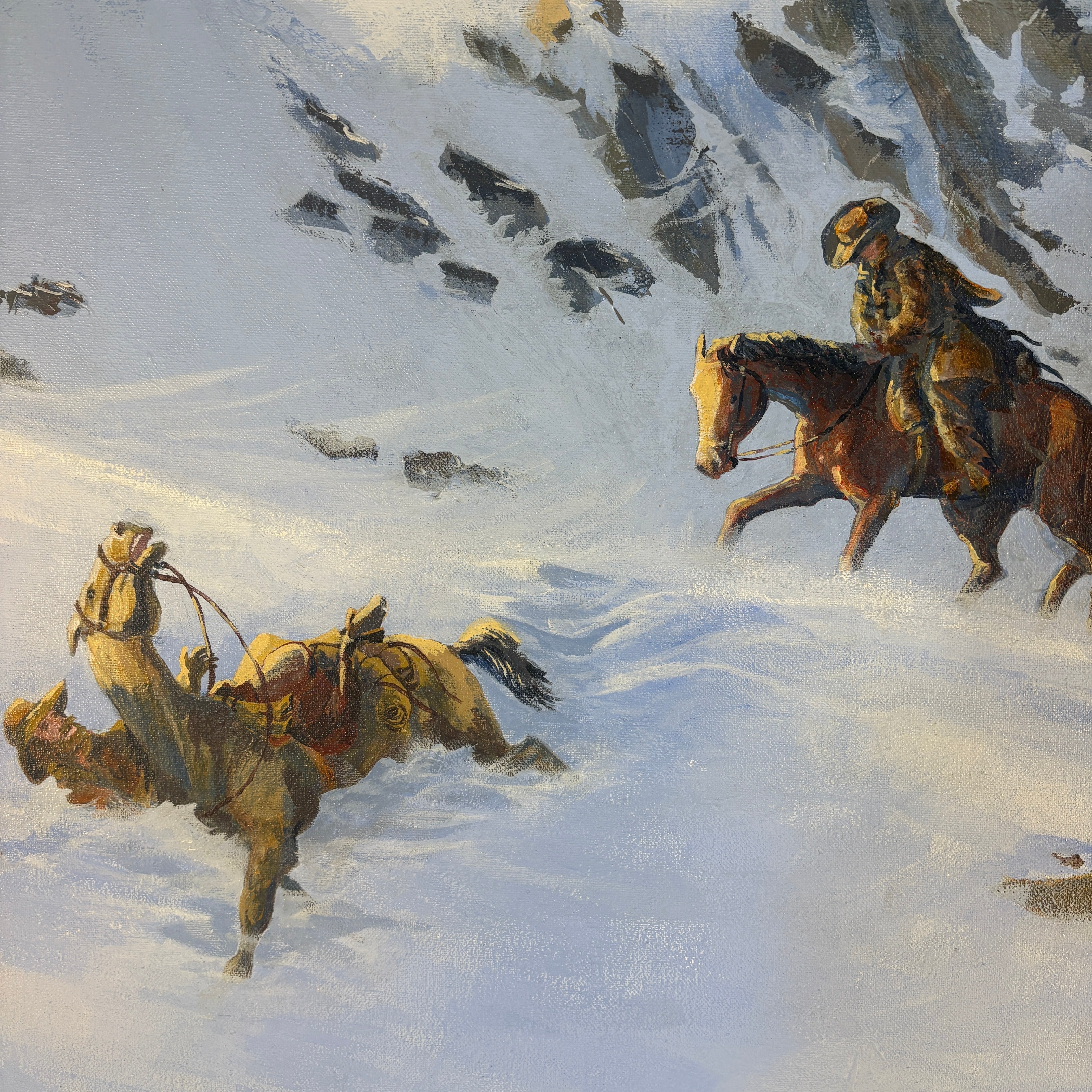 Original Acrylic on Canvas Signed by Artist, Kuhn - 1992 Described as Rocky and Snowy Mountain Top with Cowboys on Horses.