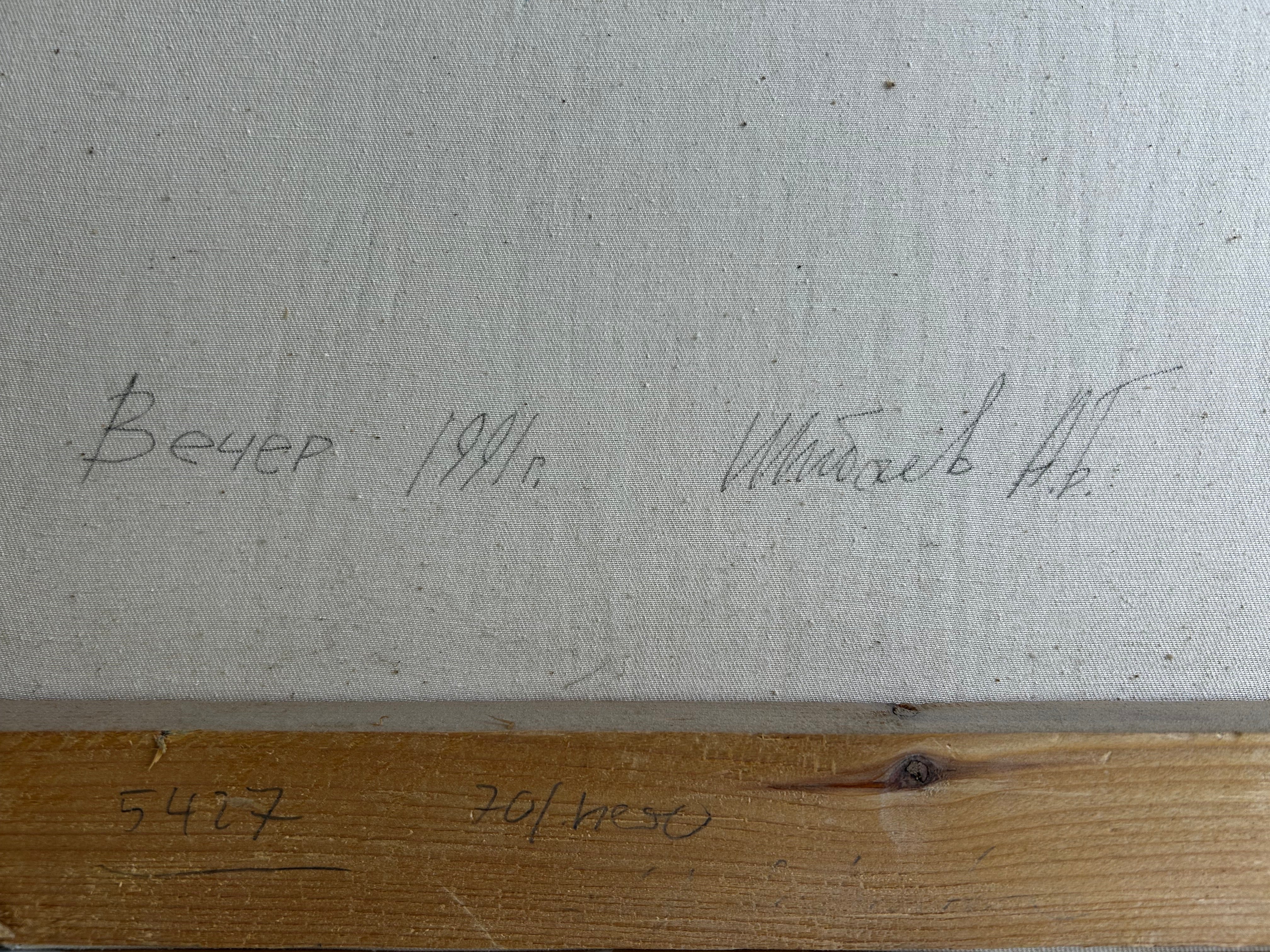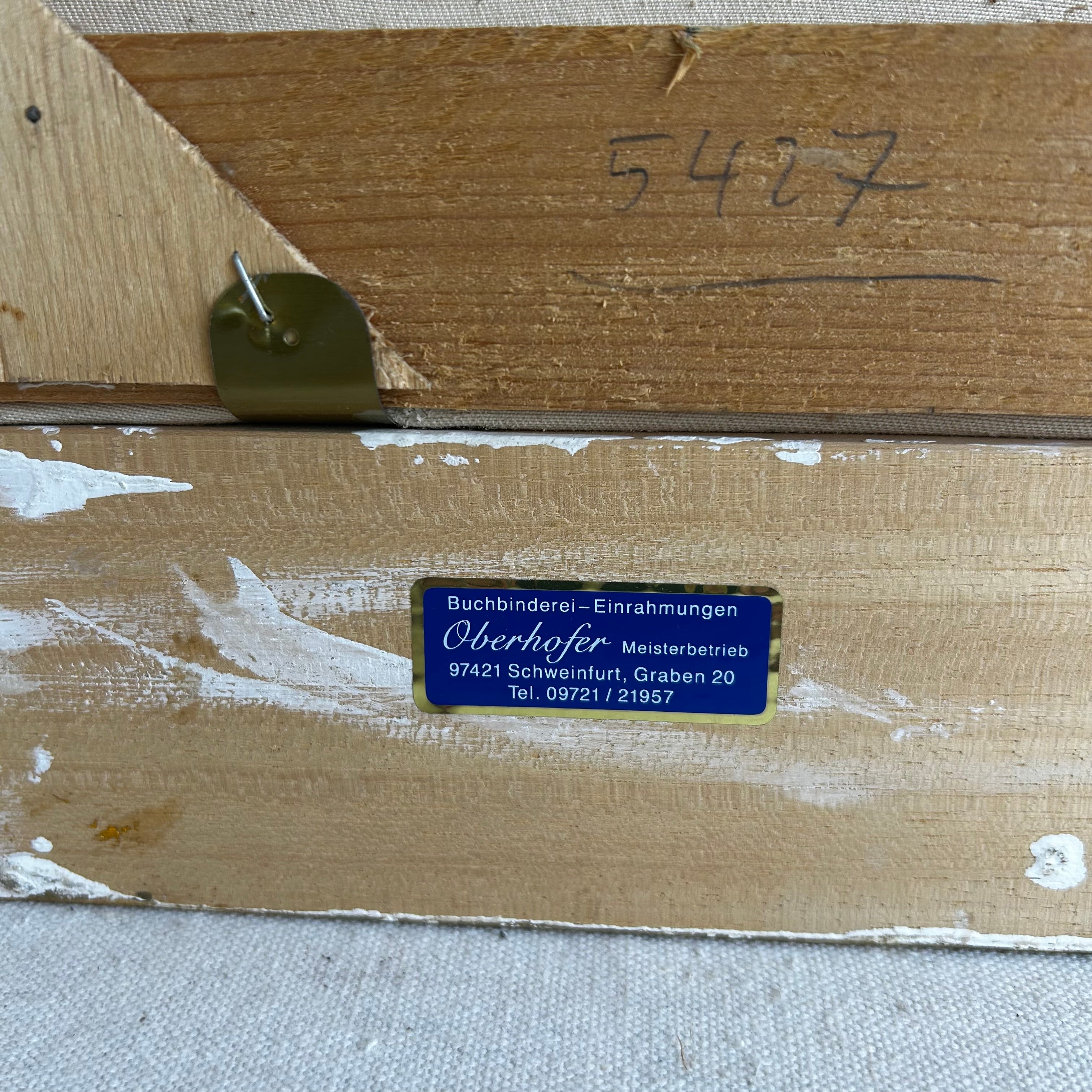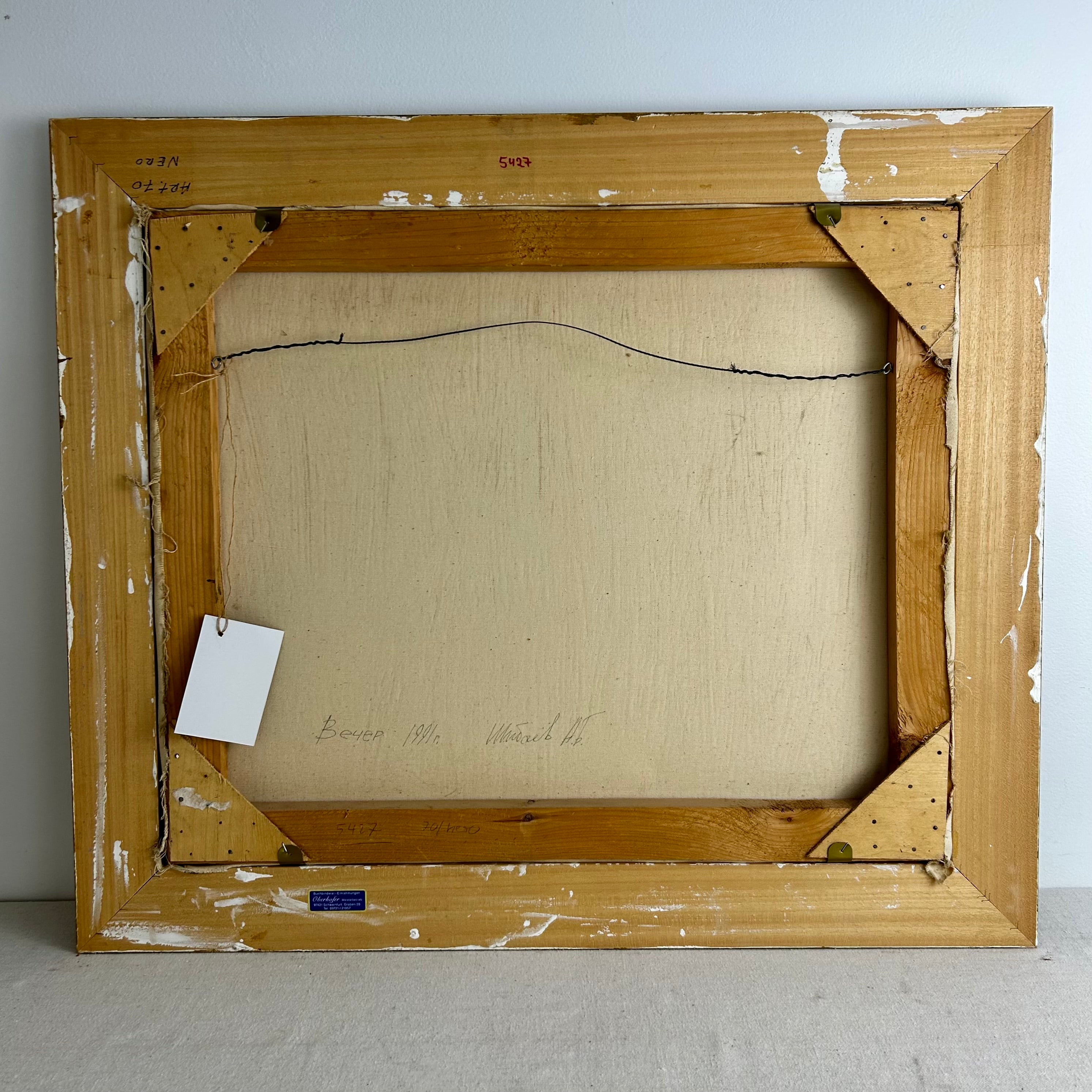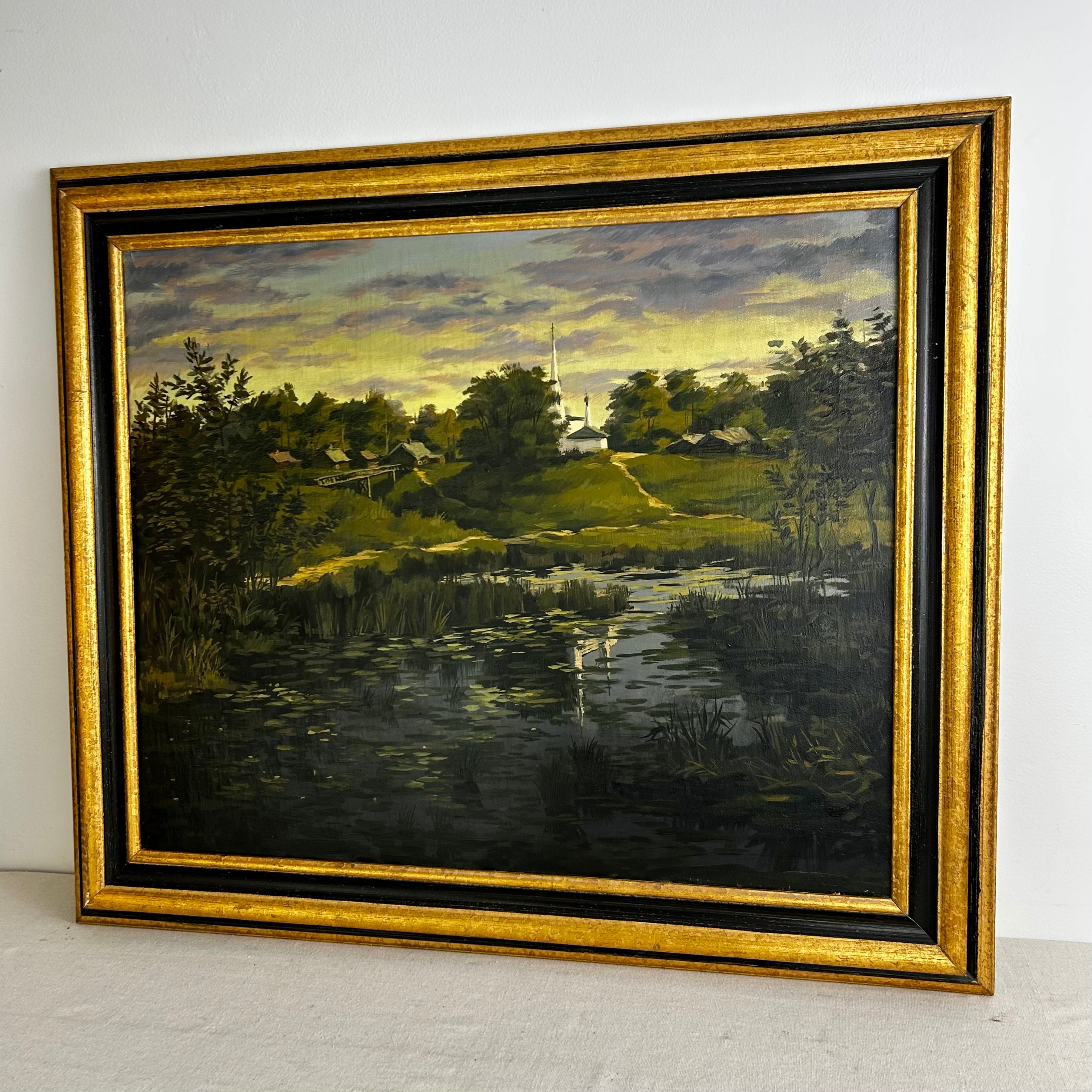 Original Art,"Reed Pond and Steeple" Landscape, Oil On Canvas, Framed, Vintage. This work is most likely from a German artist as the collector brought many pieces back from there and the frame has a German frame shop stamp. There appears to be a signature on the with the date: 1991.