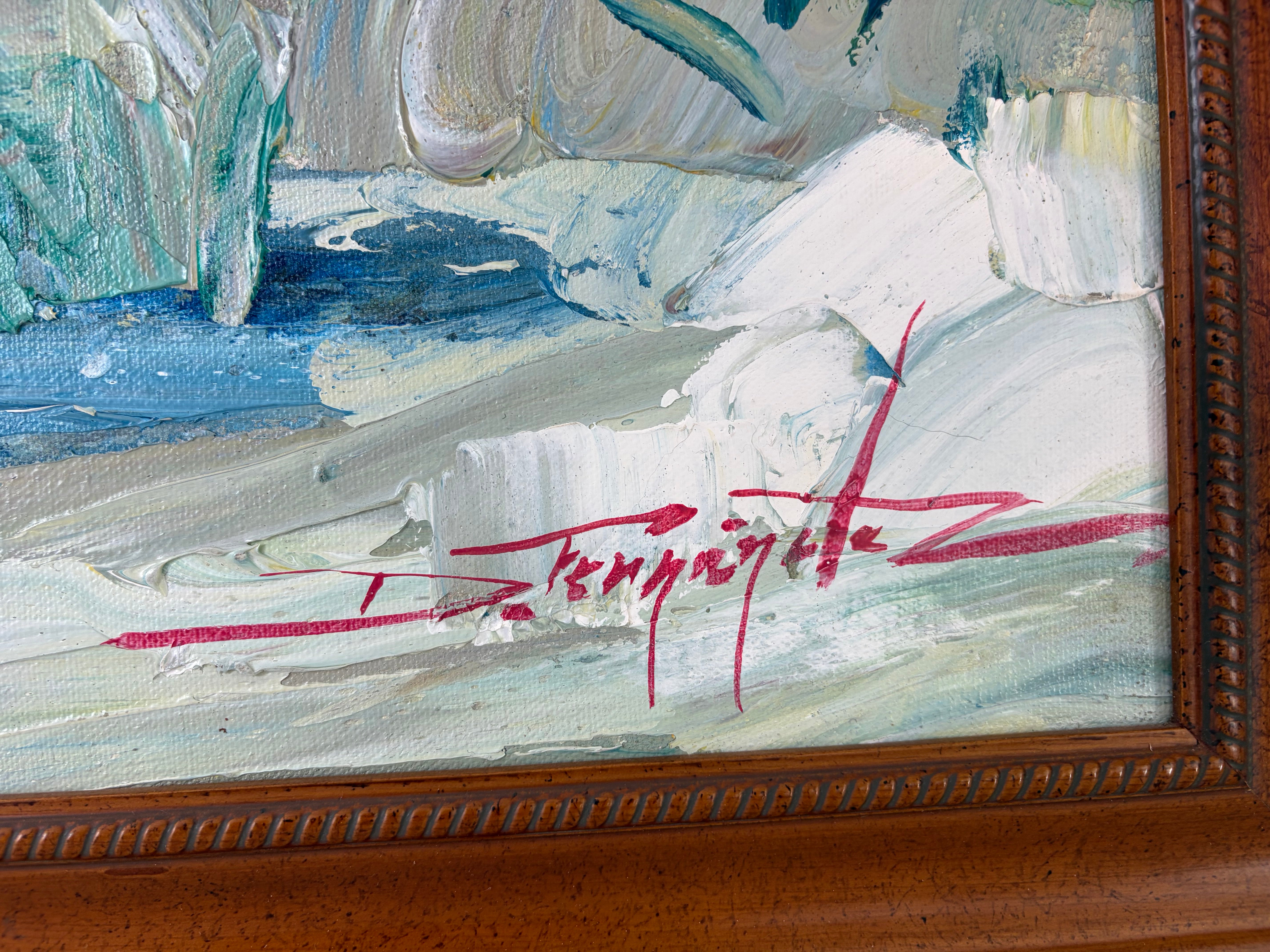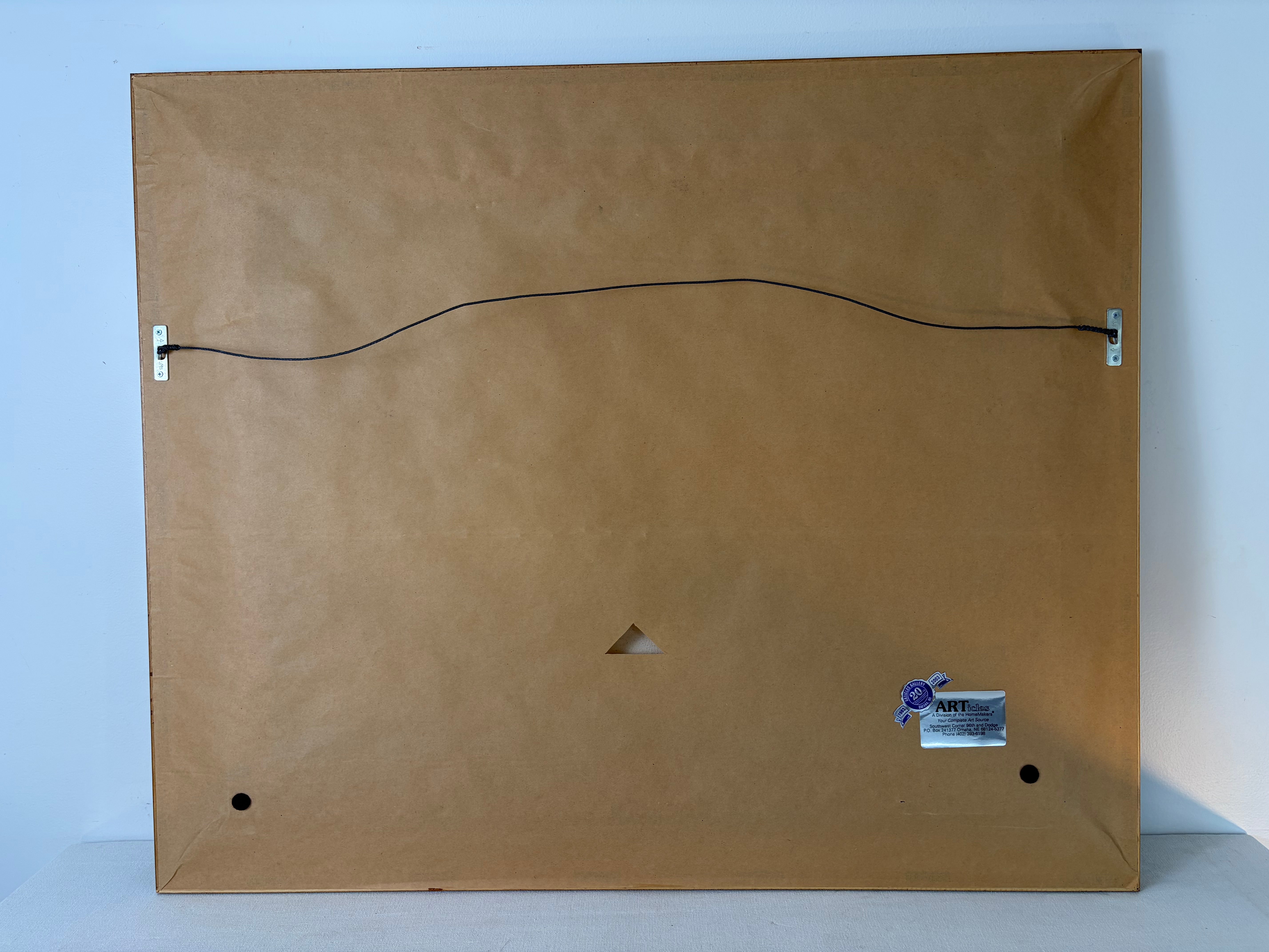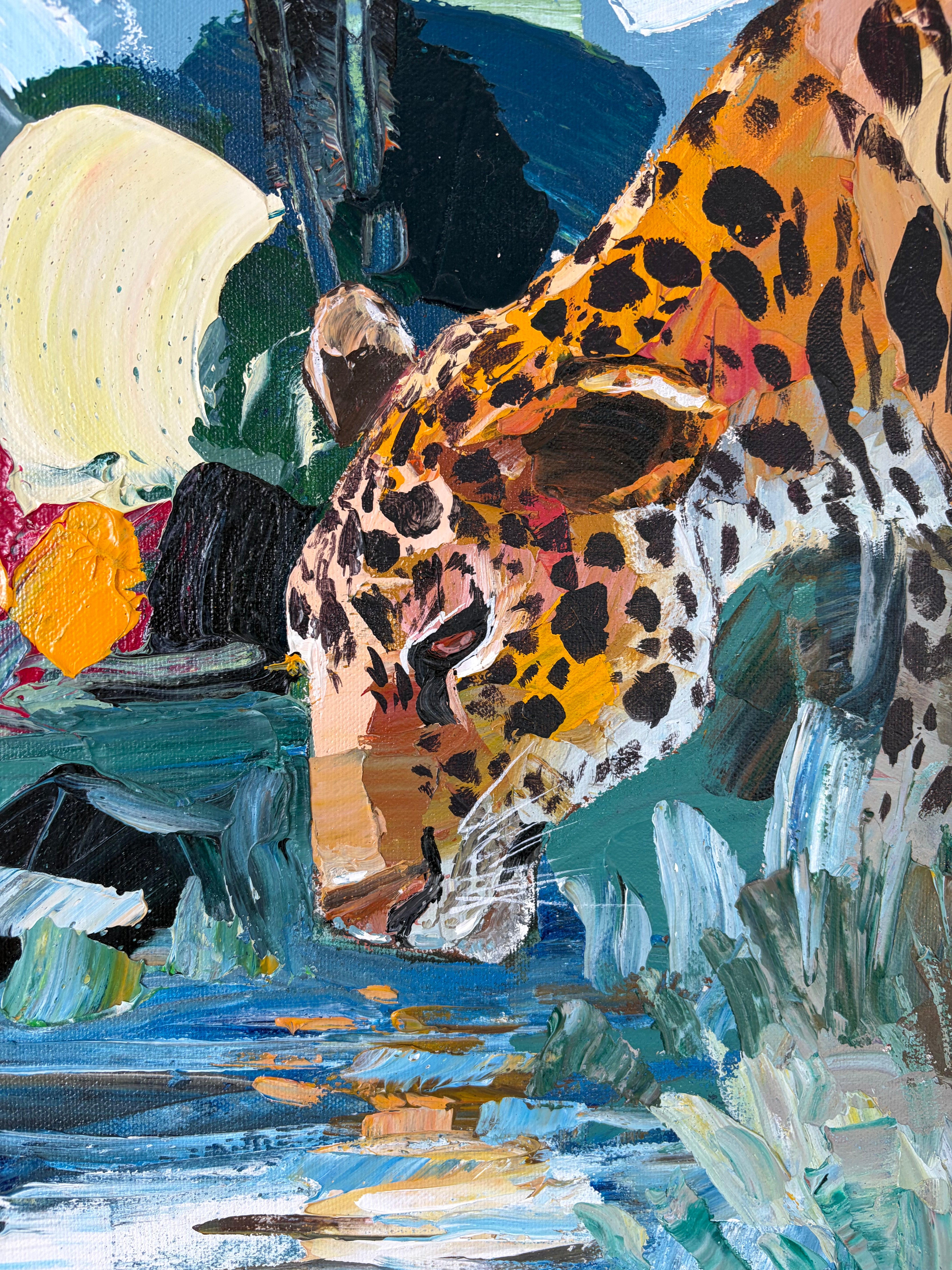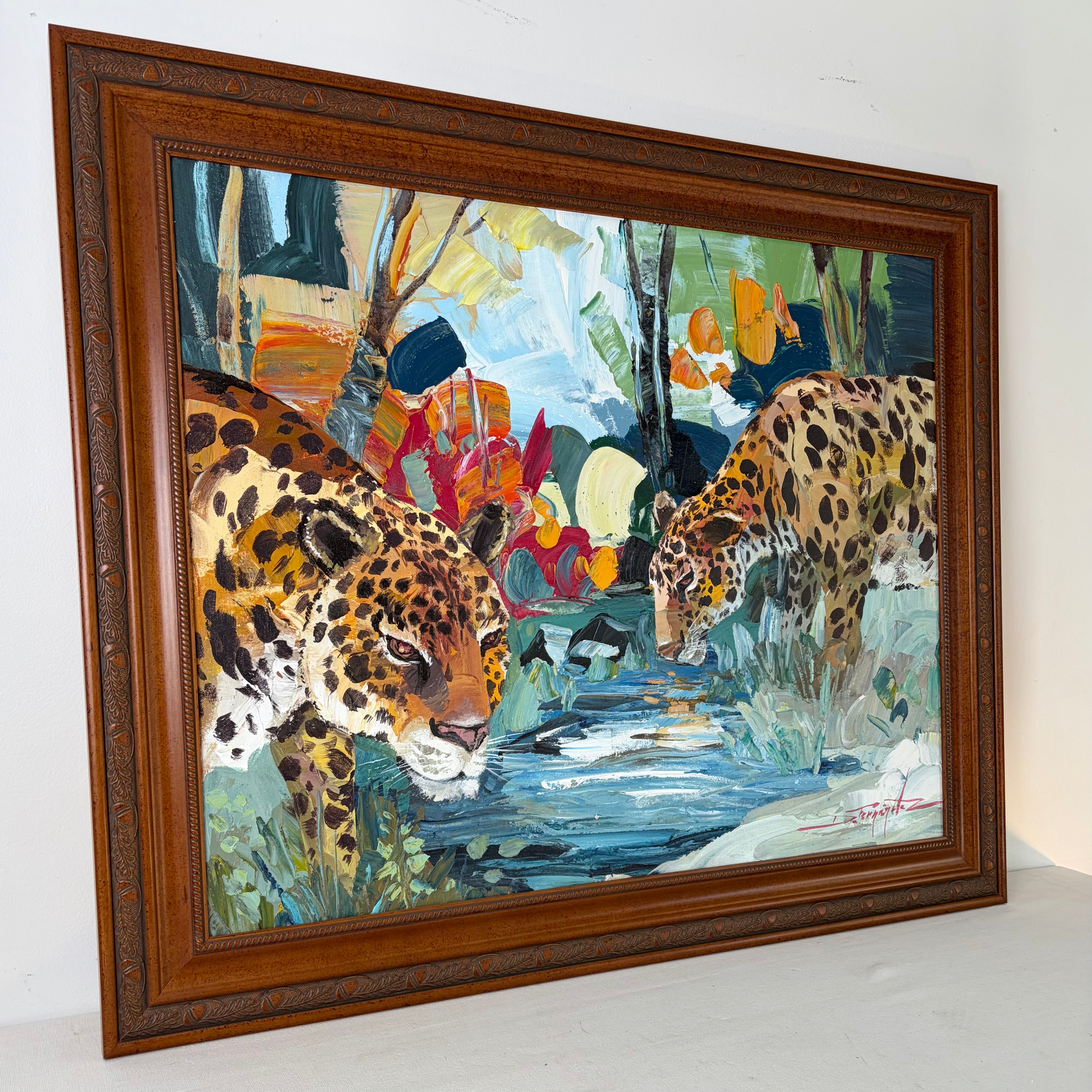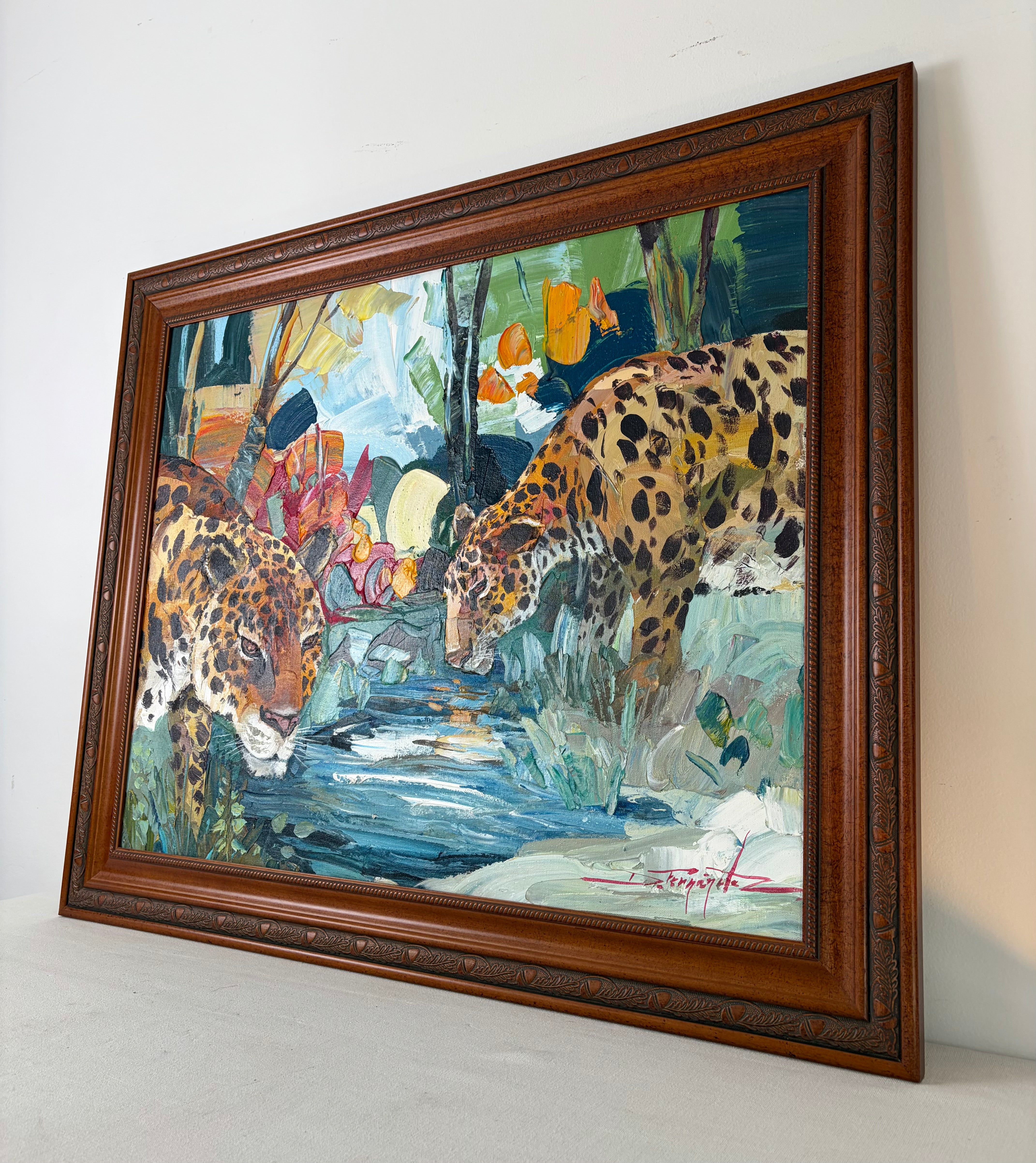 Original Artwork, Two Leopards at Stream, Signature Illegible, Acorn and Oakleaf Detailed Wood Frame.