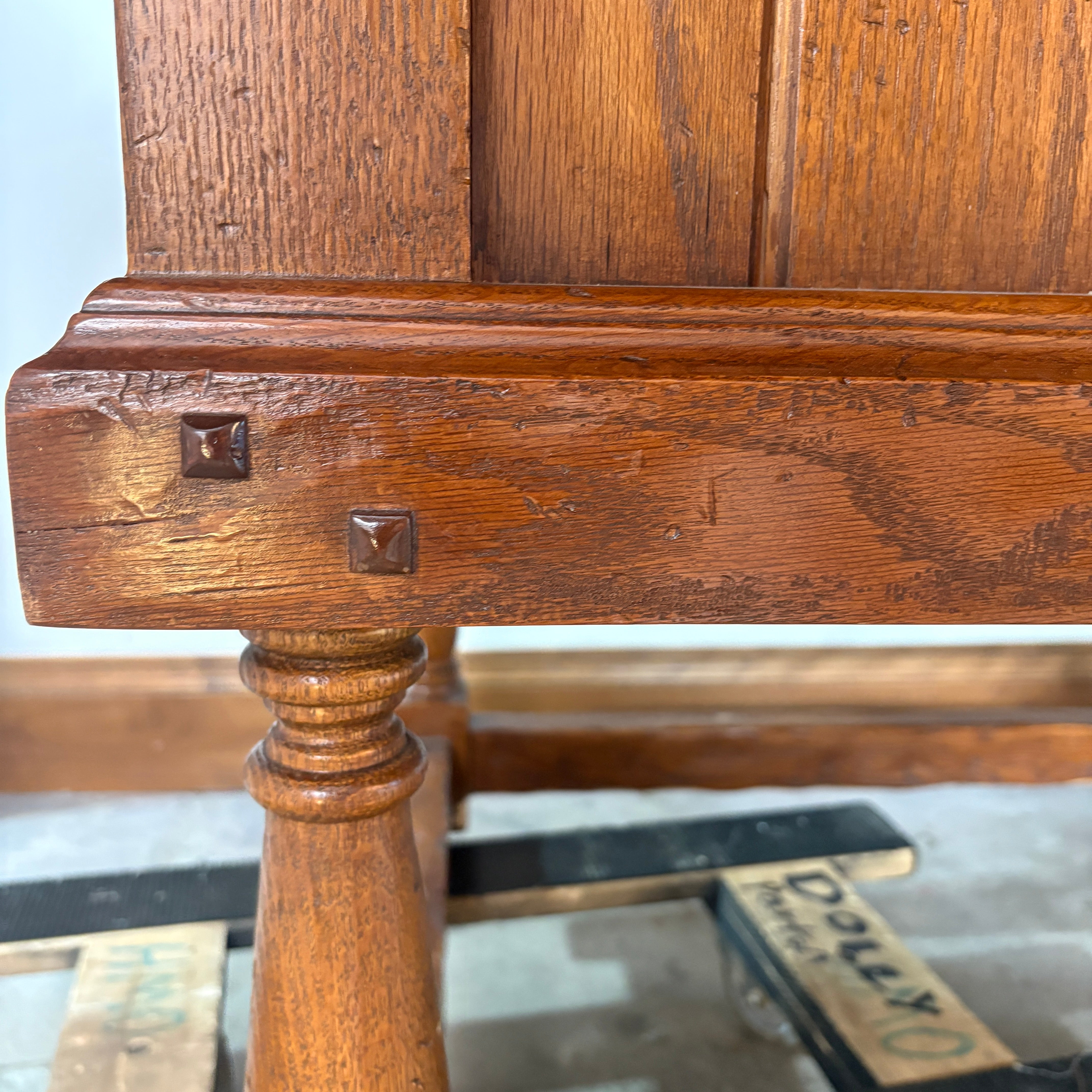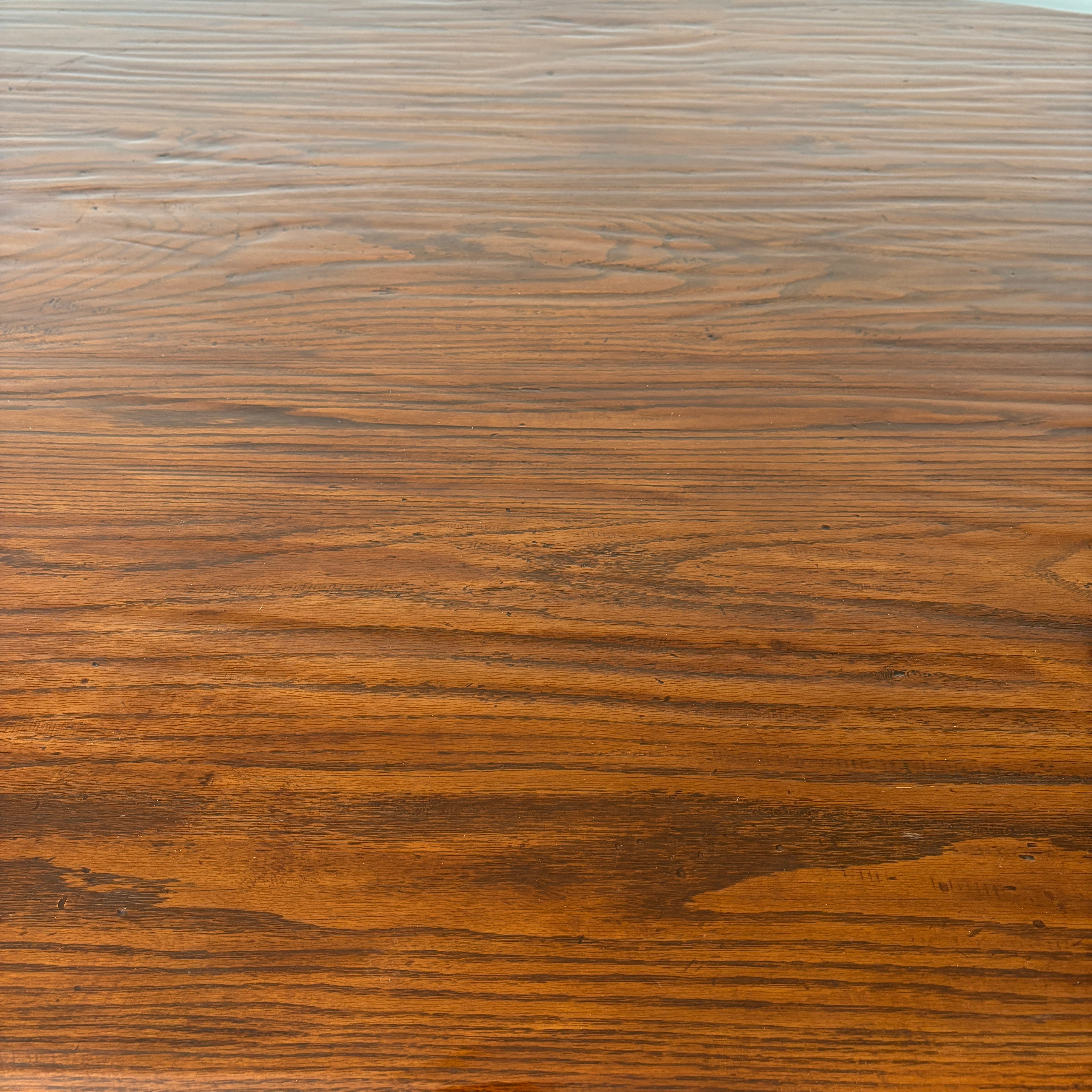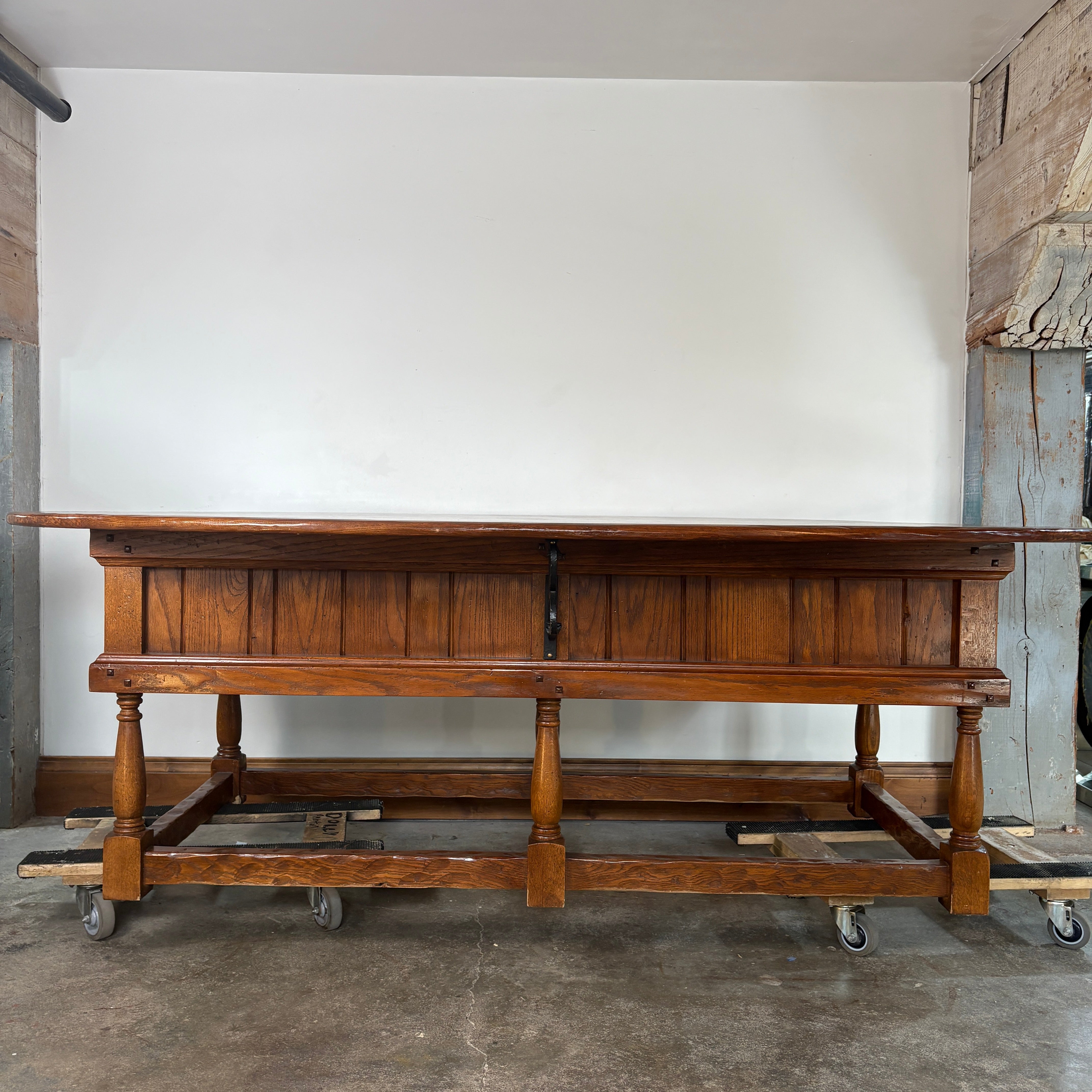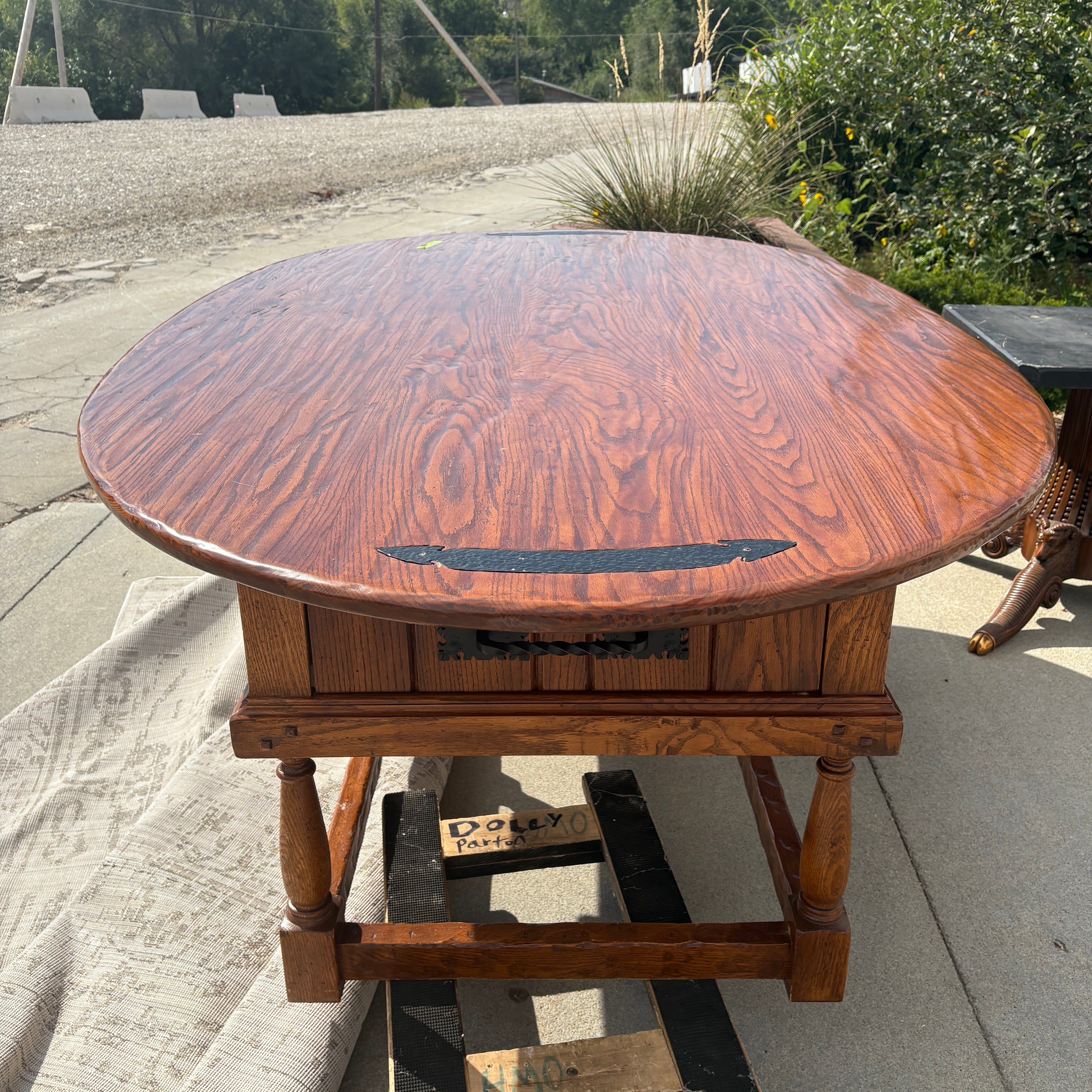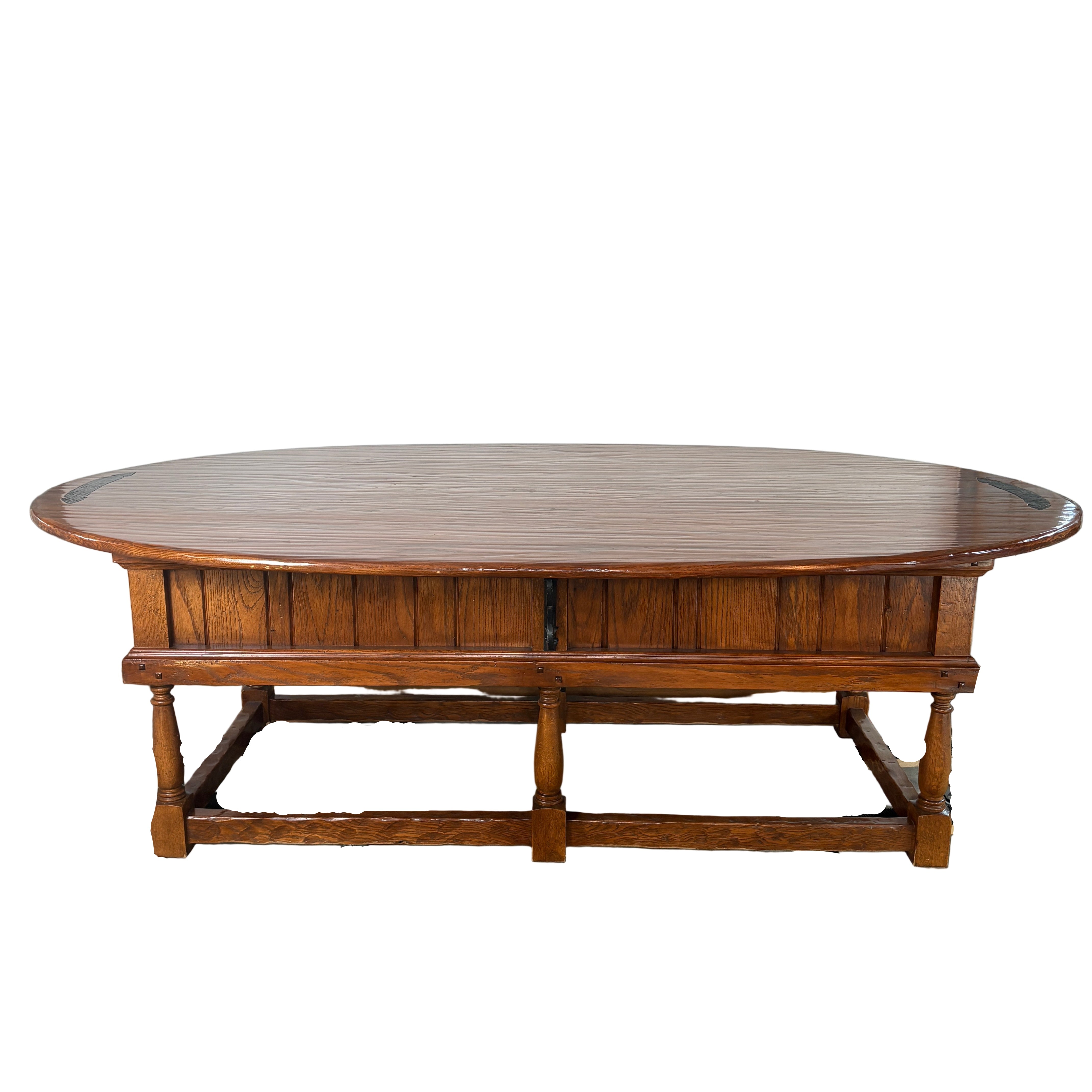 Oval Oak Dining Table with Black Iron Detail and 2 Drawers on Both Ends for Storage. Rustic in Style.