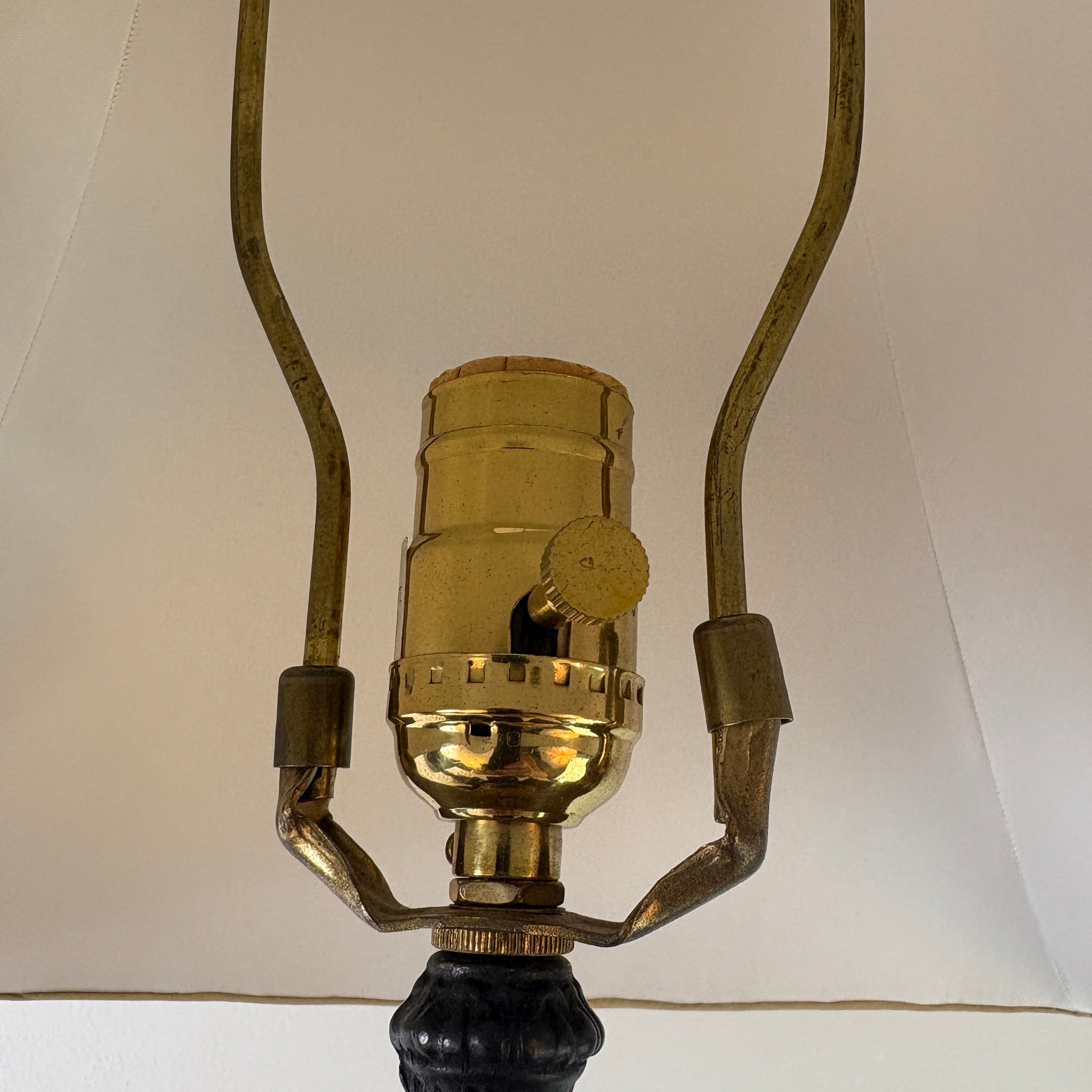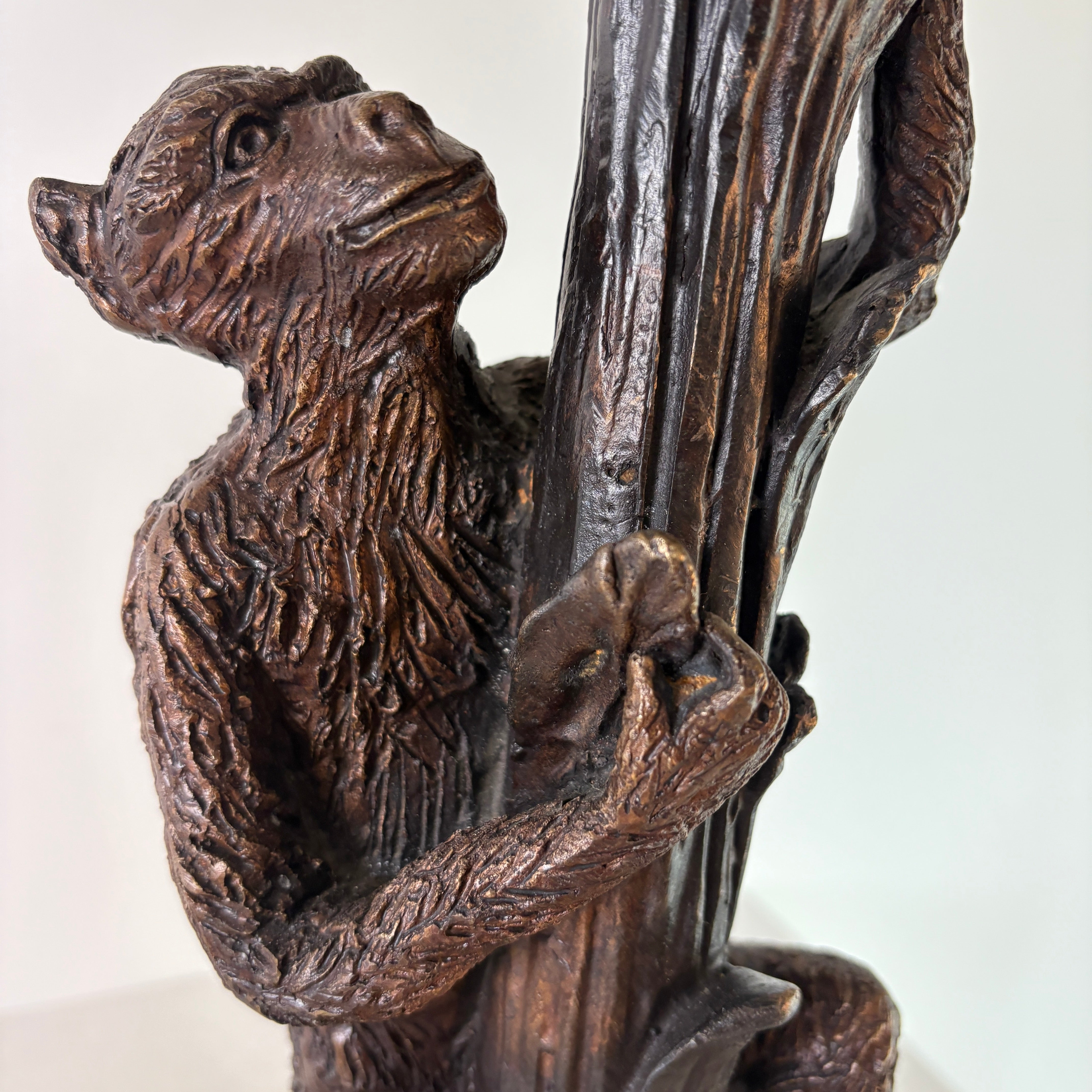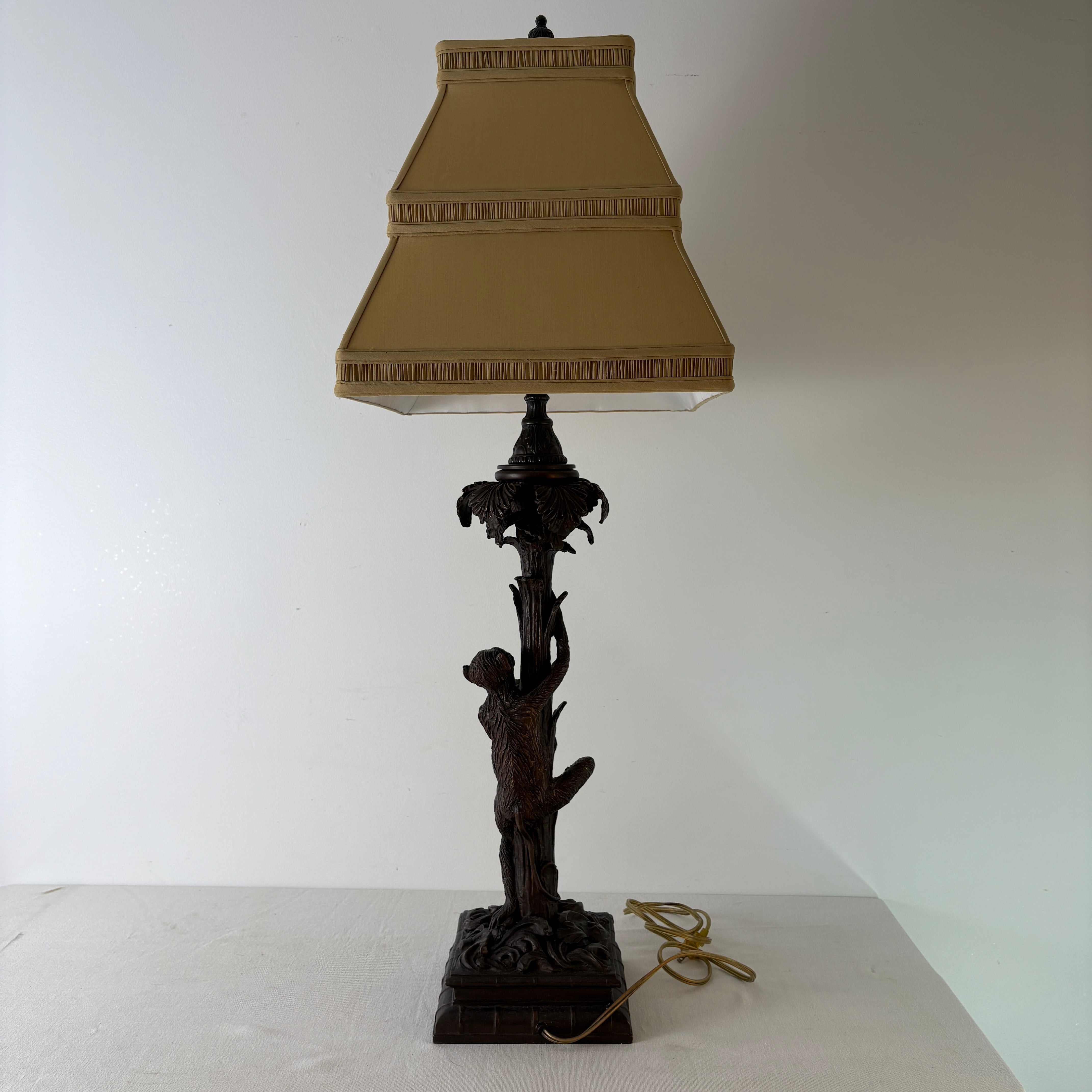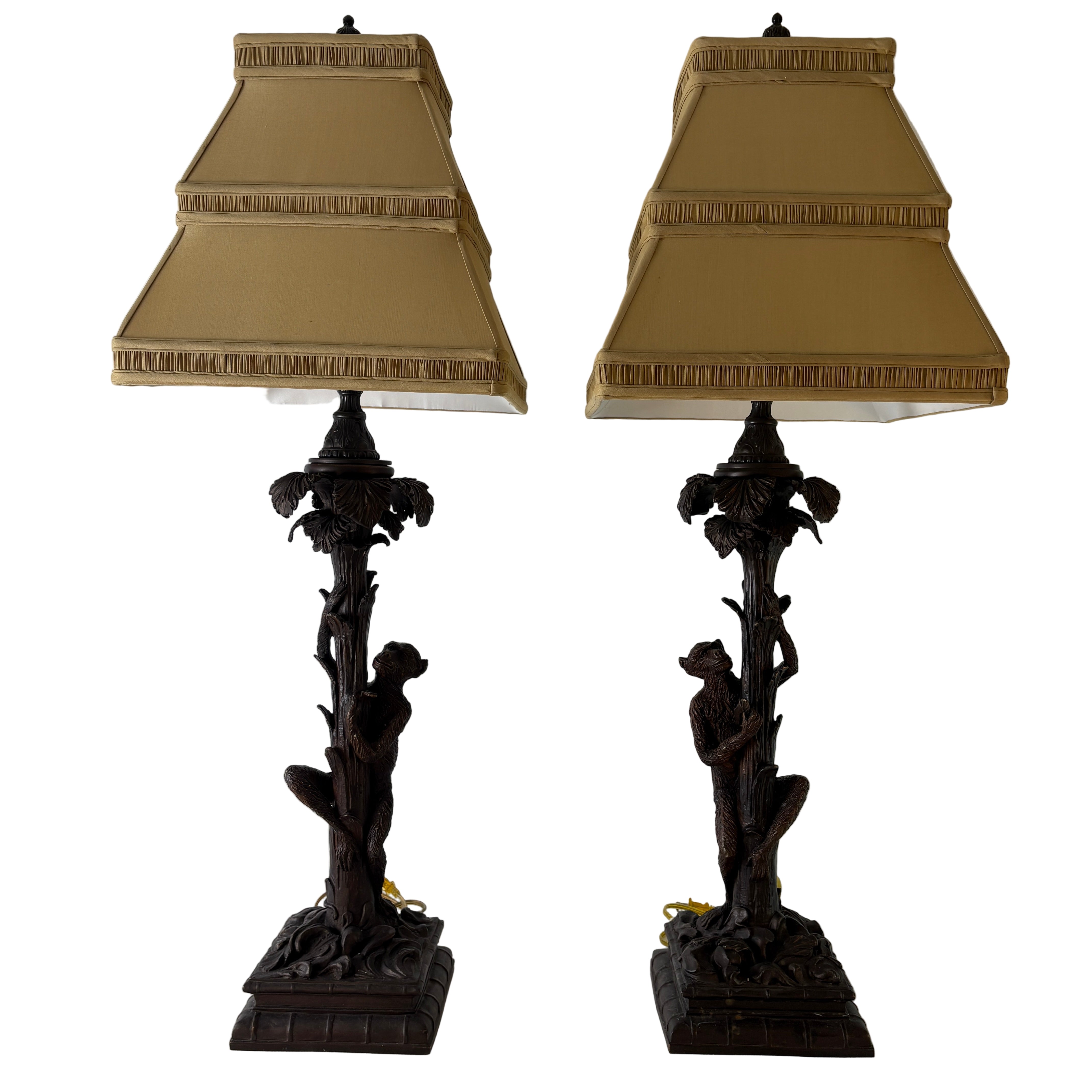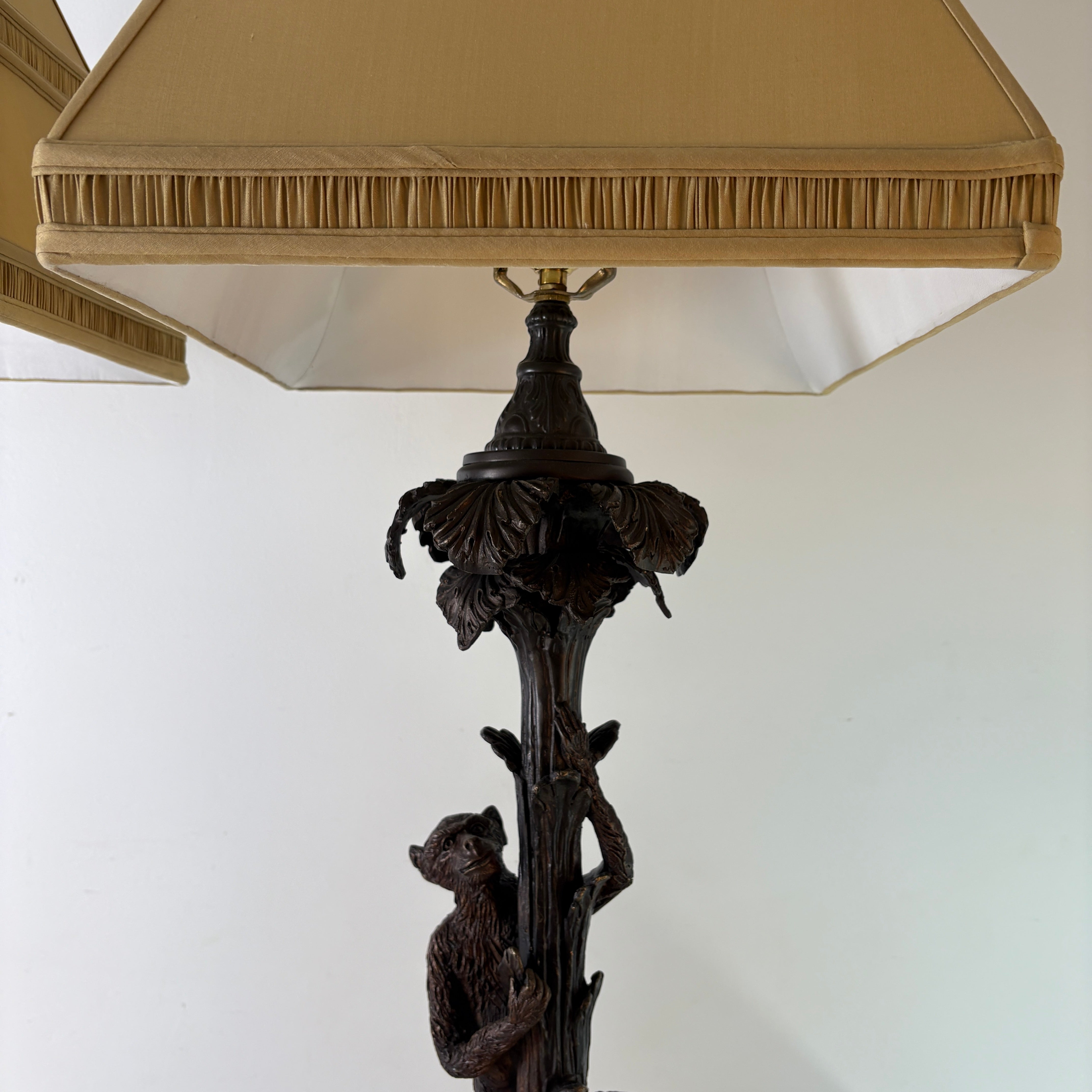Pair of Bronze Table Lamps with Palm Tree & Monkeys, Beige Silk & Pleated Shades.