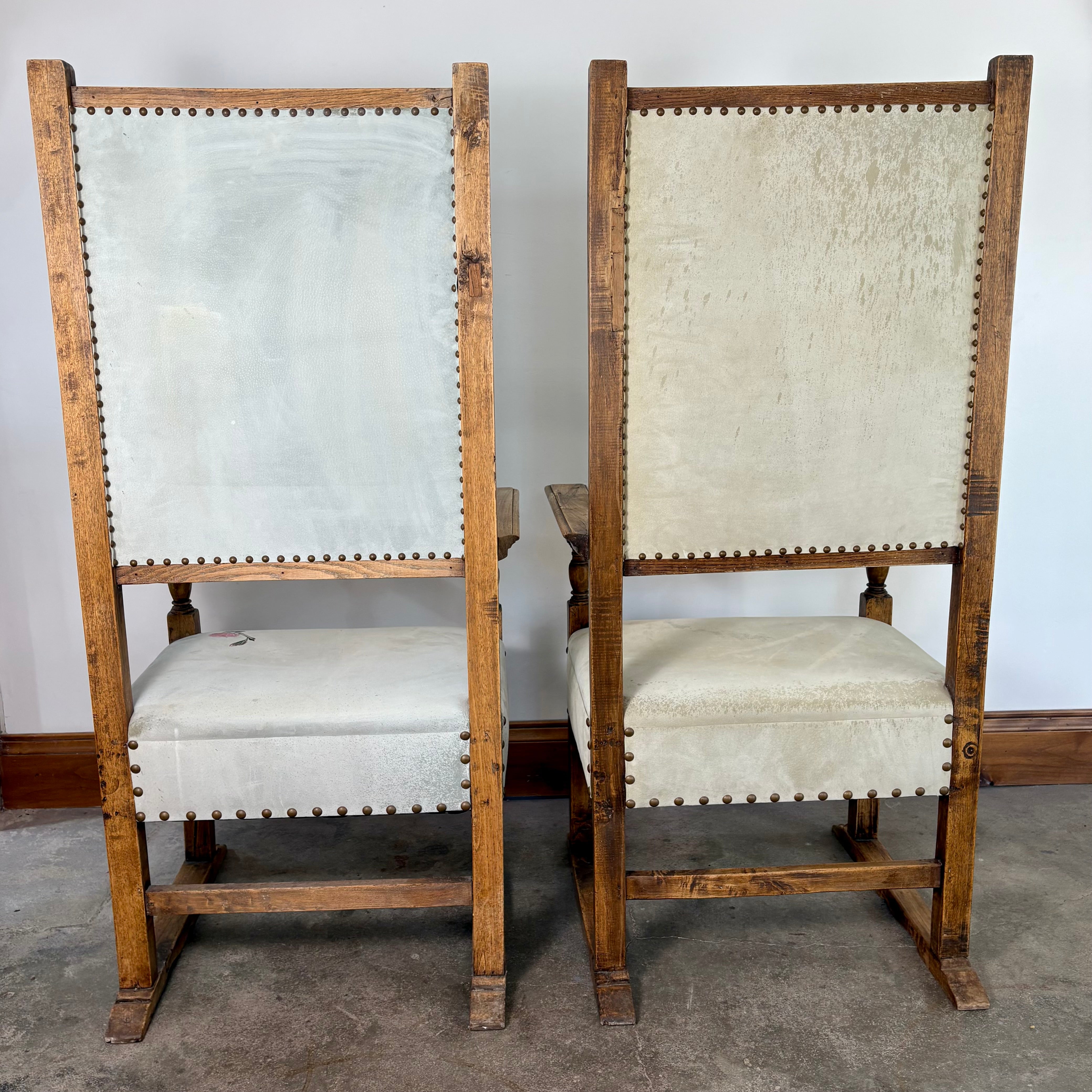 Pair of high back, hide wood arm chairs, upholstered in hide, hand painted with H's in blue with ornate detail. Sold as a pair.