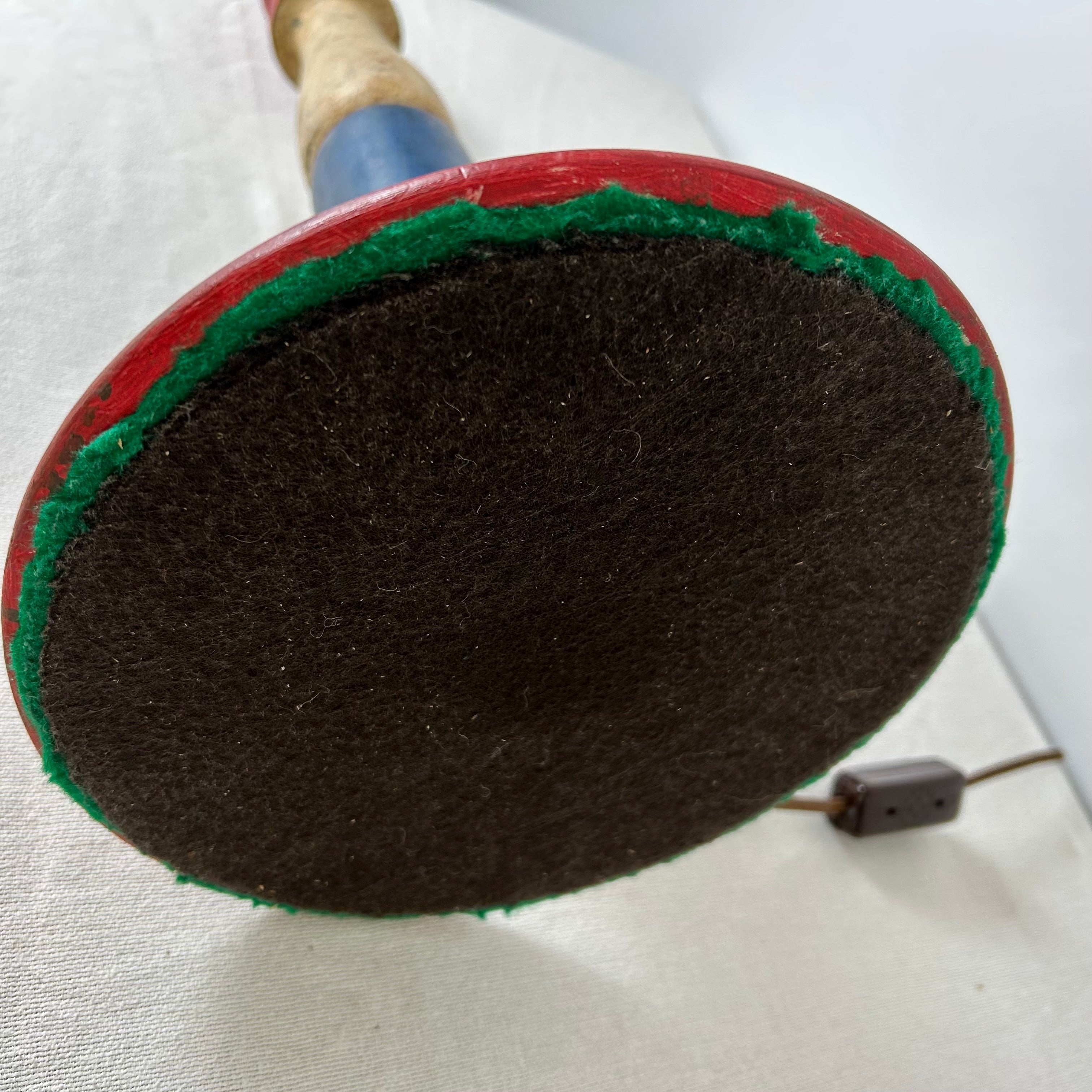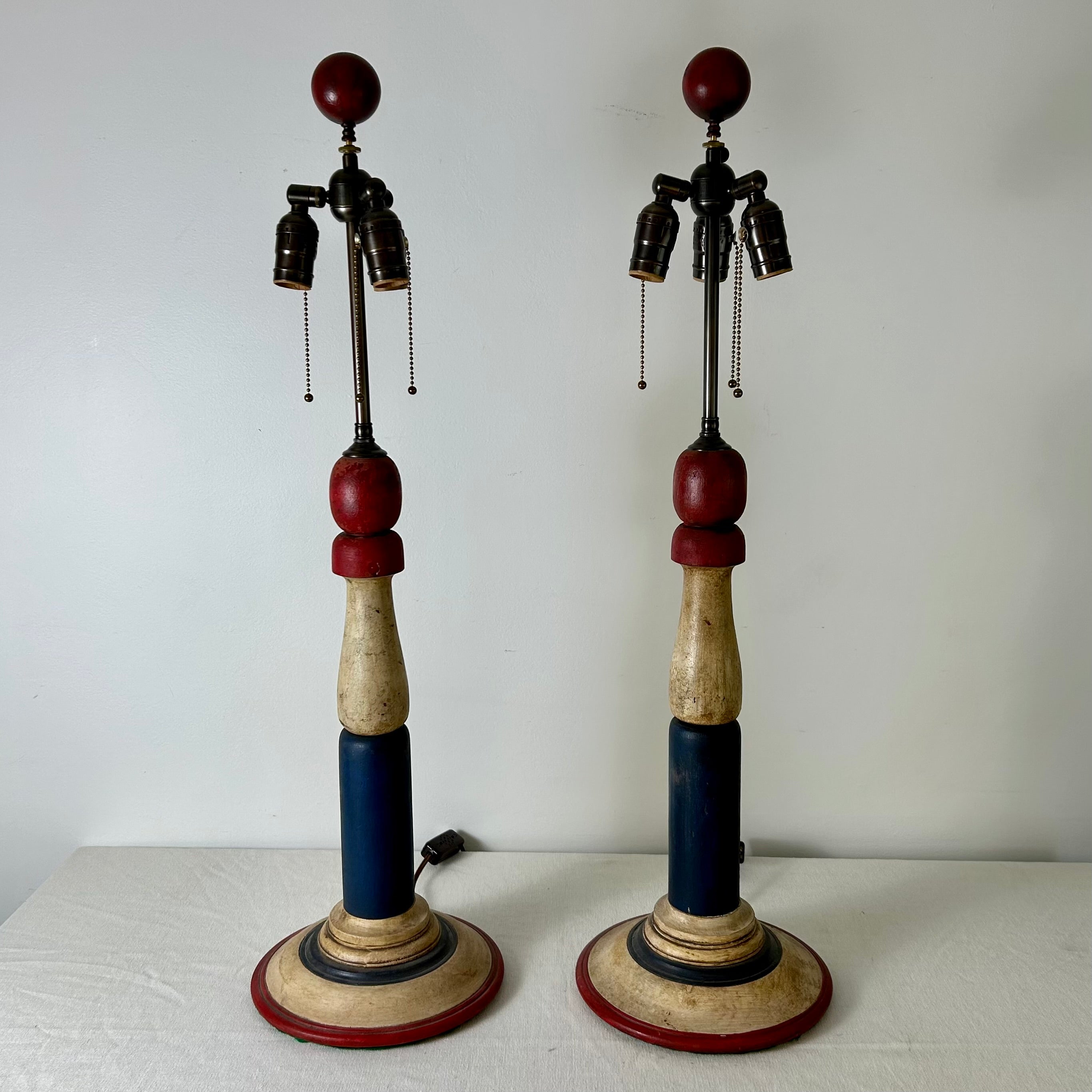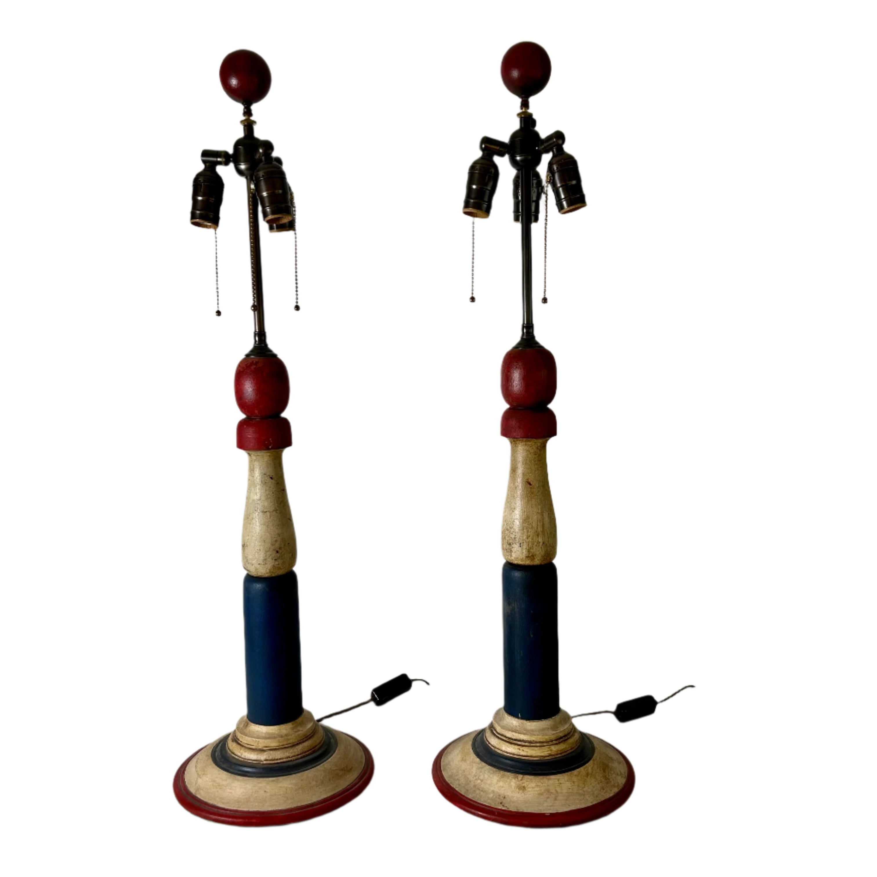 Pair of nautical, patriotic table lamps, red, off white and blue, wood. Double sockets, felt bottoms. Sold as a pair.