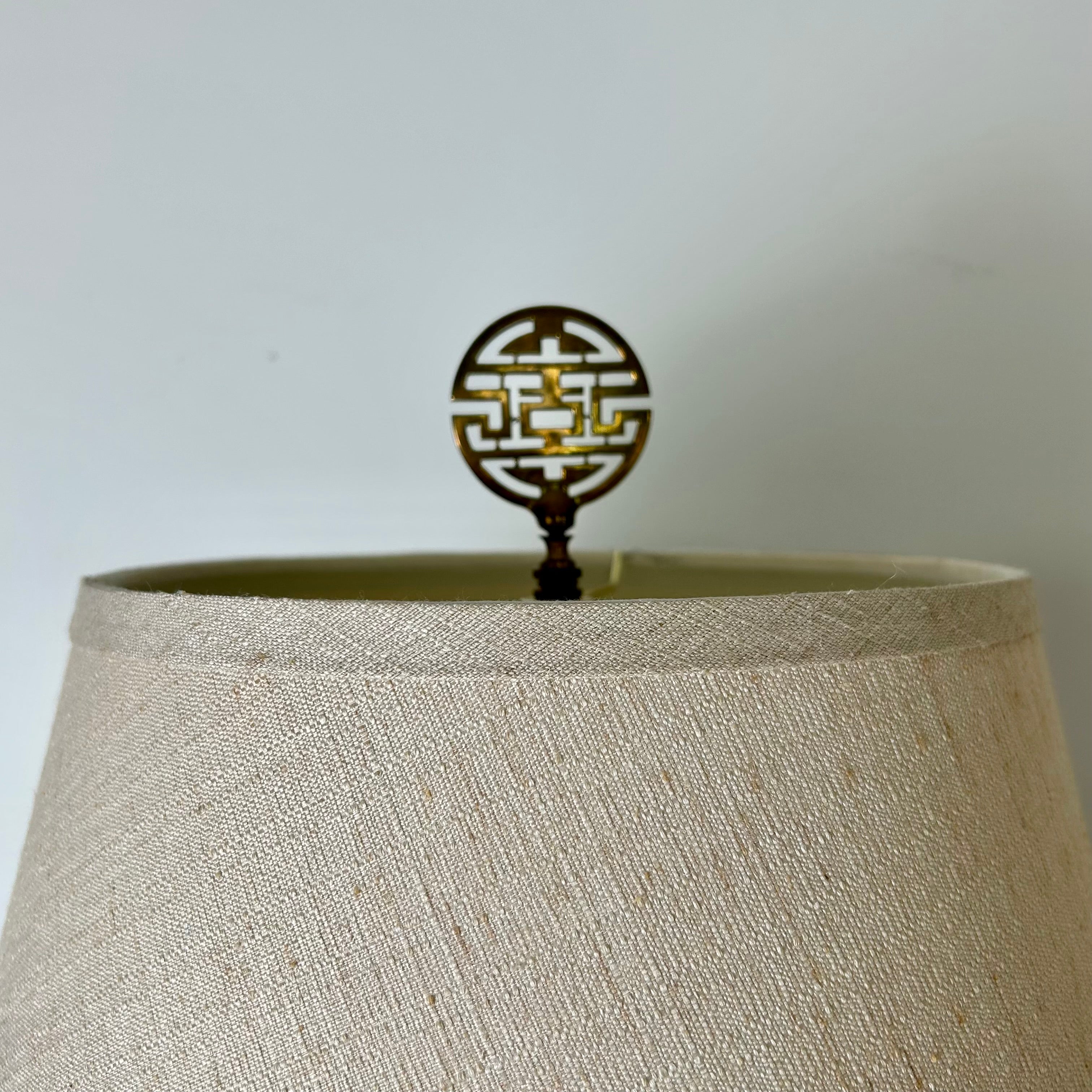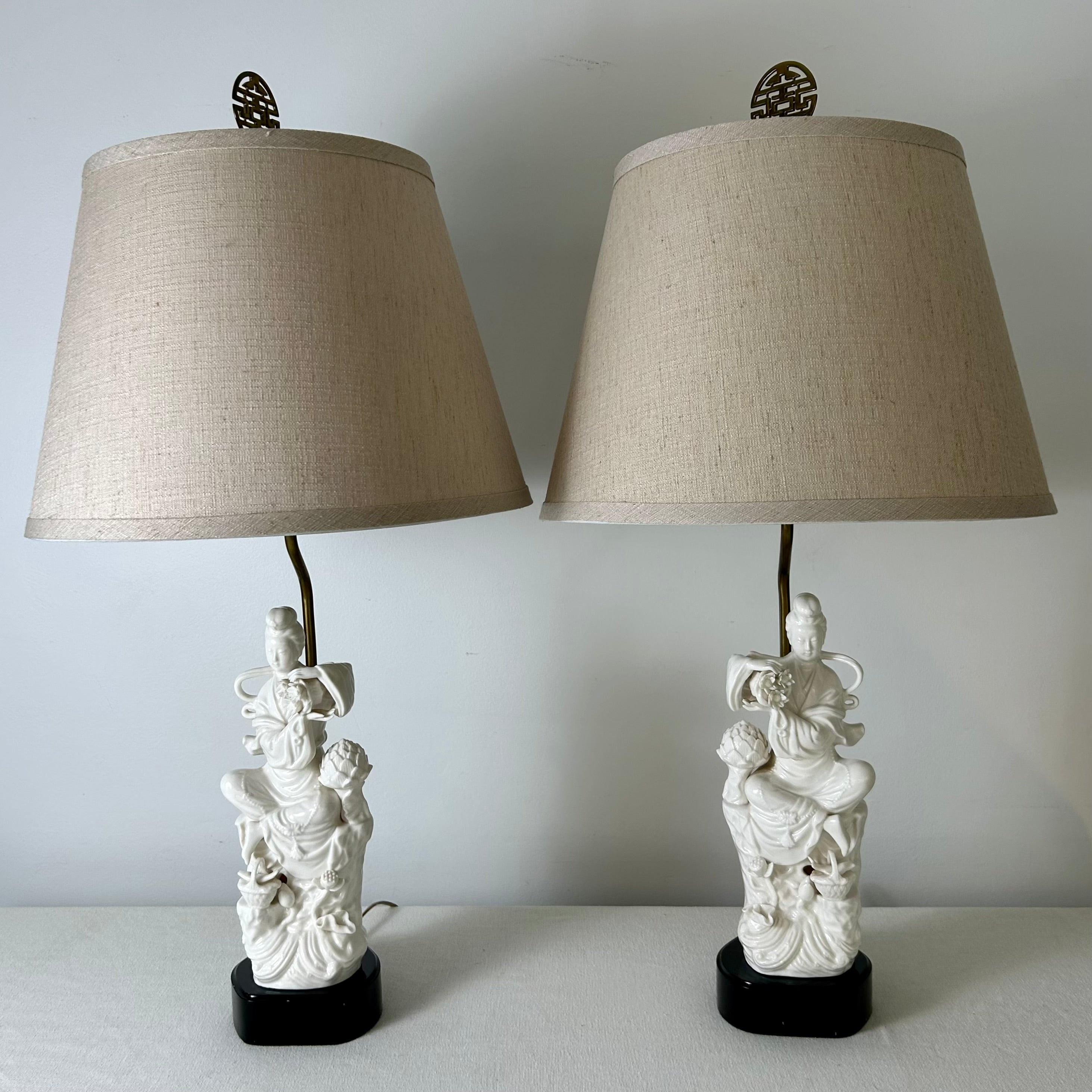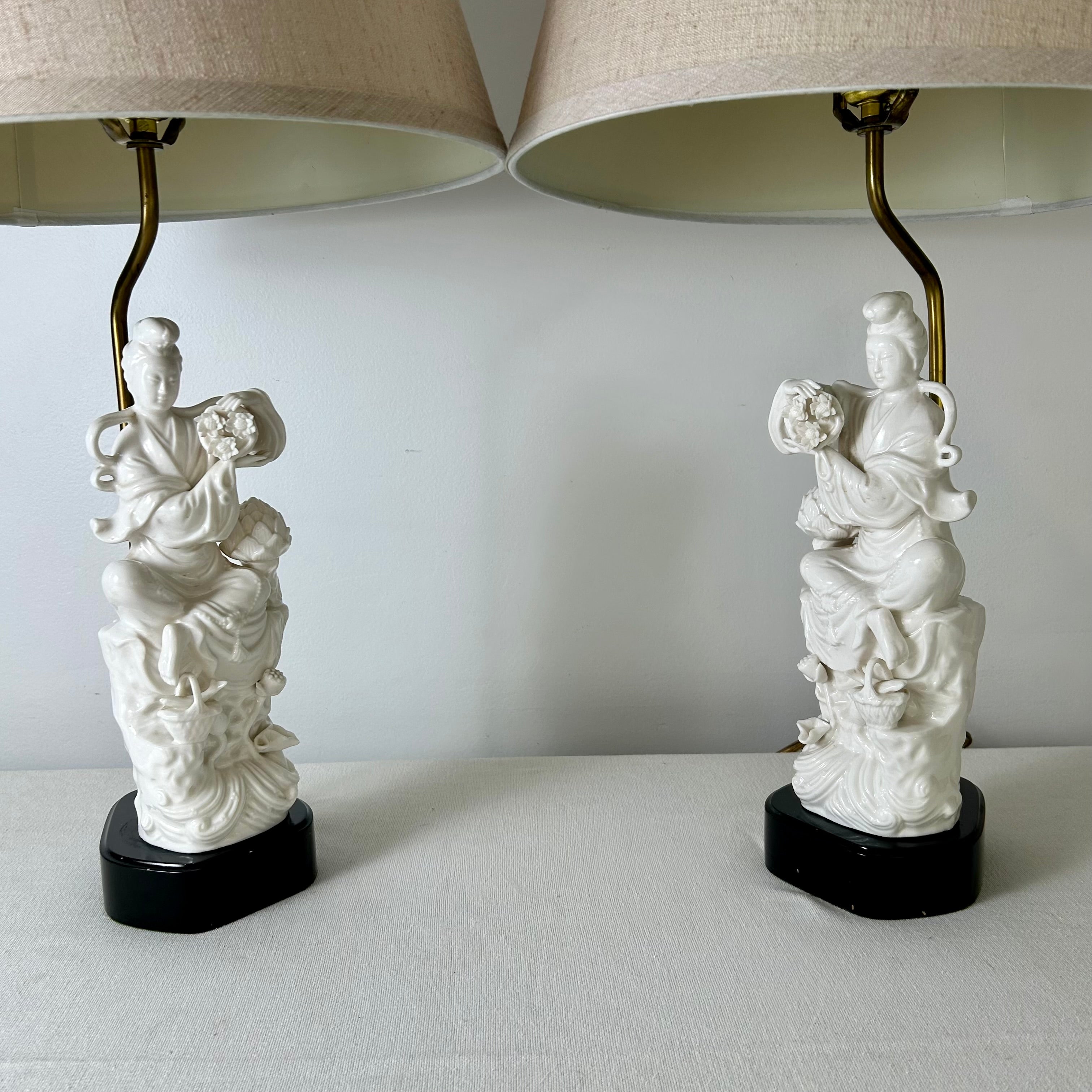 Pair of Vintage Blanc de Chine Quan Yin Goddess Table Lamps w/Beige Linen Shades. Sold as set.