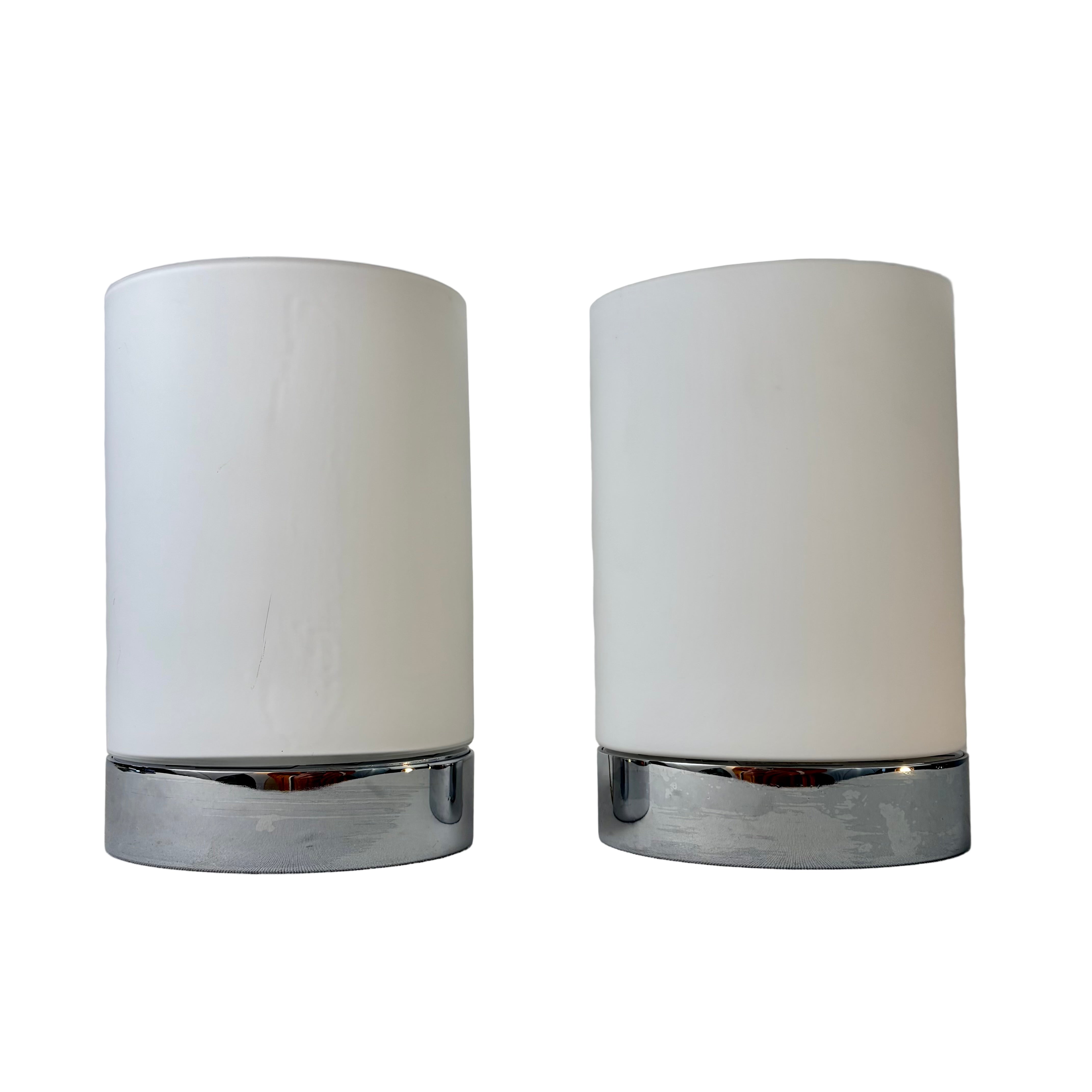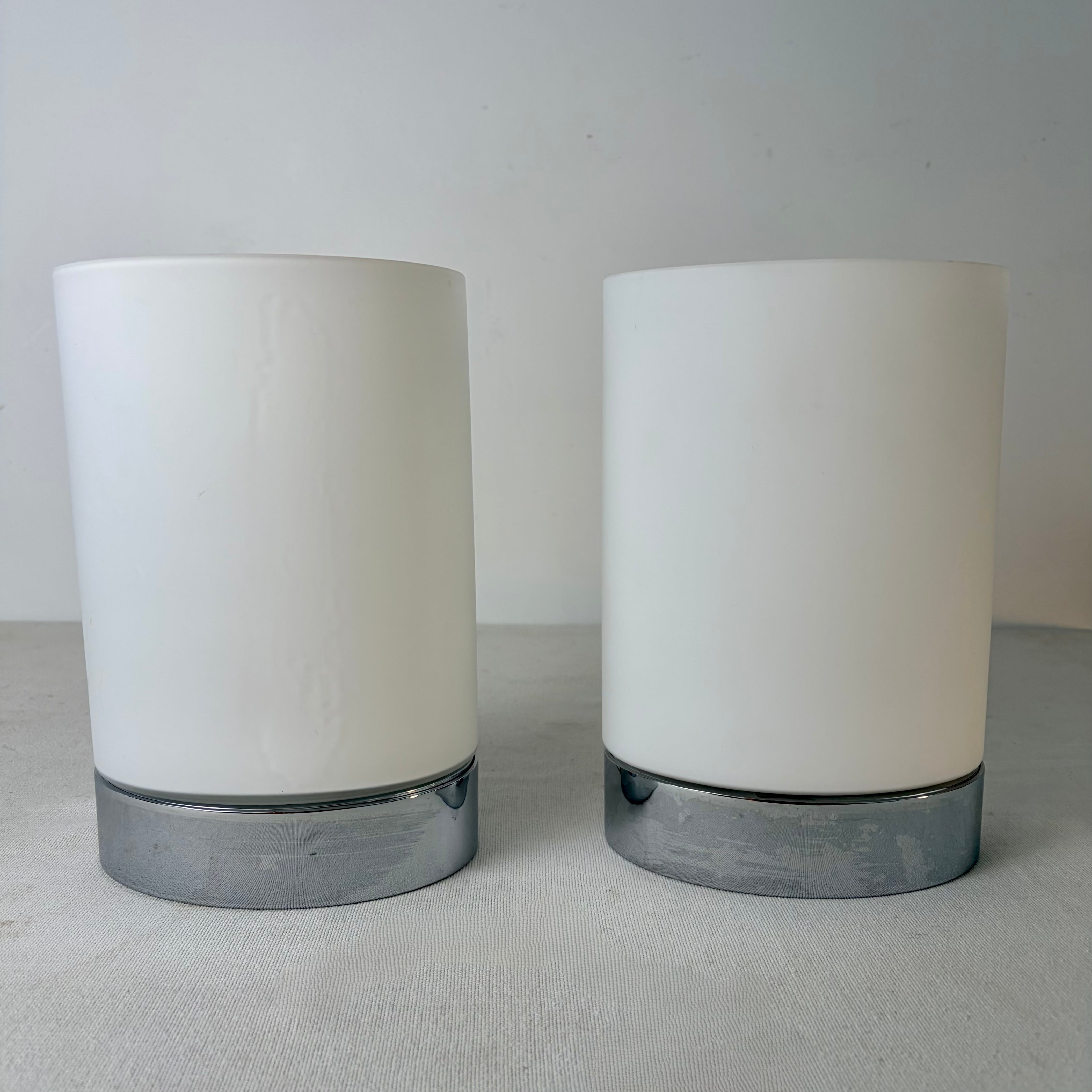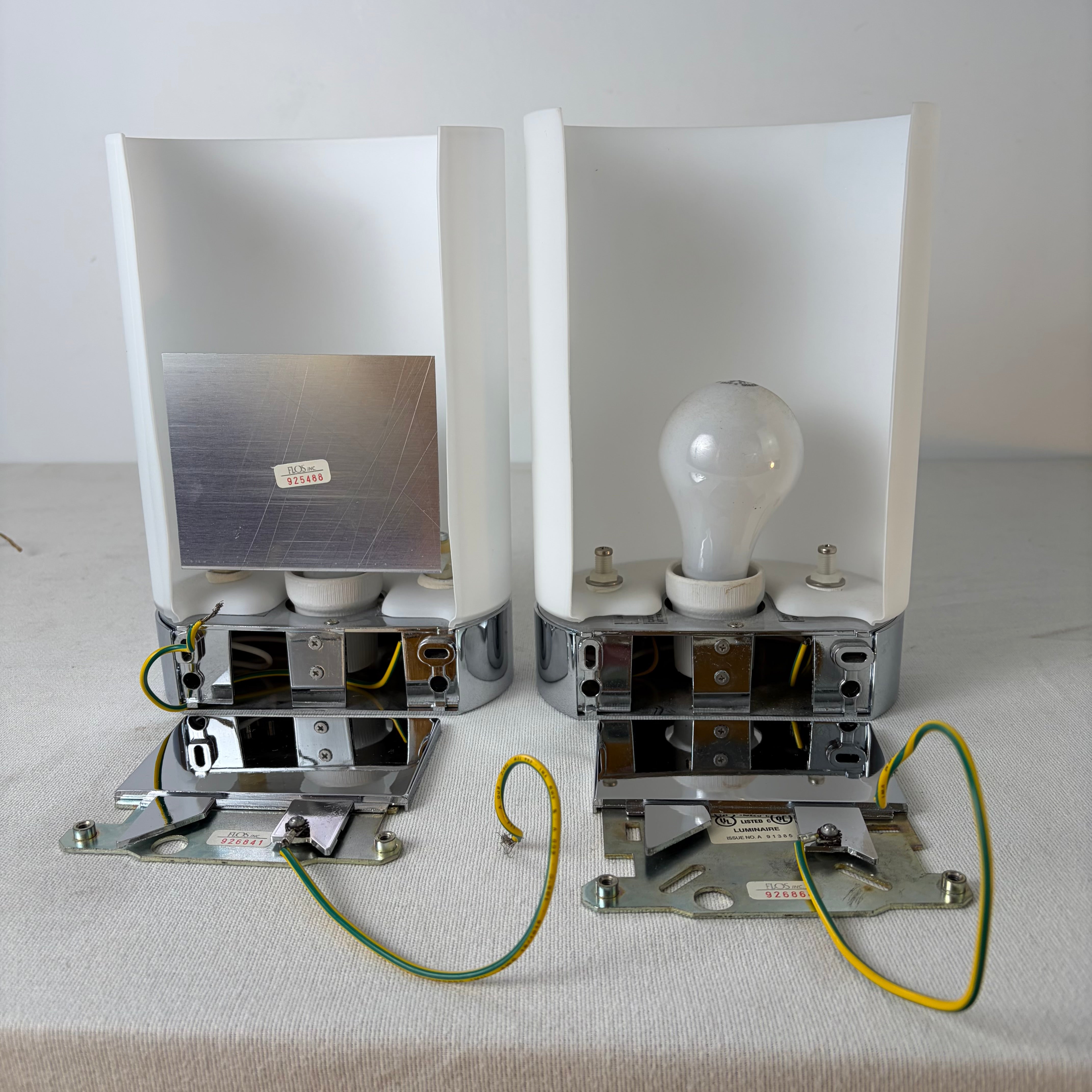 Pair of Flos. Inc. Wall Sconces with Frosted White Curved Shade, Nickel Base. Sold as a Pair.