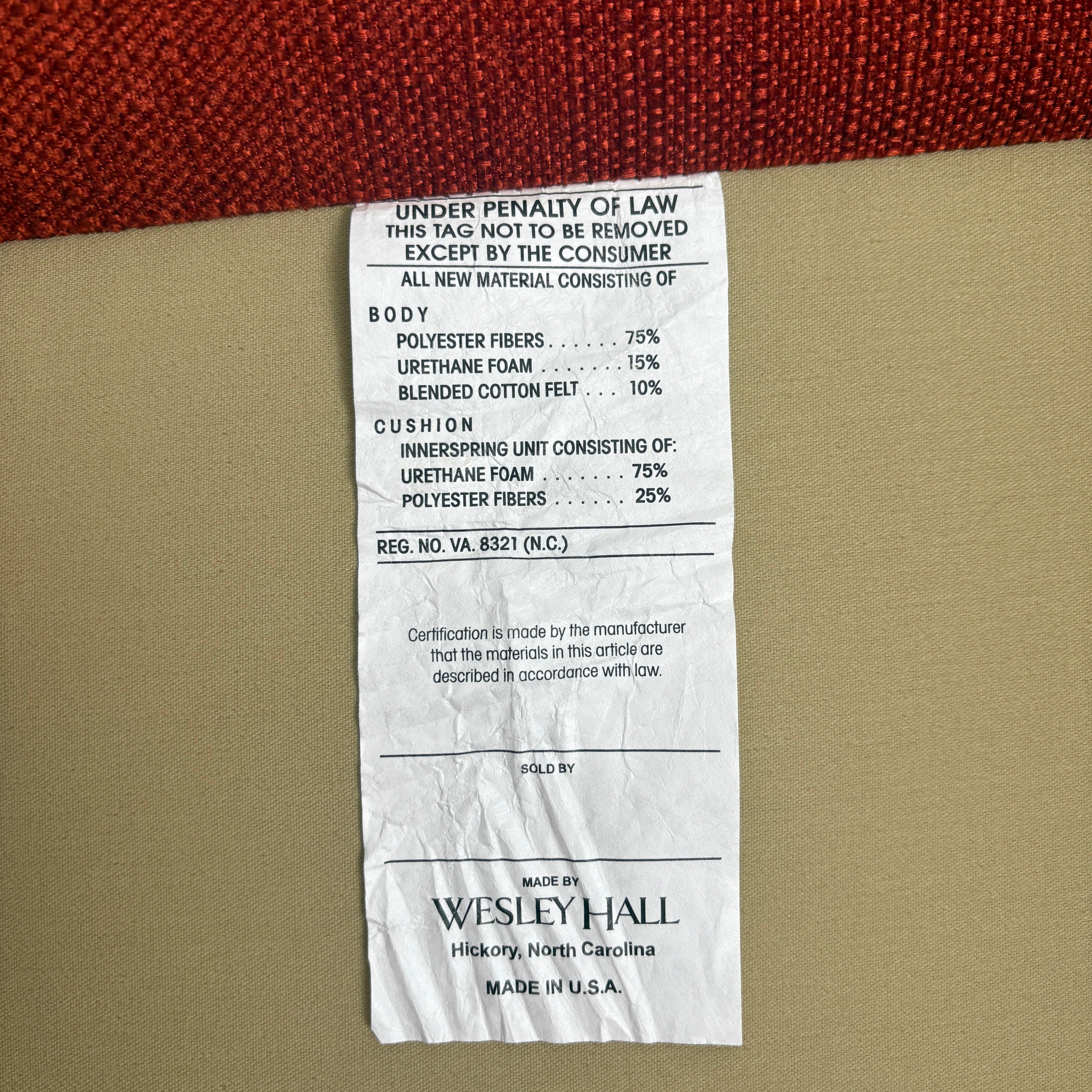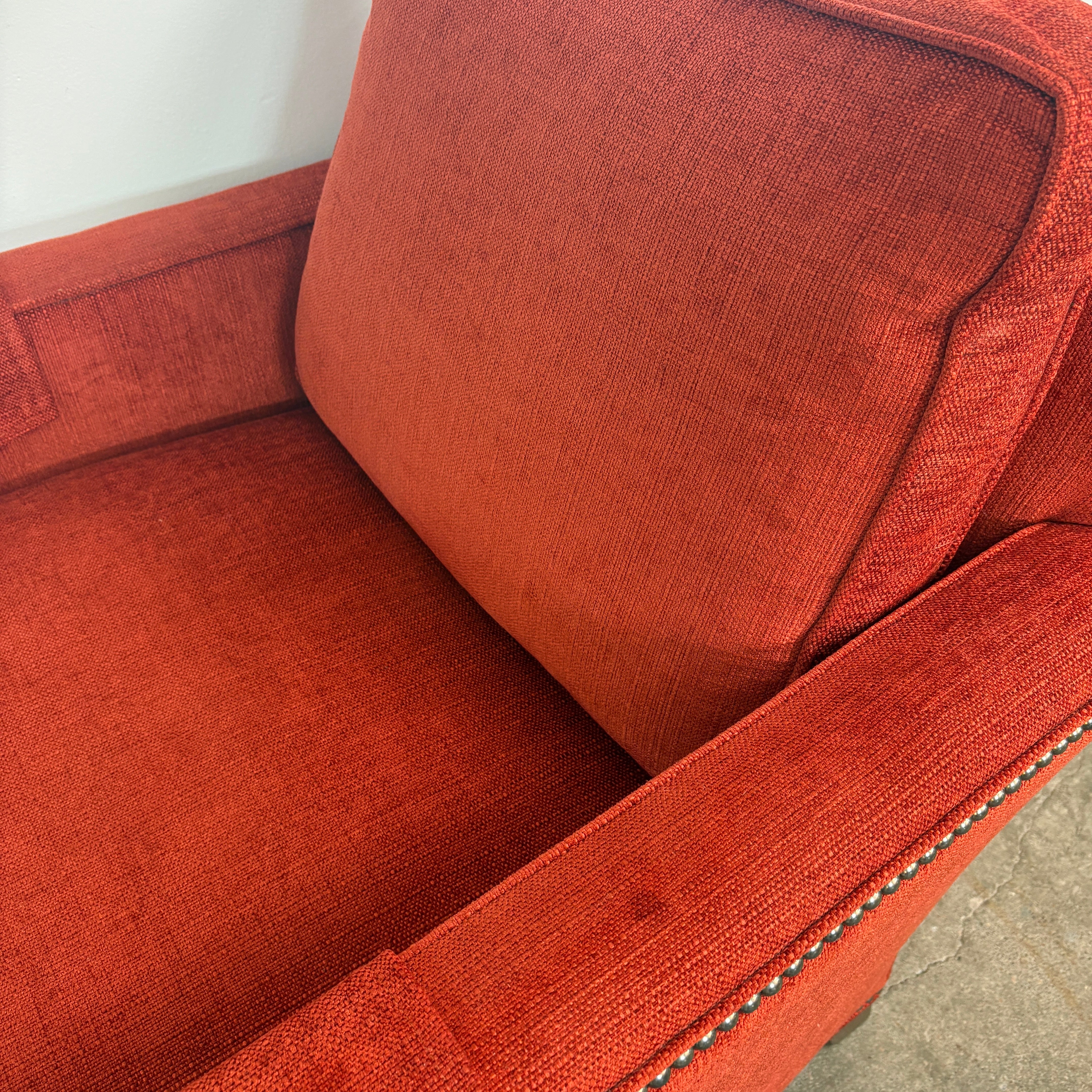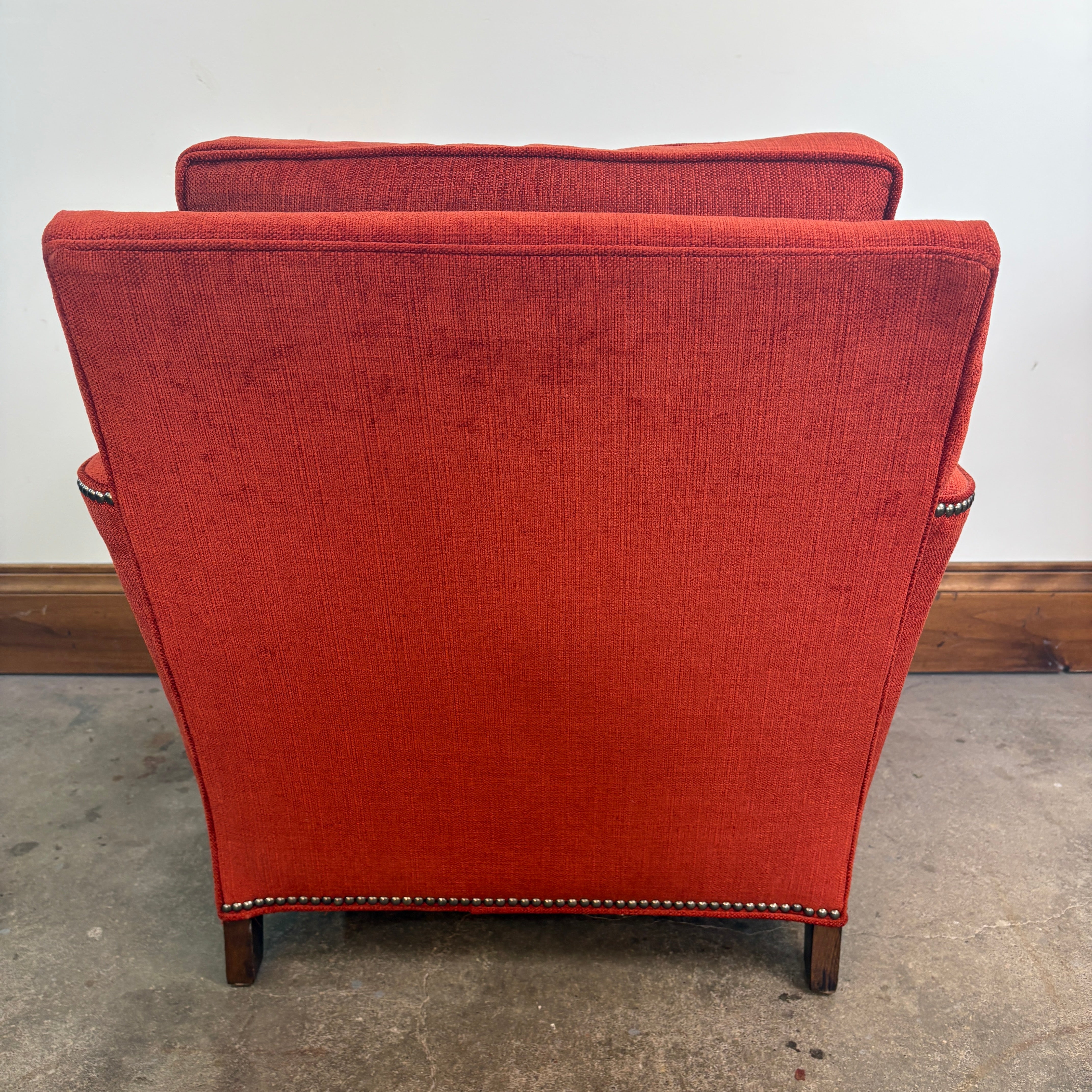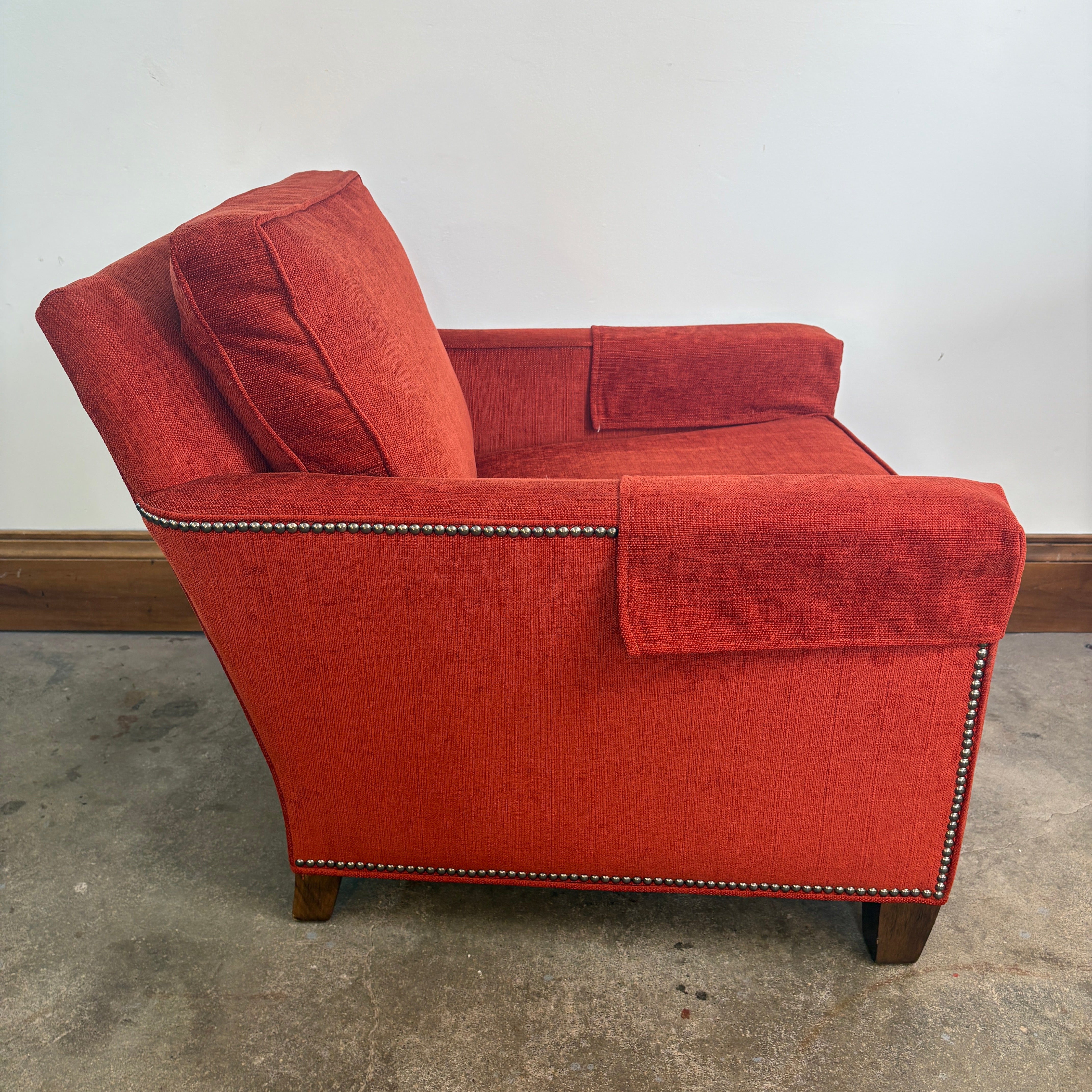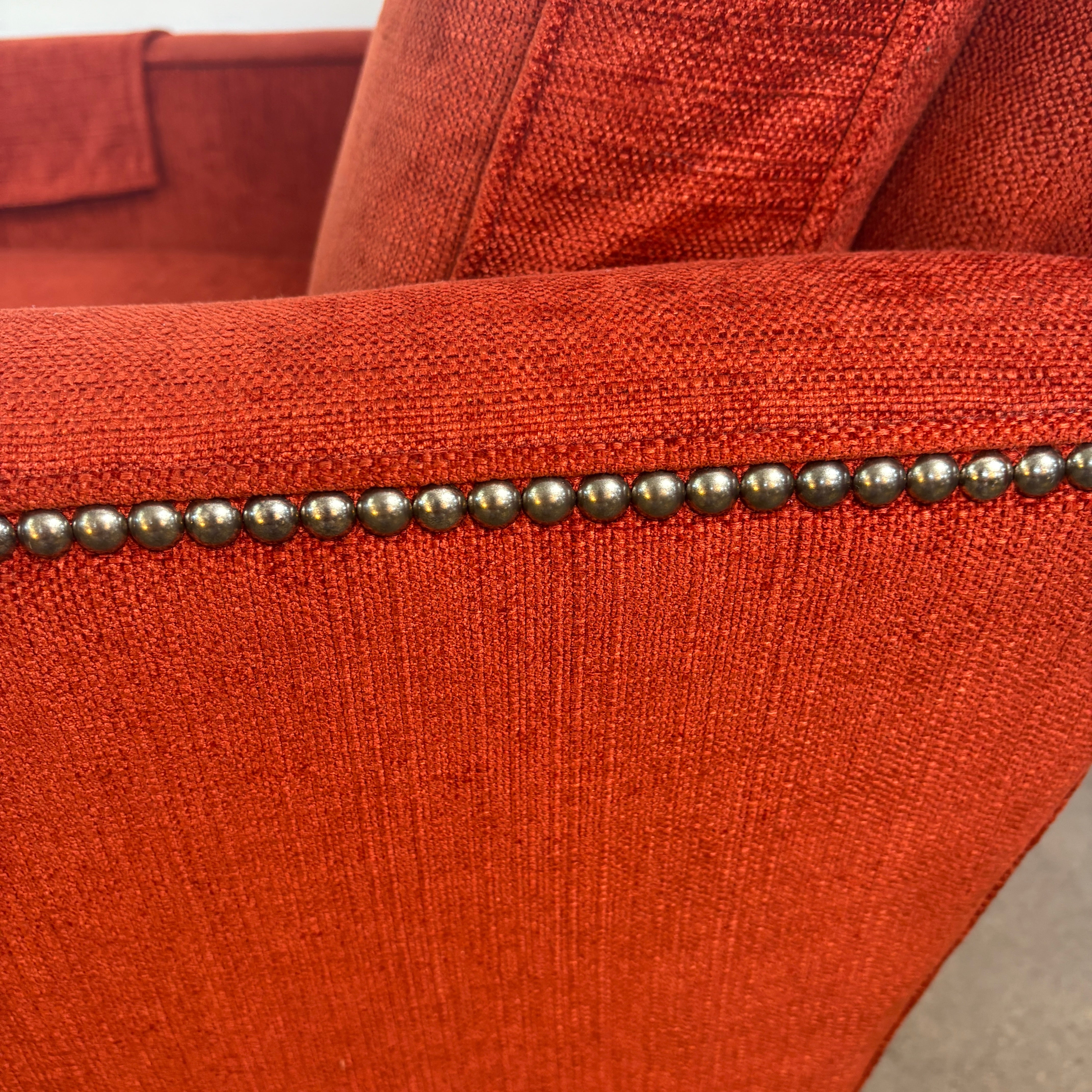 Pair of Wesley Hall Armchairs, Burnt Orange Chenille Upholstery, Track Arm, Nail Head Detail. Two pairs available, Price Reflects a Pair of Chairs. Note: At Time of Publishing, we Have Two Pairs.