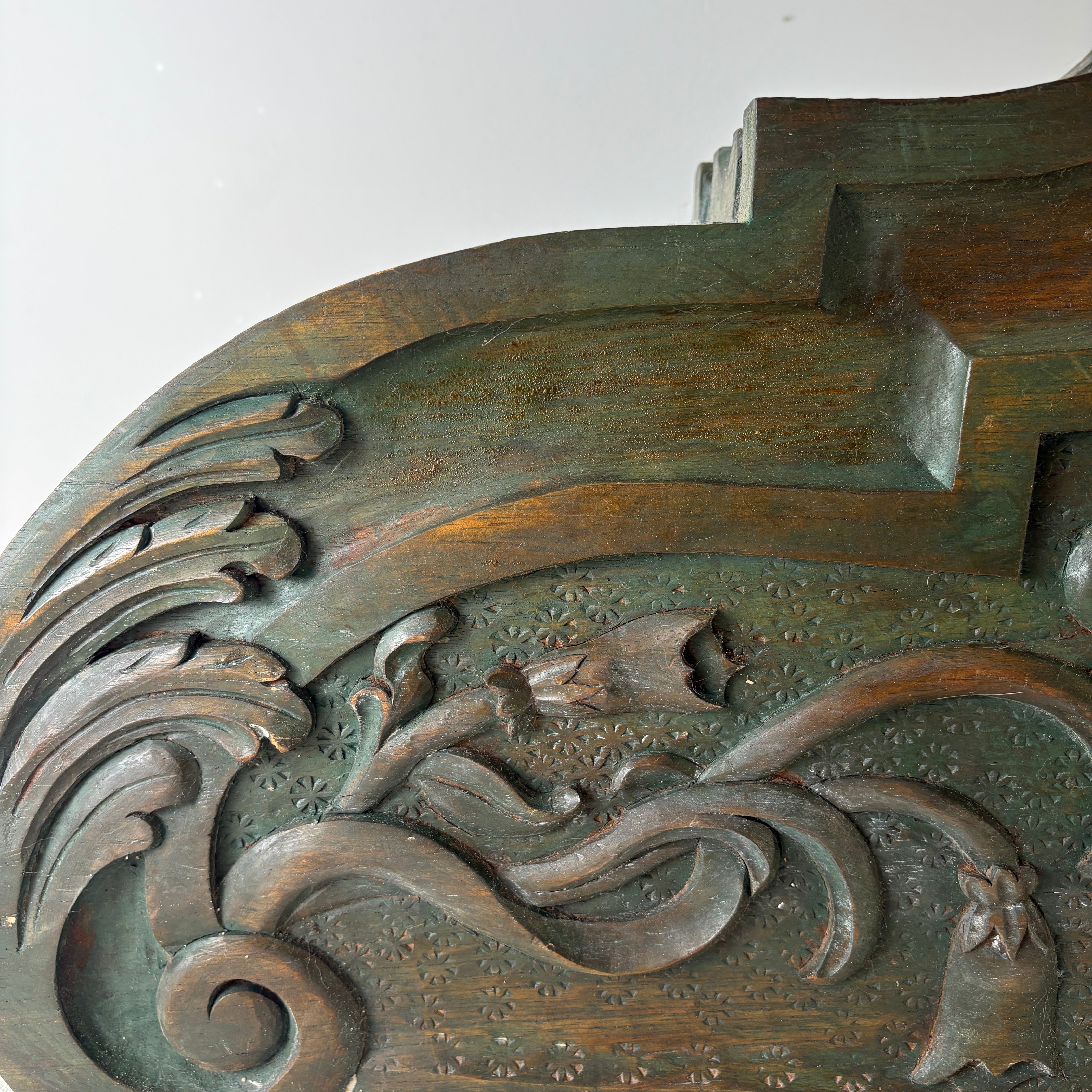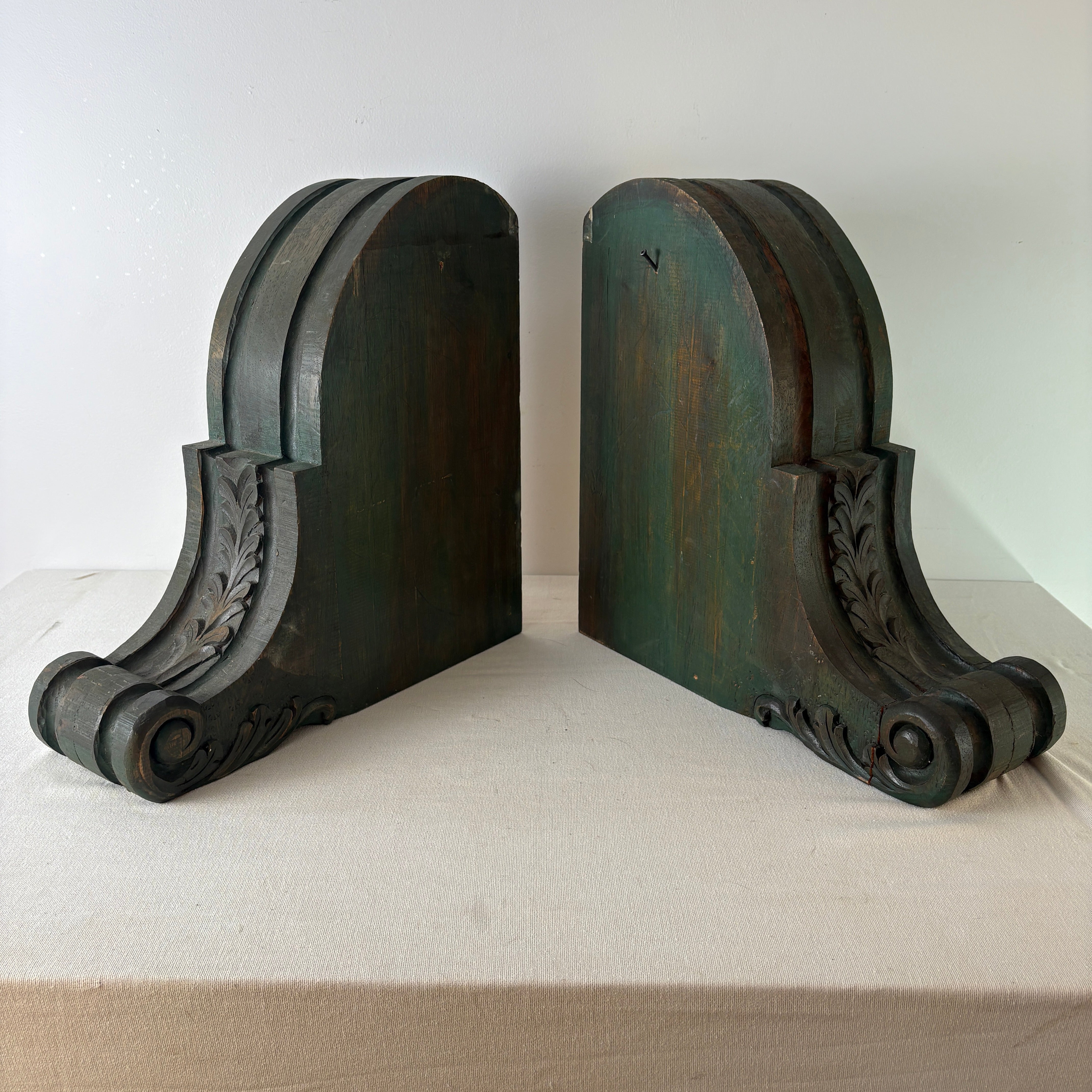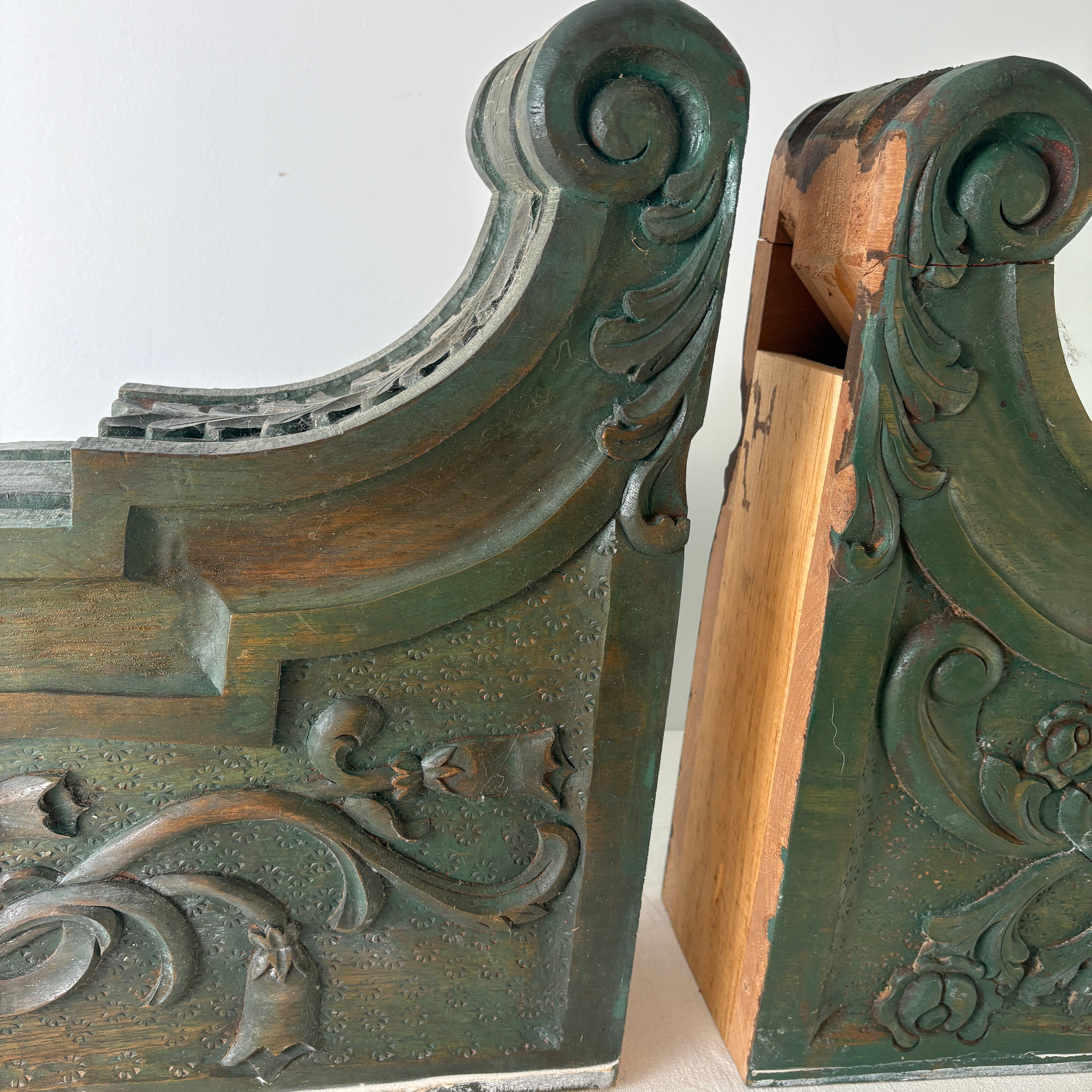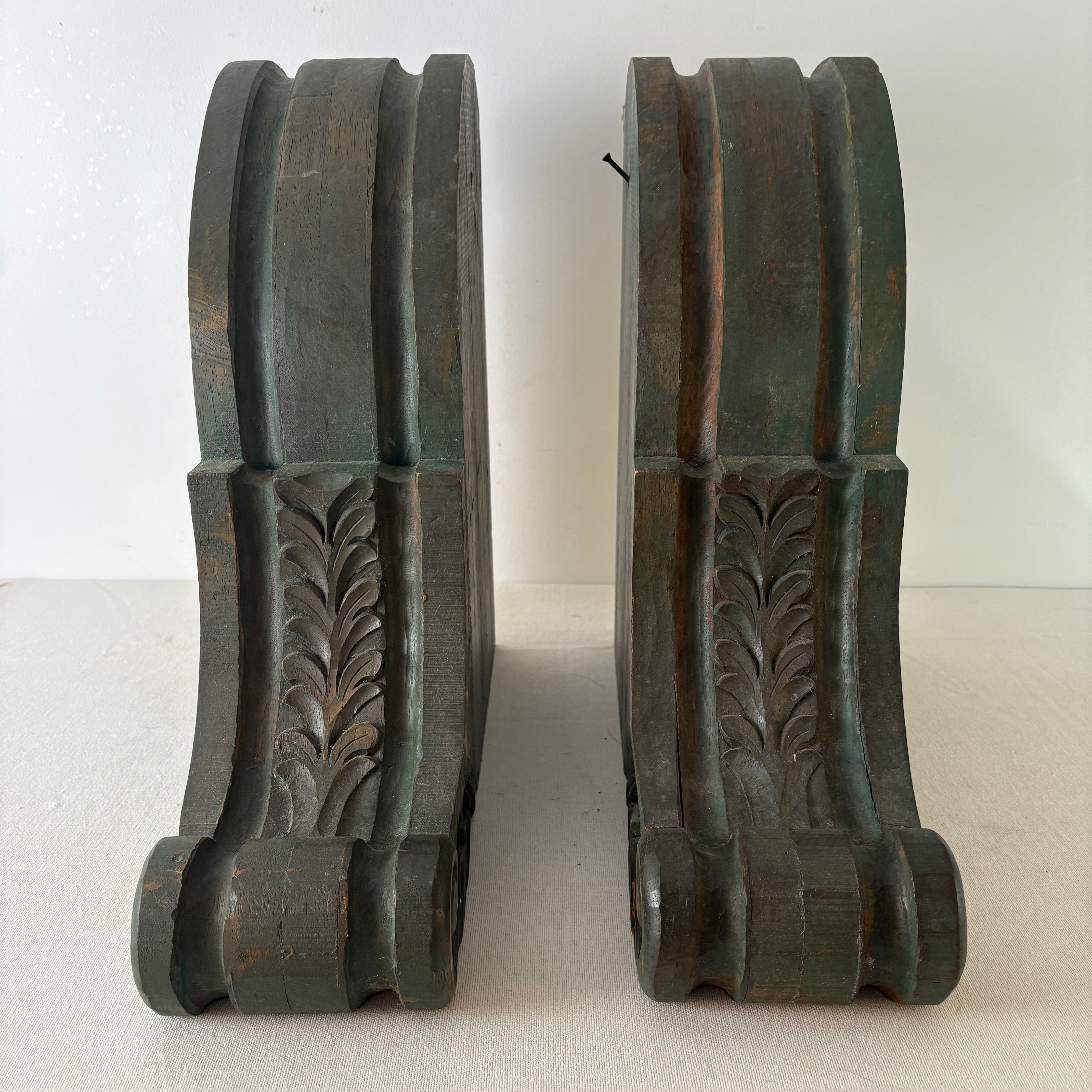 Pair of Solid Wood Corbels in Olive Green with Ornately Carved Acanthus Leaf Design.