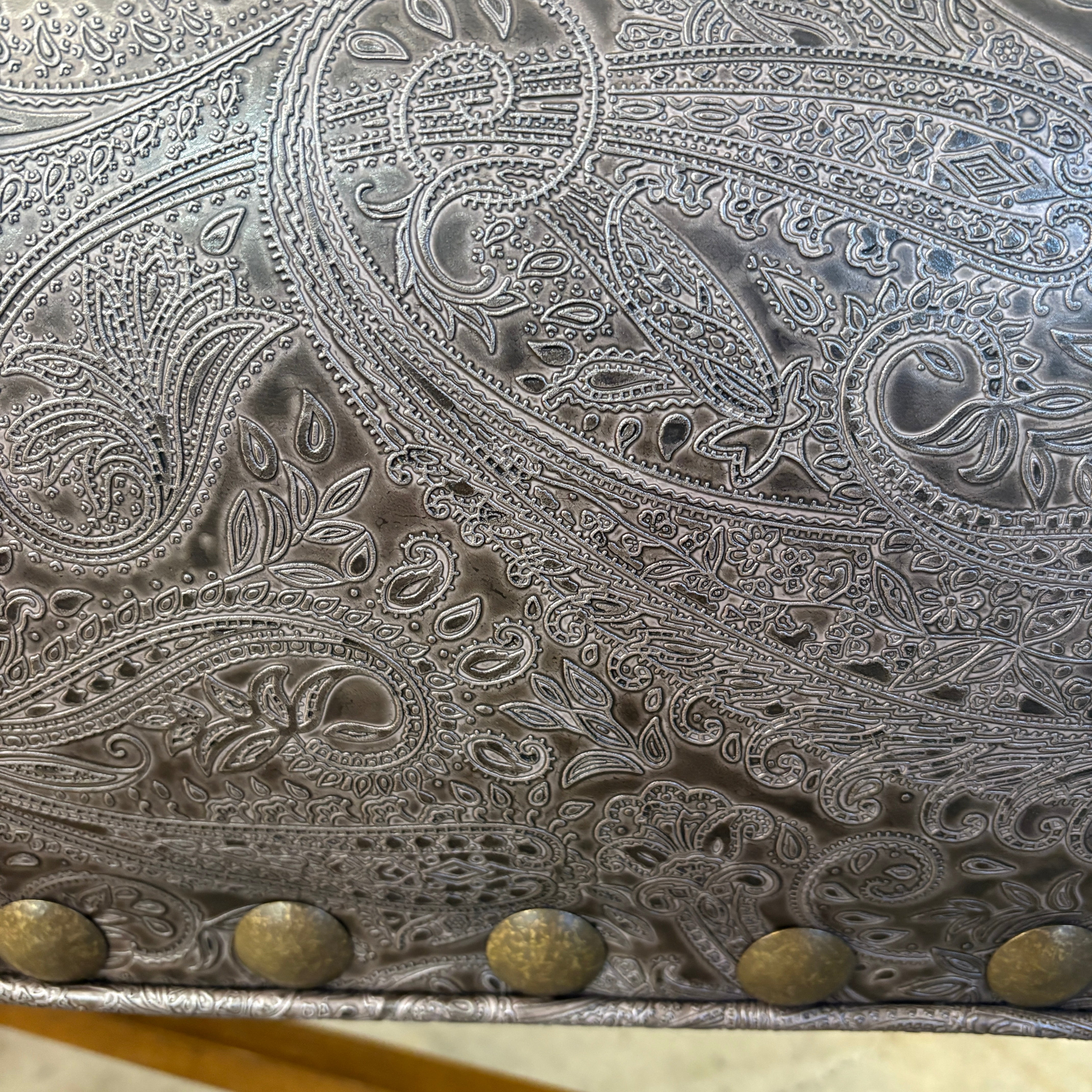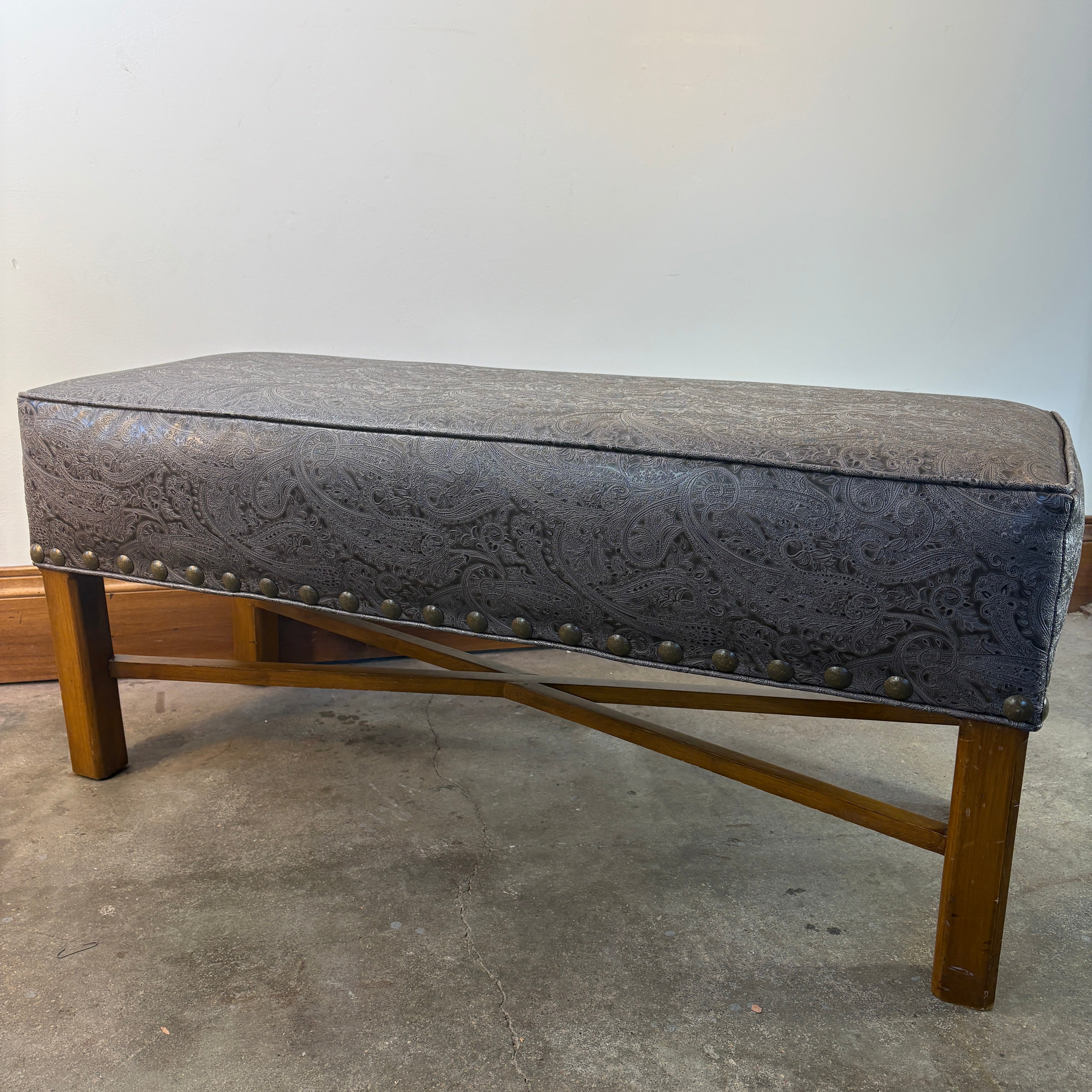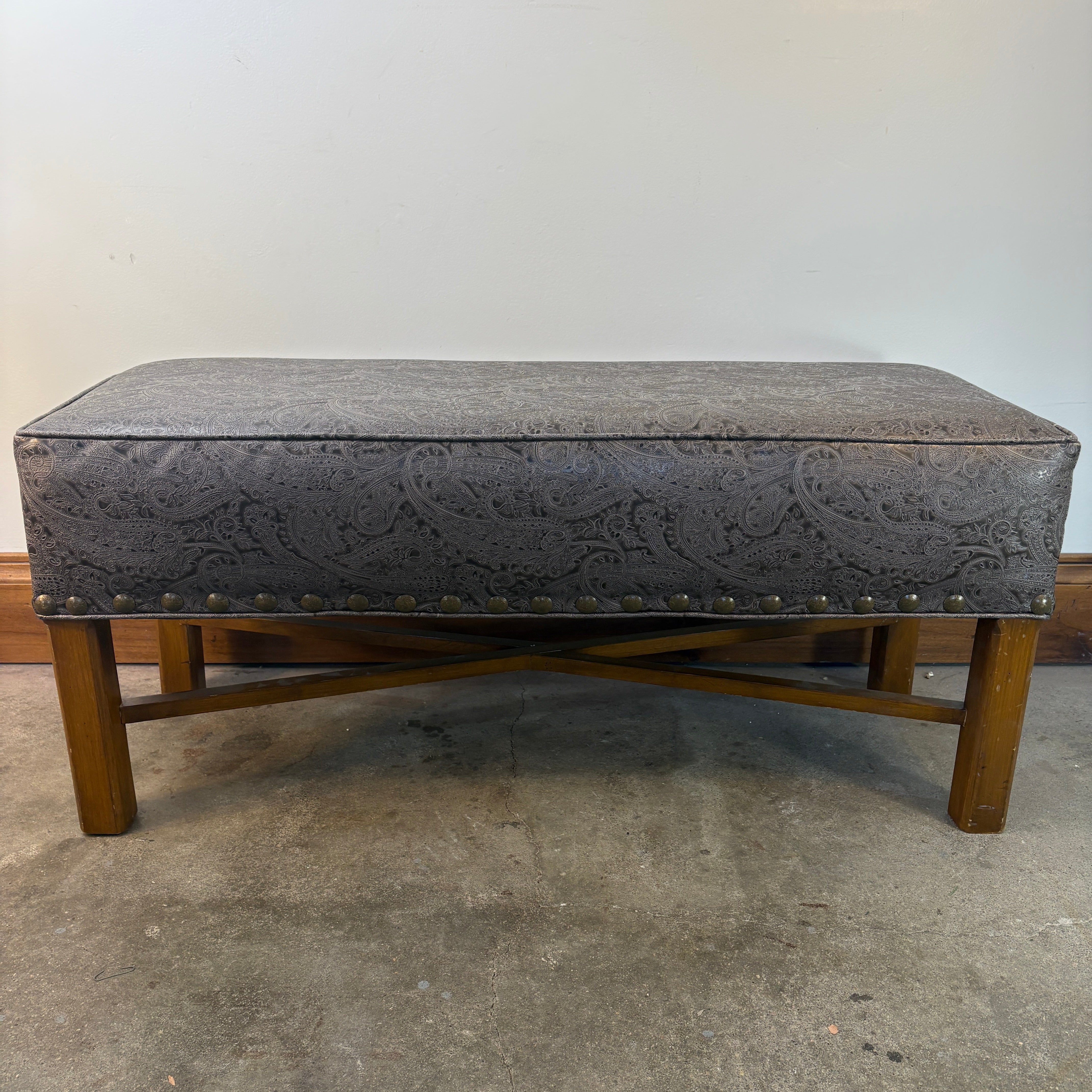 Paisley Embossed Faux Leather Bench with X Shaped Stretcher Below.