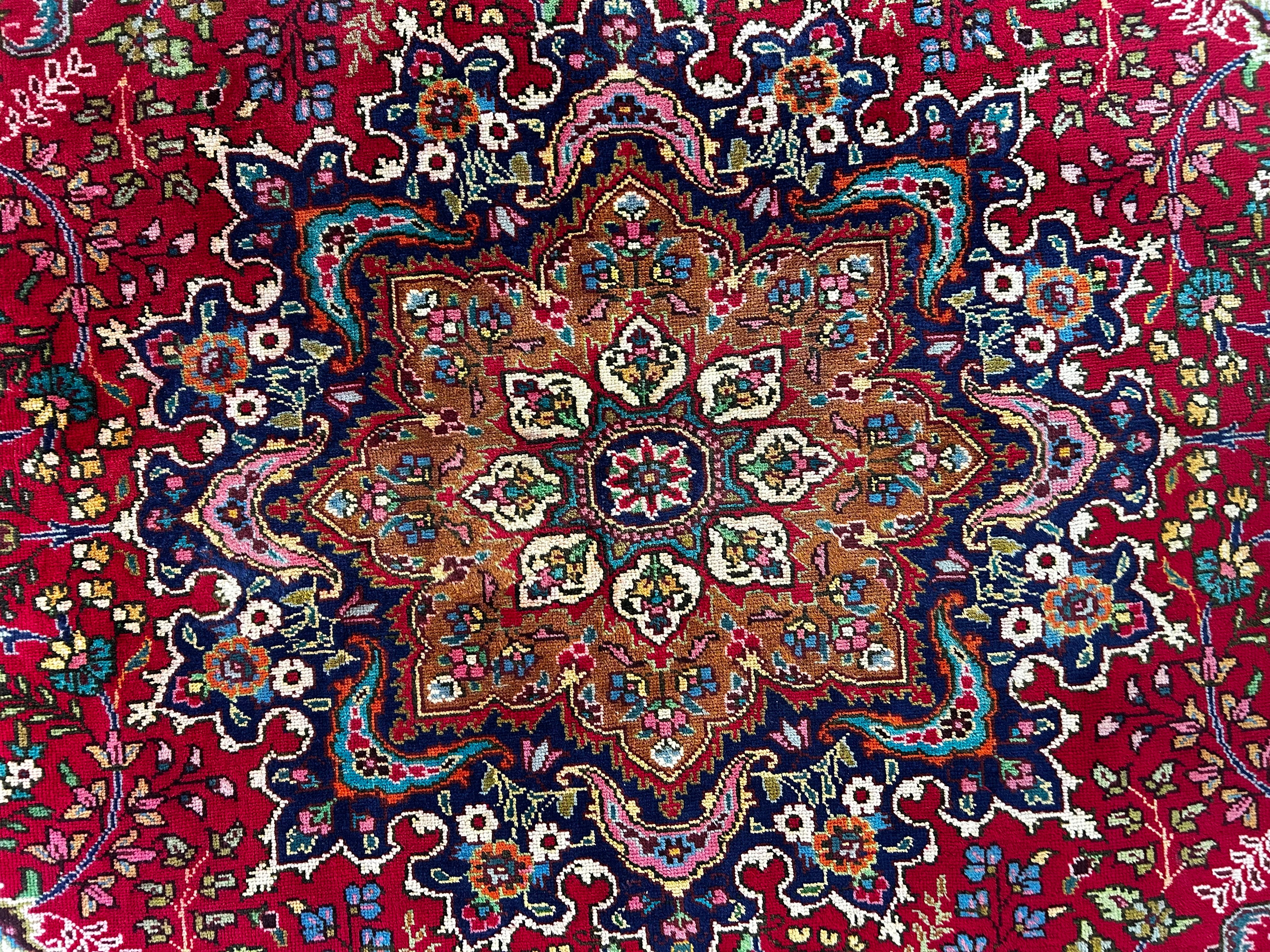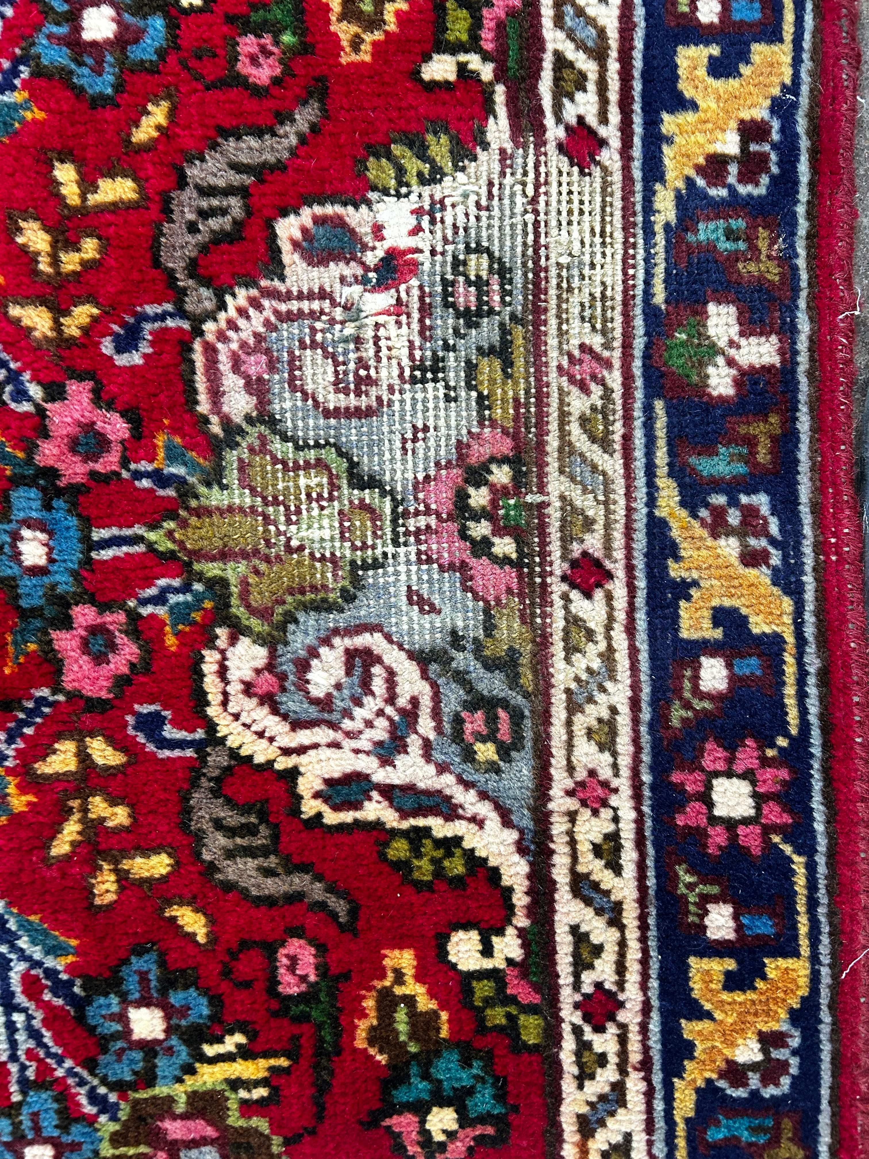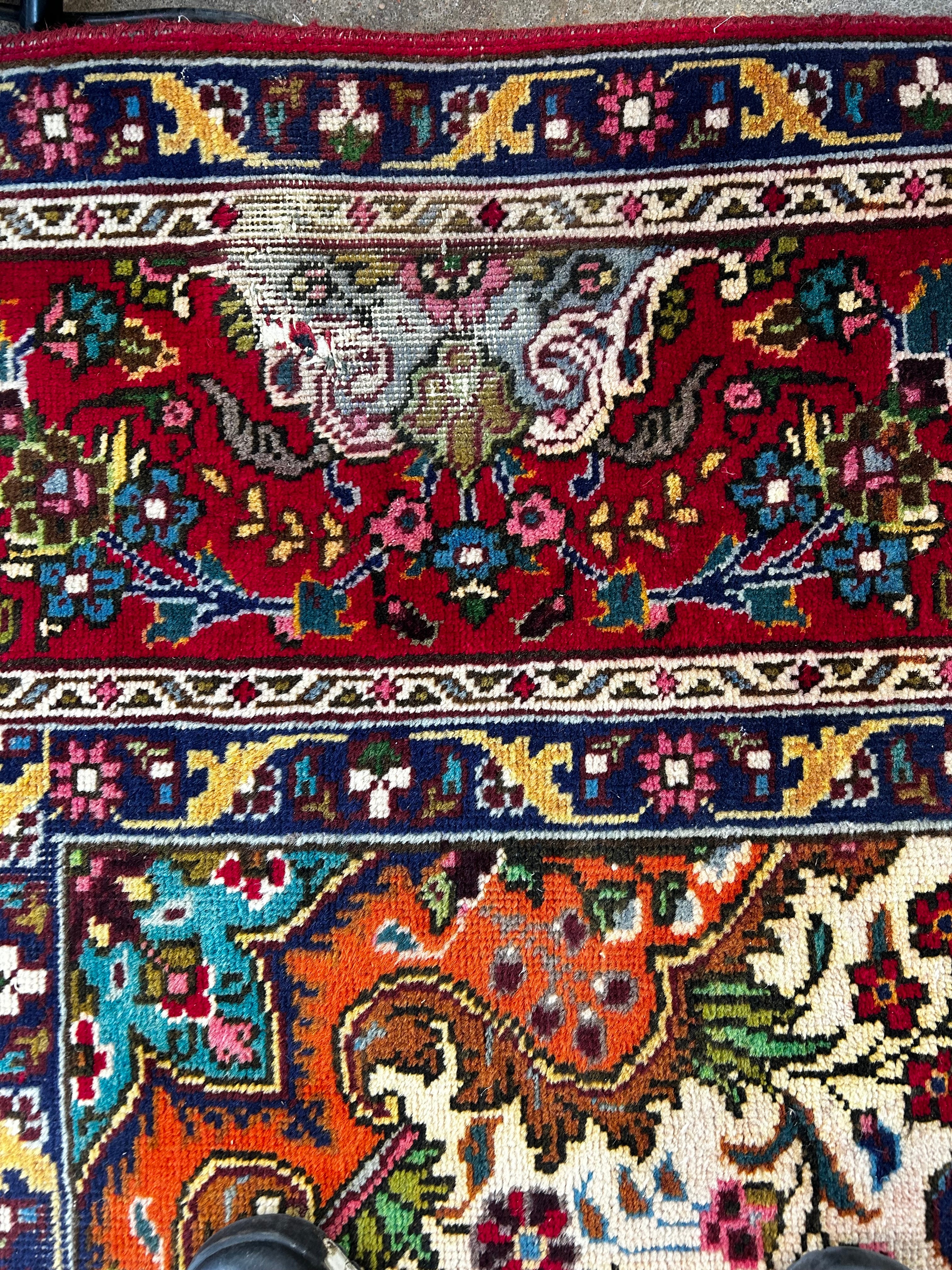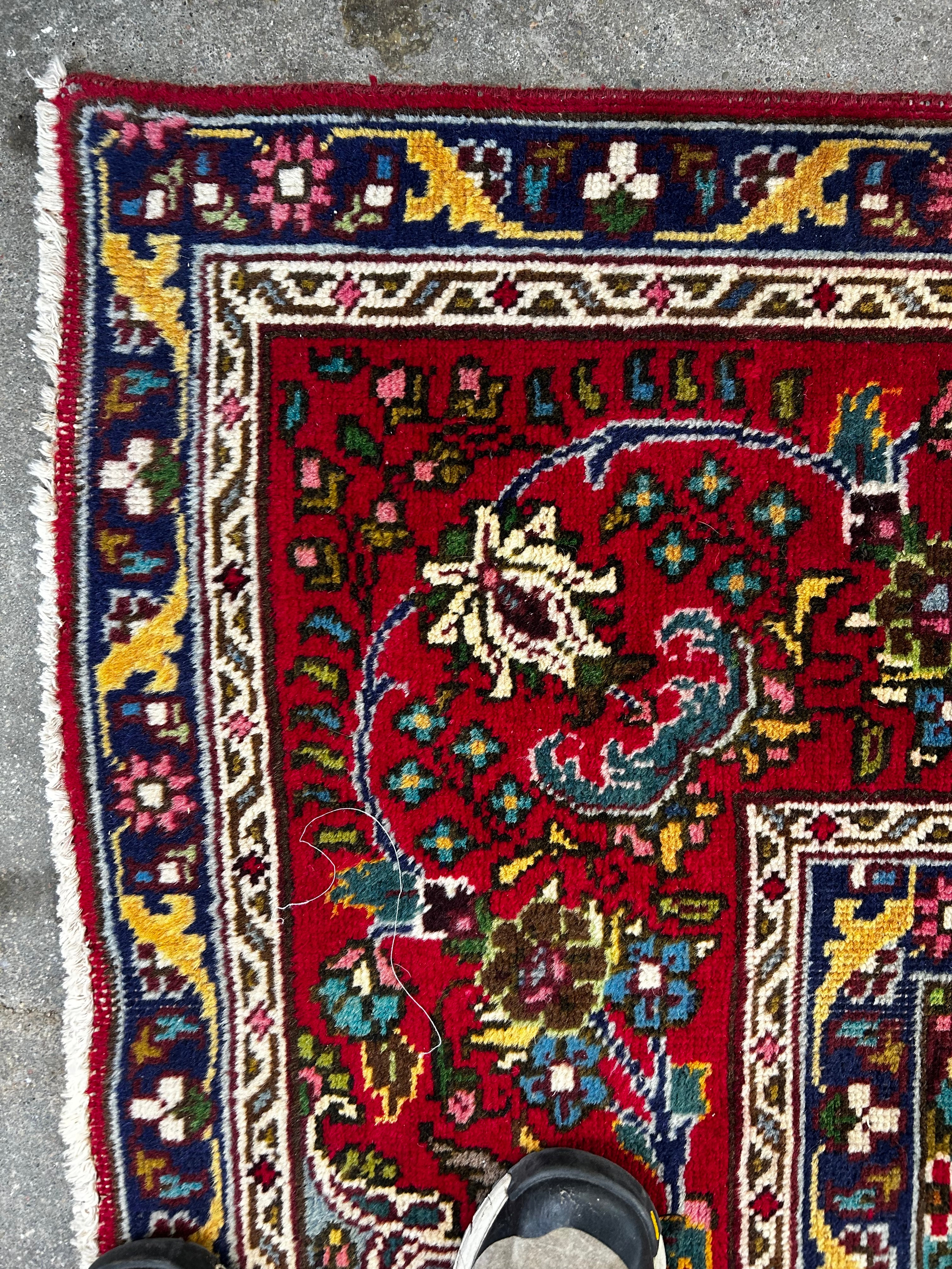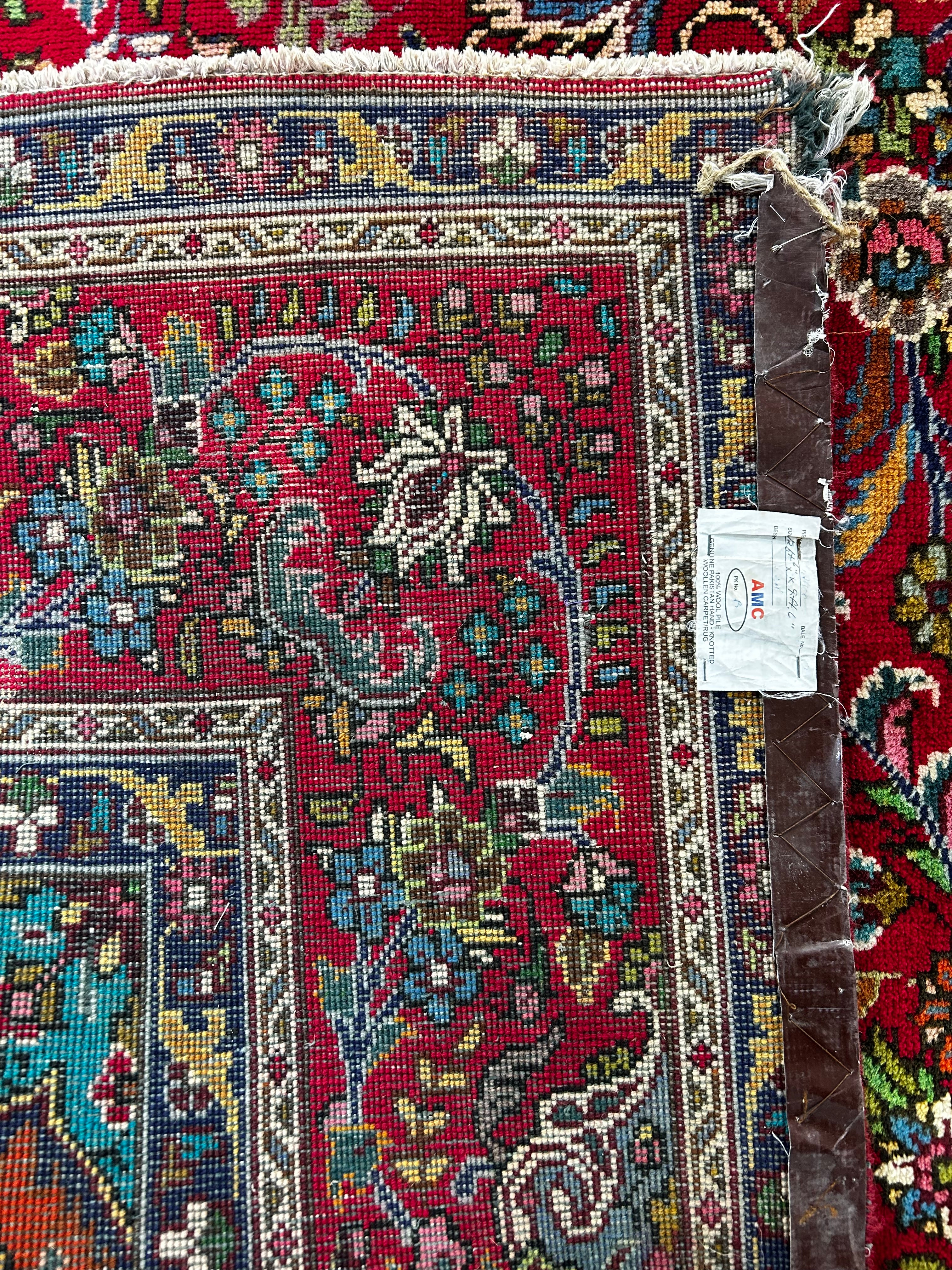 AMC wool area rug, red with multi-colored accents, rectangle shape, traditional design. Hand knotted in Pakistan.