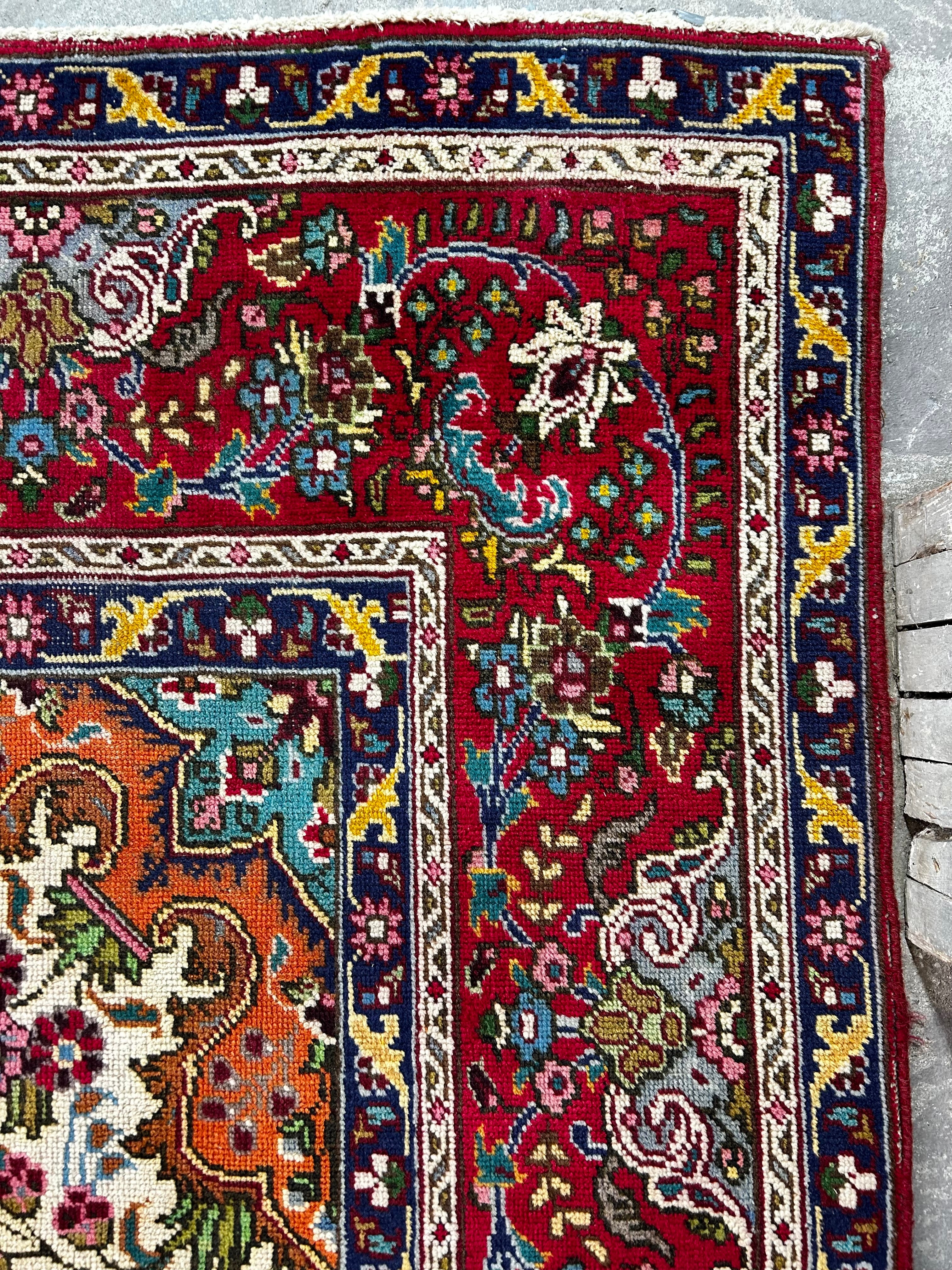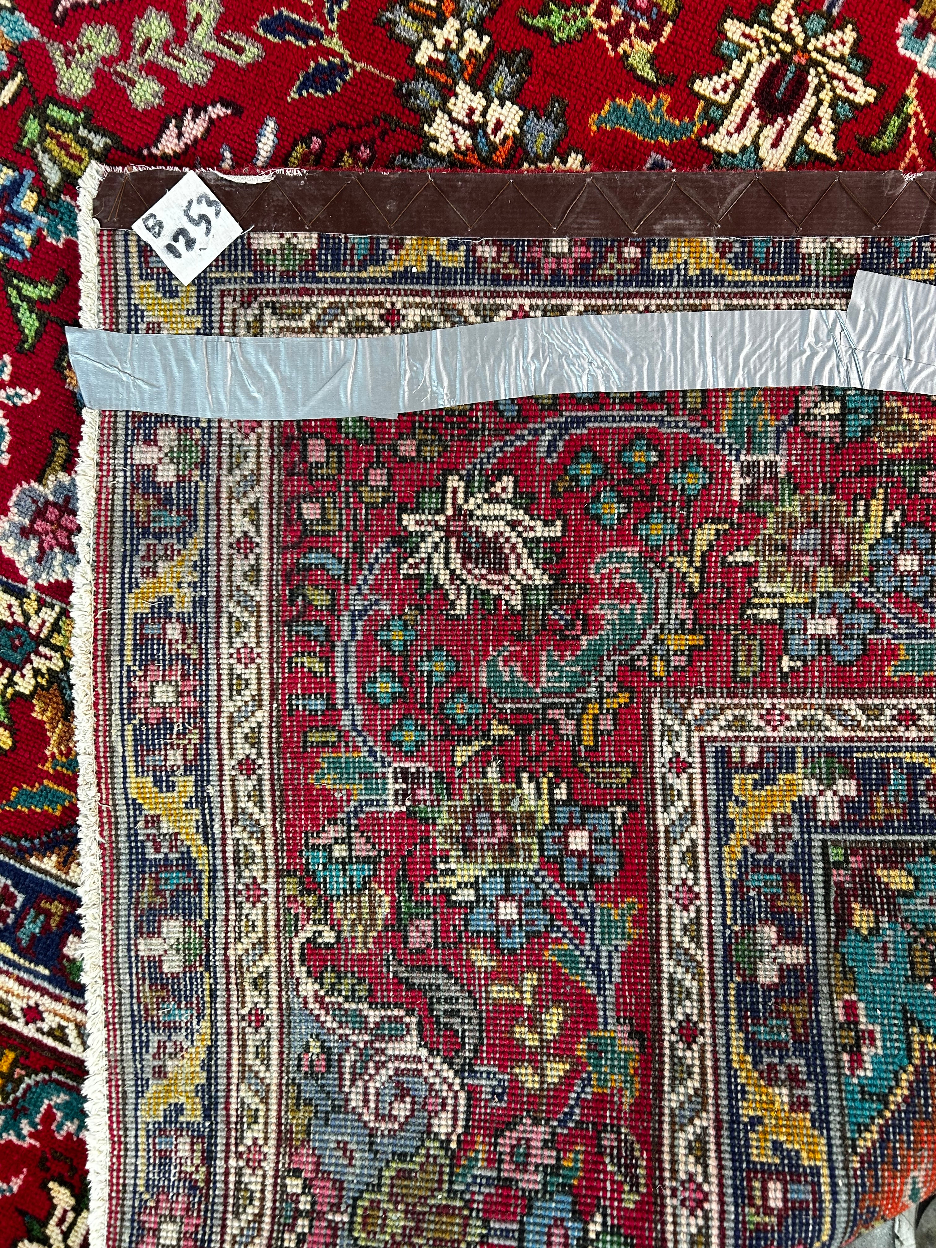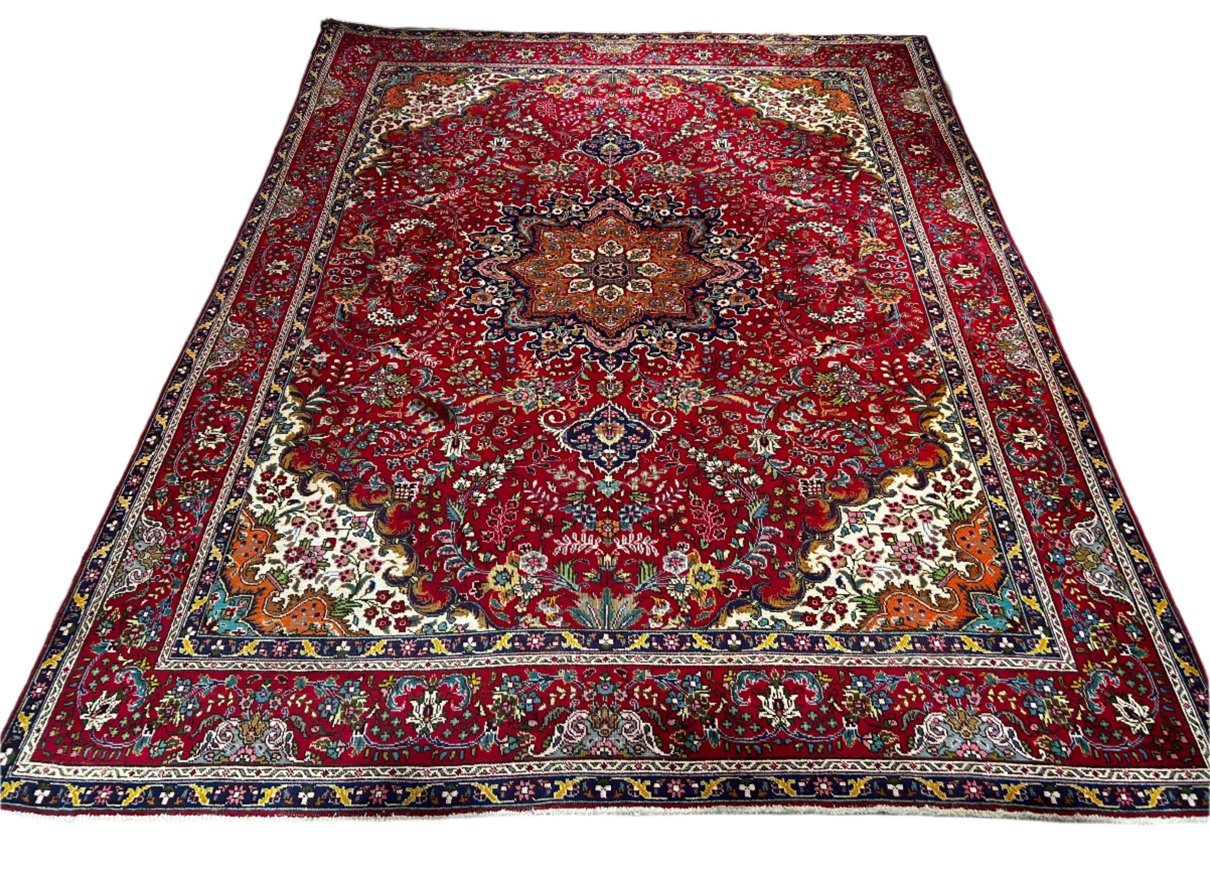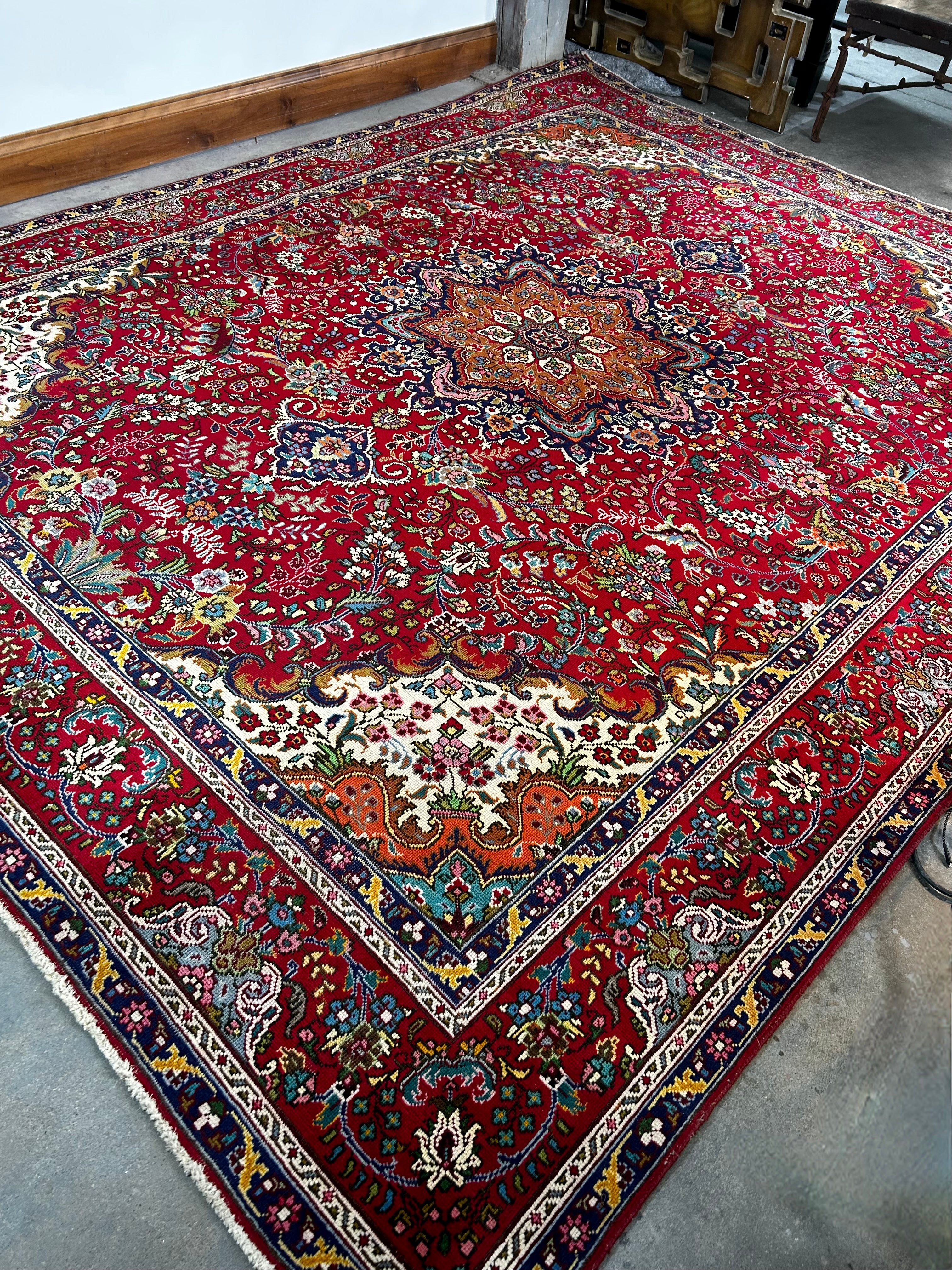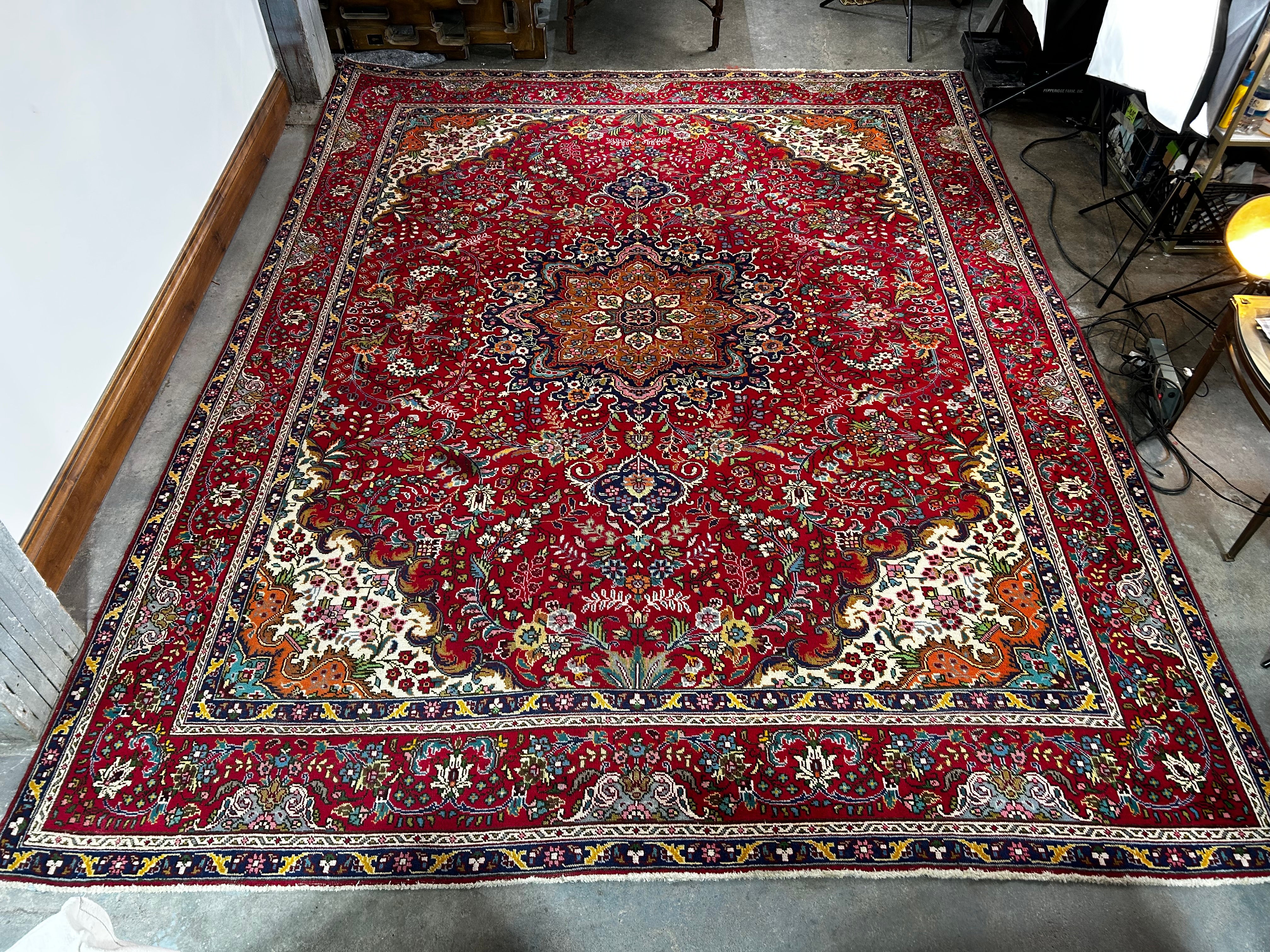 AMC wool area rug, red with multi-colored accents, rectangle shape, traditional design. Hand knotted in Pakistan.