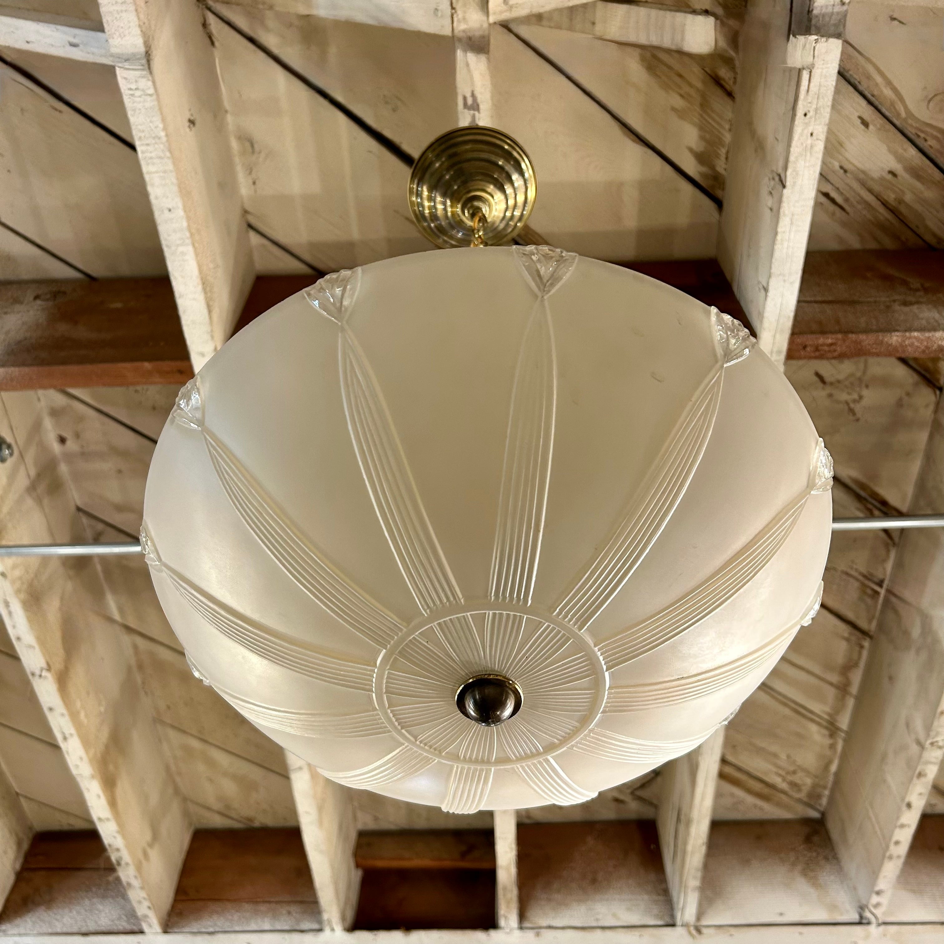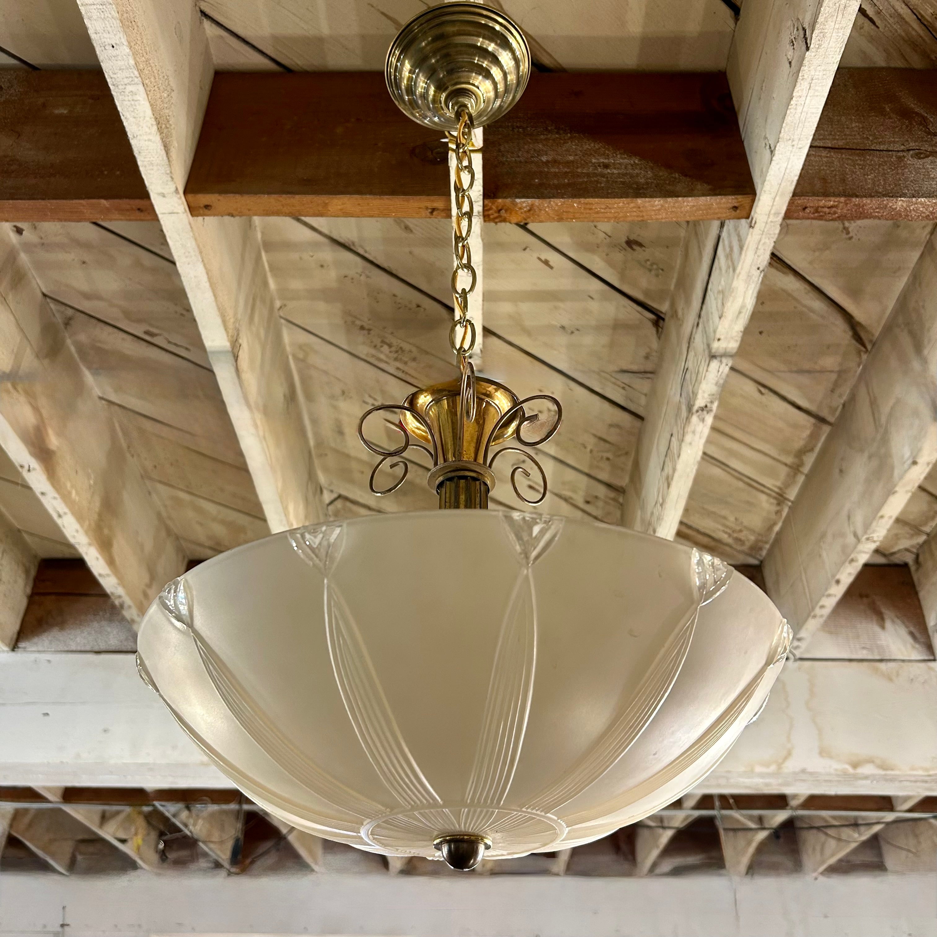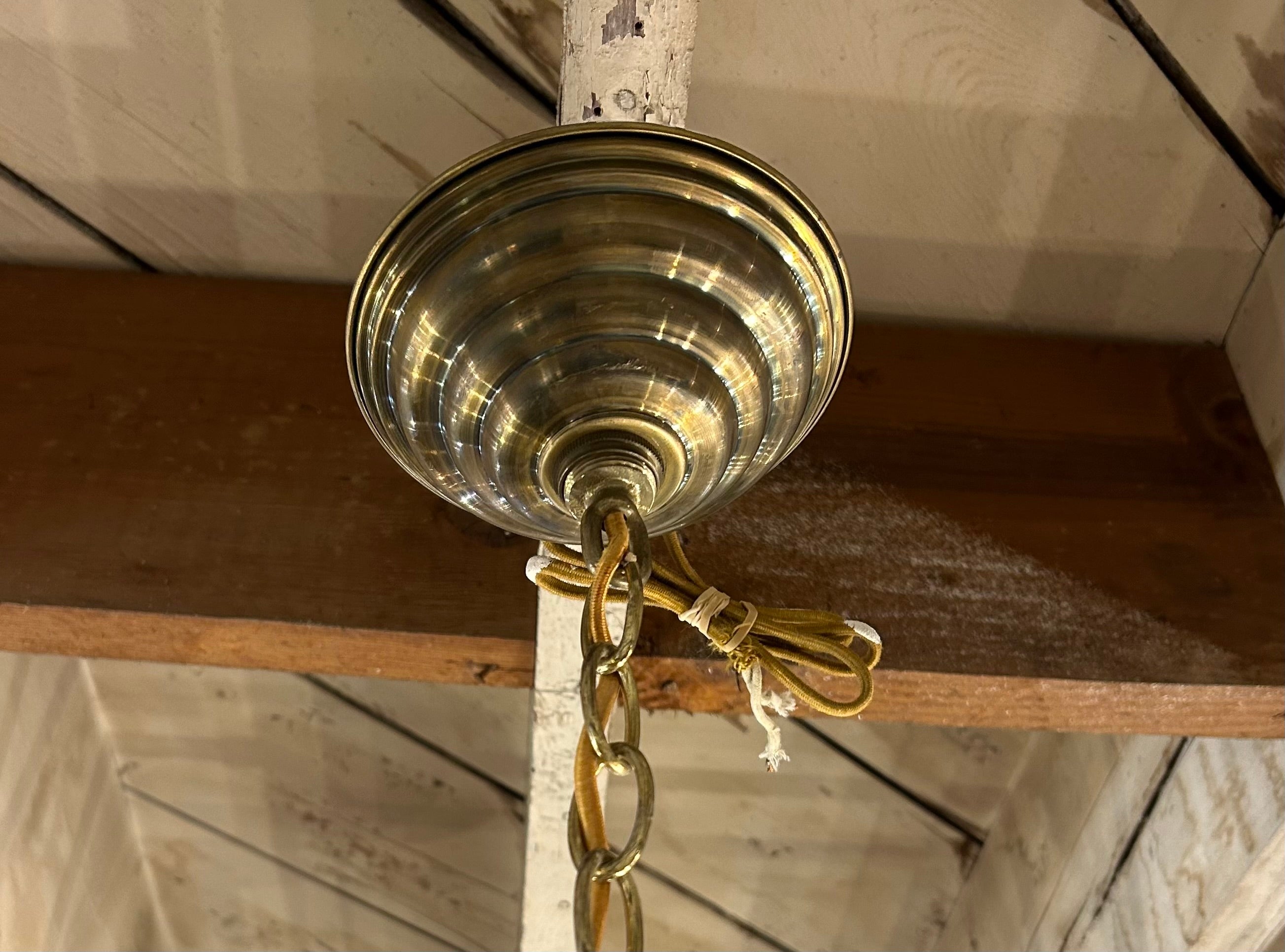 Pendant Light with Milk Glass Cream Shade, Brass Hardware, Chain and Canopy. Vintage.