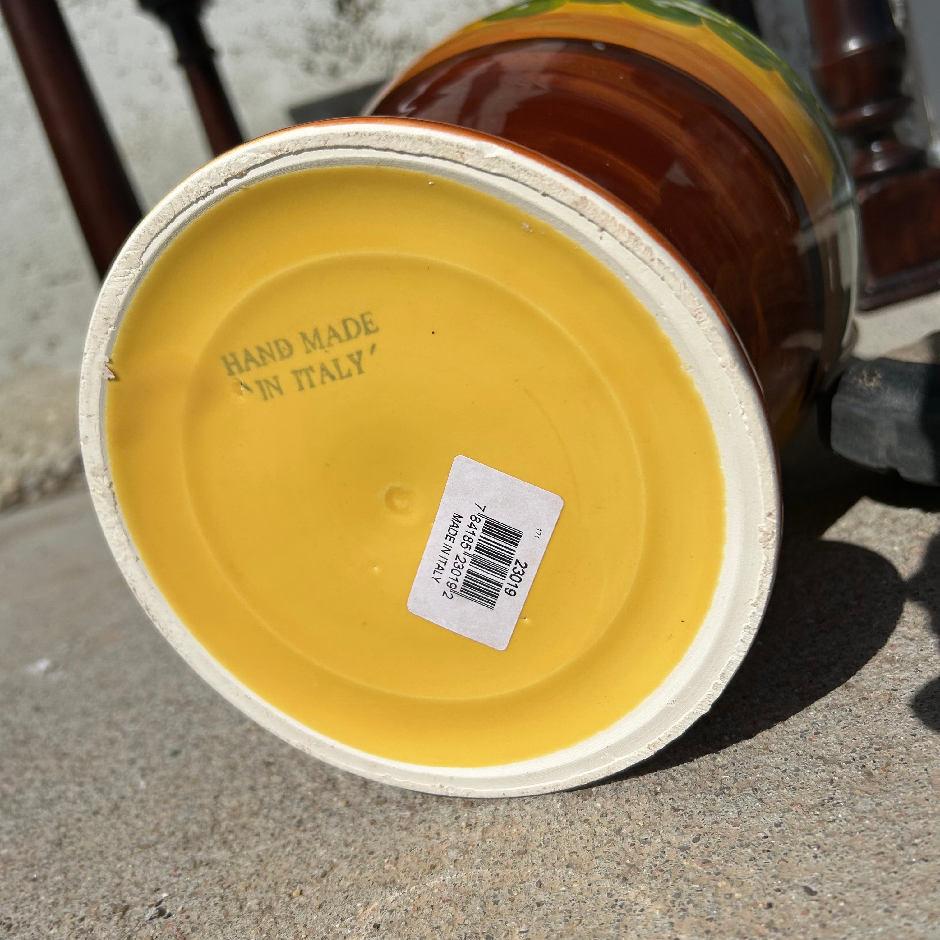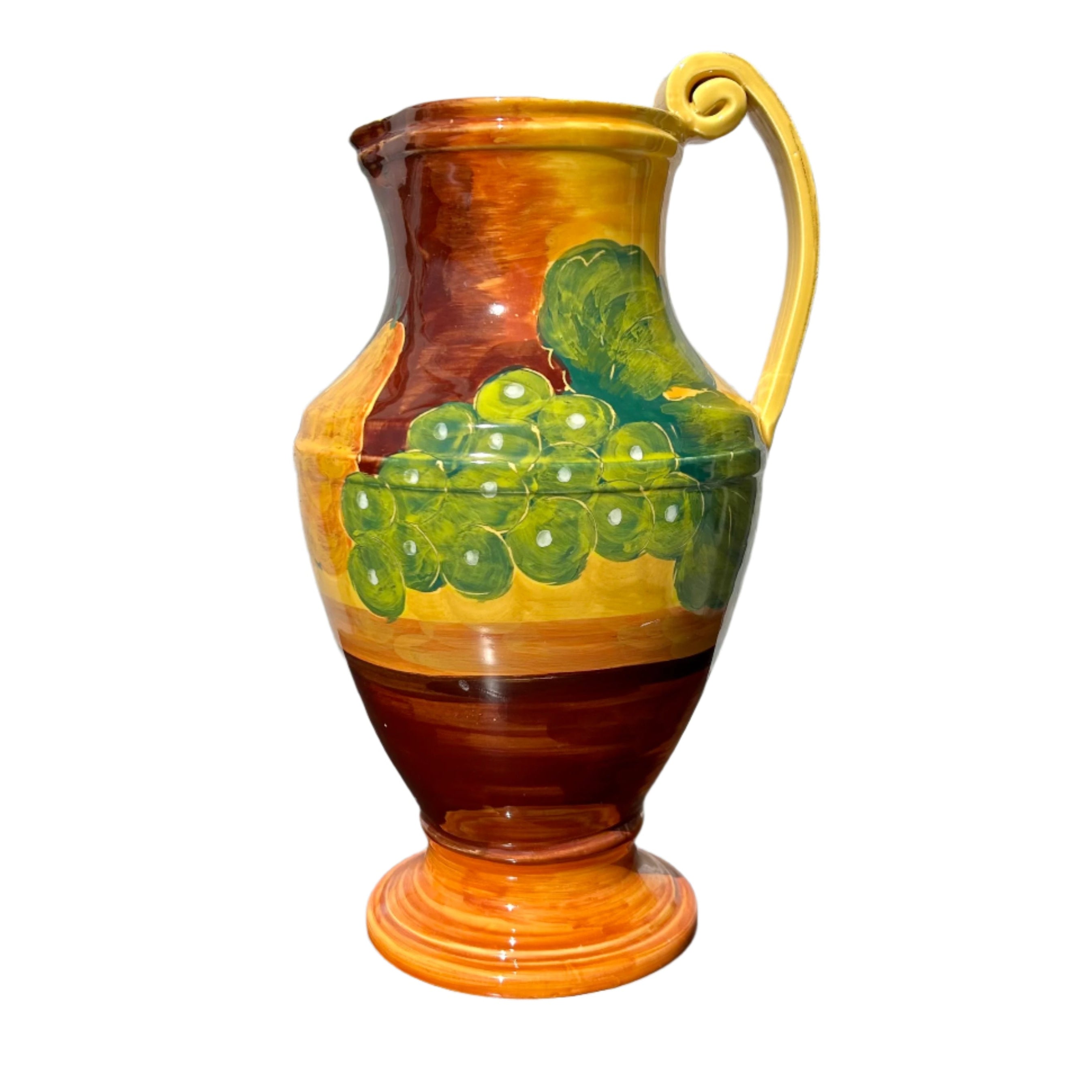 Pitcher, Pottery, Yellow, Brown, Green, Hand Painted Grapes and Pears, Made in Italy.