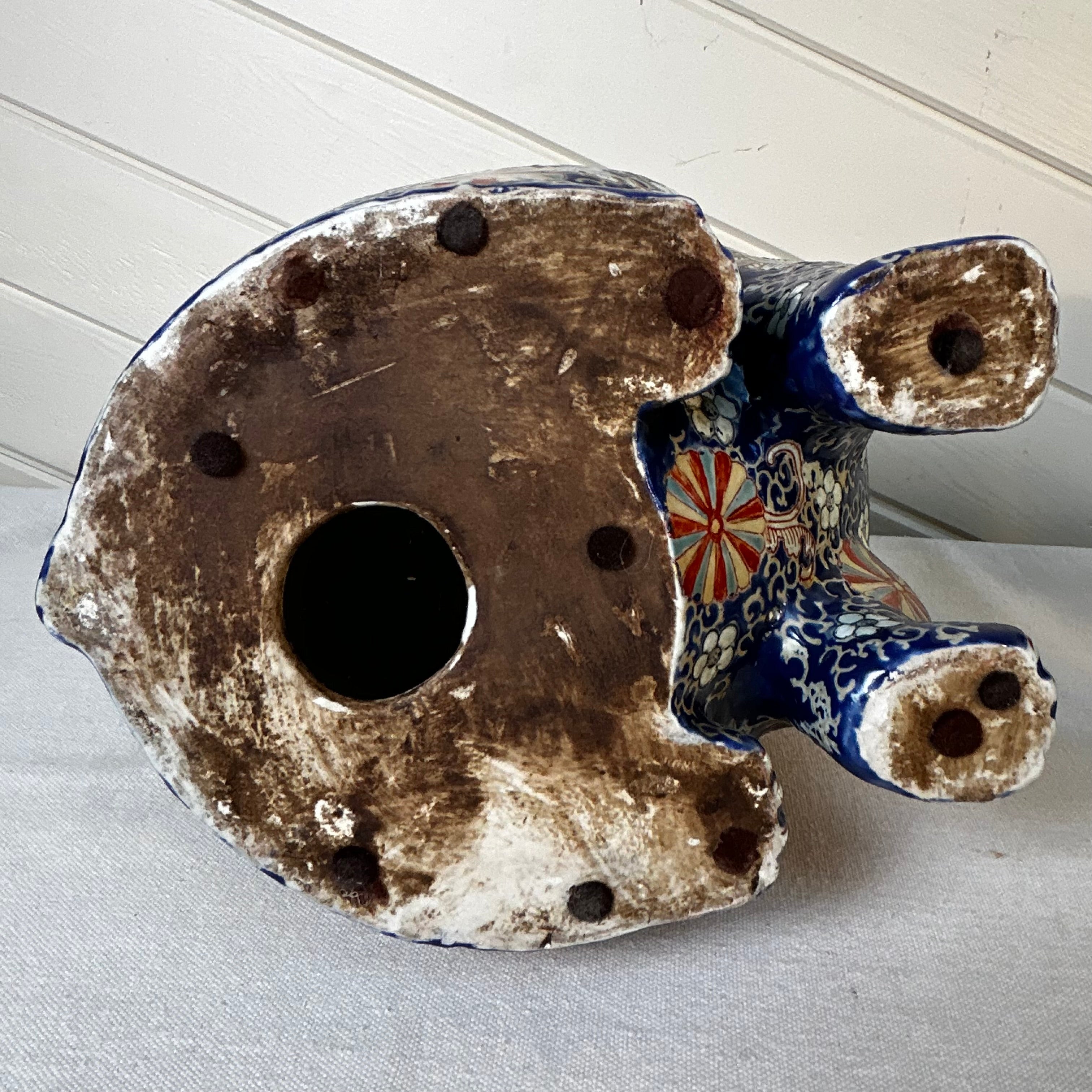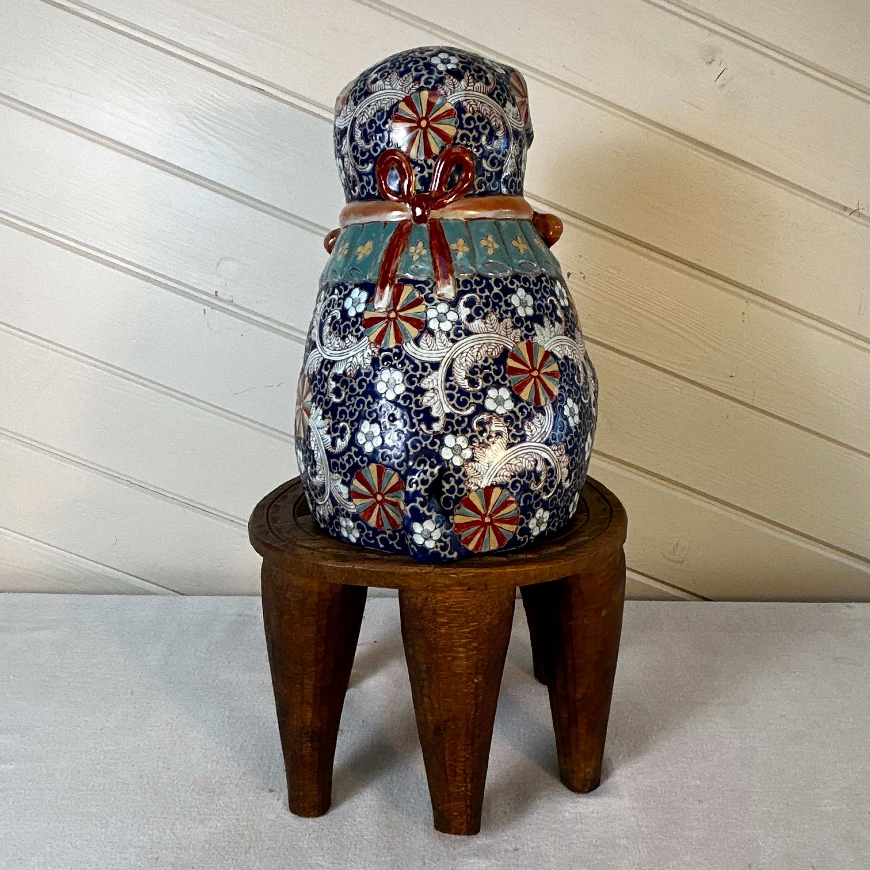 Expertly crafted with traditional Asian porcelain techniques, this vintage blue dog figurine sits elegantly on a six legged wooden stand. Adorned with a green-blue ruffled collar, this hand-painted piece is a stunning addition to any art collector.
