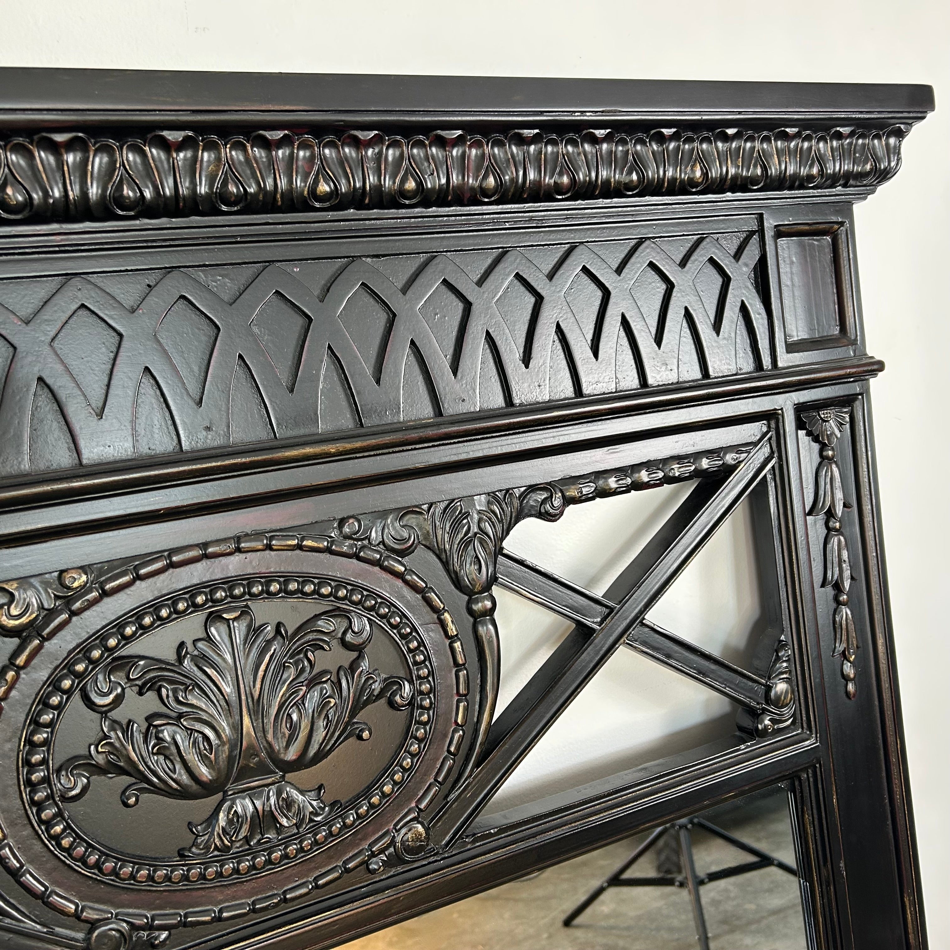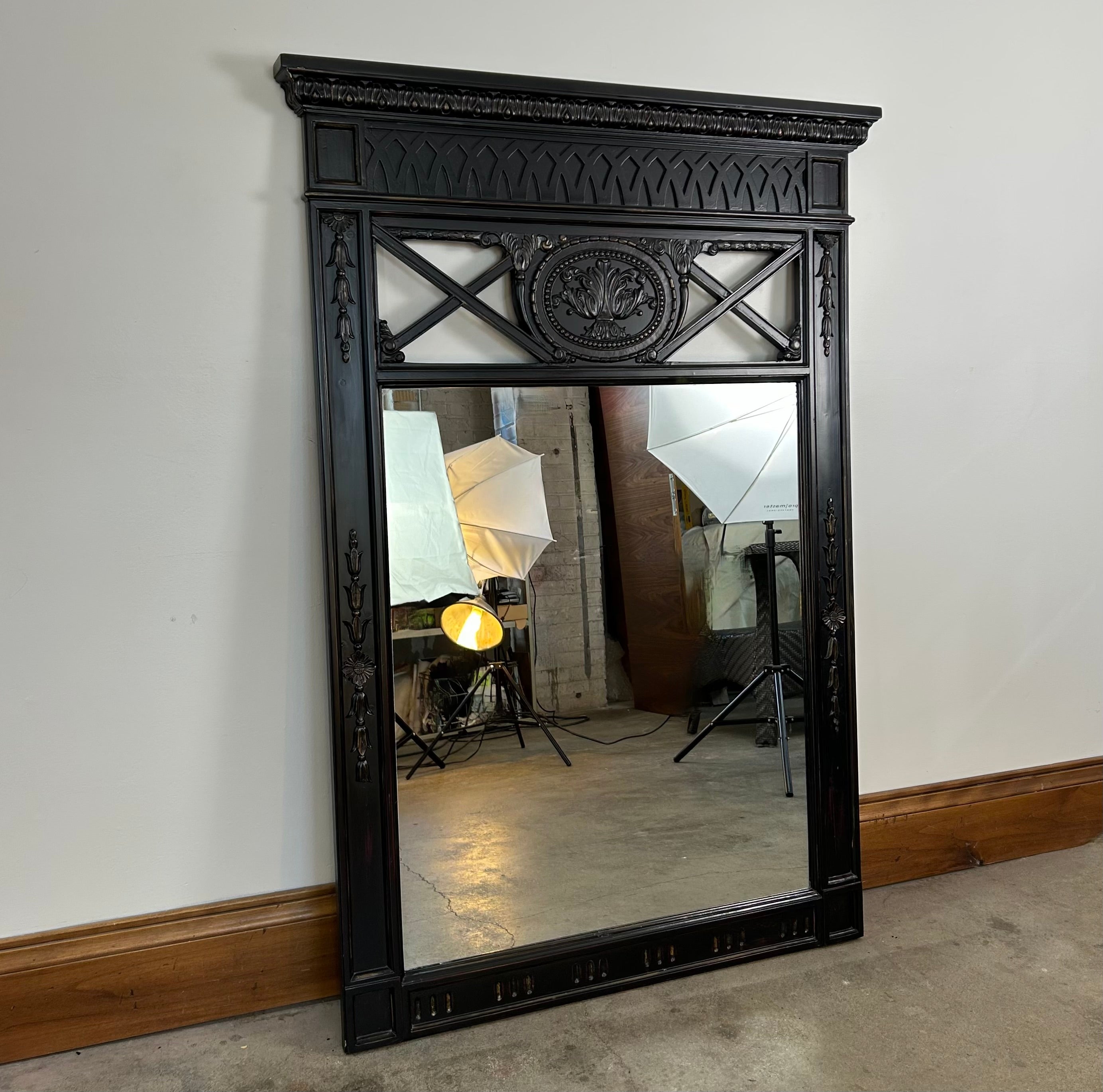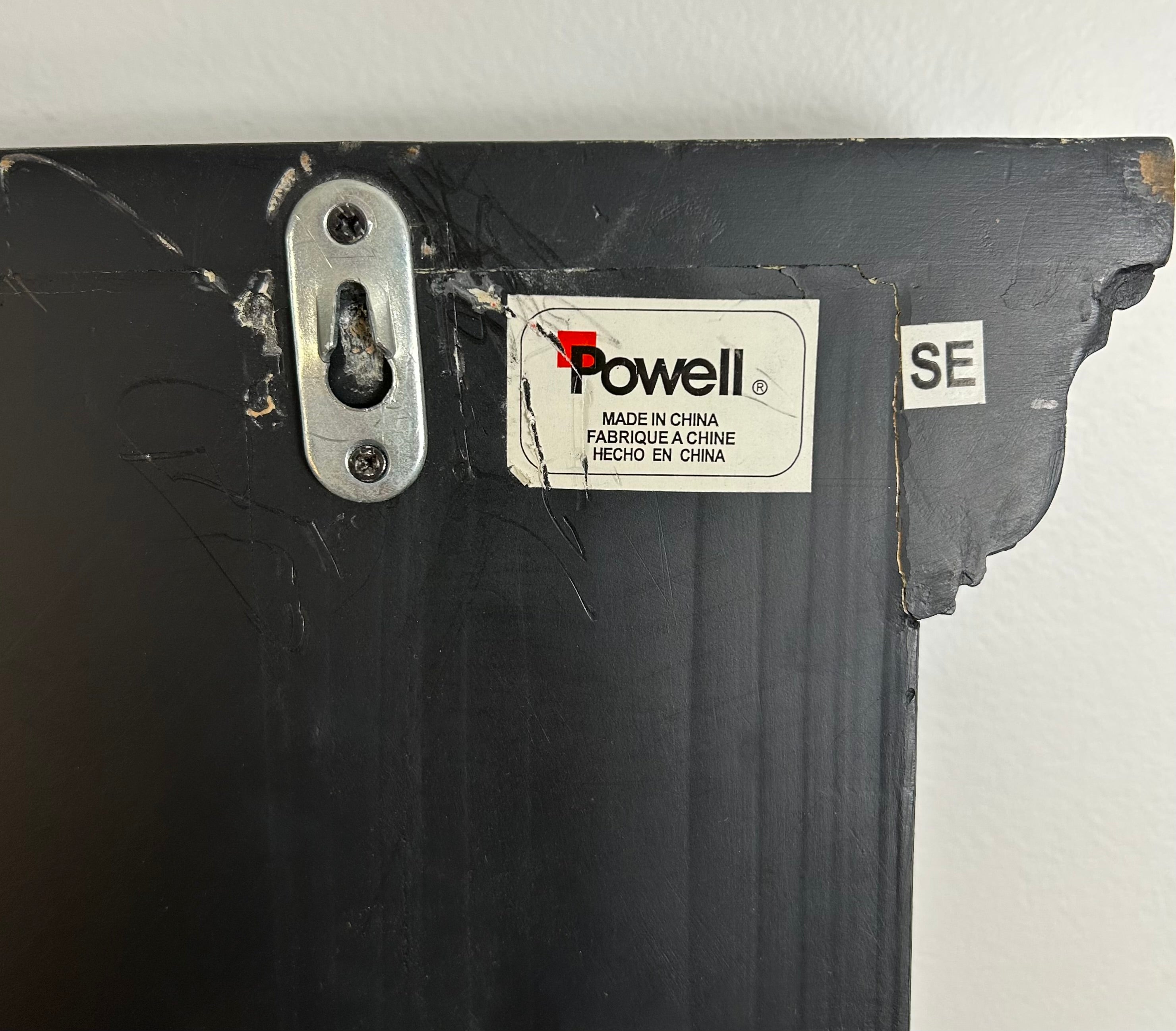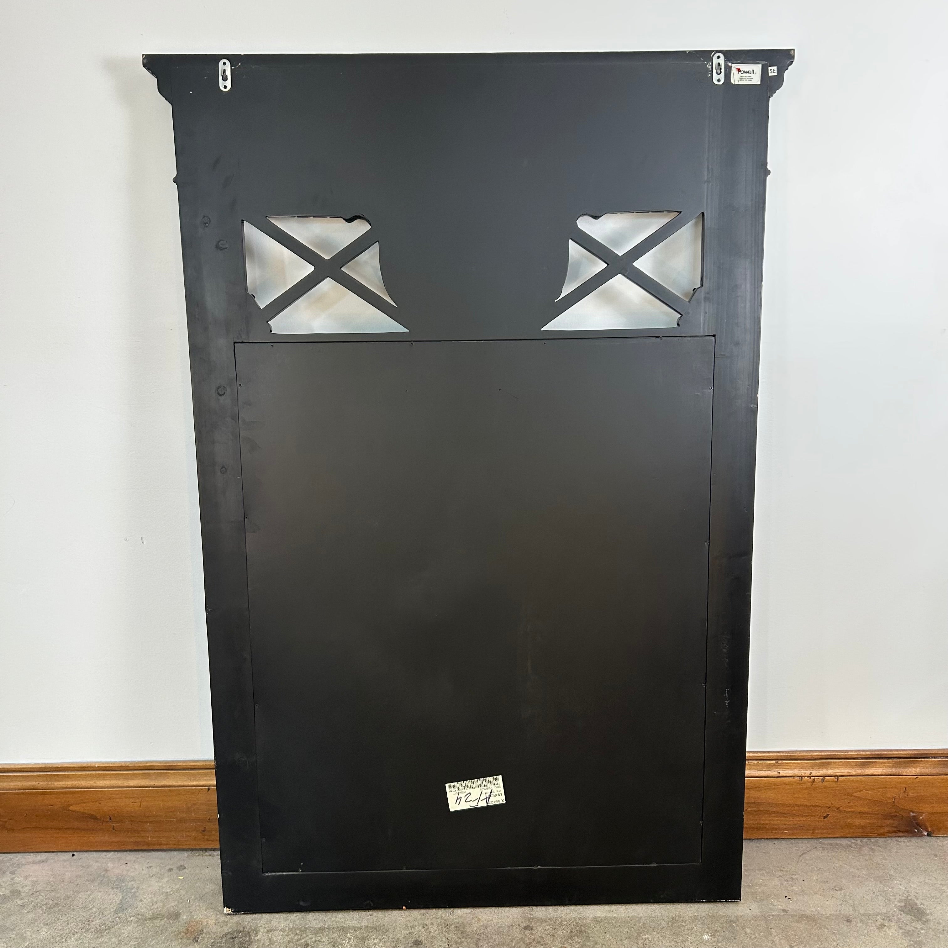 Powell black mirror with intricate design. There are metal hook holders on the back for hanging.
