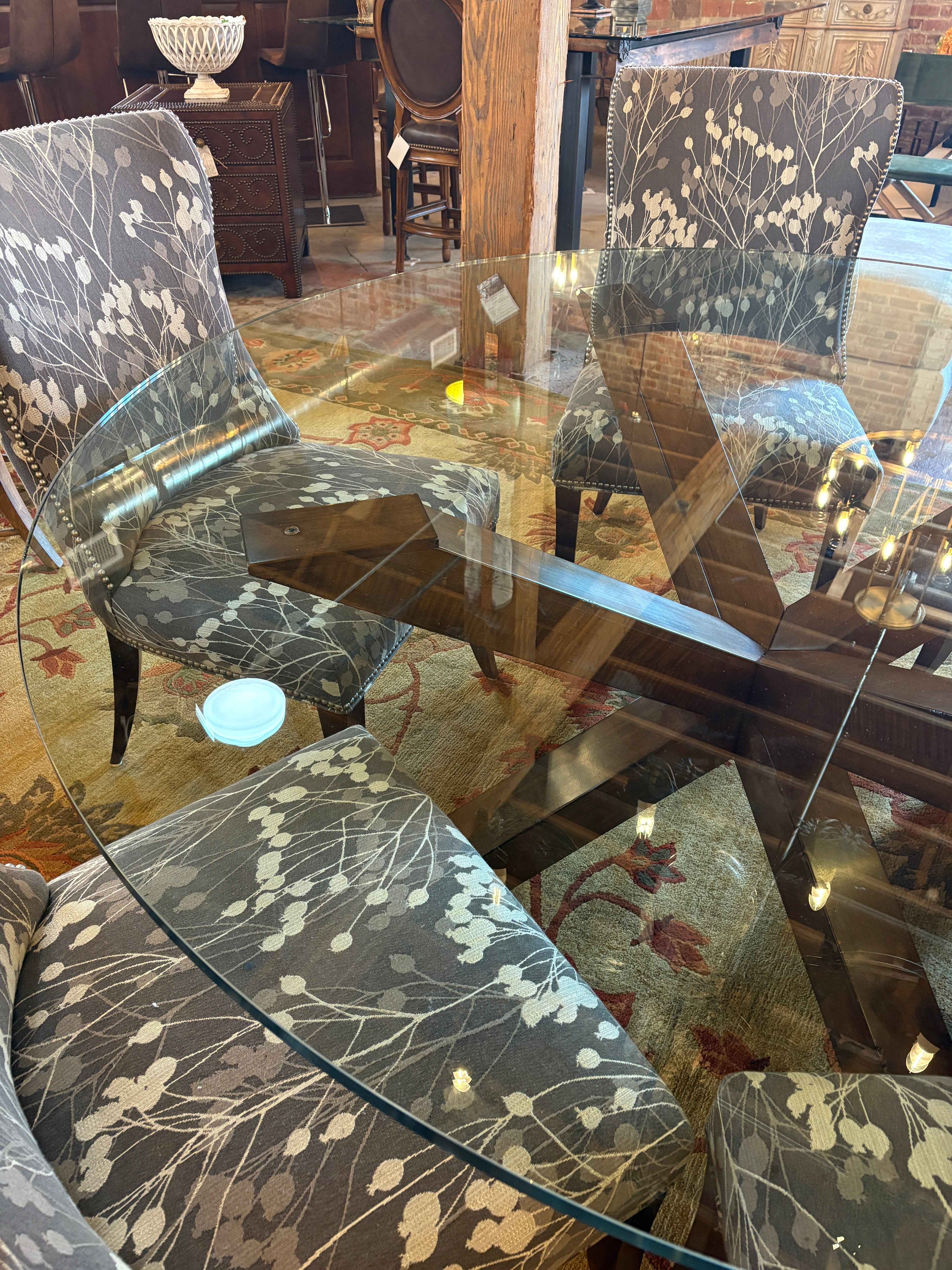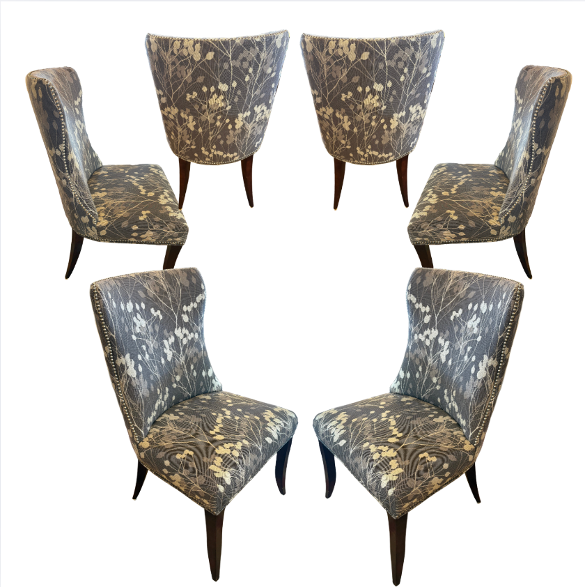 Set of 6 Precedent Dining Chairs with nail head detail and gray flower pod upholstery.
