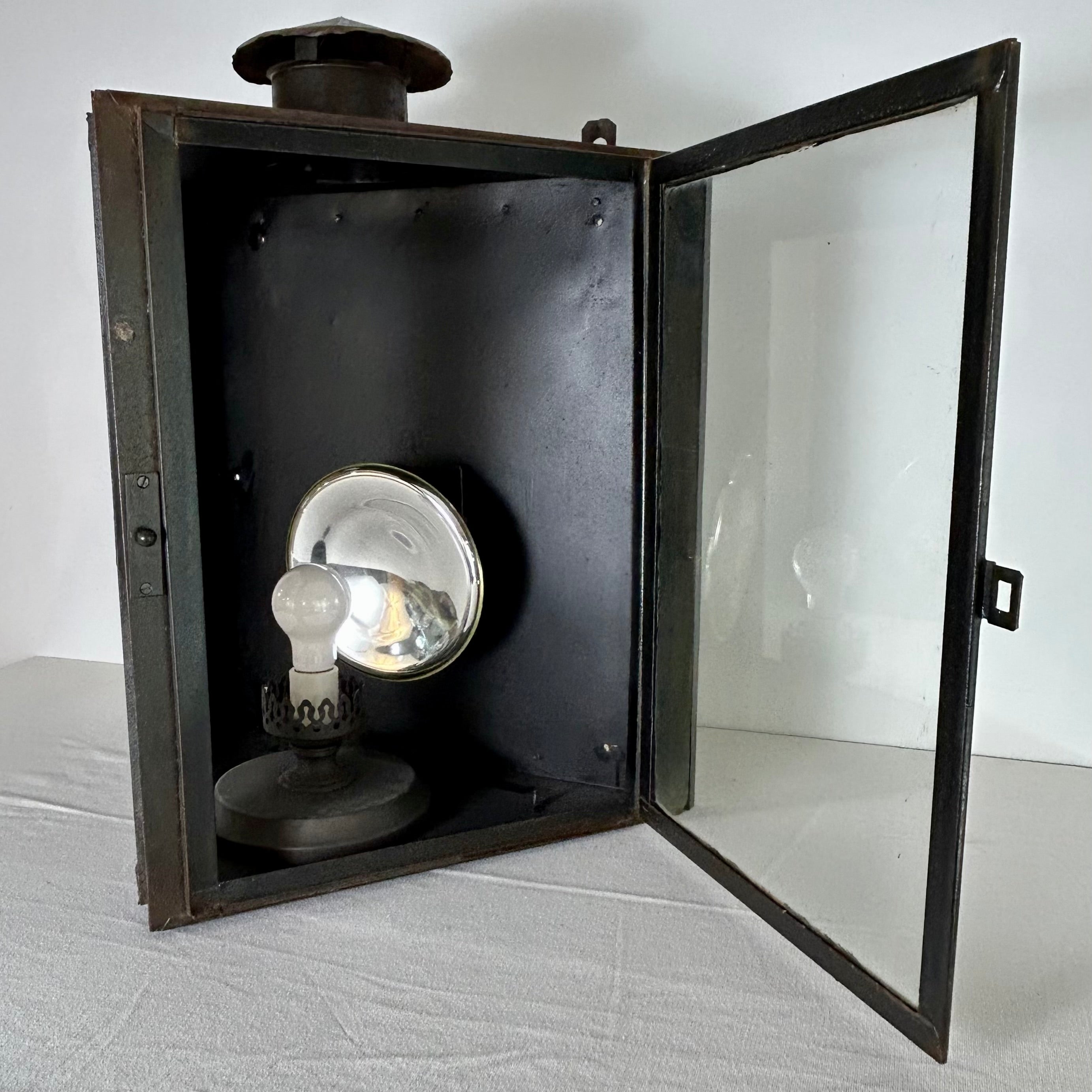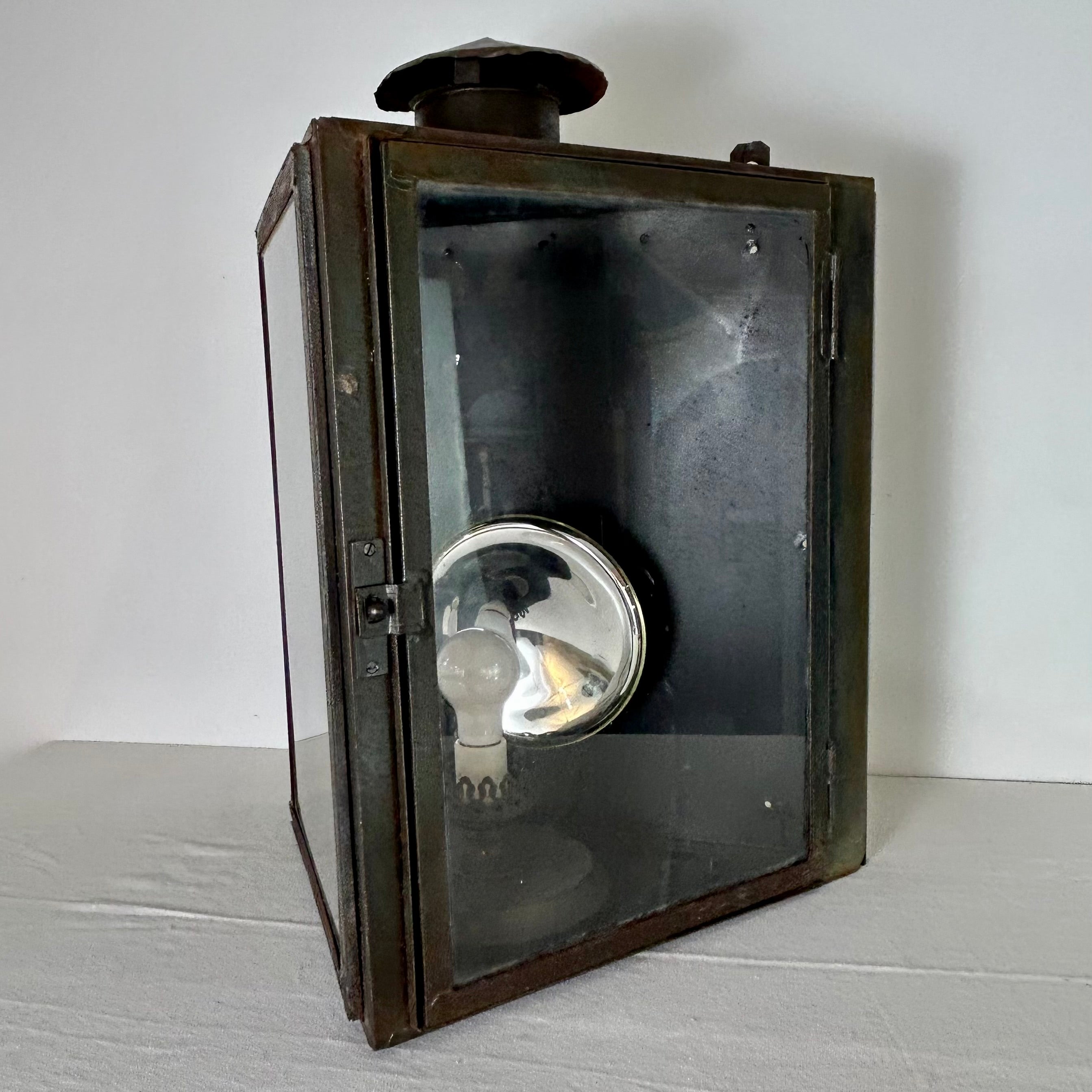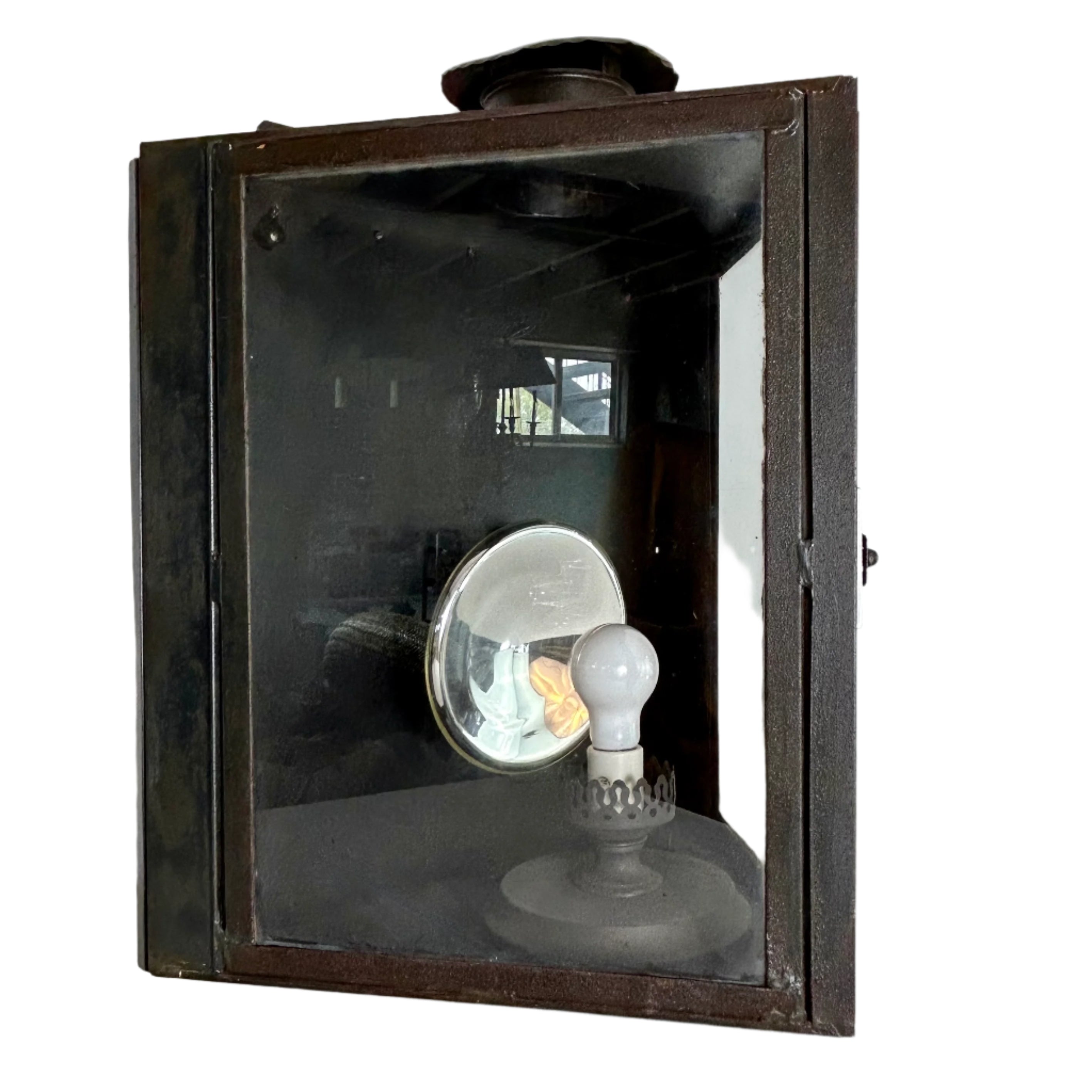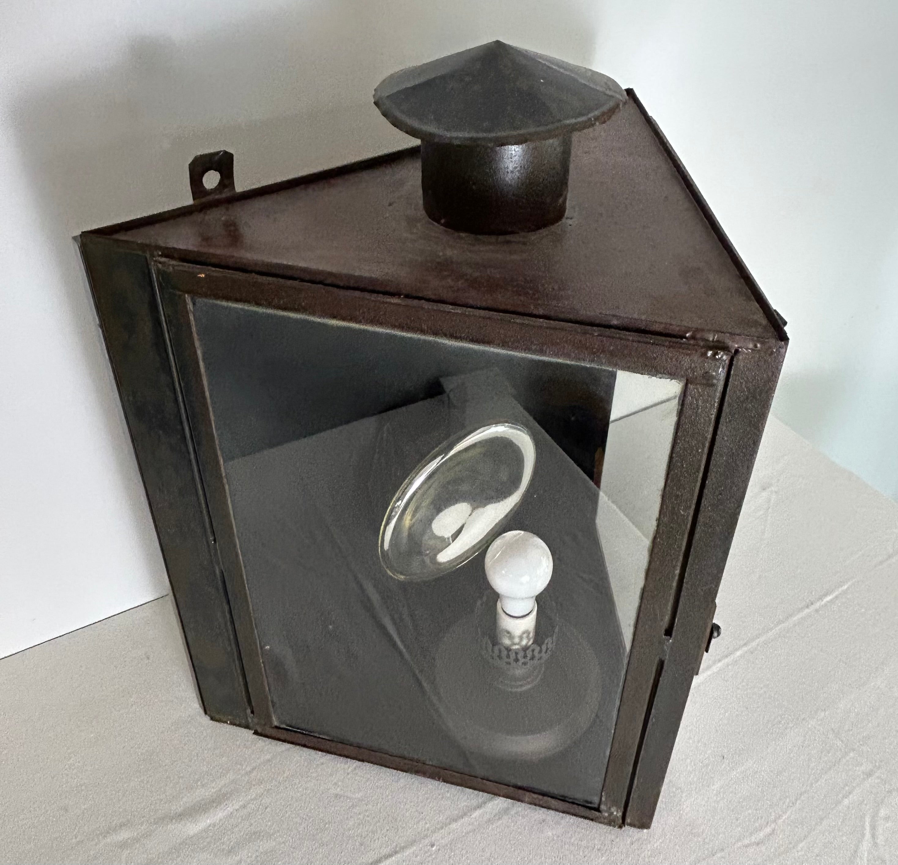 Railway lantern wall sconce, replica in metal with bronze/brown color. Single standard light socket with reflector behind along with ornamental chimney on top. Wall mounts included.