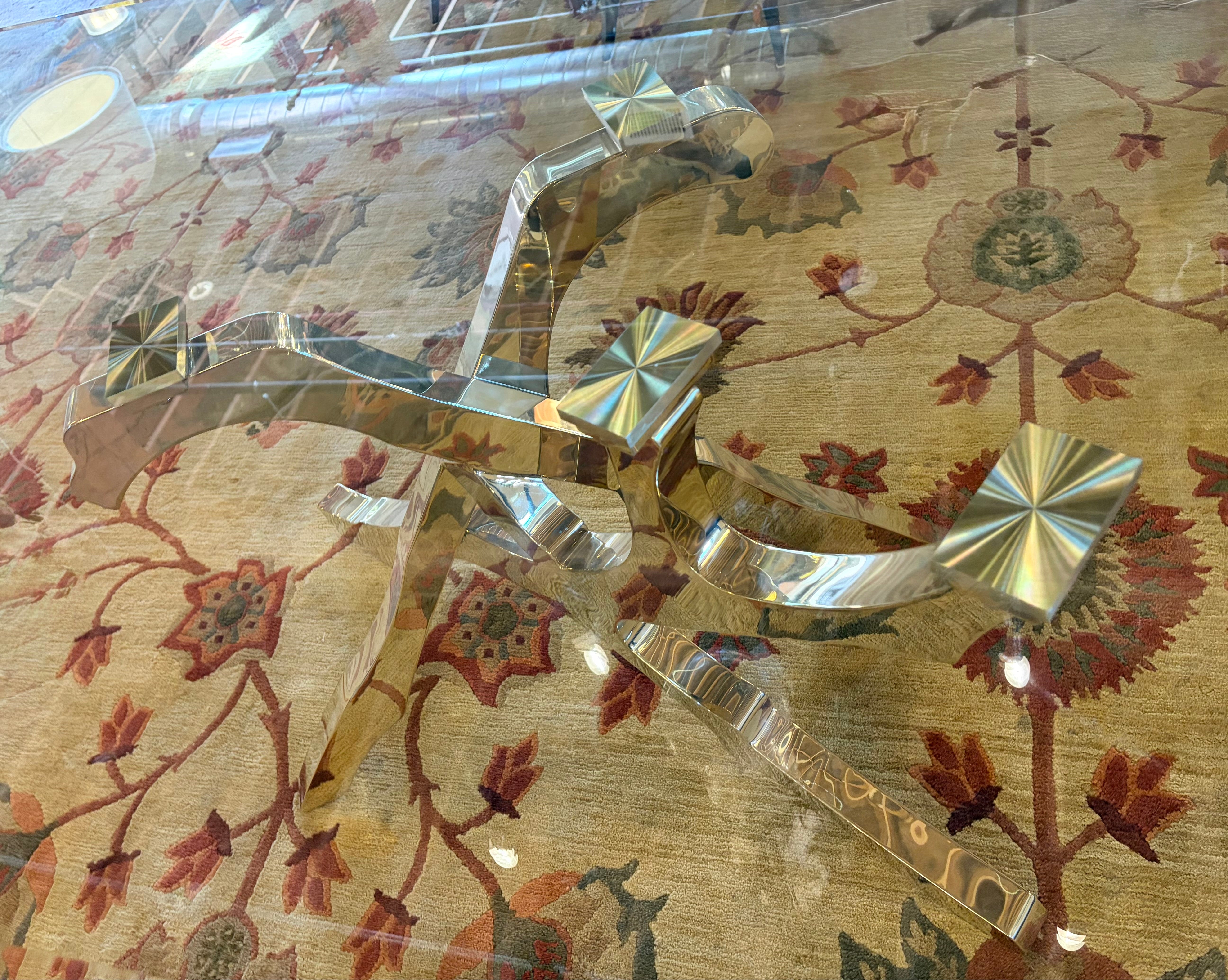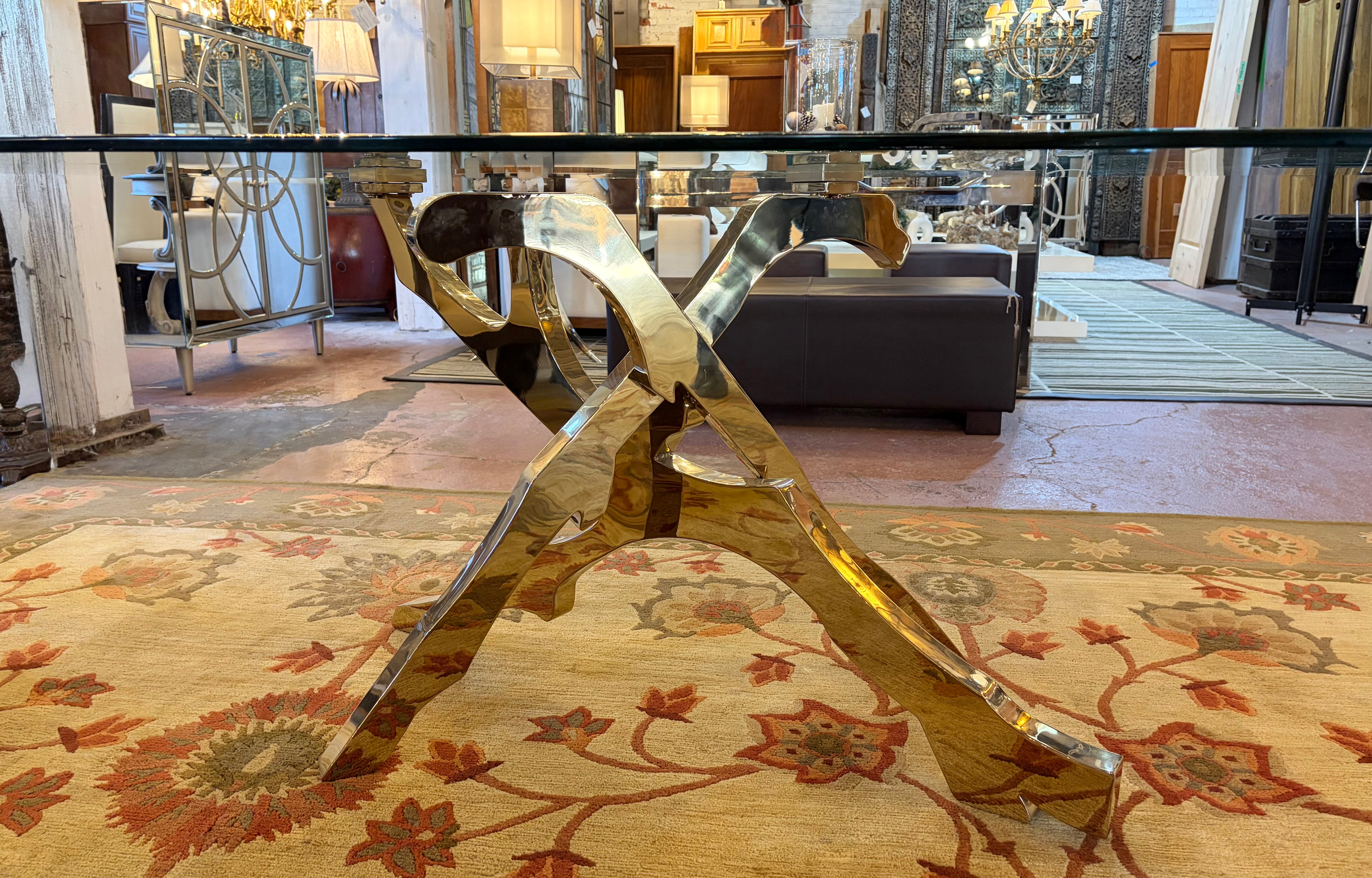Lybo Rectangular Glass Top Table with Abstract Quad Gold Tone Base. Note: main image is from manufacturer.