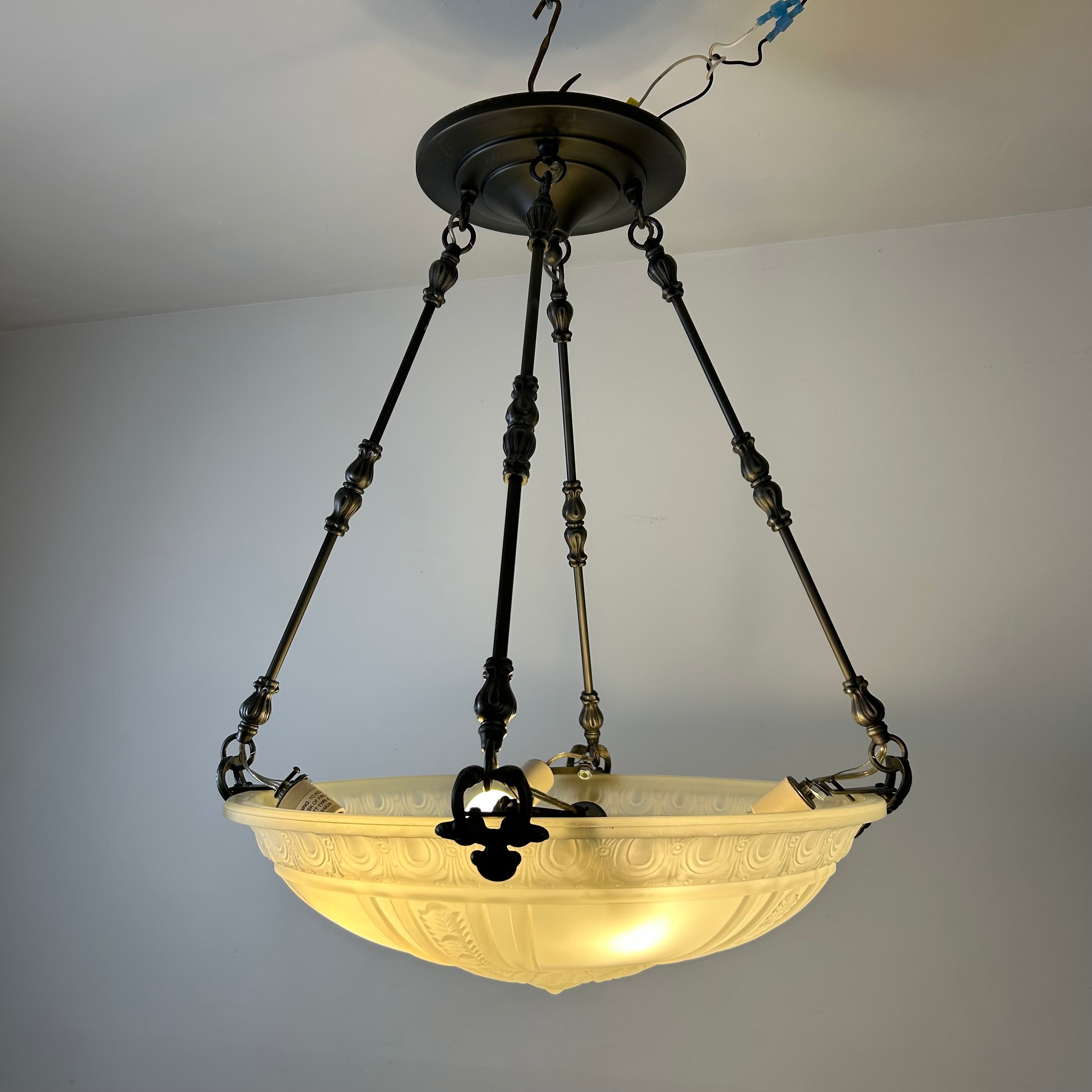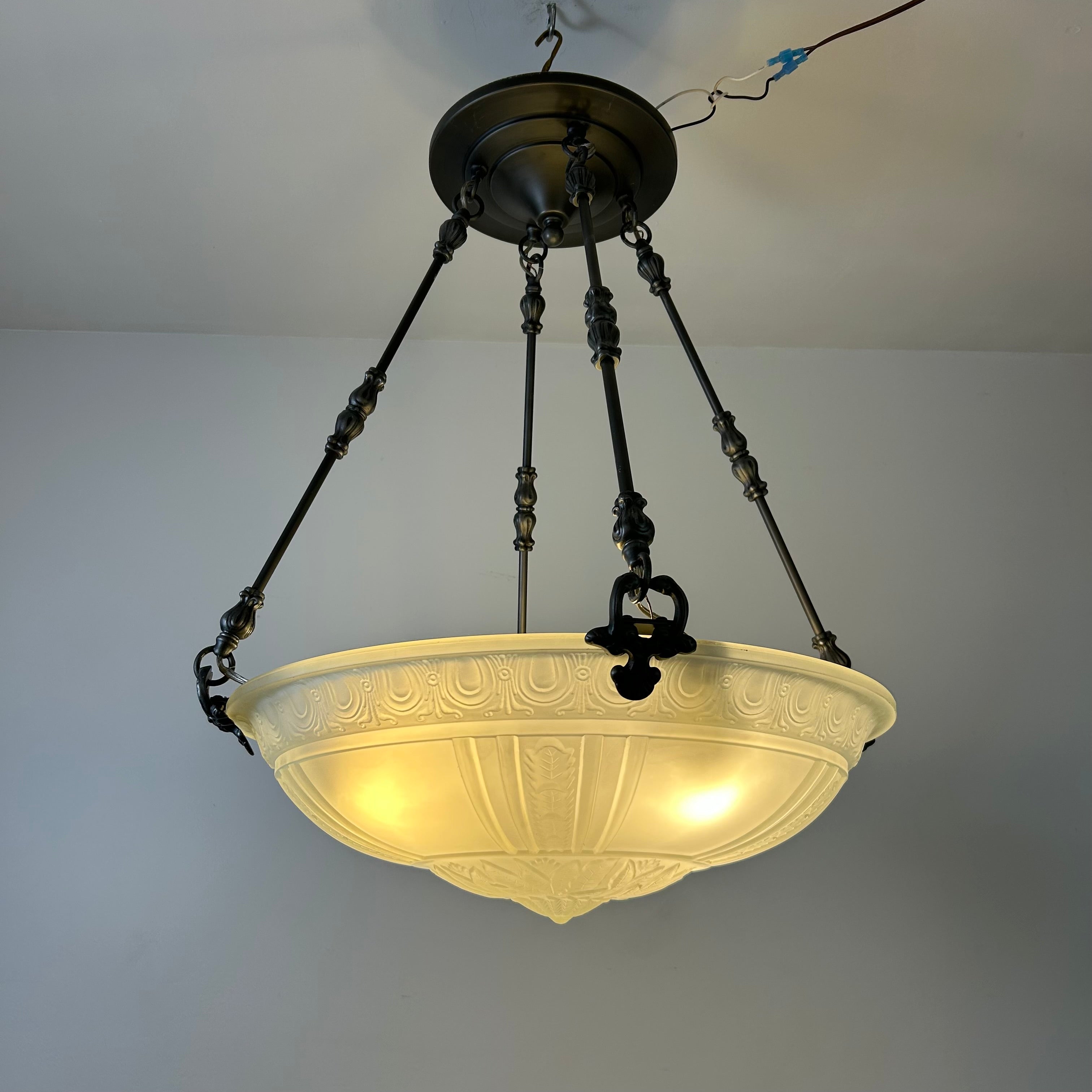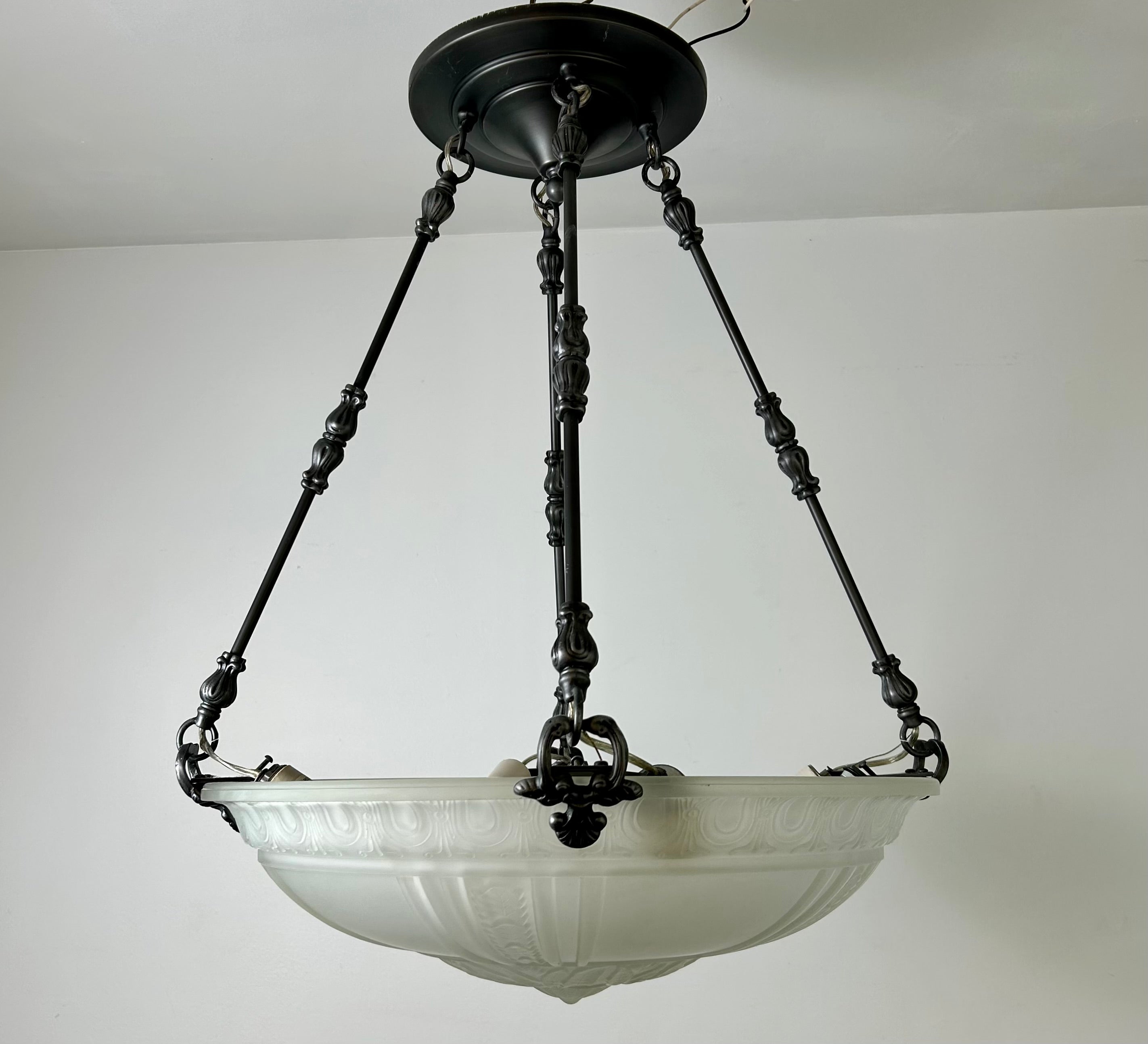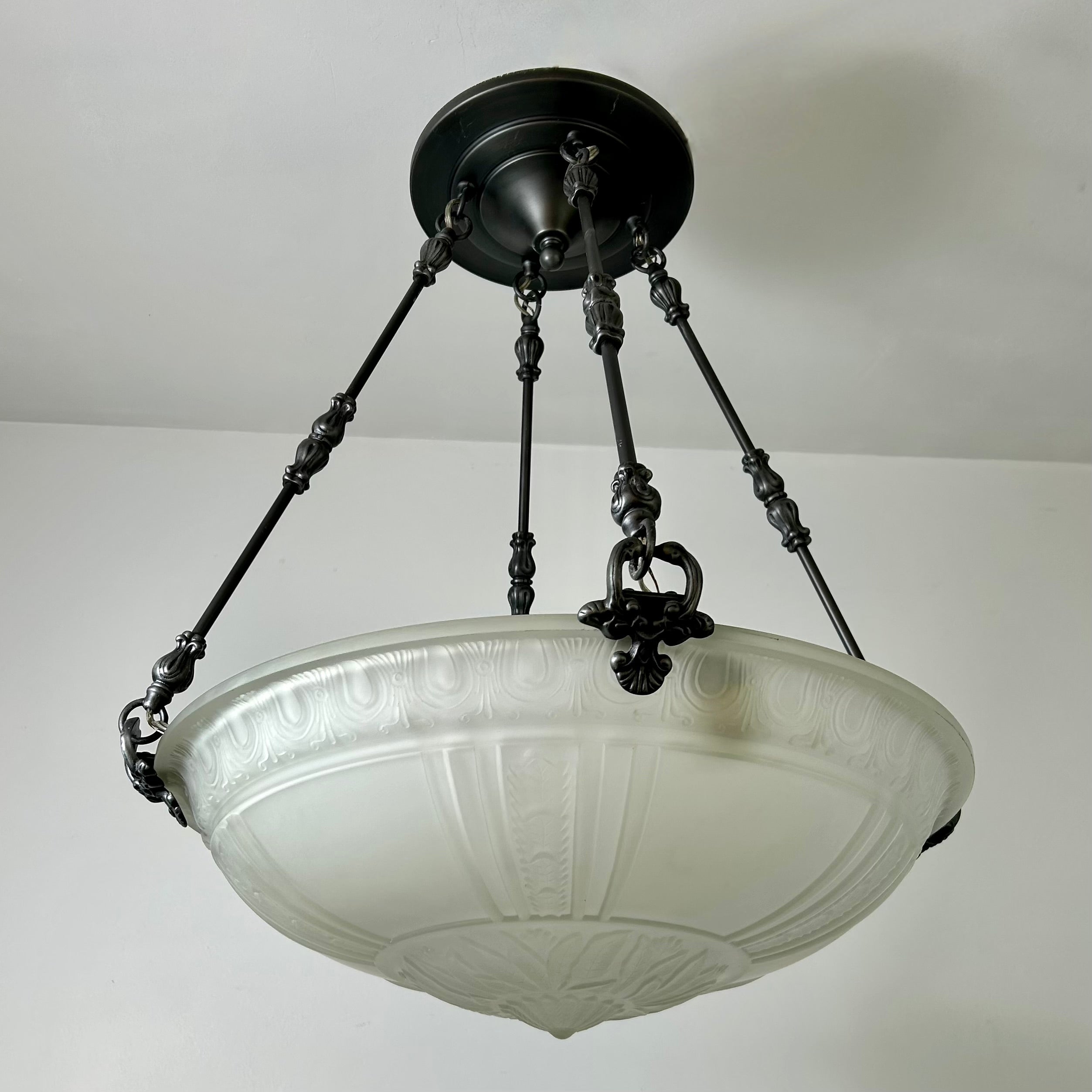 Rejuvenation frosted glass bowl chandelier light fixture, four down-rods. Has four standard size light sockets. A wonderful vintage look!