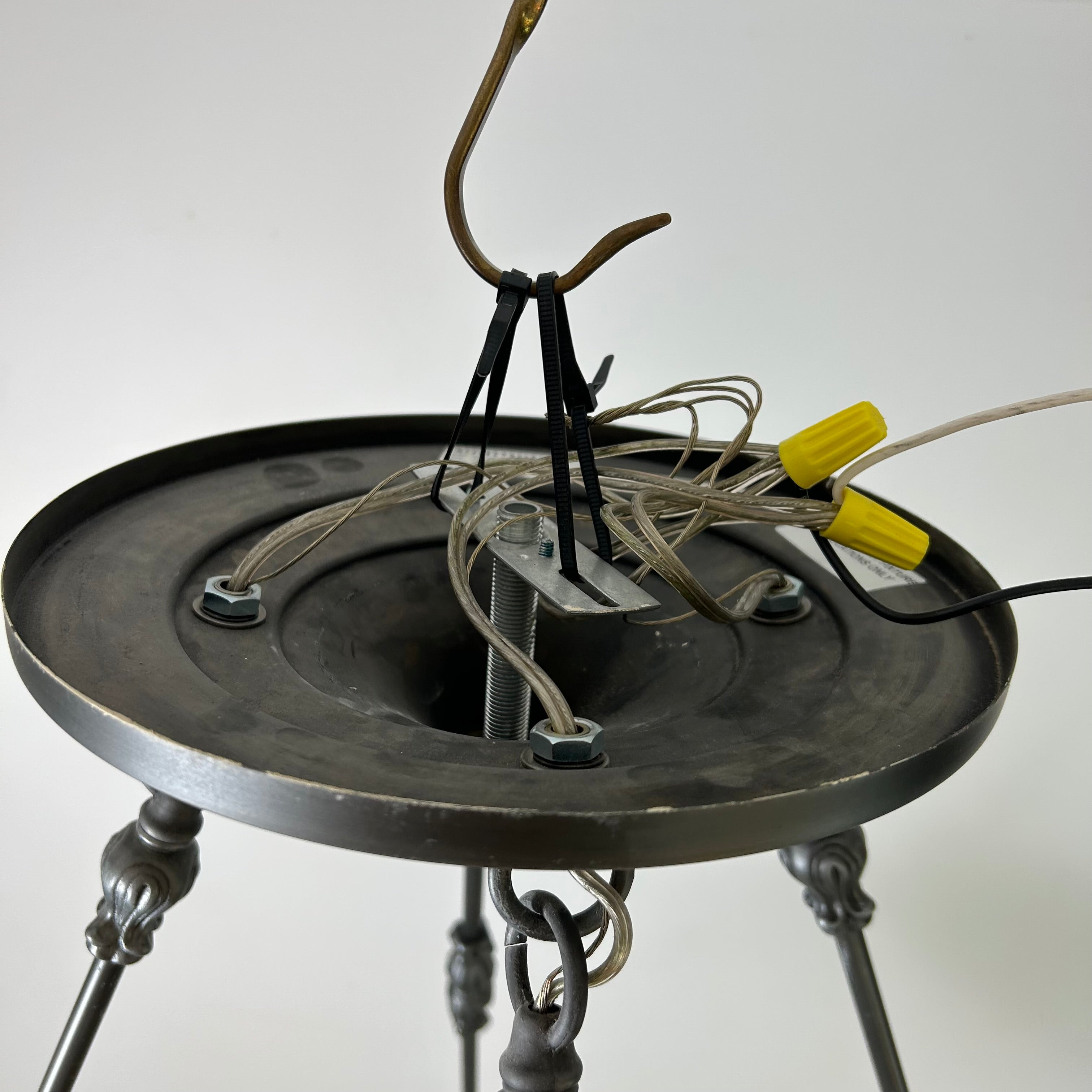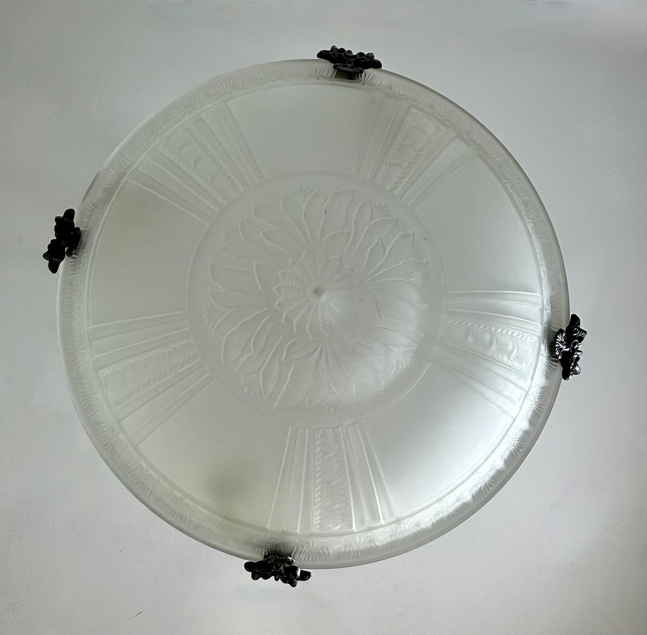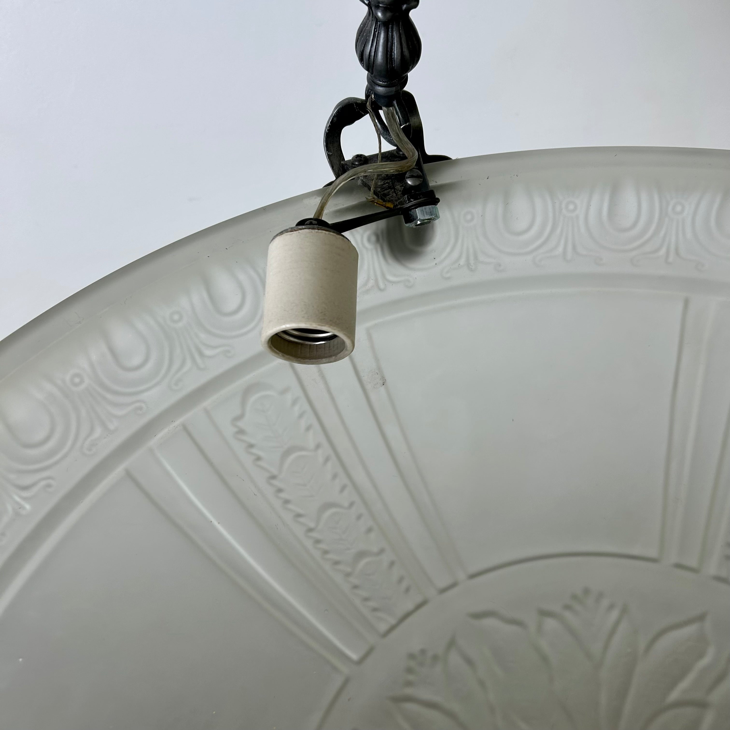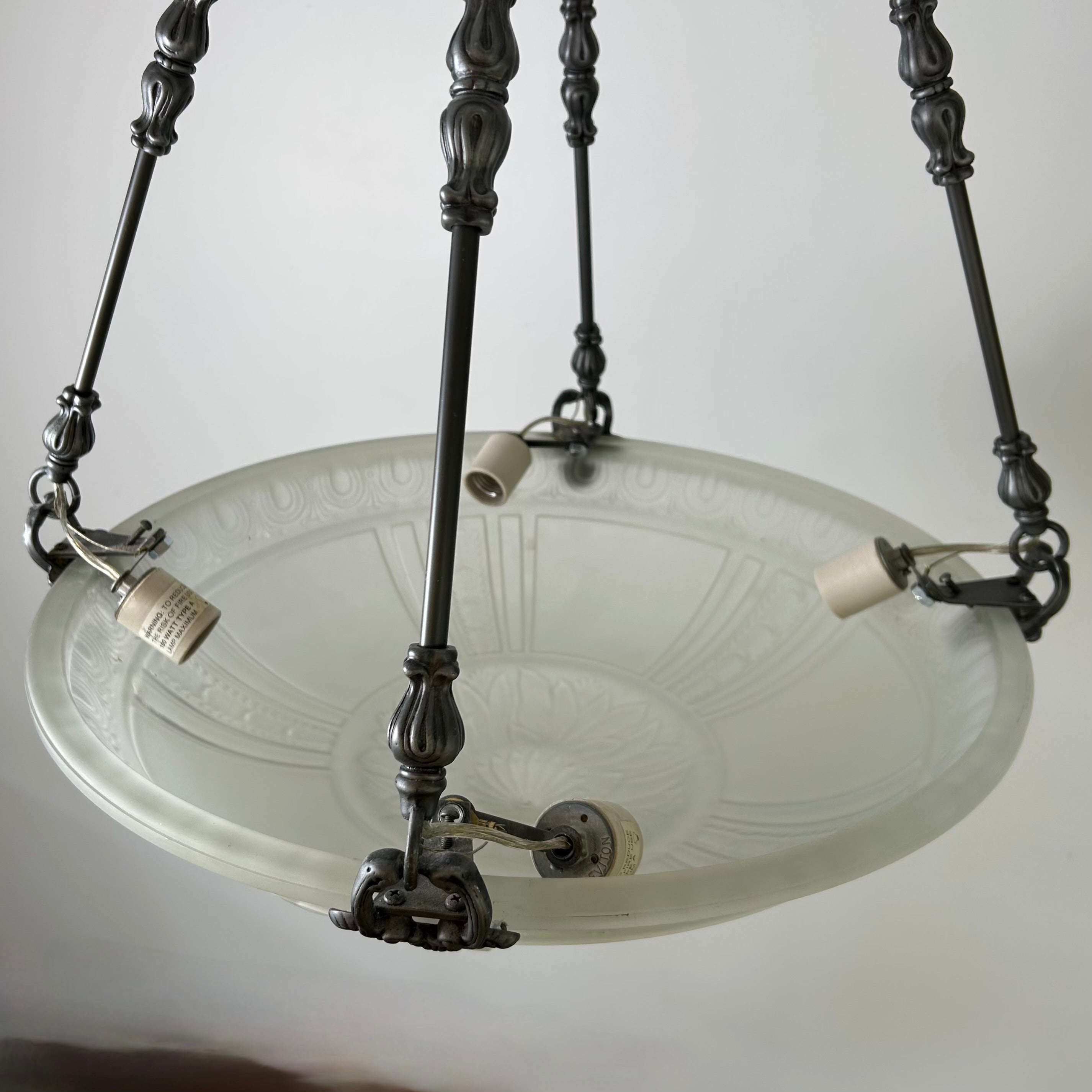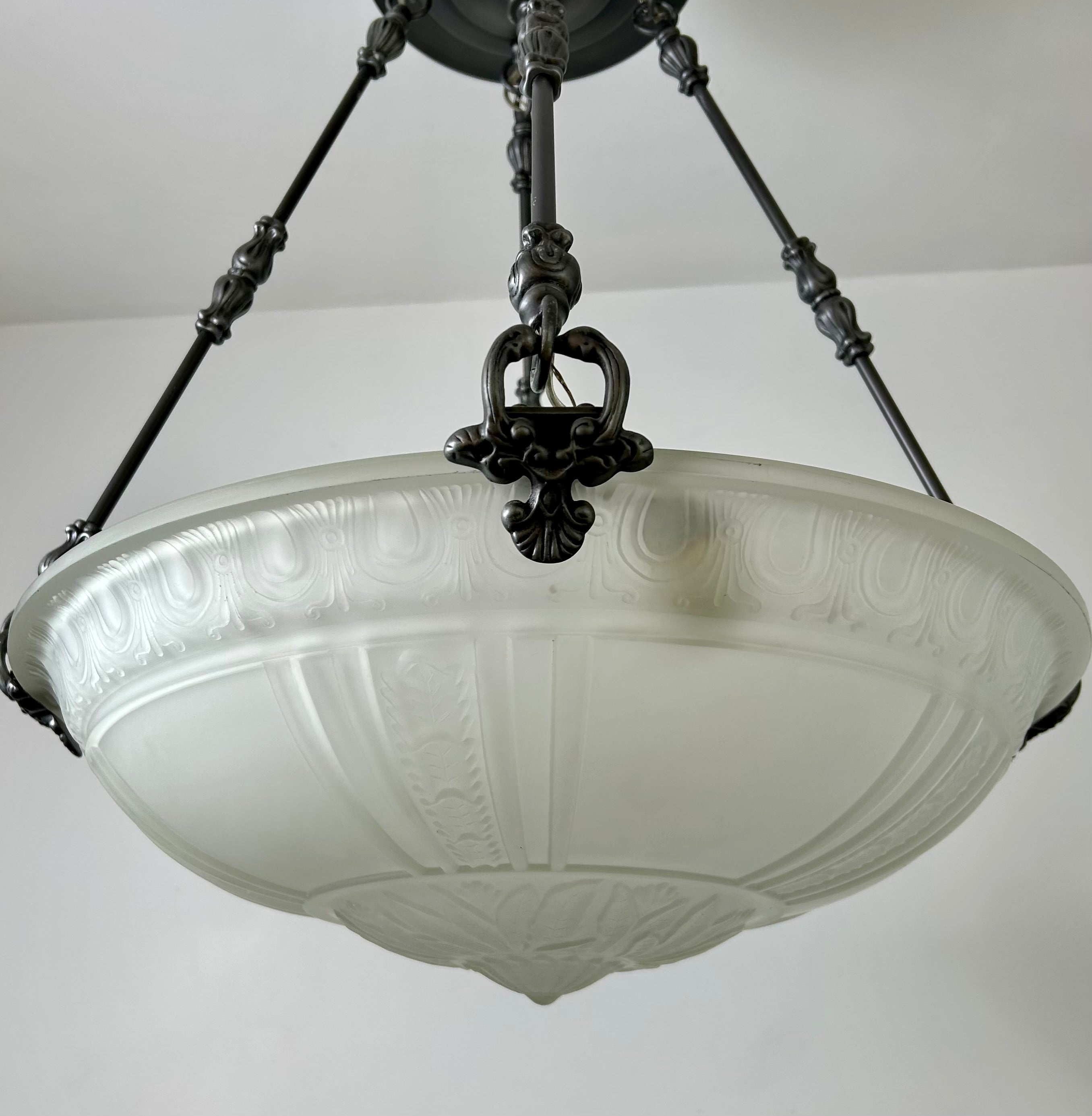 Rejuvenation frosted glass bowl chandelier light fixture, four down-rods. Has four standard size light sockets. A wonderful vintage look!