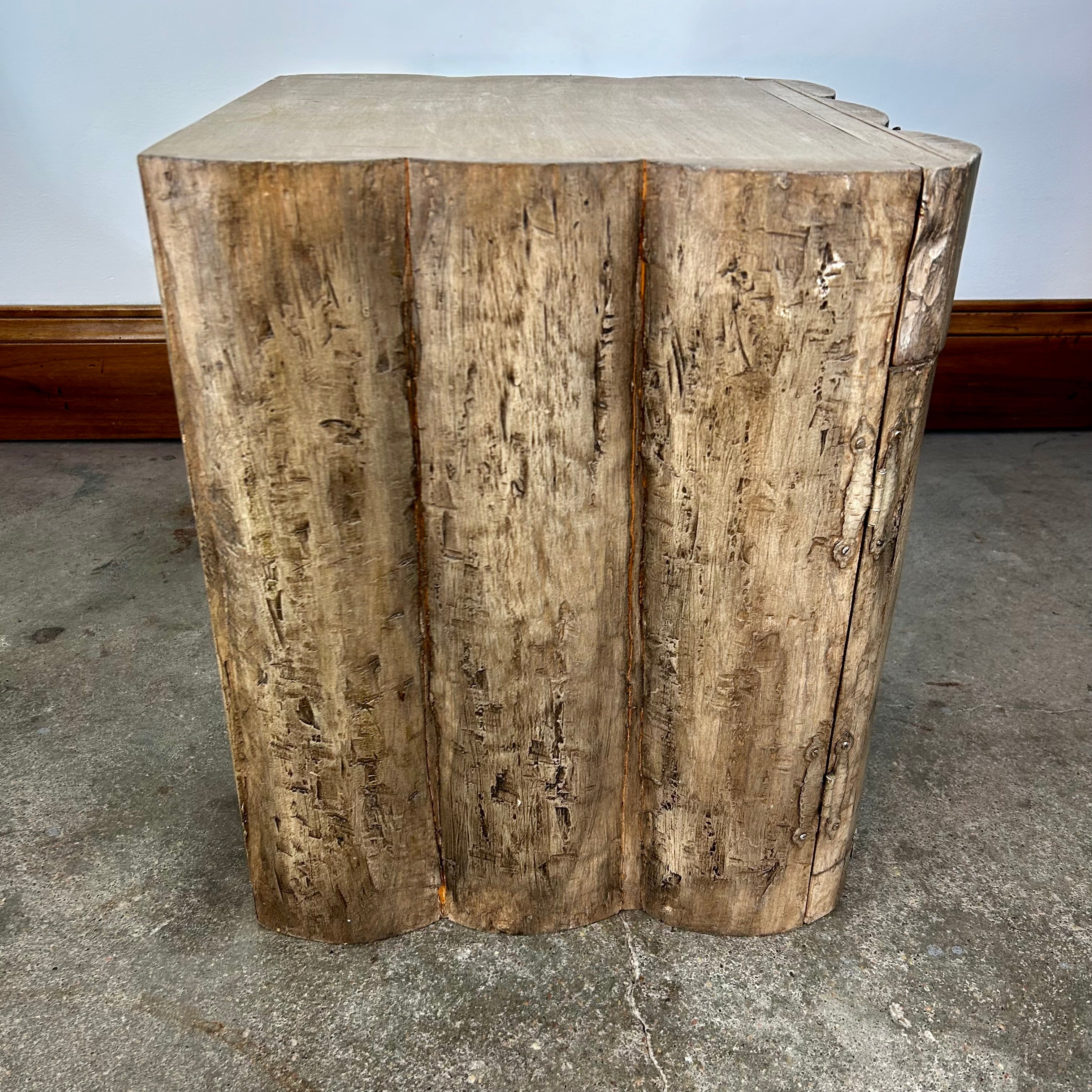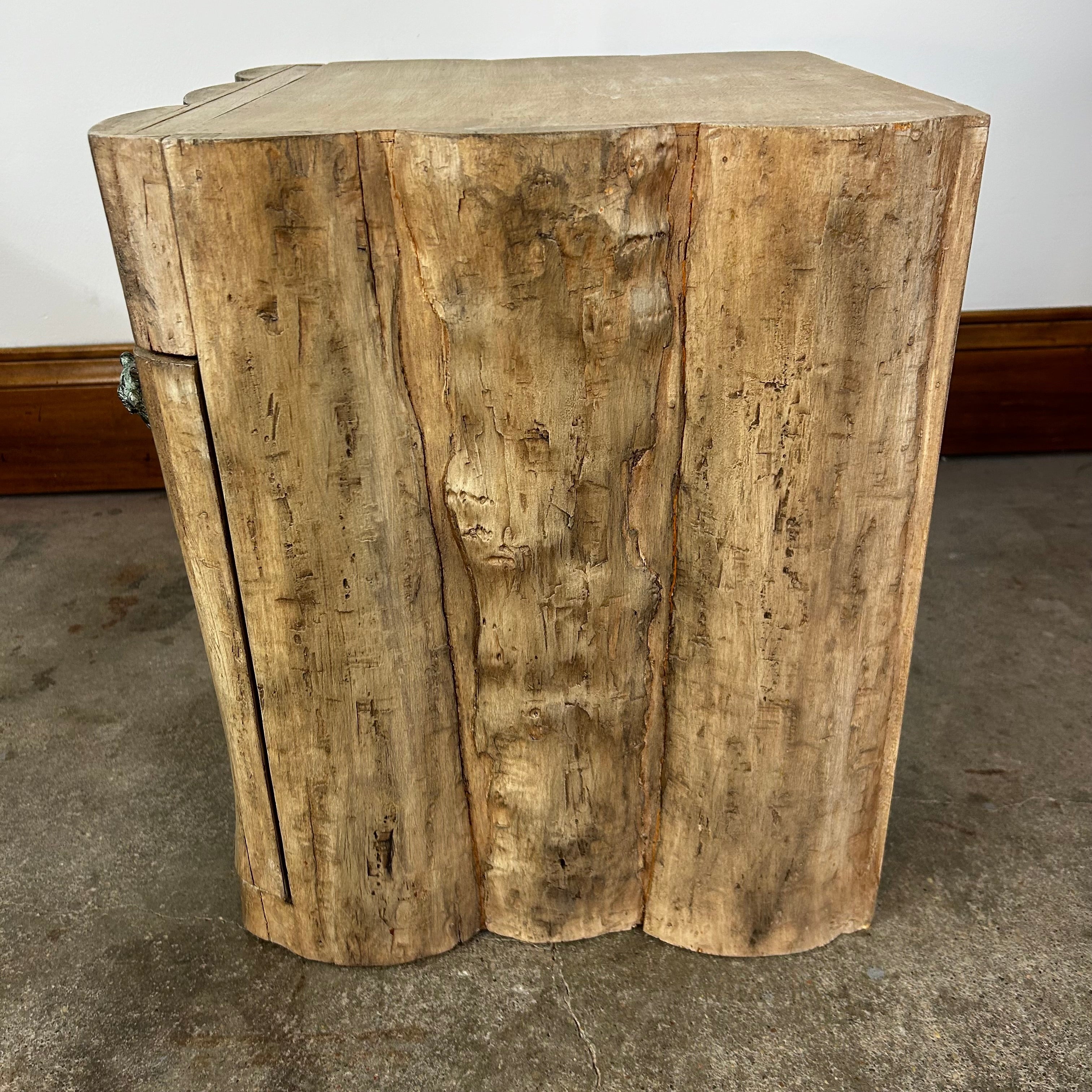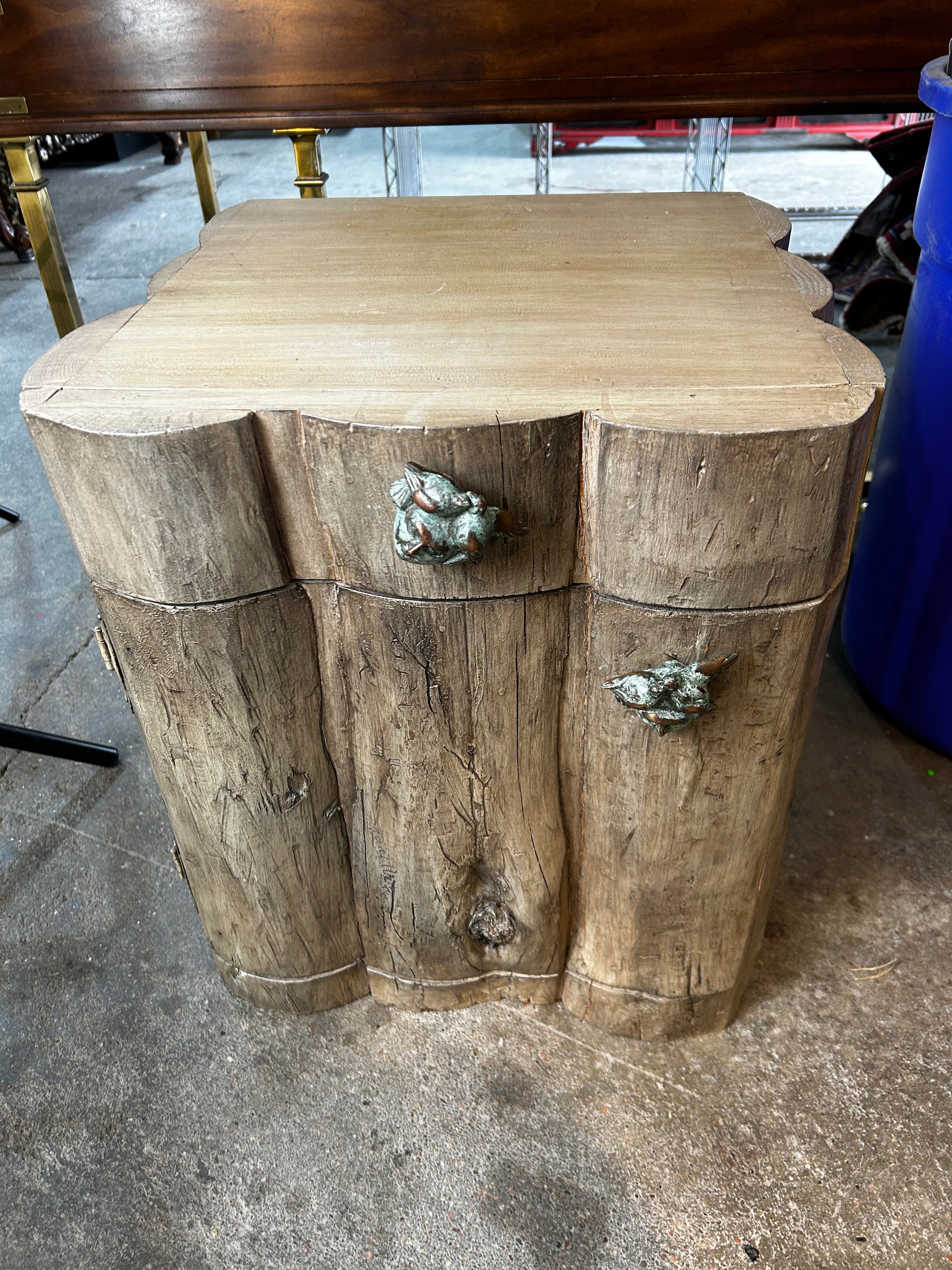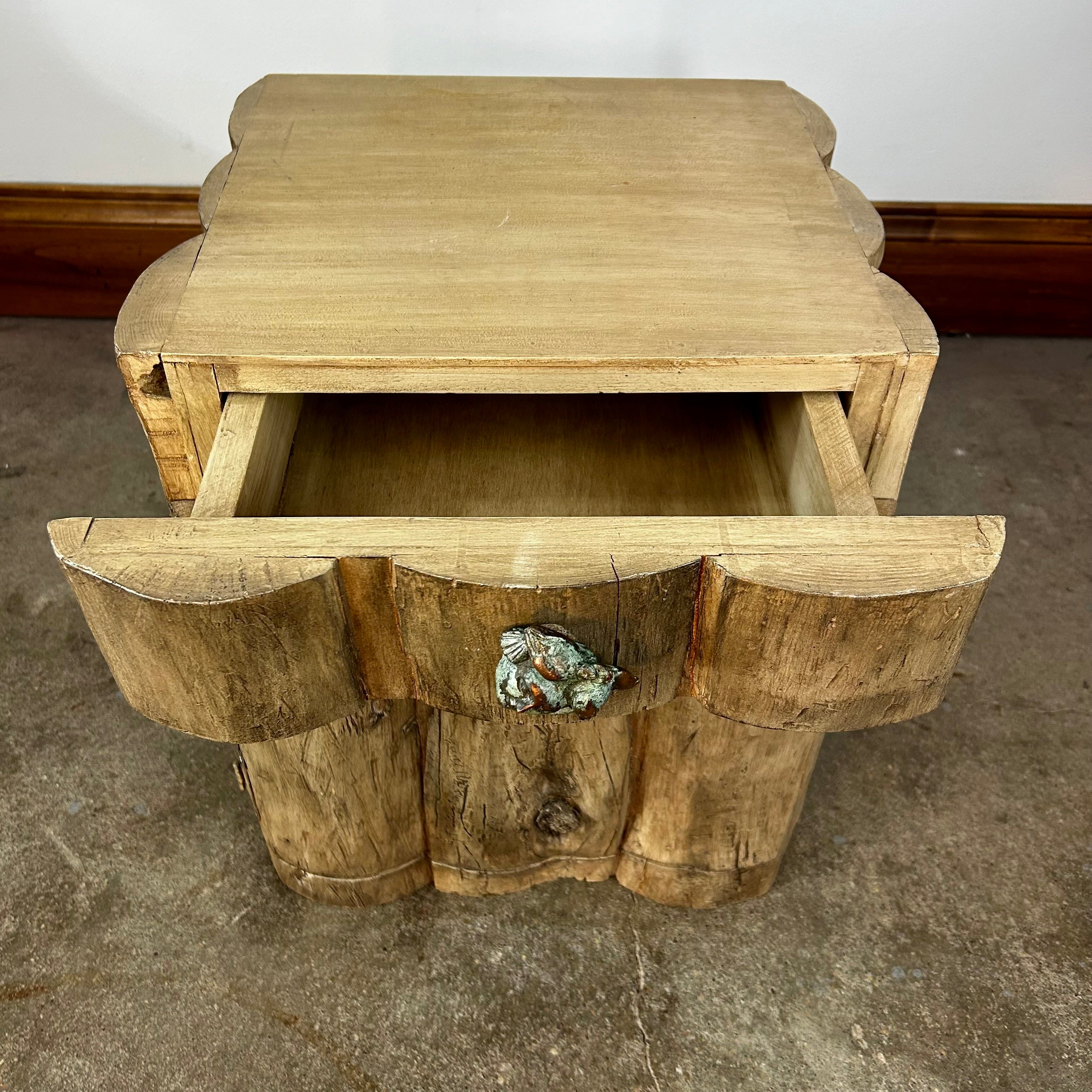 Crafted from solid, natural wood with a natural stain finish, this rustic split log night stand boasts a single drawer, lower open cabinet area and unique bronze pulls for a touch of rustic charm.