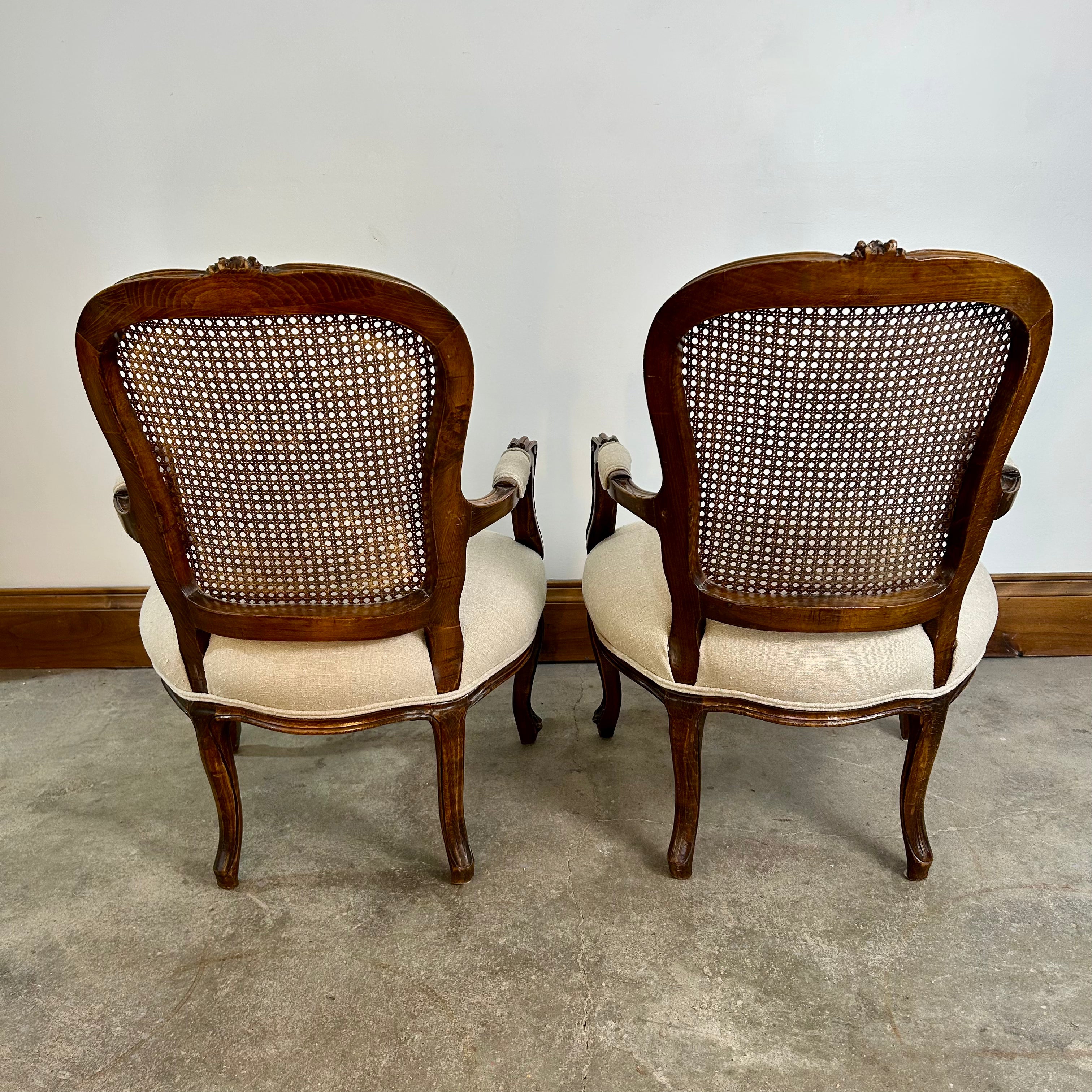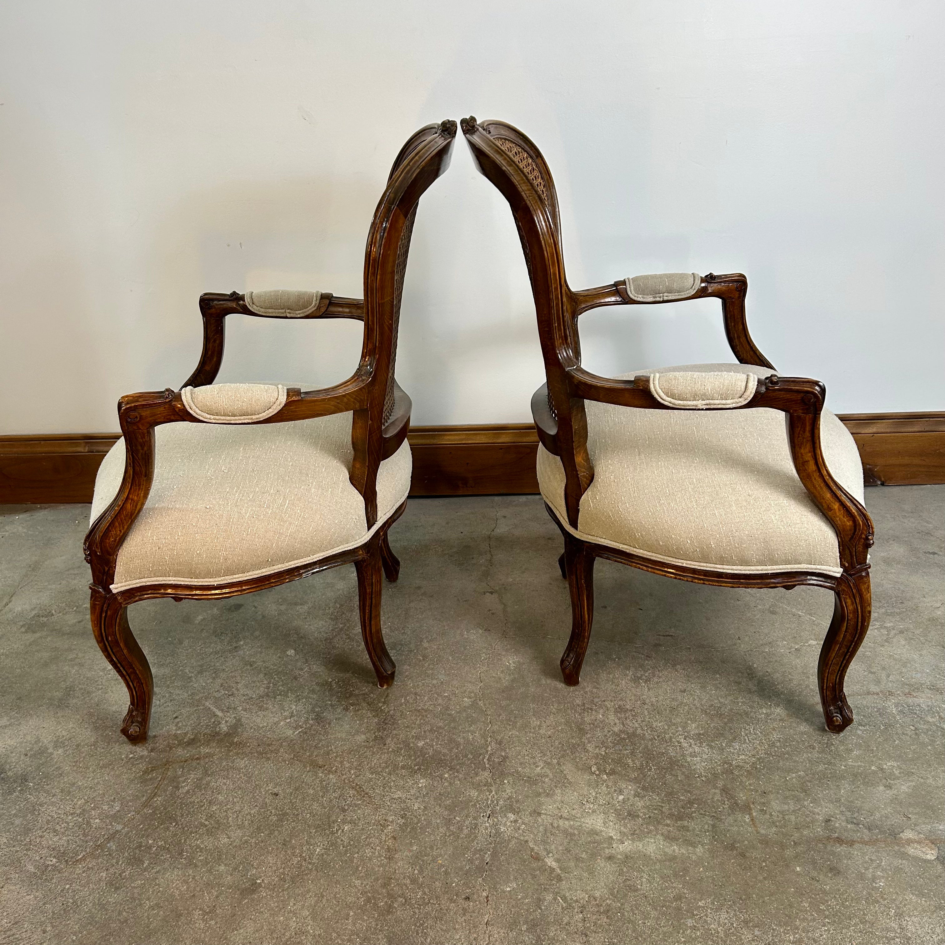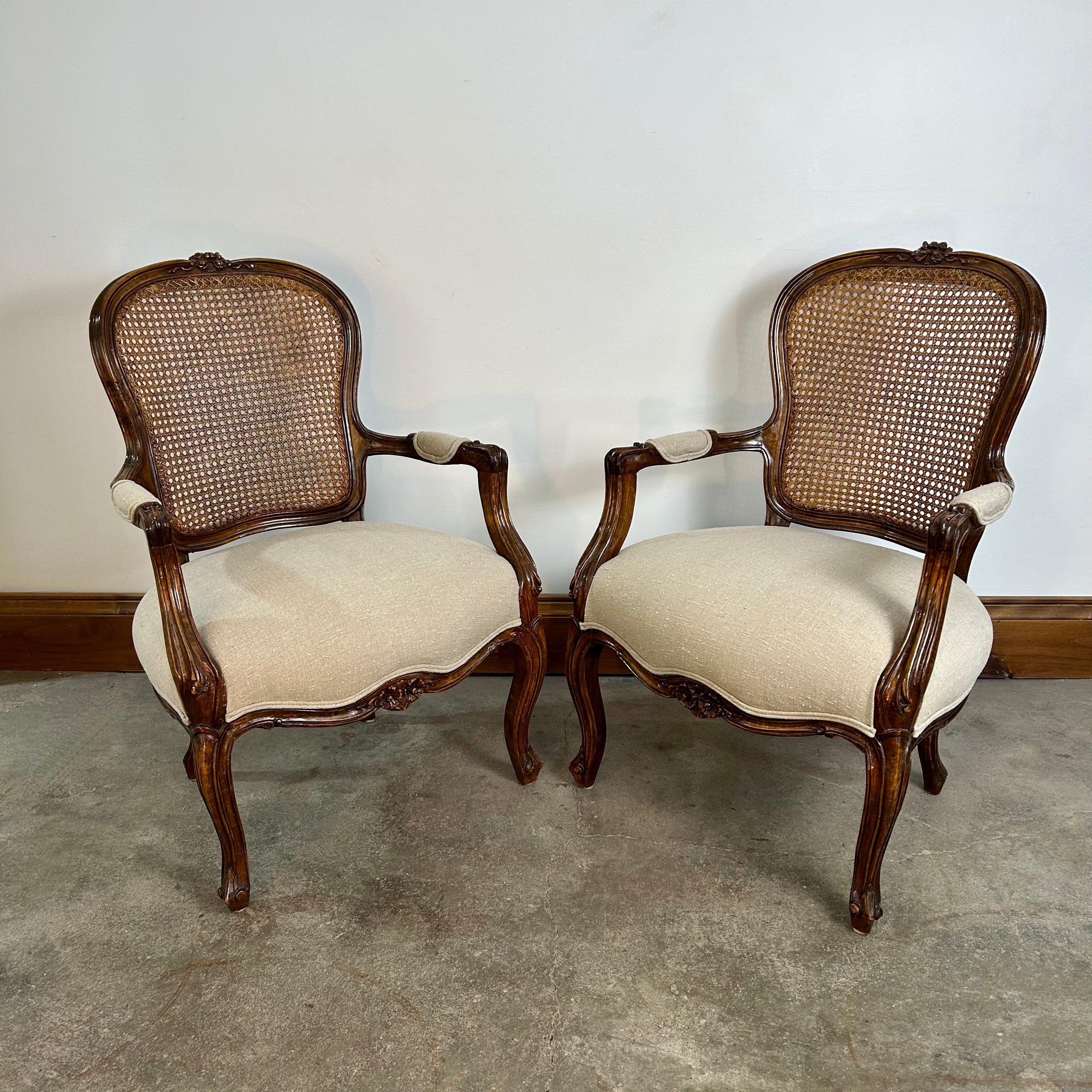 Set of 2 carved oval cane back armchairs, pair. These appear to be newly re-upholstered.
