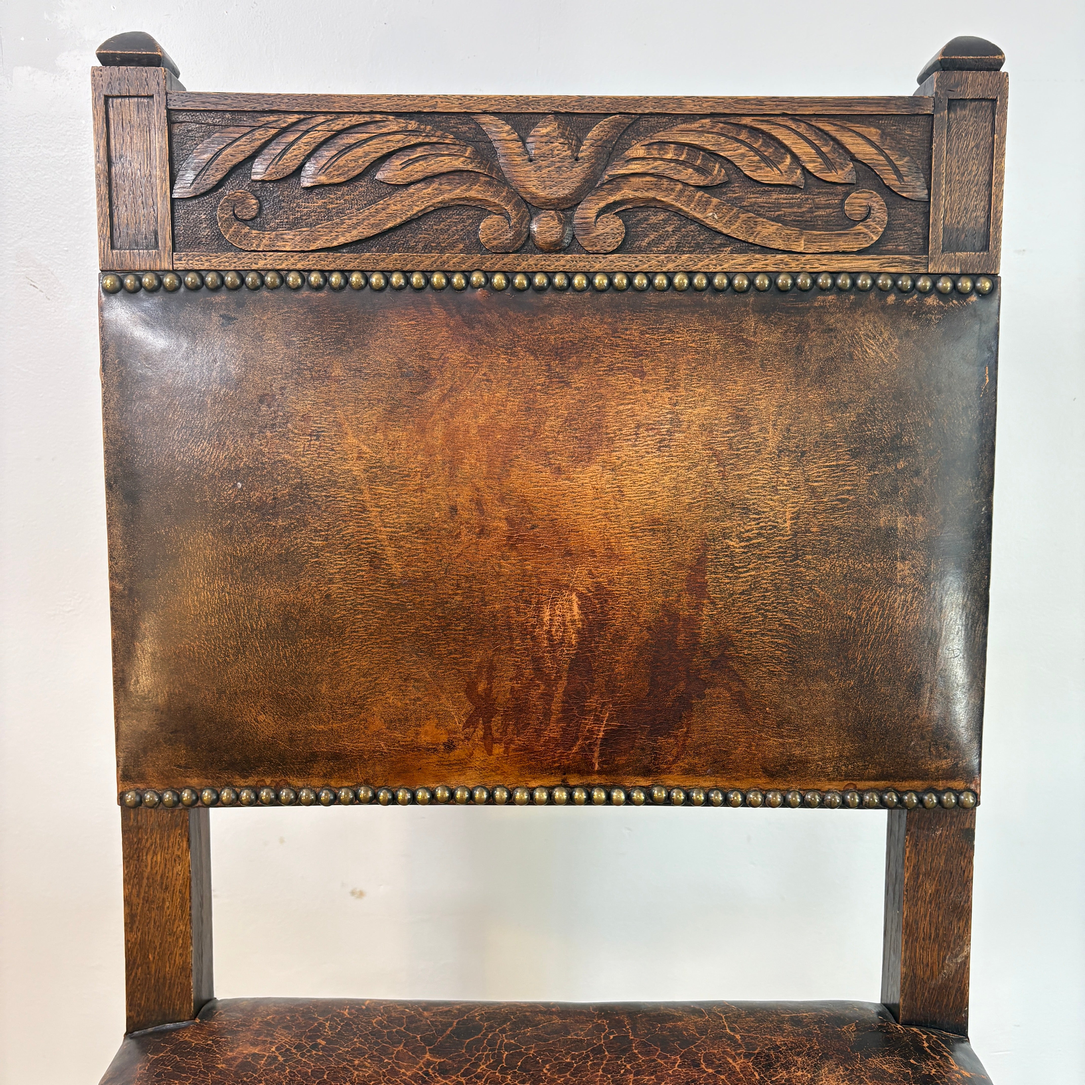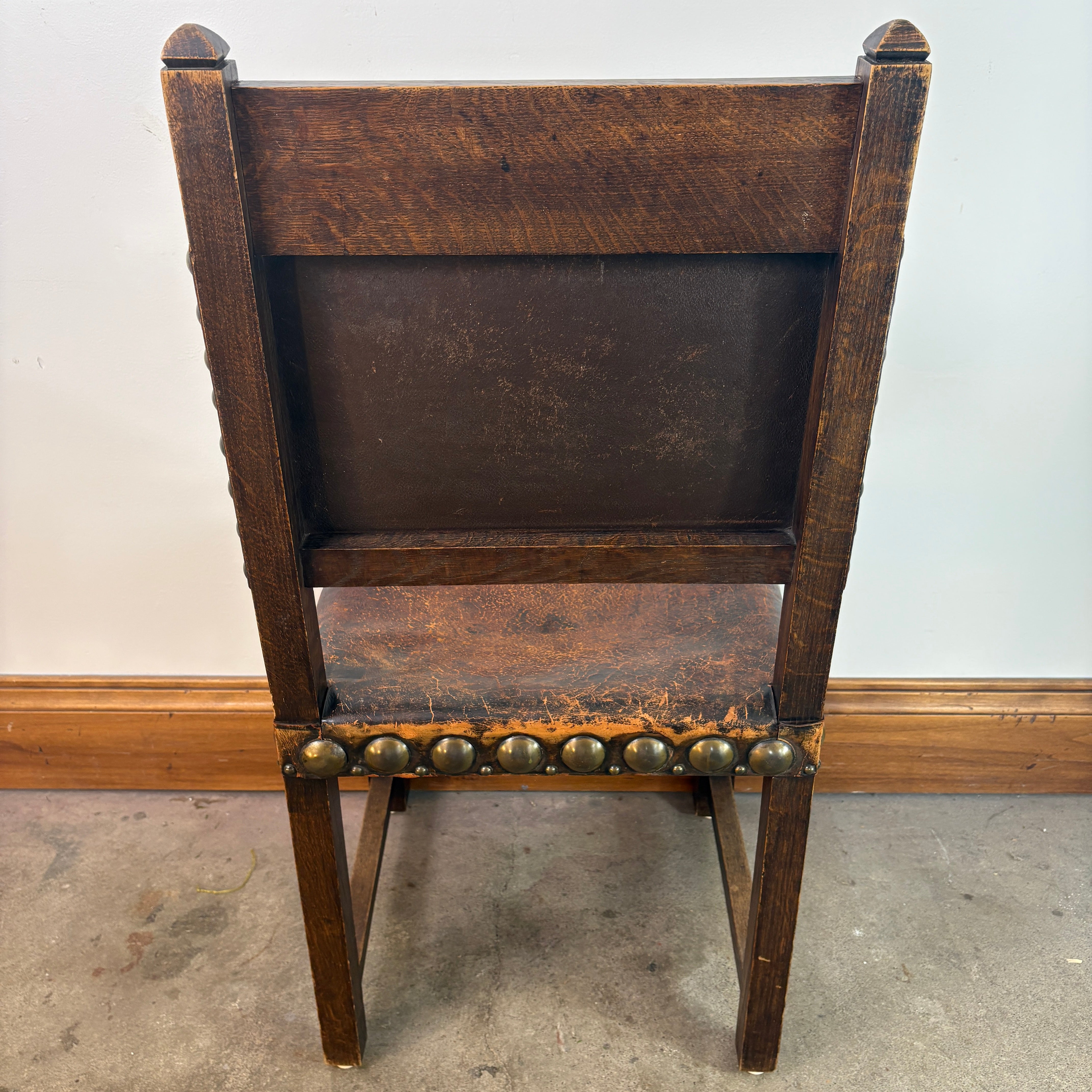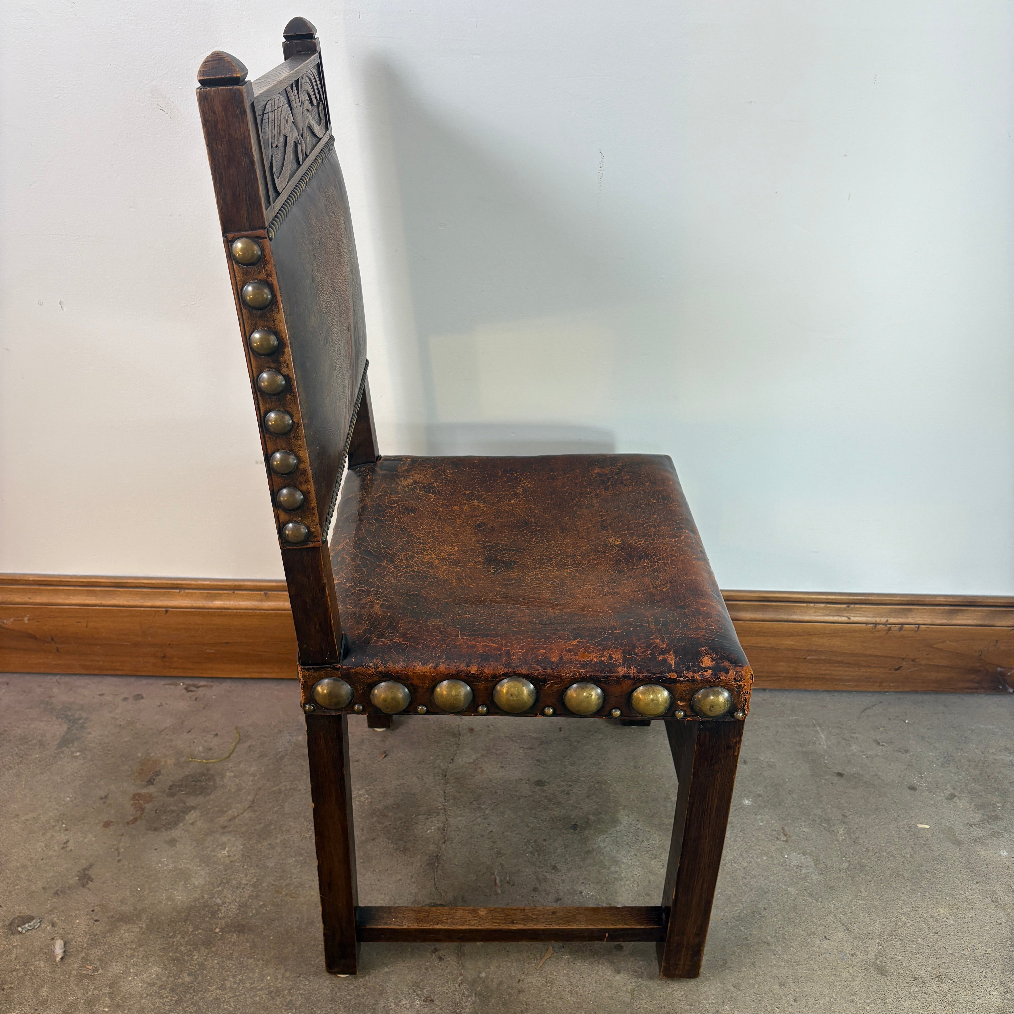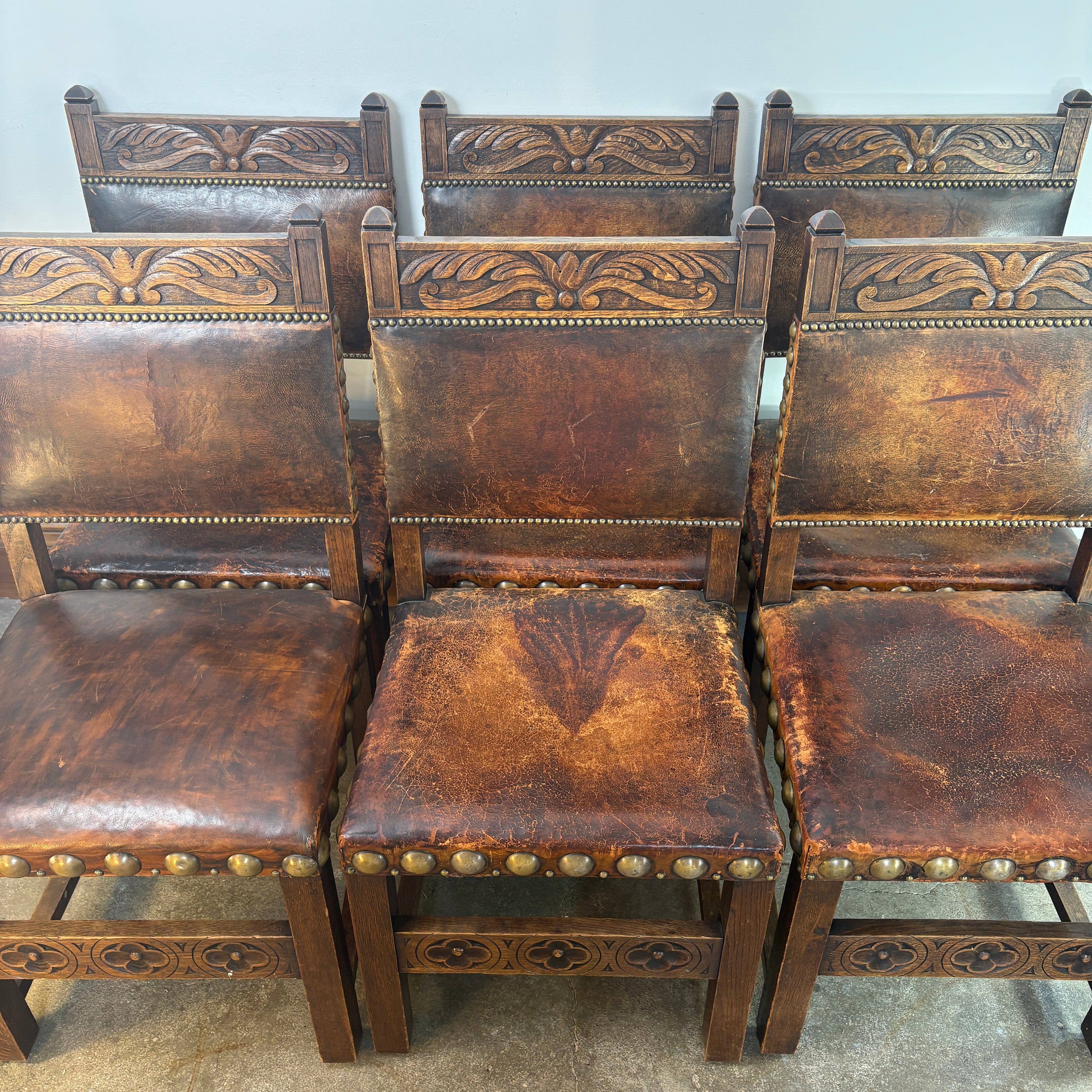 Set of Eight Oak and Leather Dining Chairs. They Included Two Arm Chairs (not matching but Coordinating) and Six Side Chairs. Chairs have Oversized Nail Head Detail and Carved Wood Accents. All have distressed leather feature. Side chairs have carved wood detail.