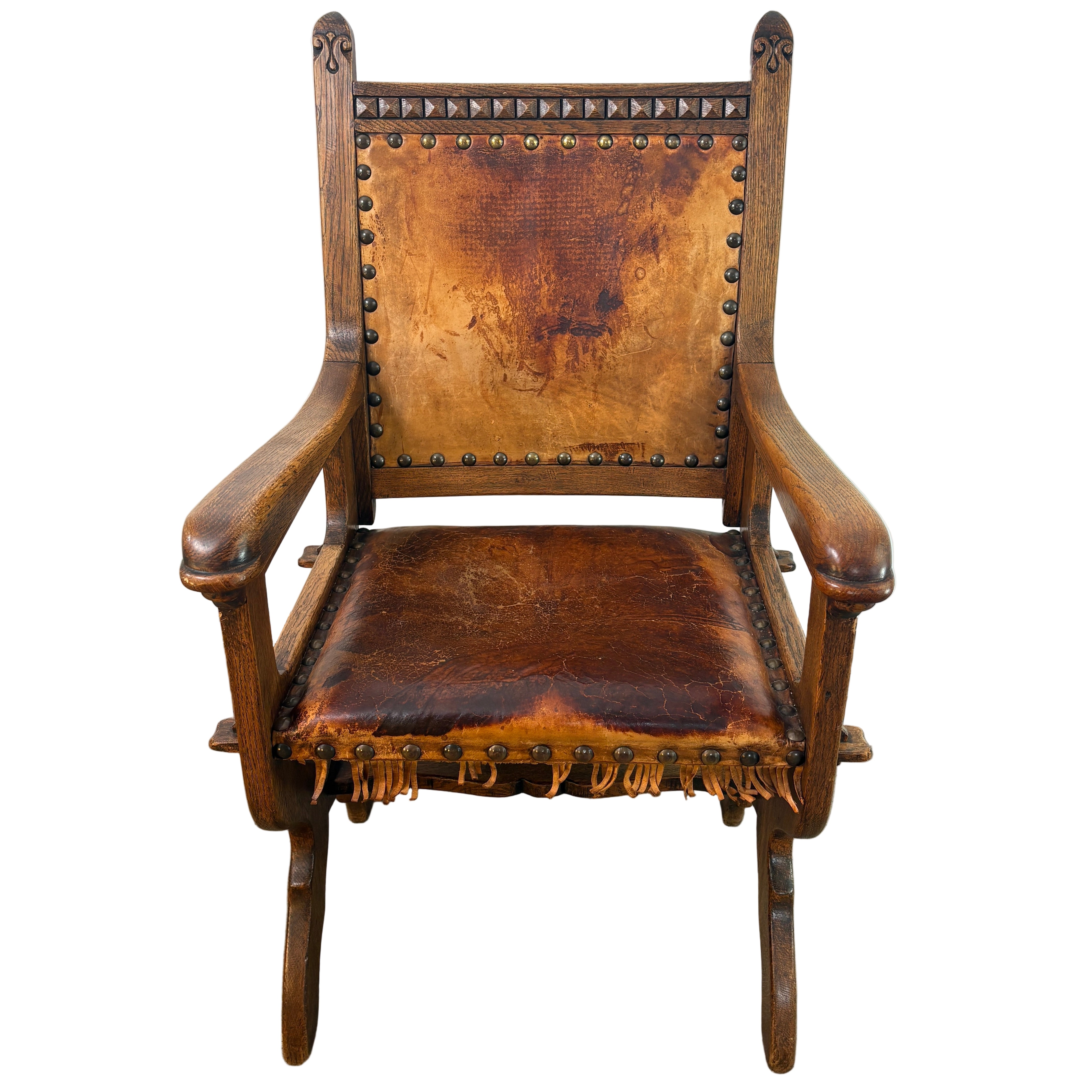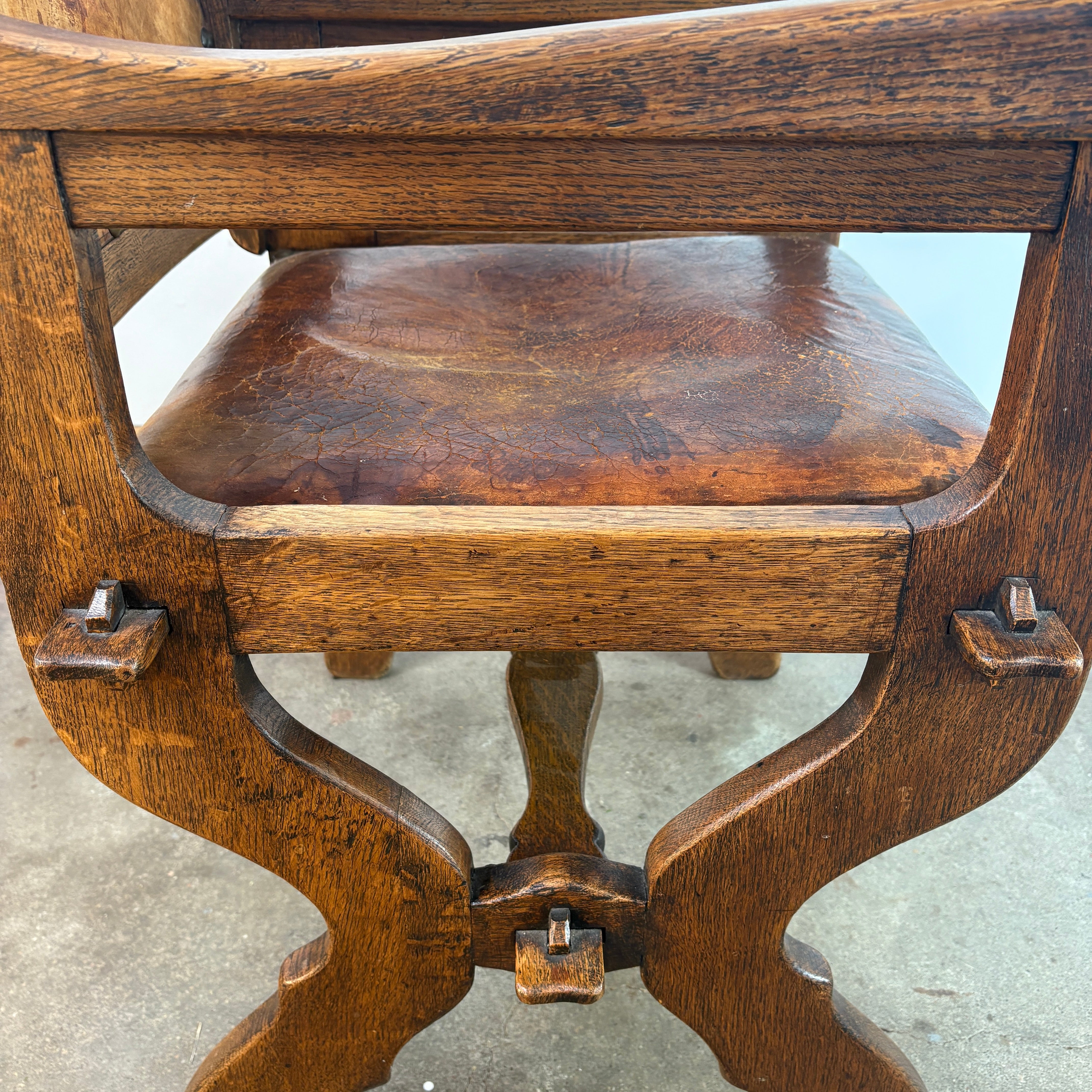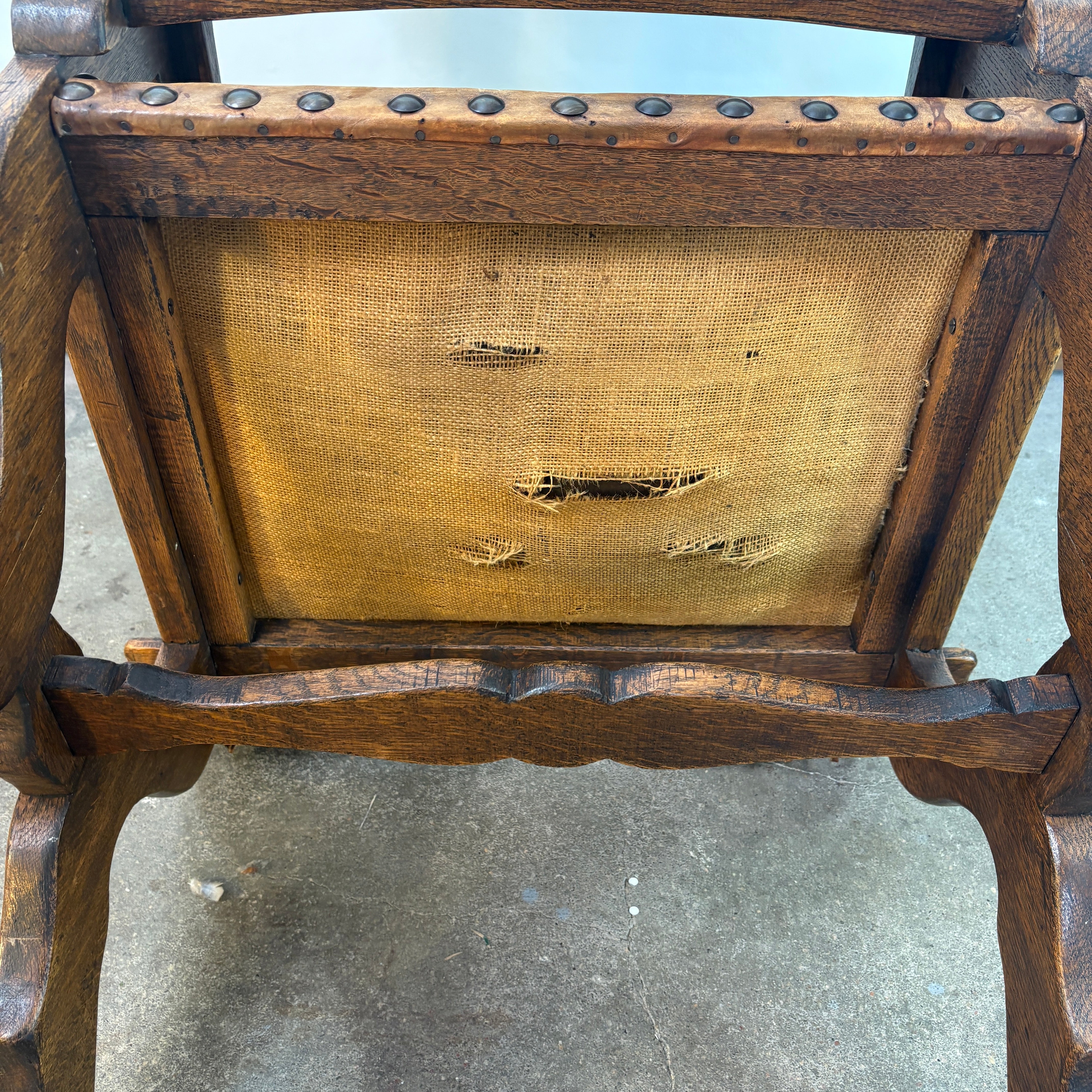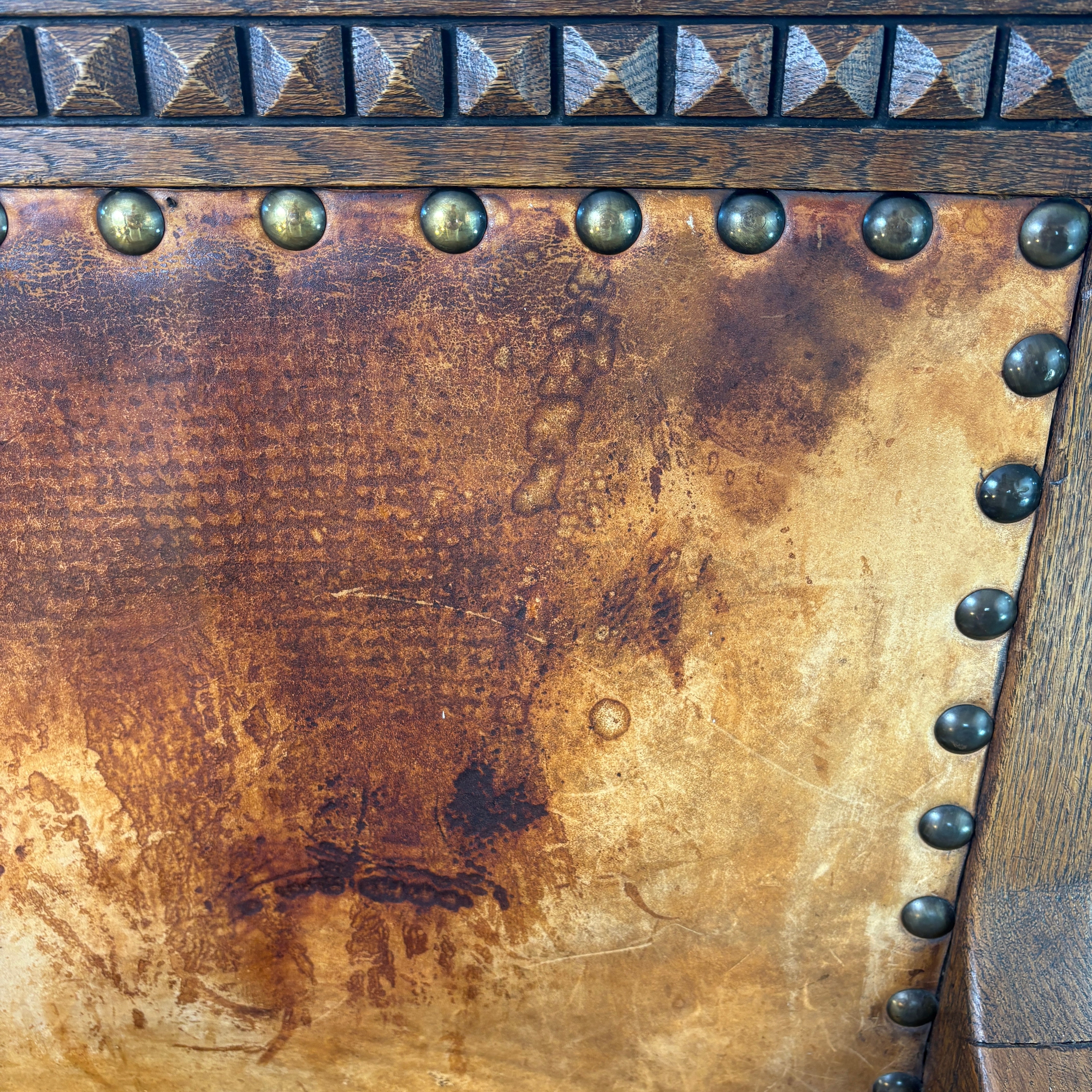 Set of Eight Oak and Leather Dining Chairs. They Included Two Arm Chairs (not matching but Coordinating) and Six Side Chairs. Chairs have Oversized Nail Head Detail and Carved Wood Accents. All have distressed leather feature. Side chairs have carved wood detail.
