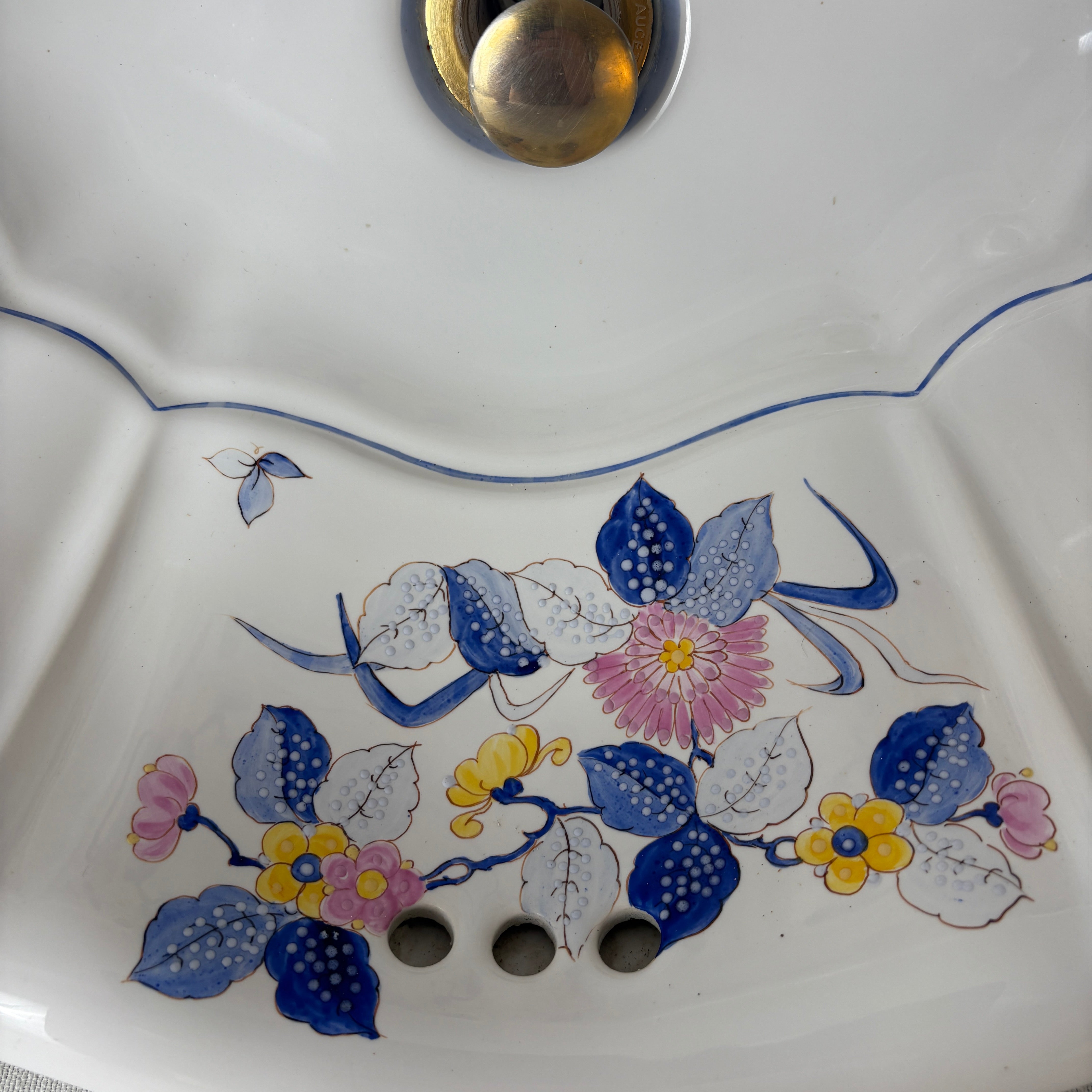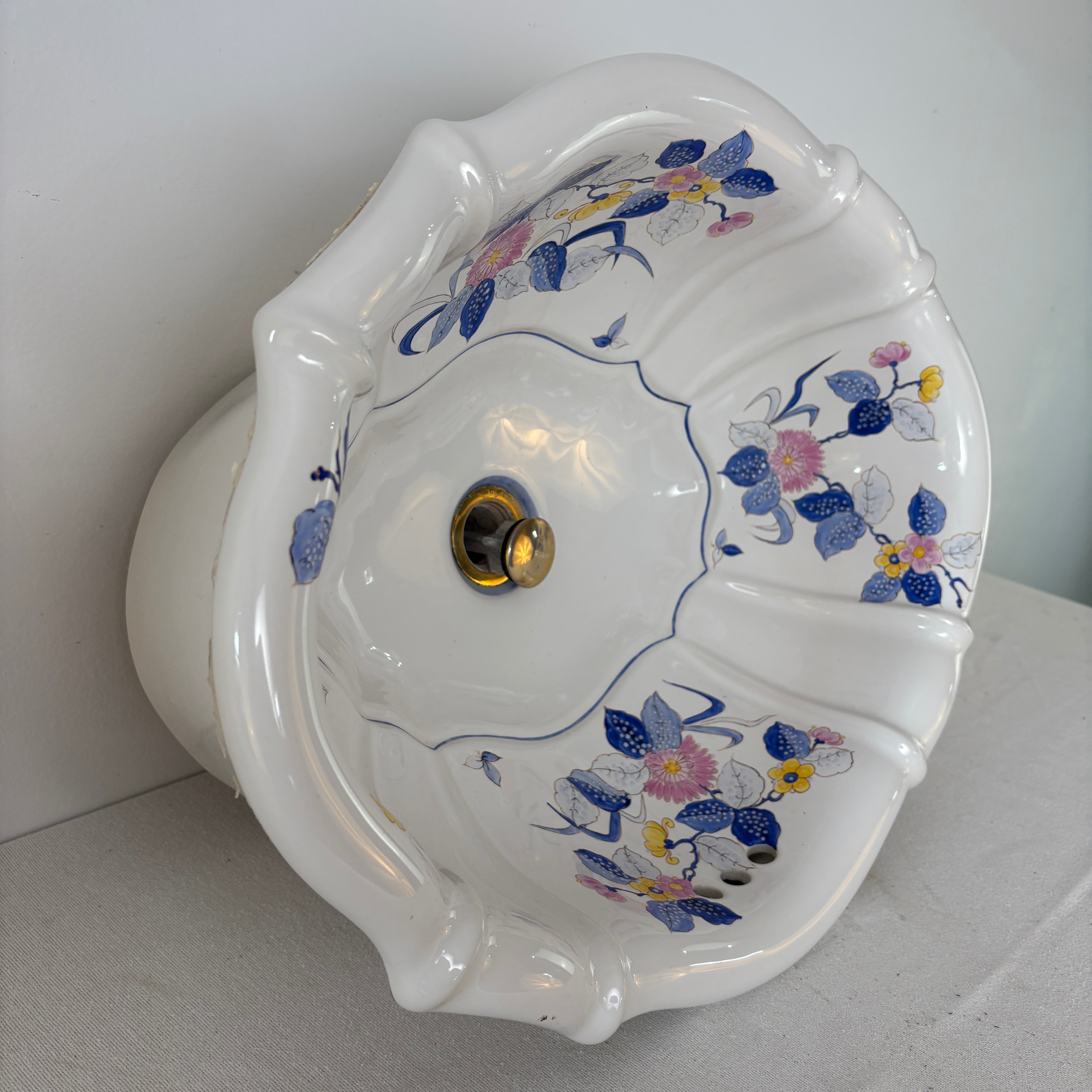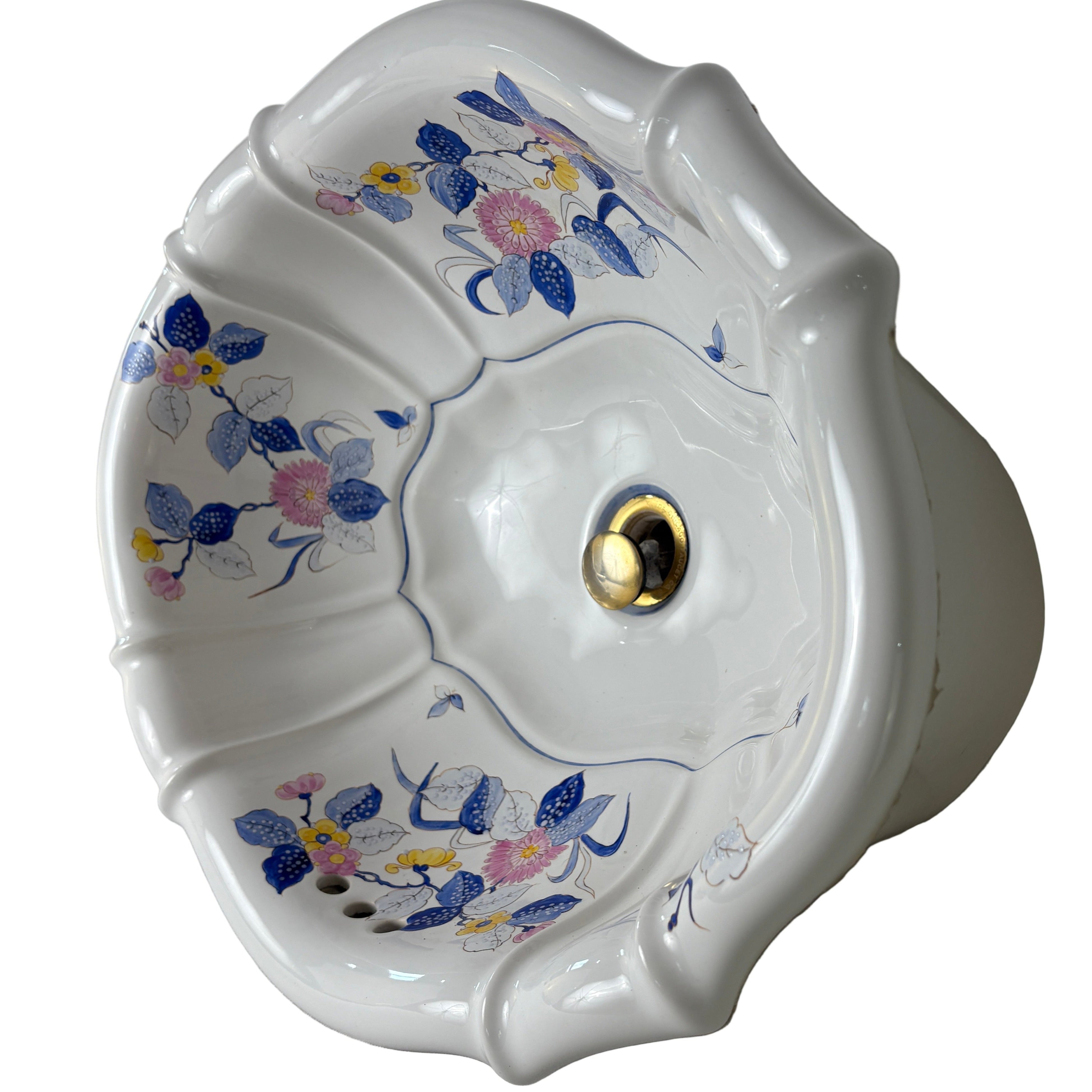 Sherle Wagner vintage Italian drop in oval sink in white with ribbed detail. Hand painted with blue, pink and yellow floral design.