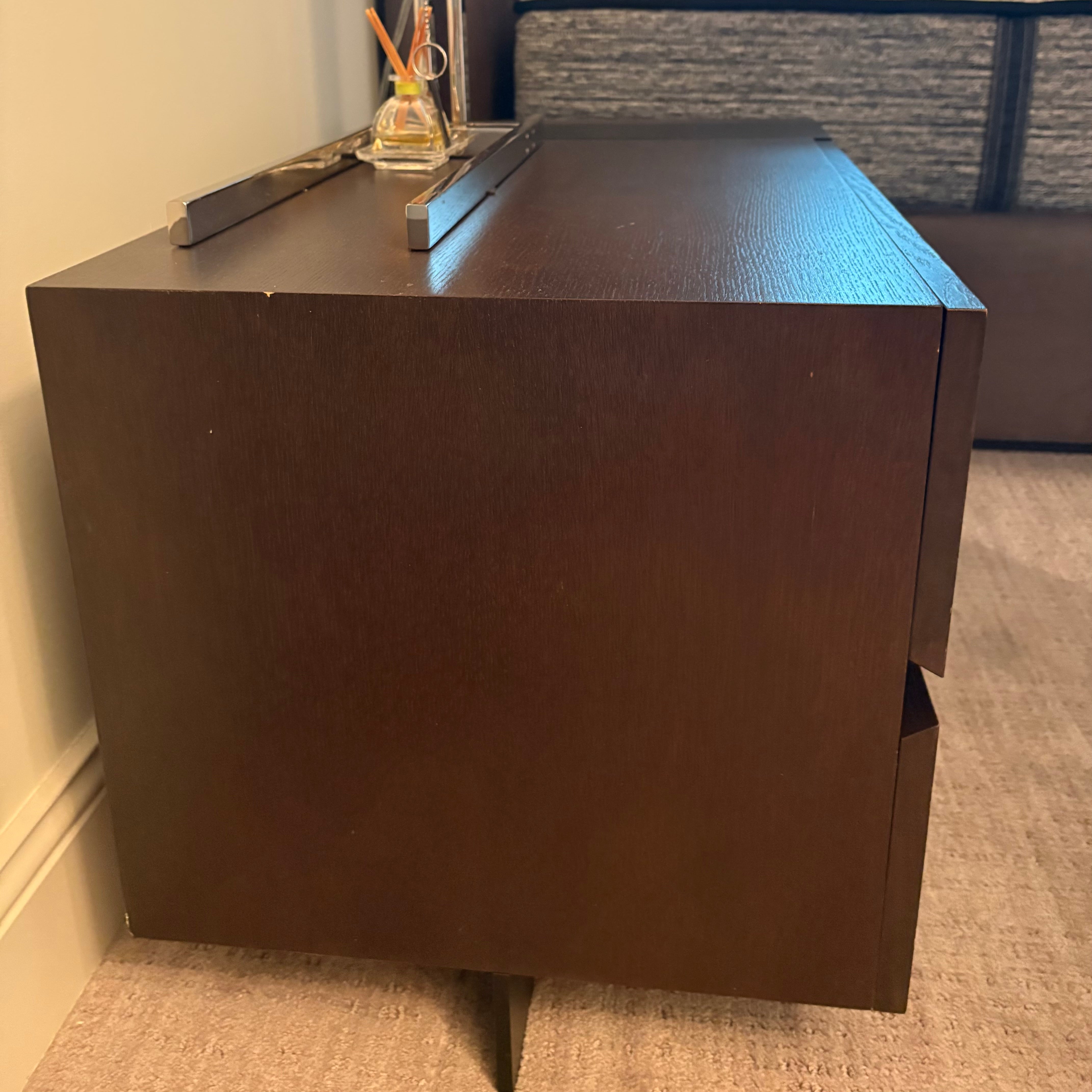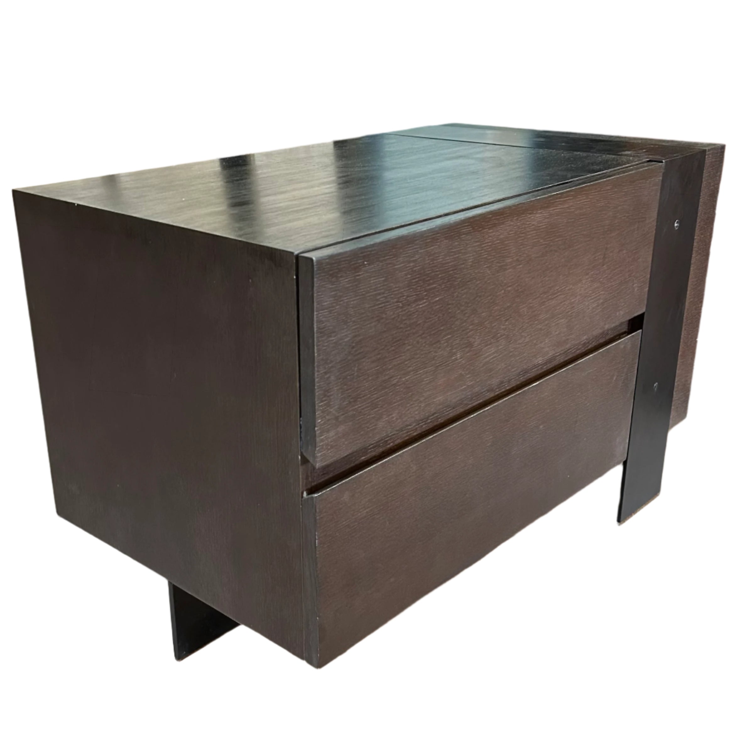 Anton Prulx night stands, bedside cabinets in dark stained wood and steel with two drawers. Contemporary in style. Sold as a pair