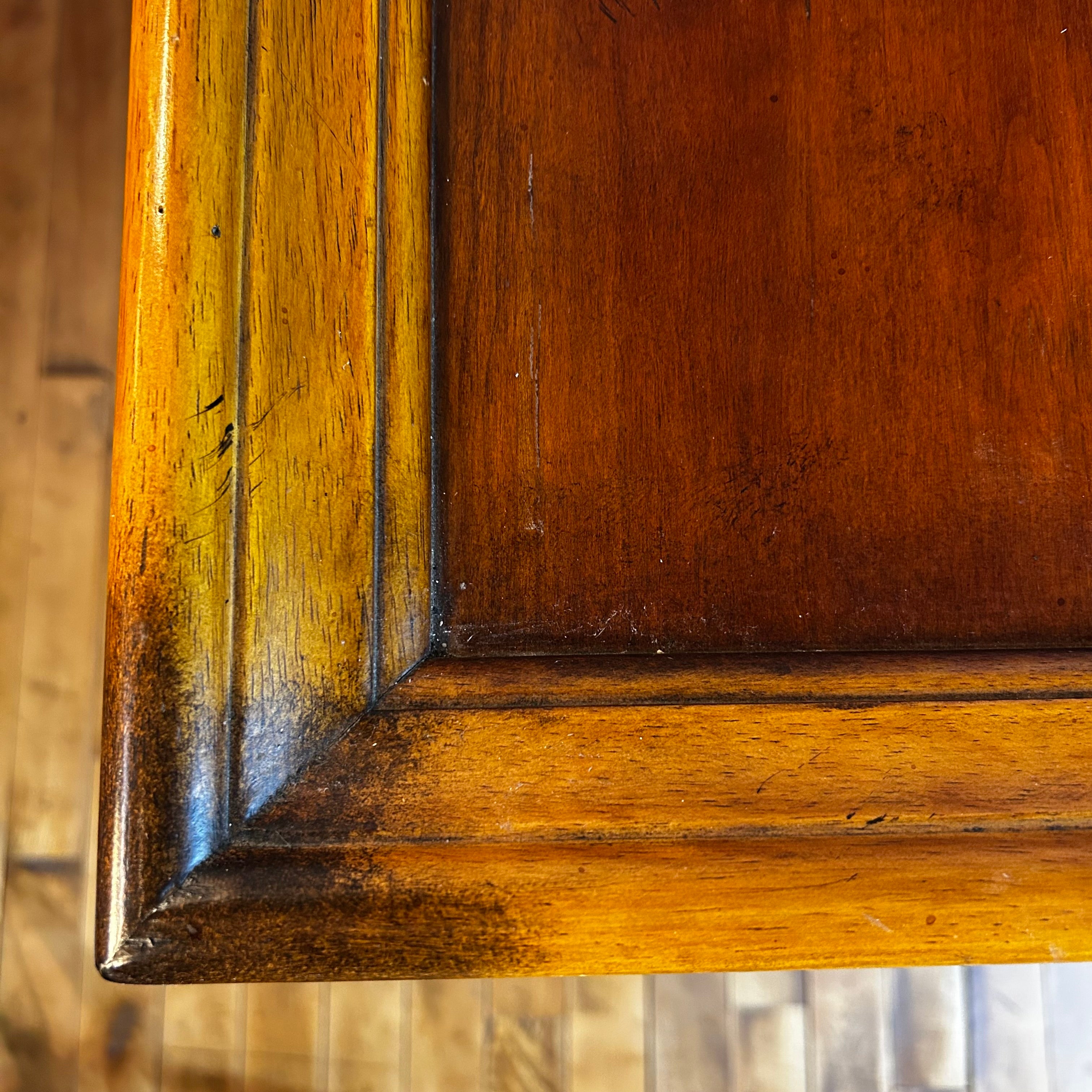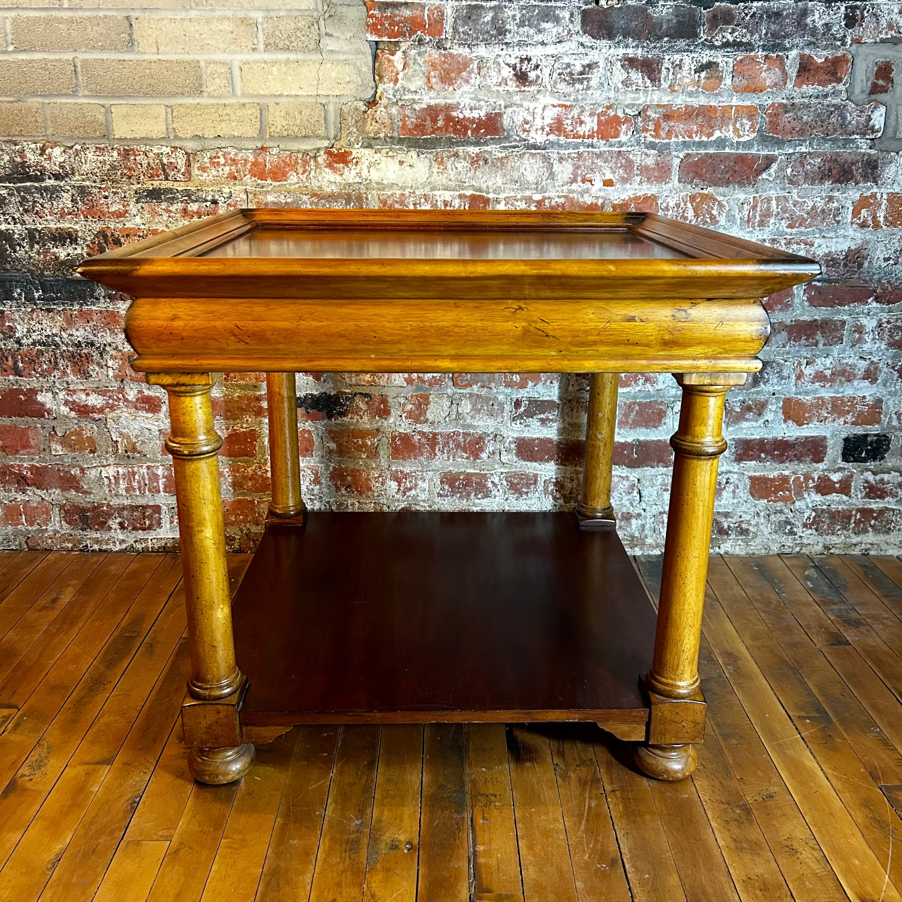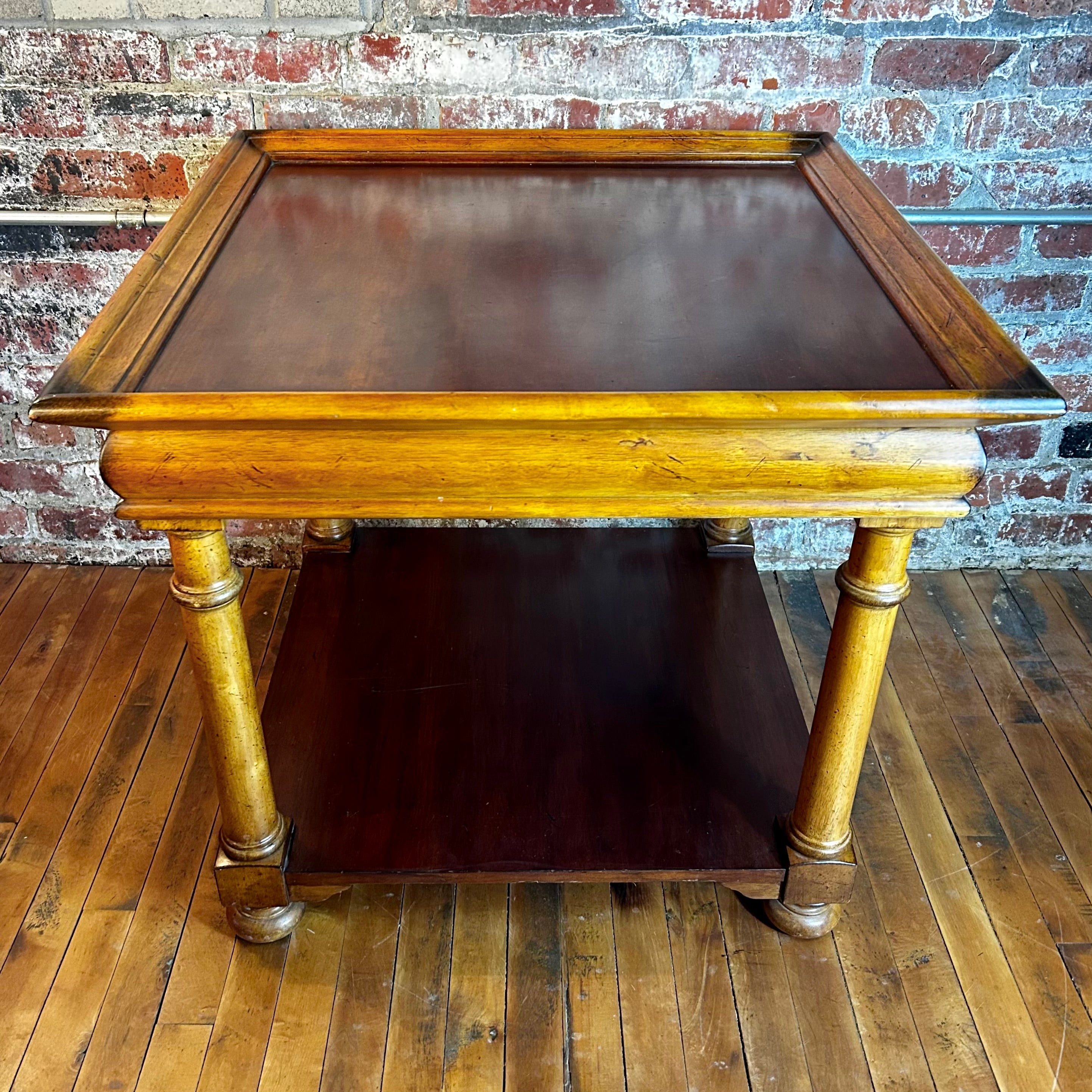 Side or end table, square, solid wood in multiple woods and stains, two shelves, with column legs and bun feet, traditional in style. Vintage, 1970s or 1980s.