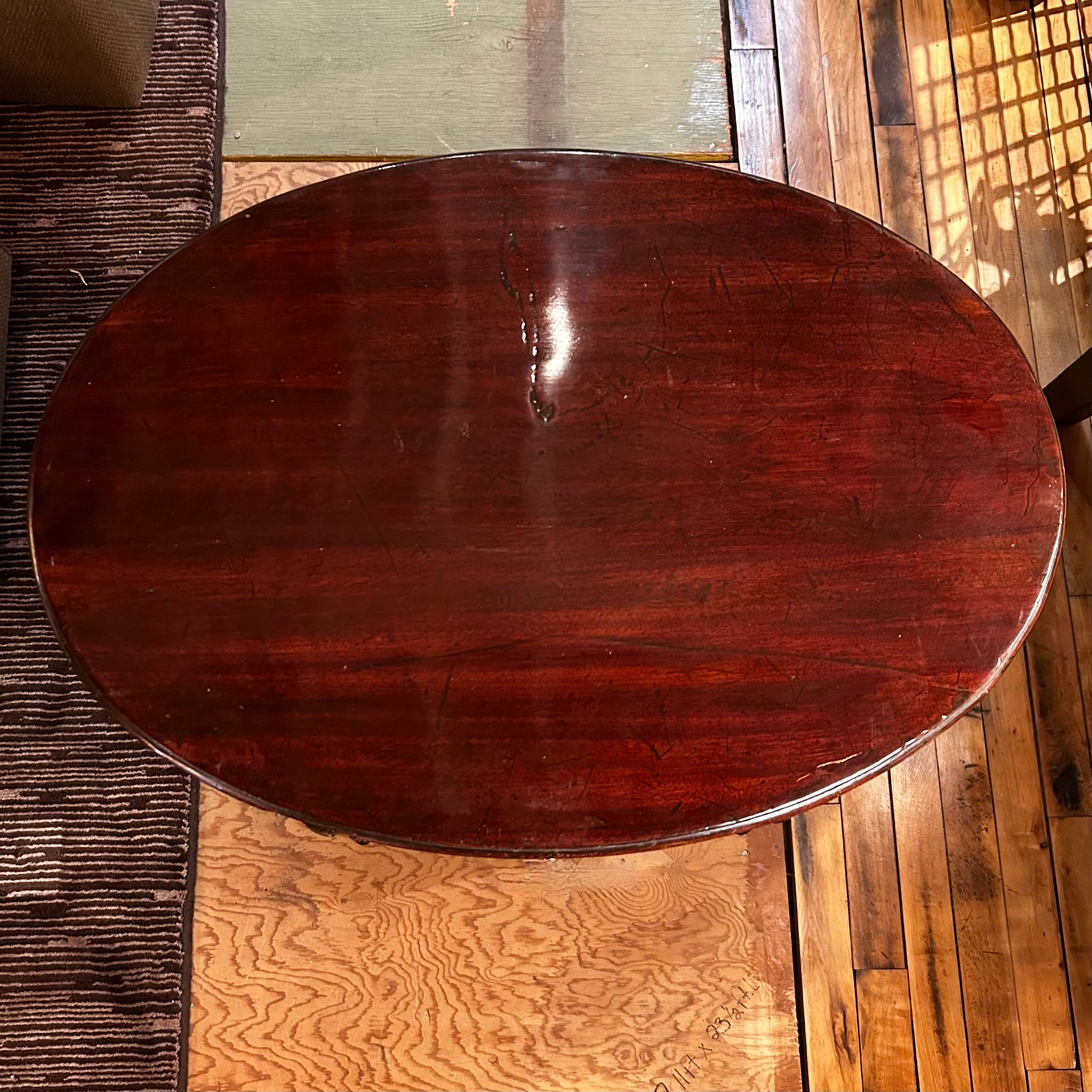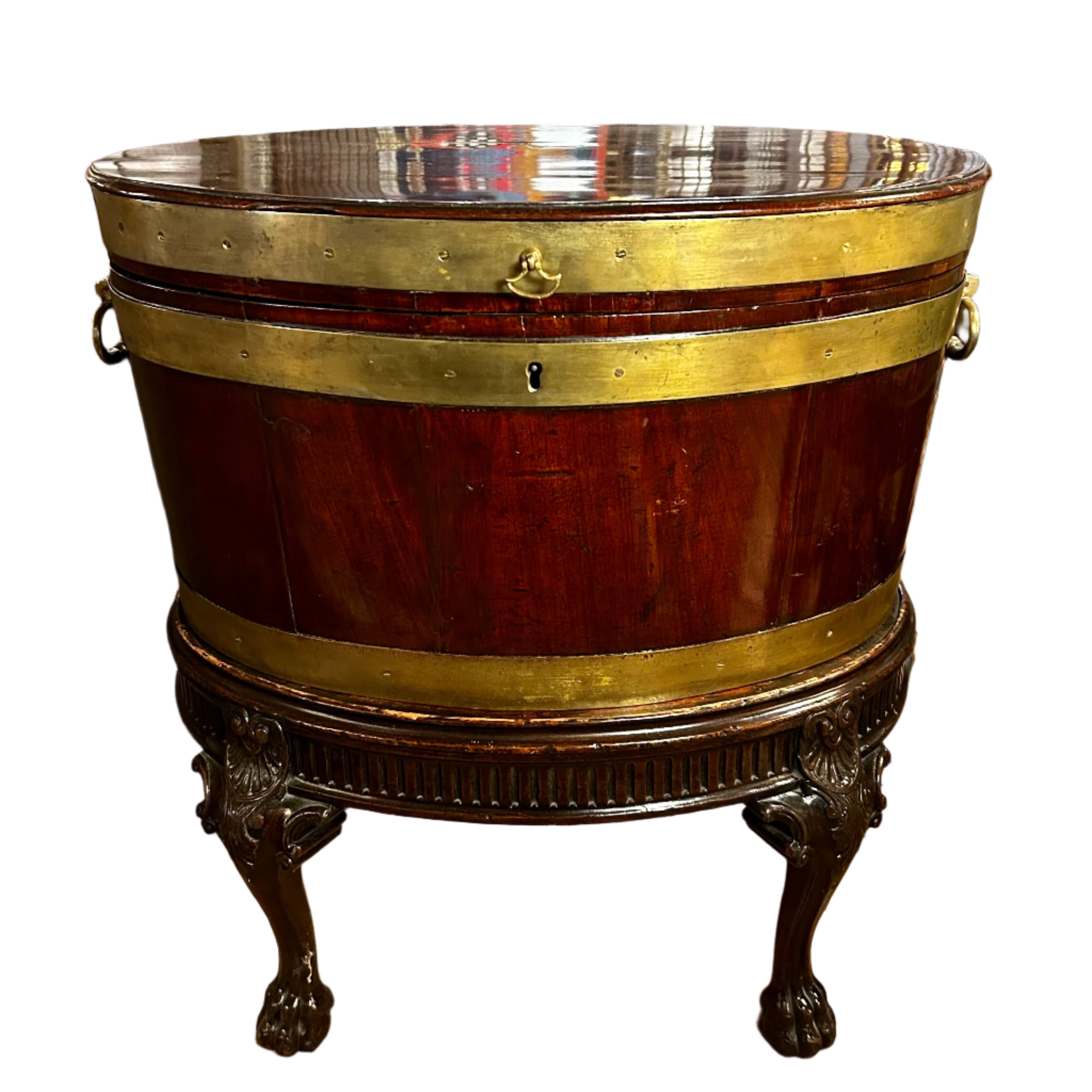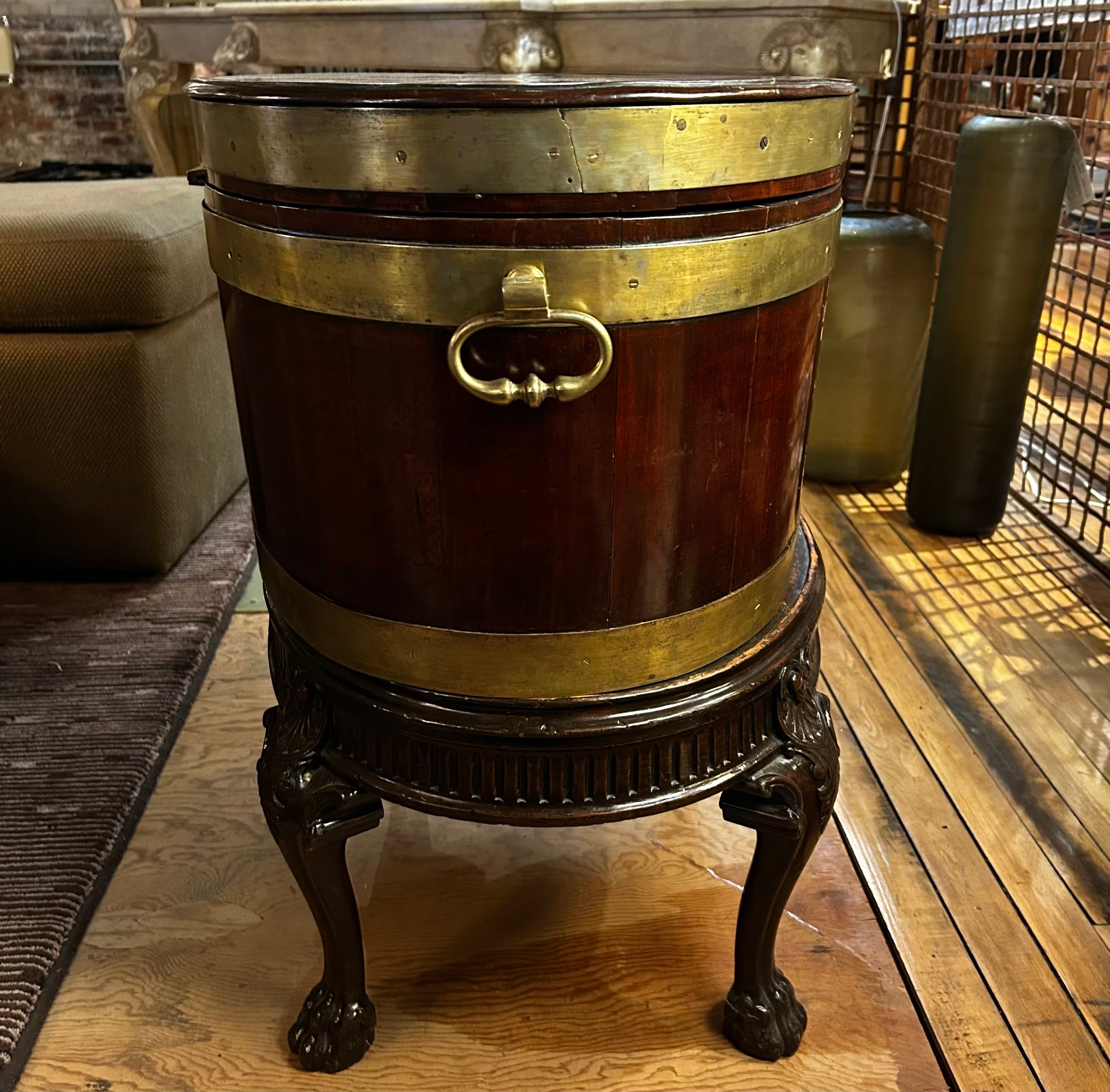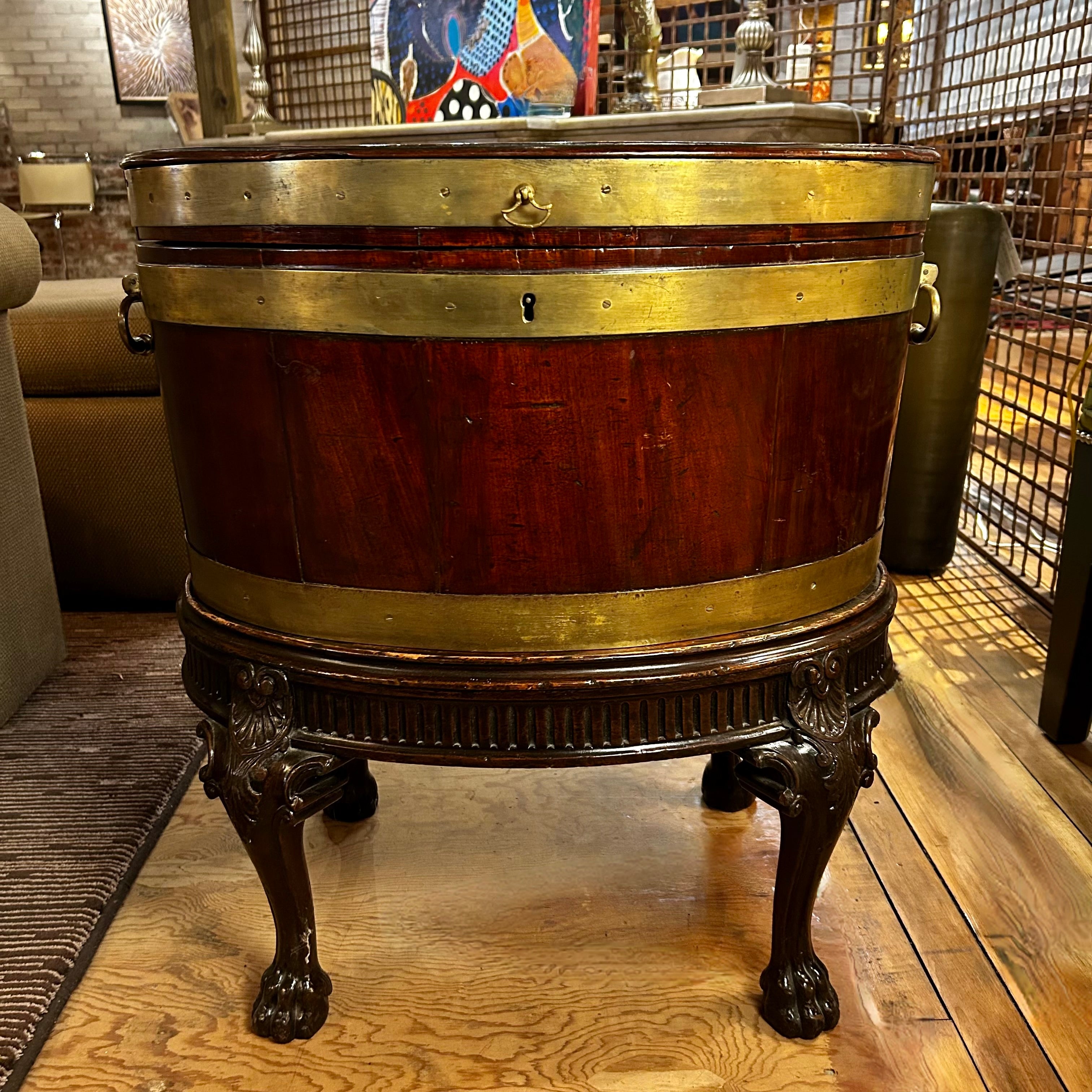 George the III brass banded mahogany cellaret on wood stand with claw feet and brass band. This is a two piece set. Note: it does not include a liner.