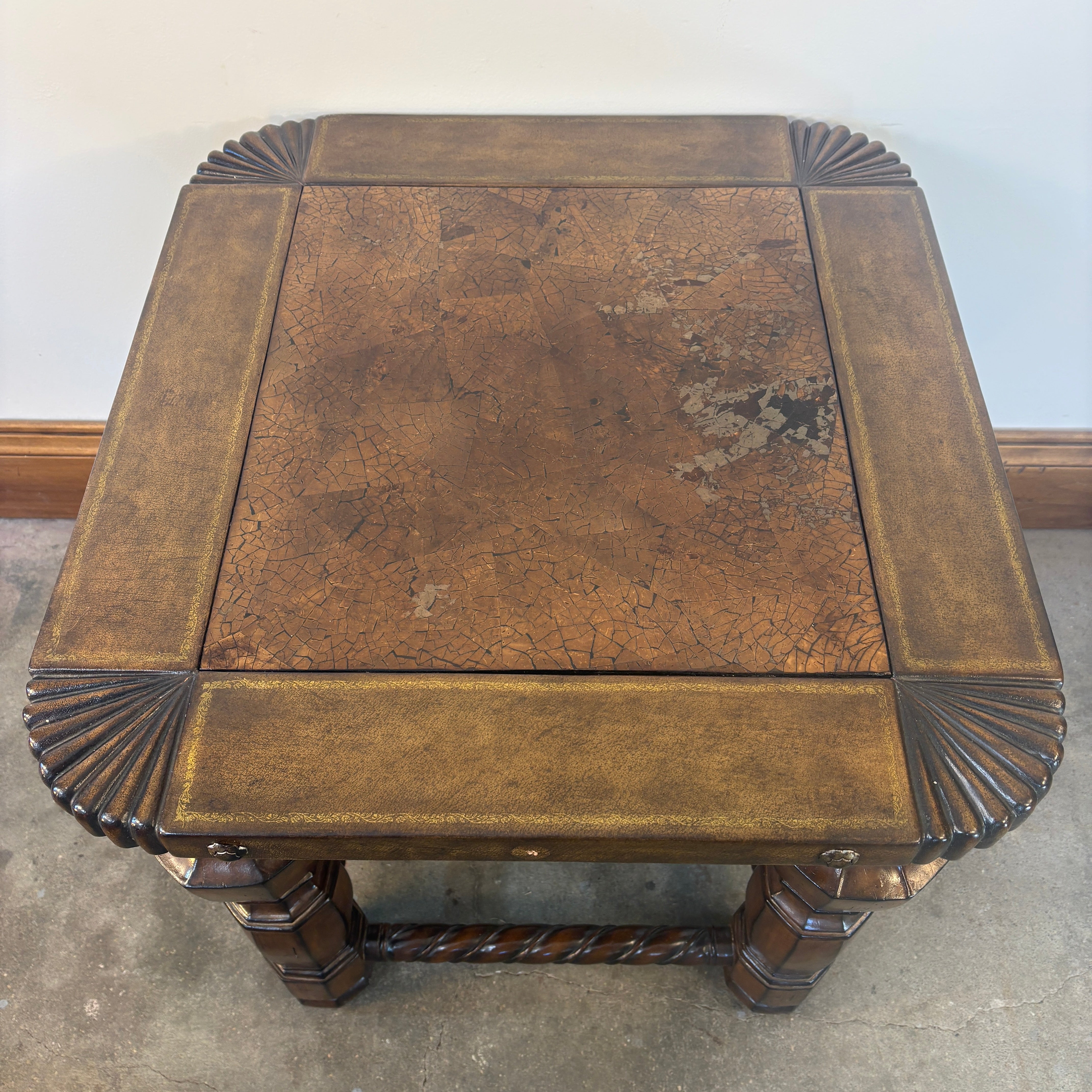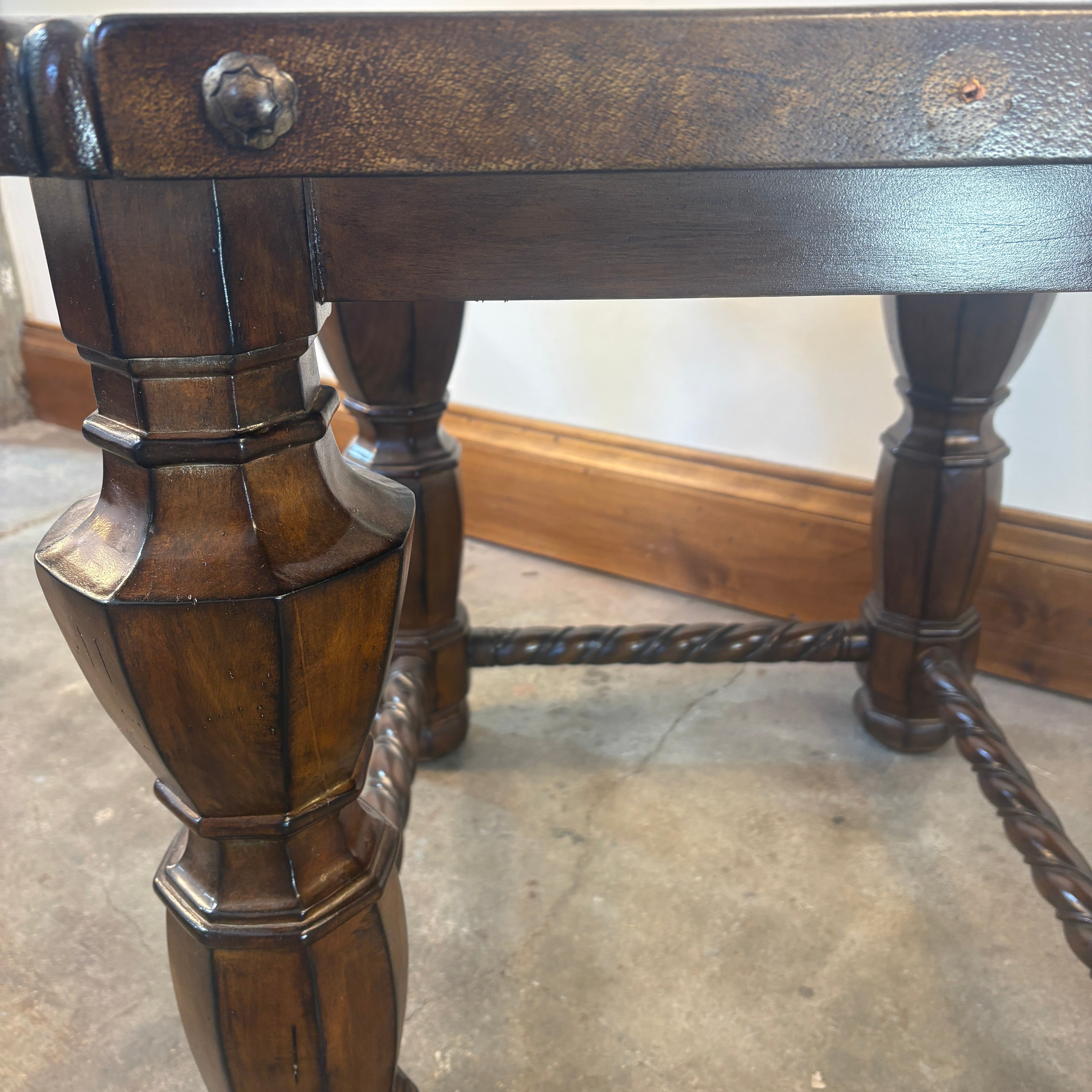 Side Table with Leather Top, Patina Nail Head Detail Barley Twist, Stretcher Base.