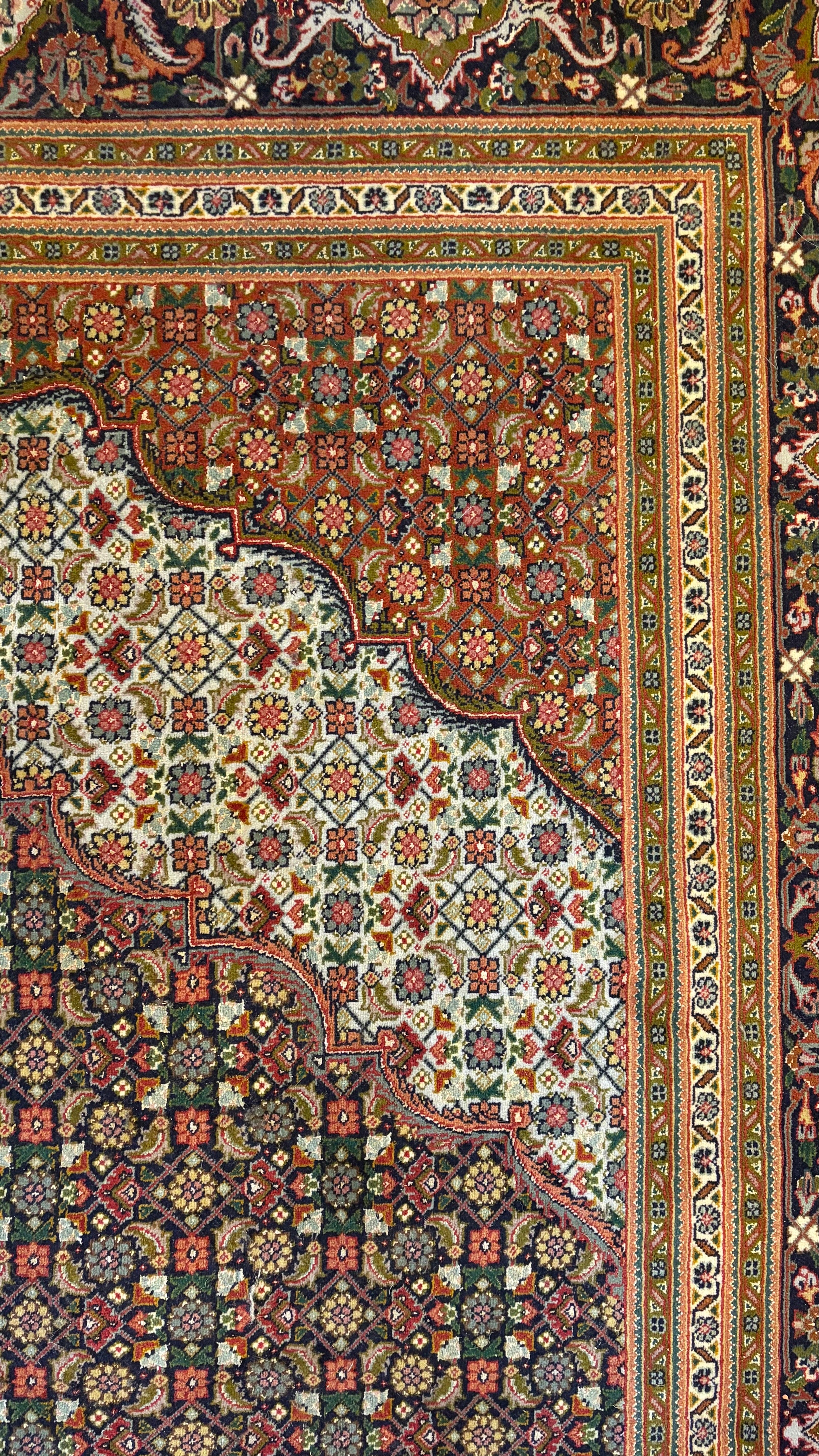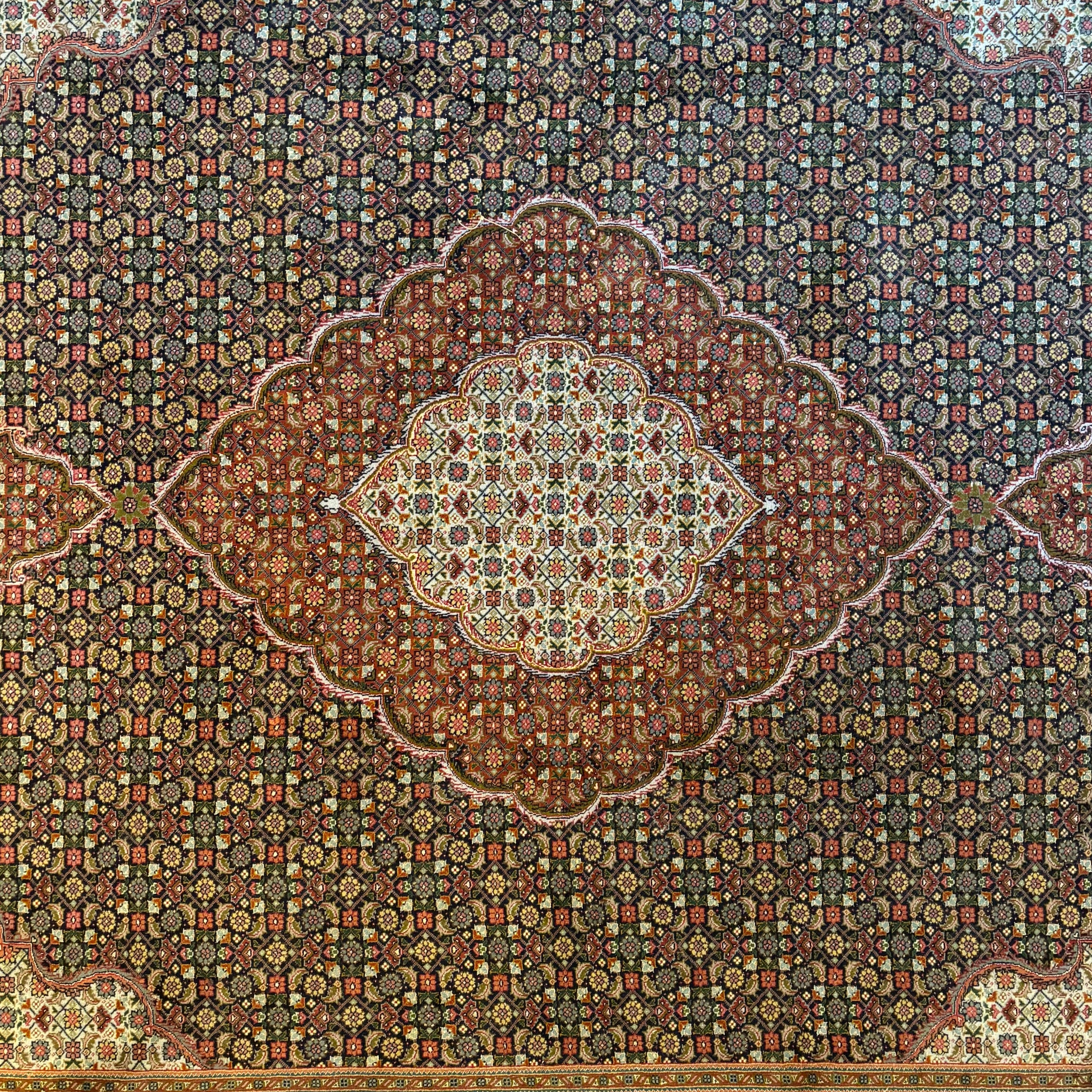 Silk Area Rug, Primarily Blue, Red with accent colors of green, gold and beige.