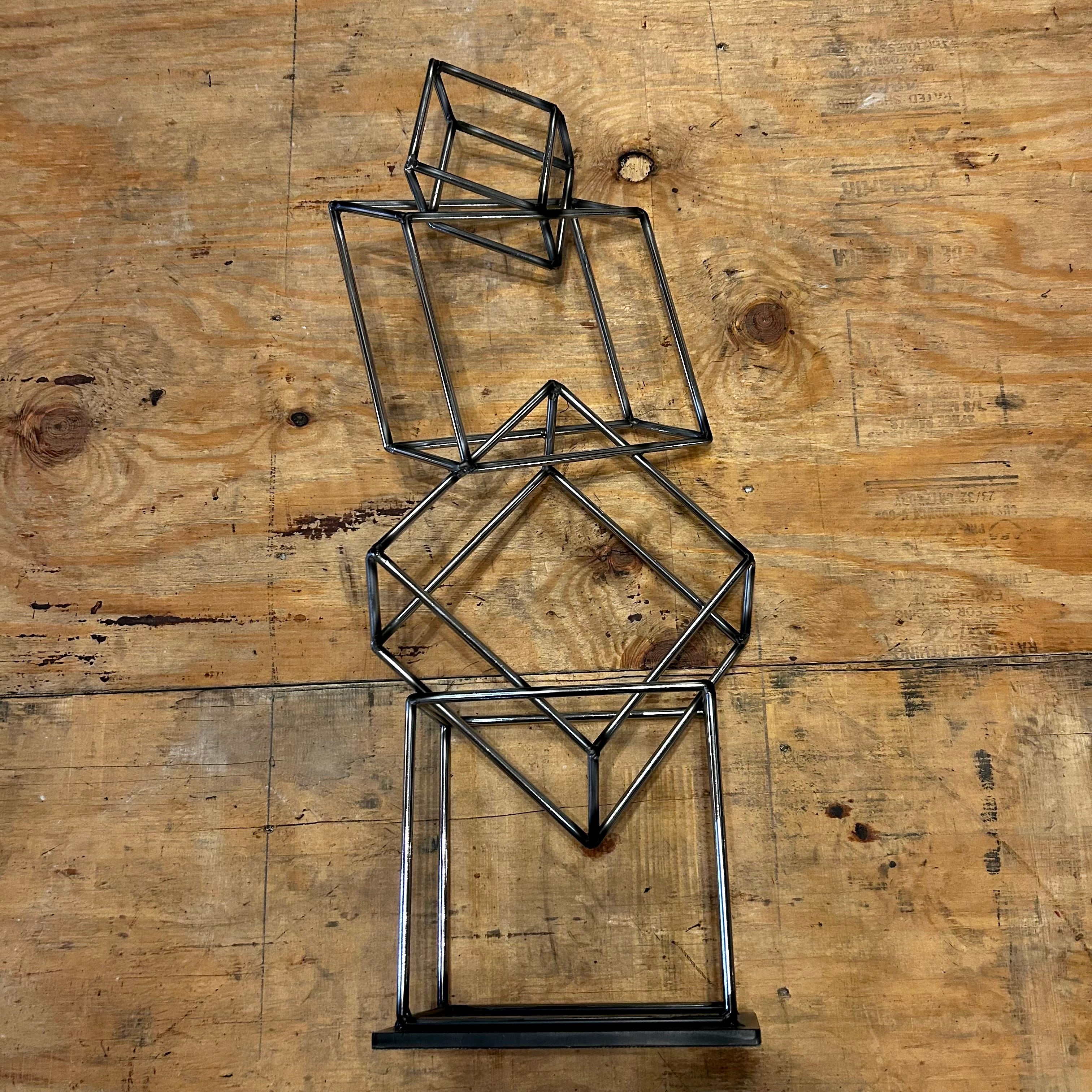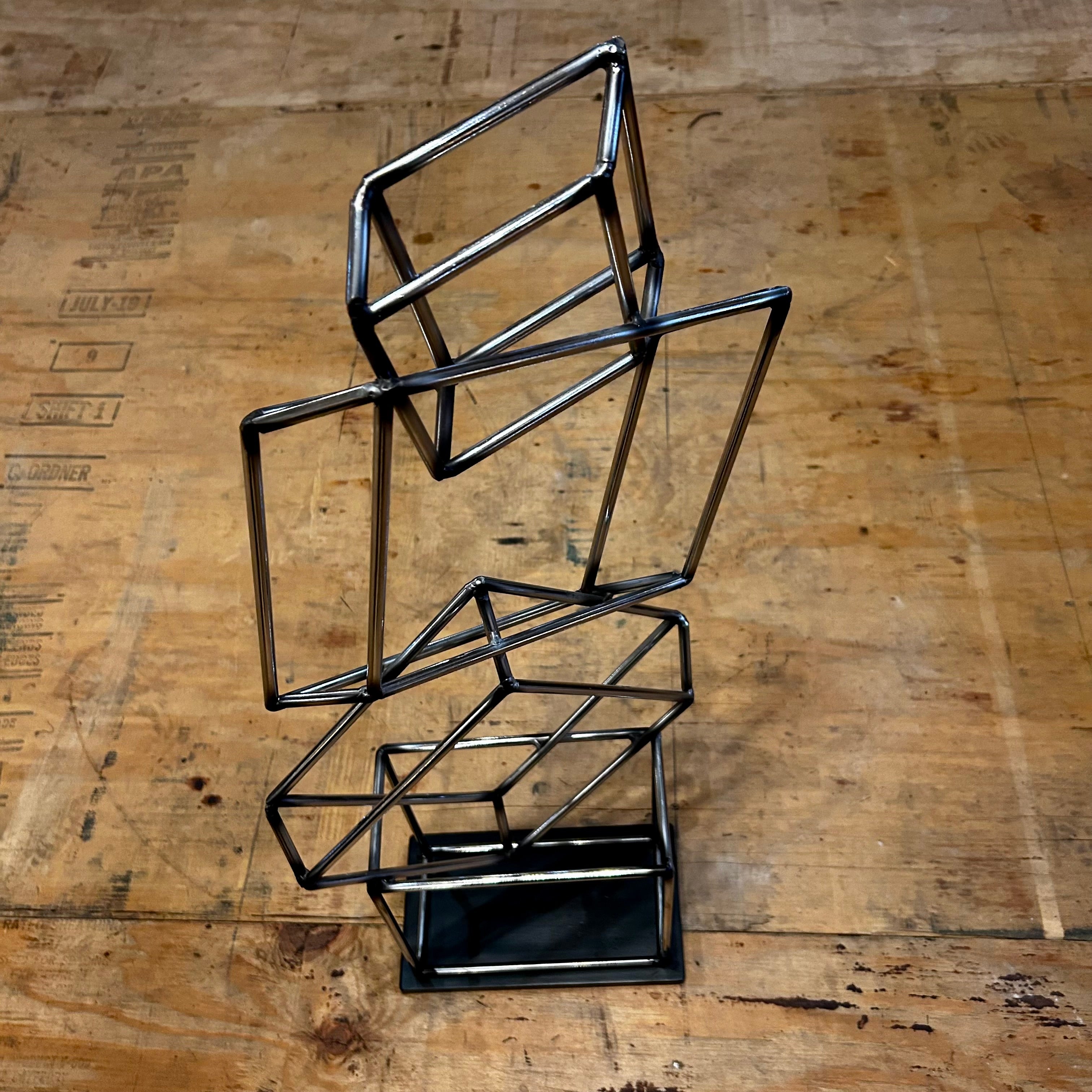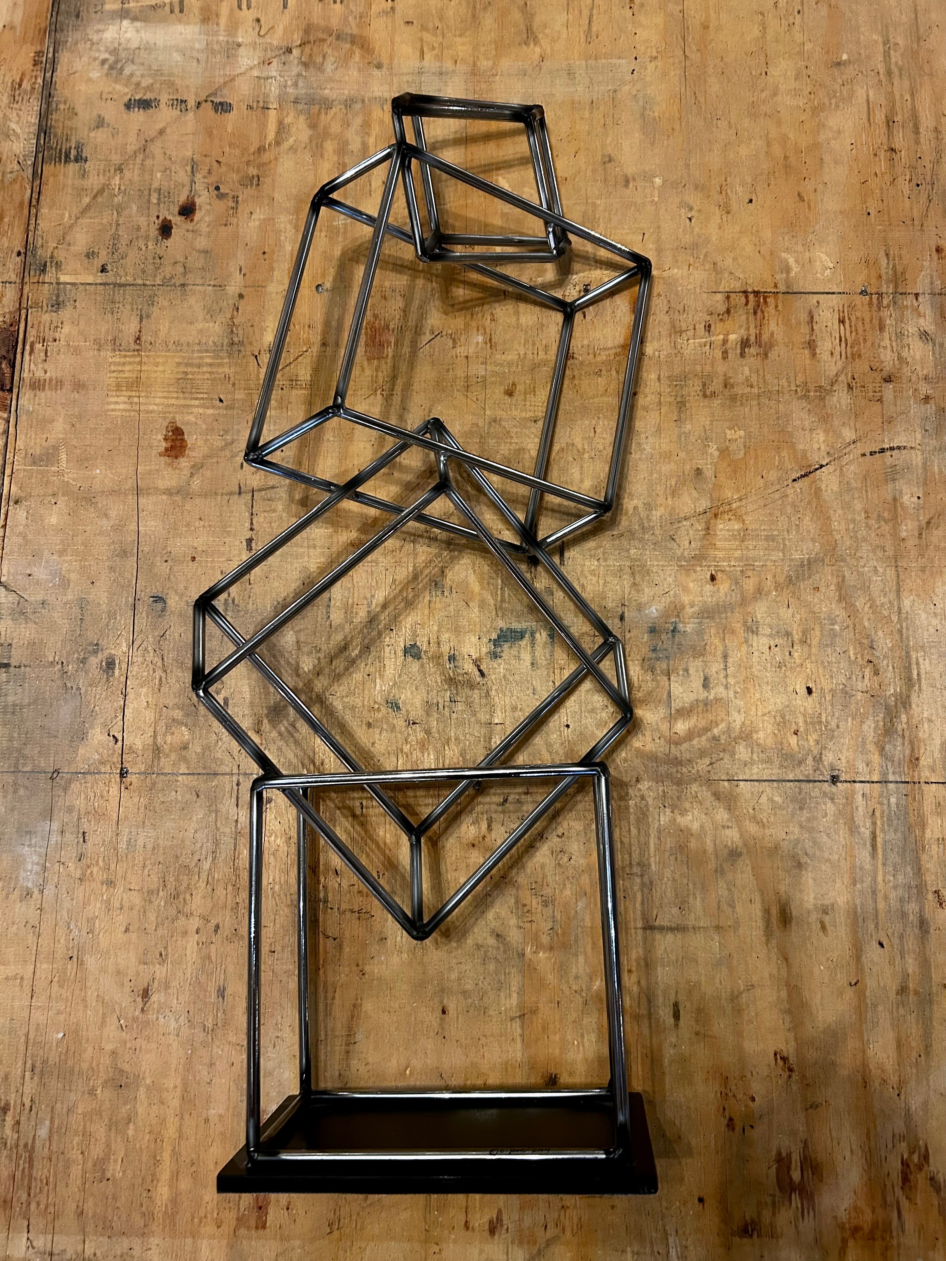 Chrome (perhaps nickel) in 3D stacked squares table art sculpture with with black wood stand.