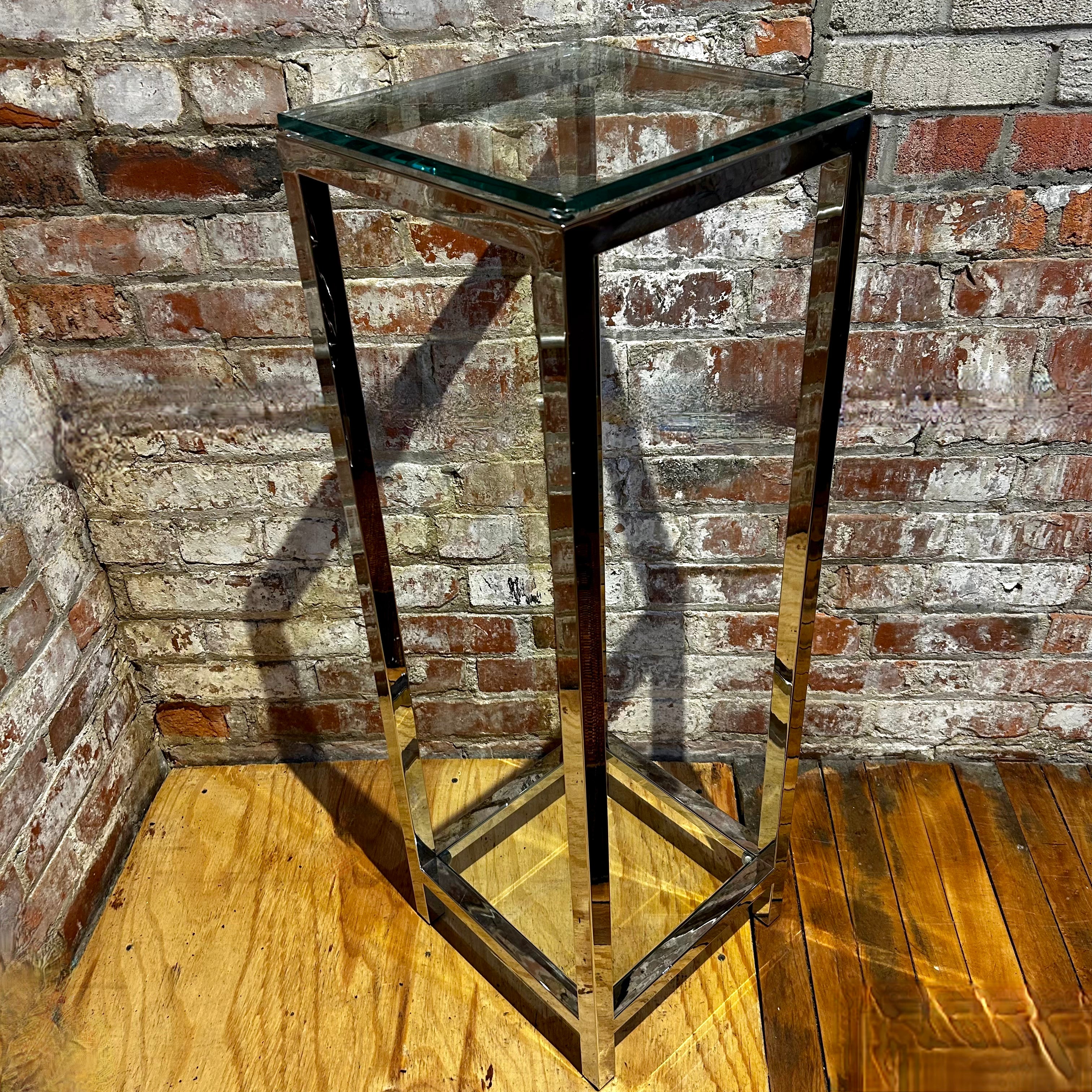 Chrome pedestal table with two glass shelves. Perfect for displaying artwork or collectibles.