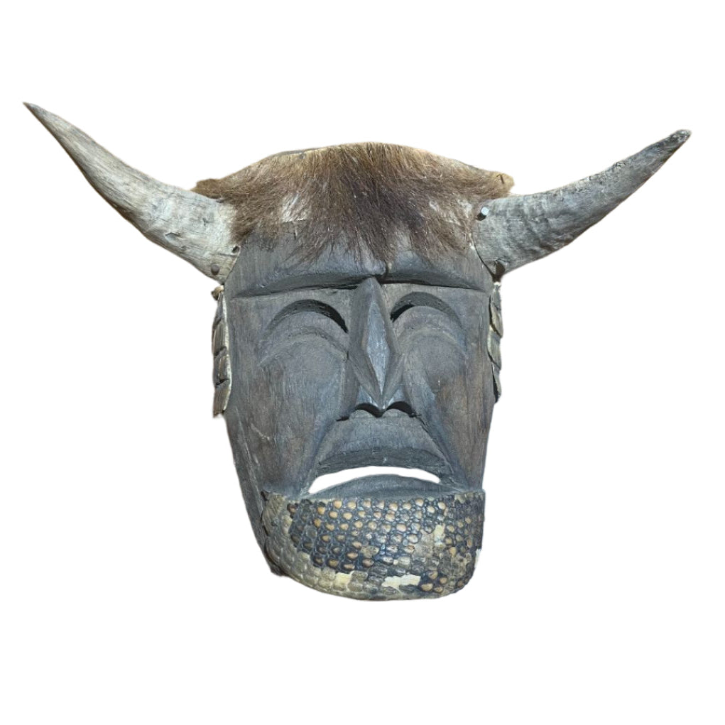 Vintage hand-carved folk art mask, primitive, small. It appears to have read hide and horns.