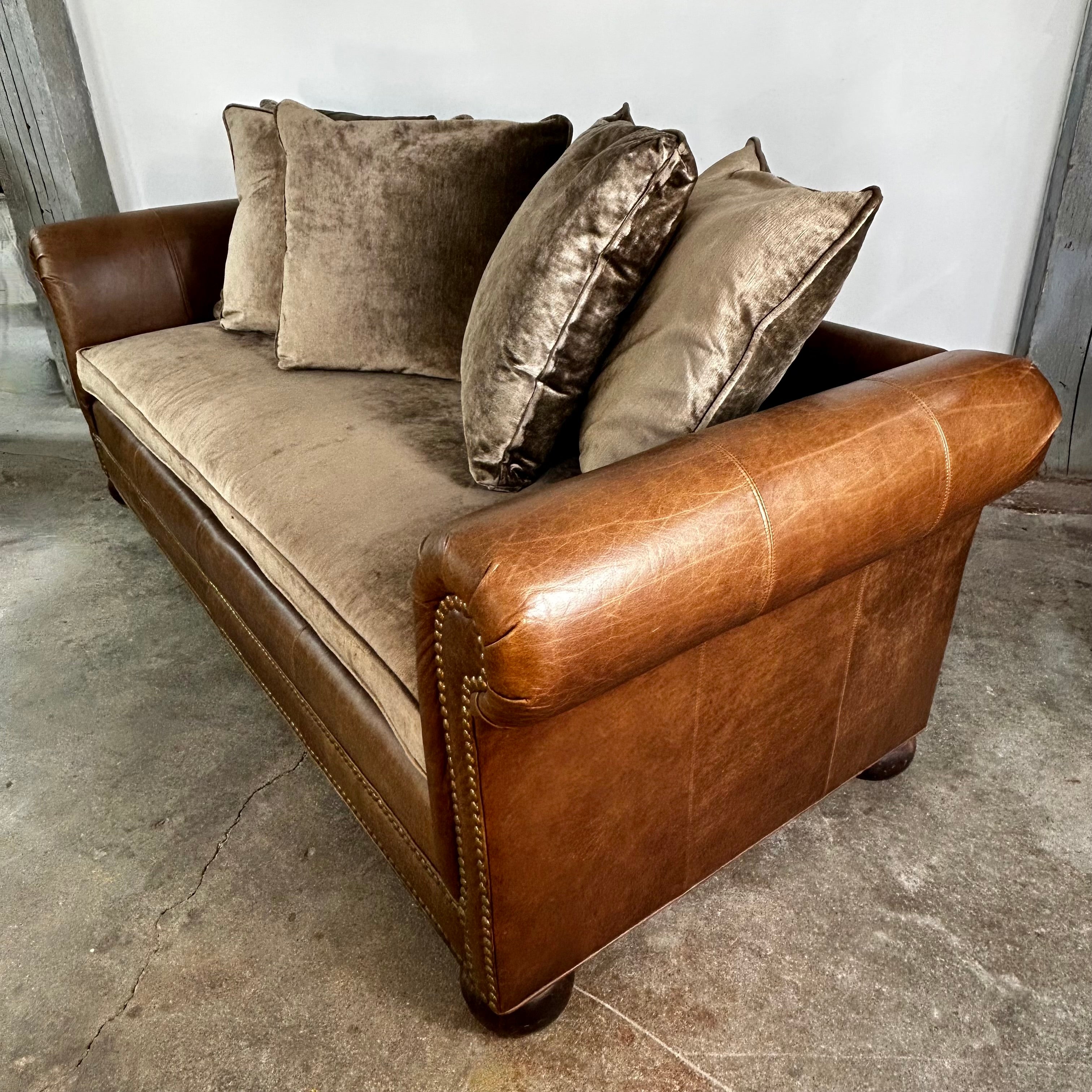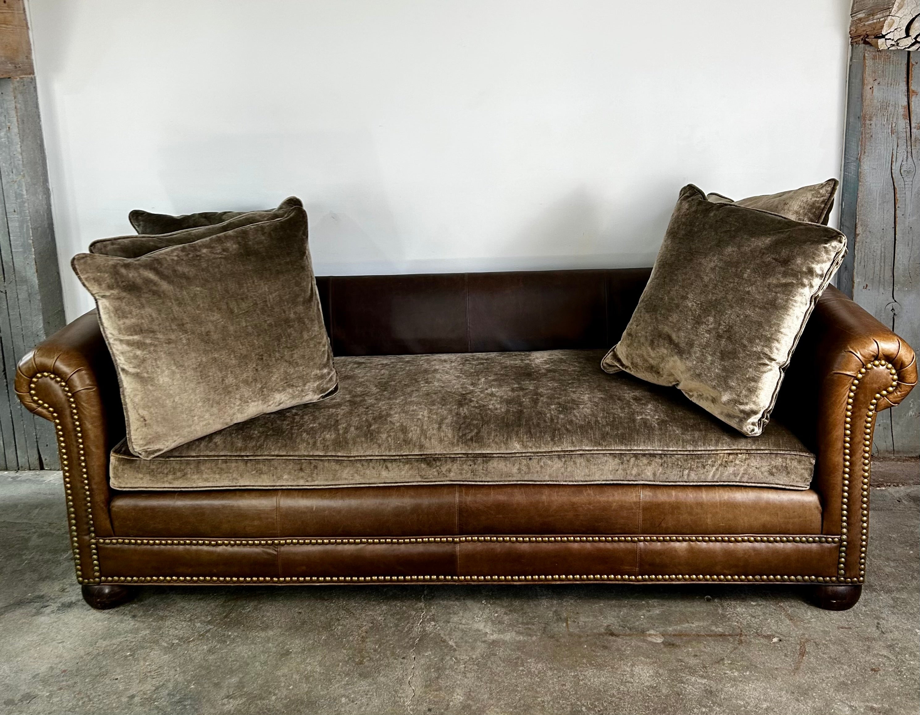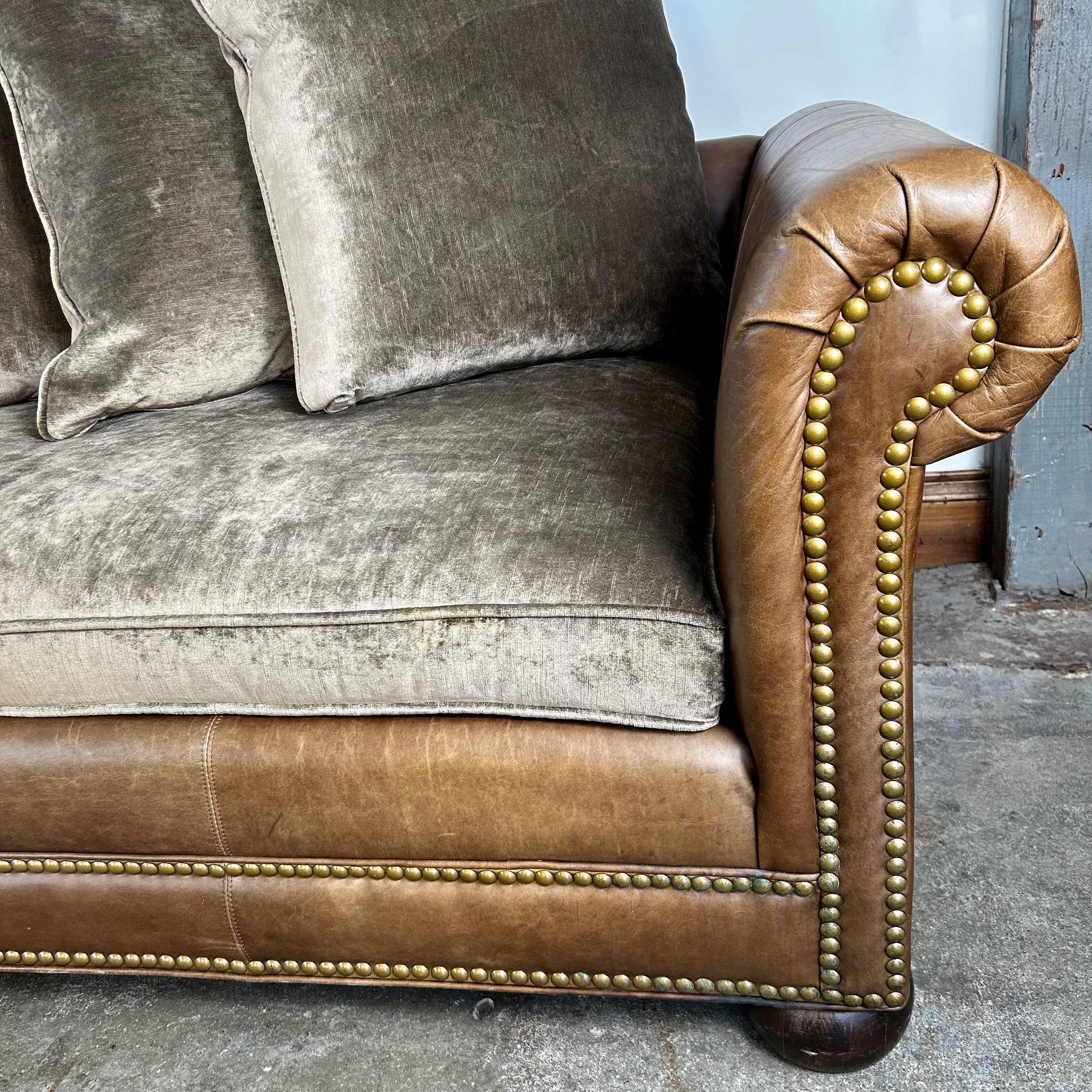 Westwood Industry leather sofa with taupe velvet pillows, single seat cushion, rolled leather arms with nail heads and wood bun feet.