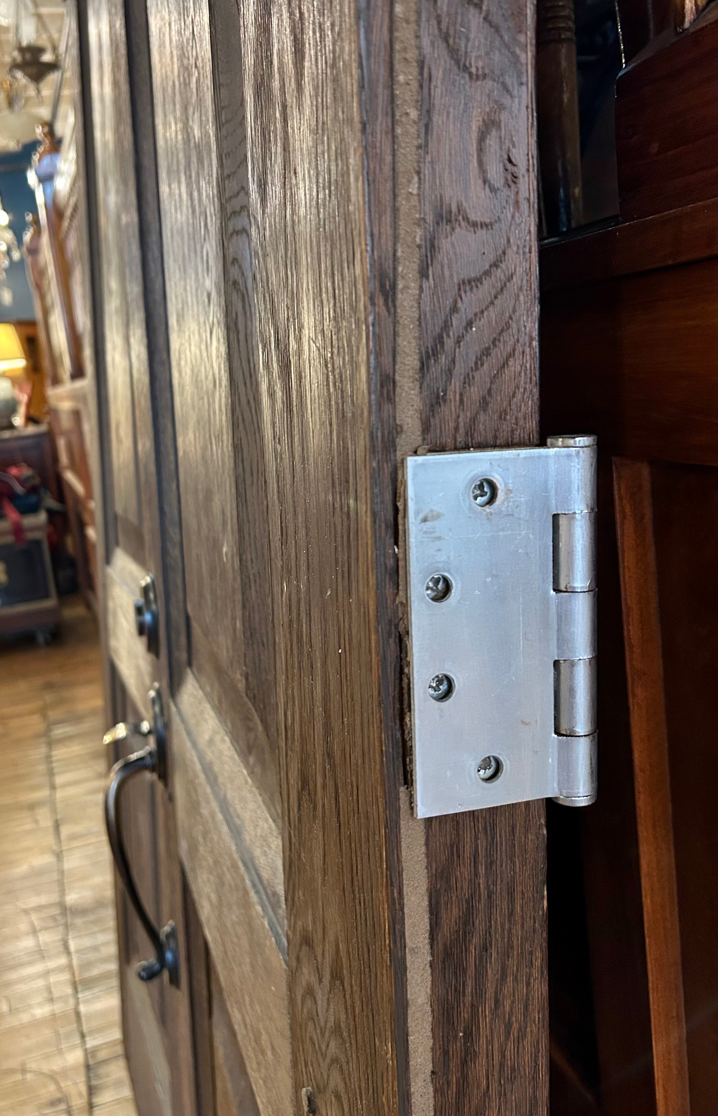 Pair of entry doors, solid oak, dark stained french doors with hardware.
