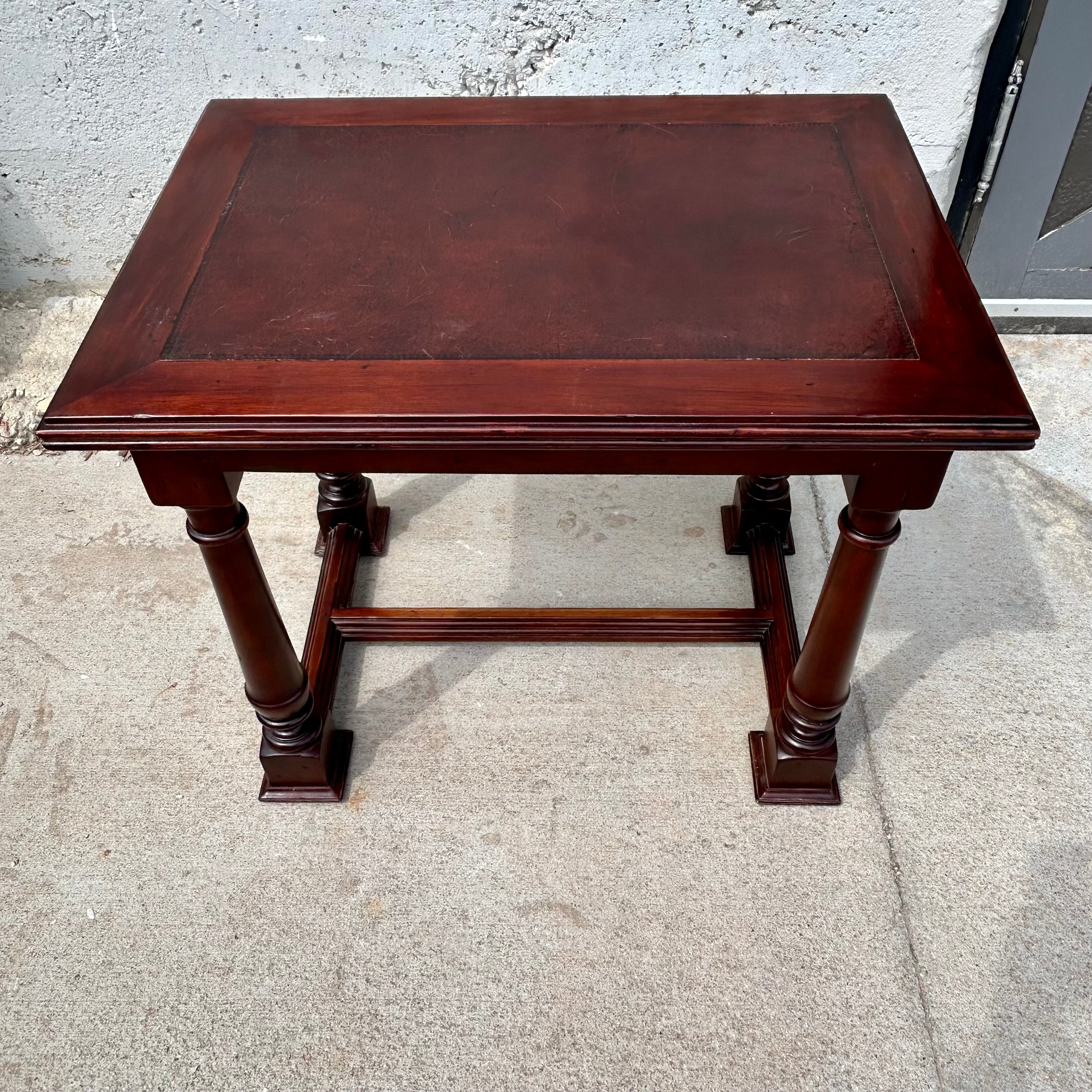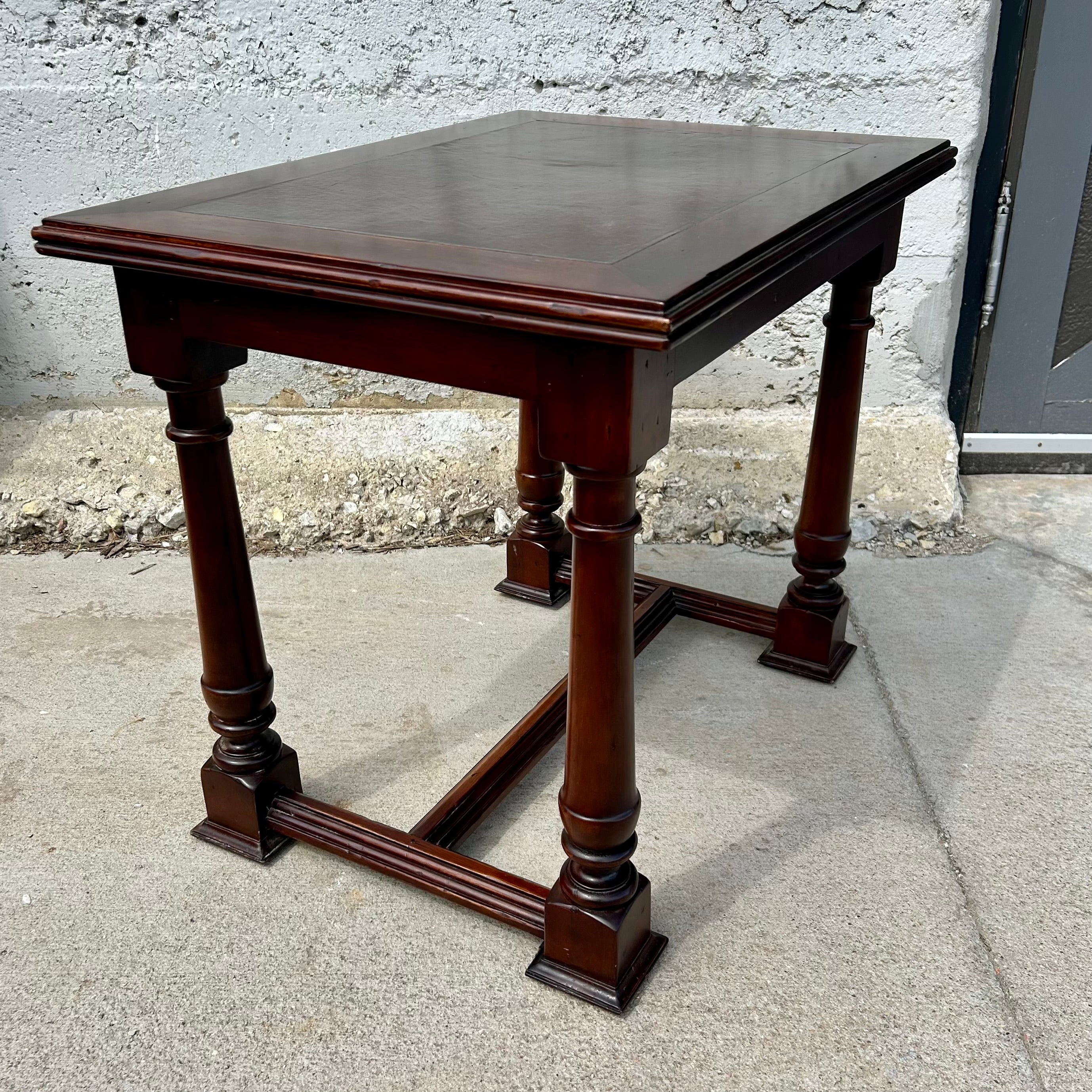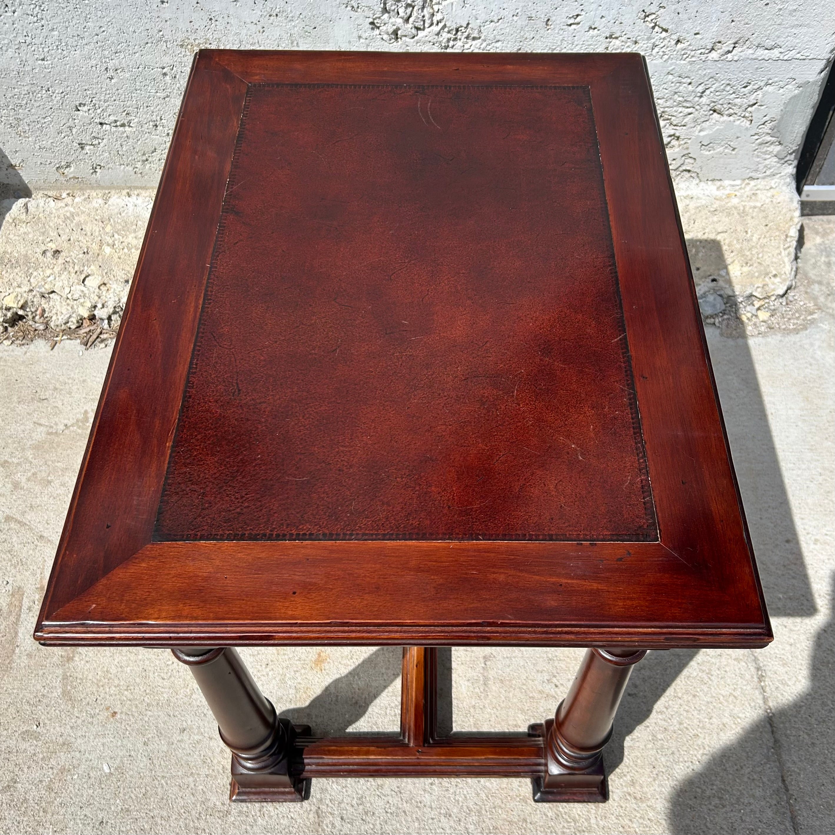 Southcone turned wood legs & leather inset top end table with dark finish.