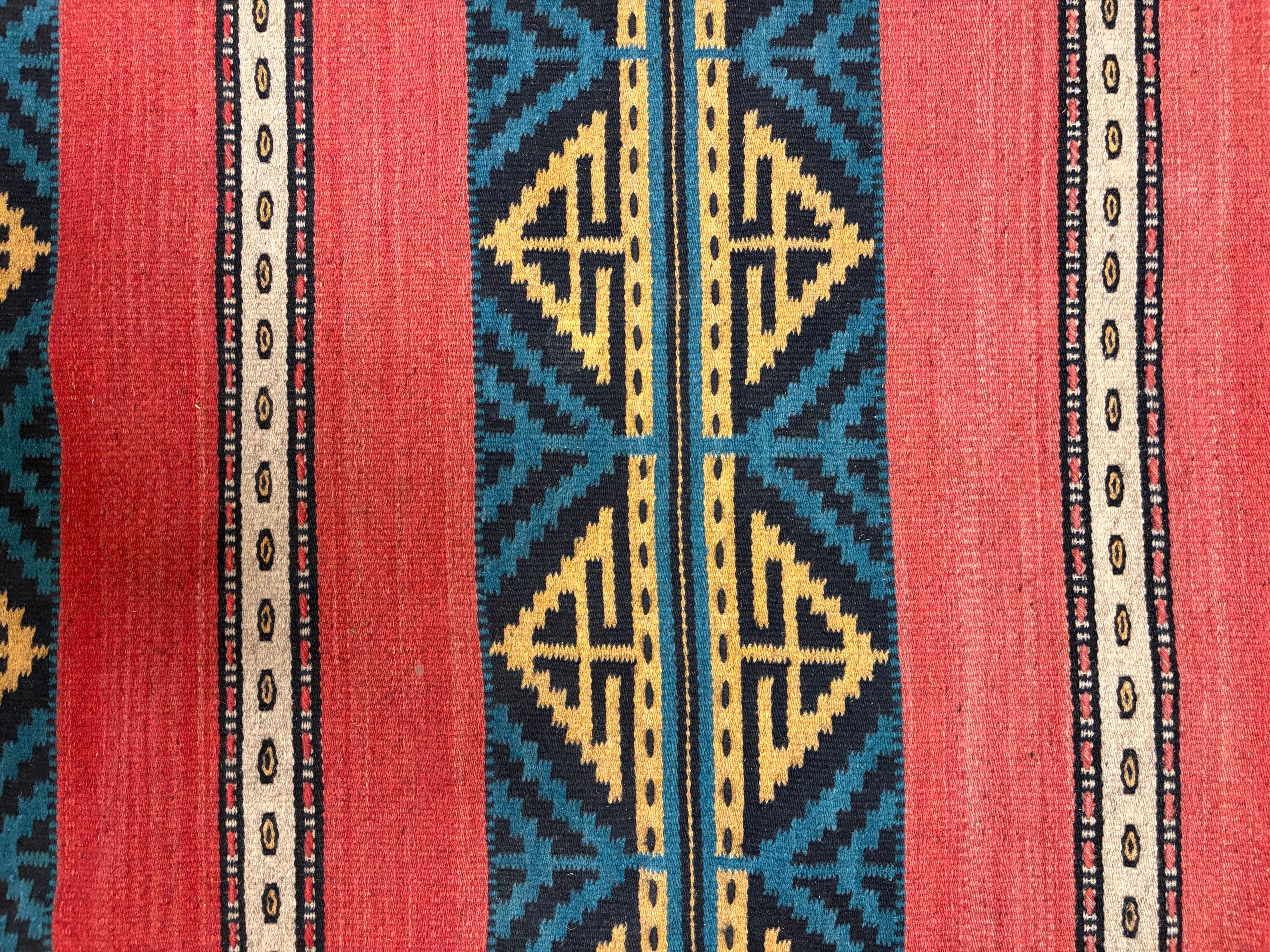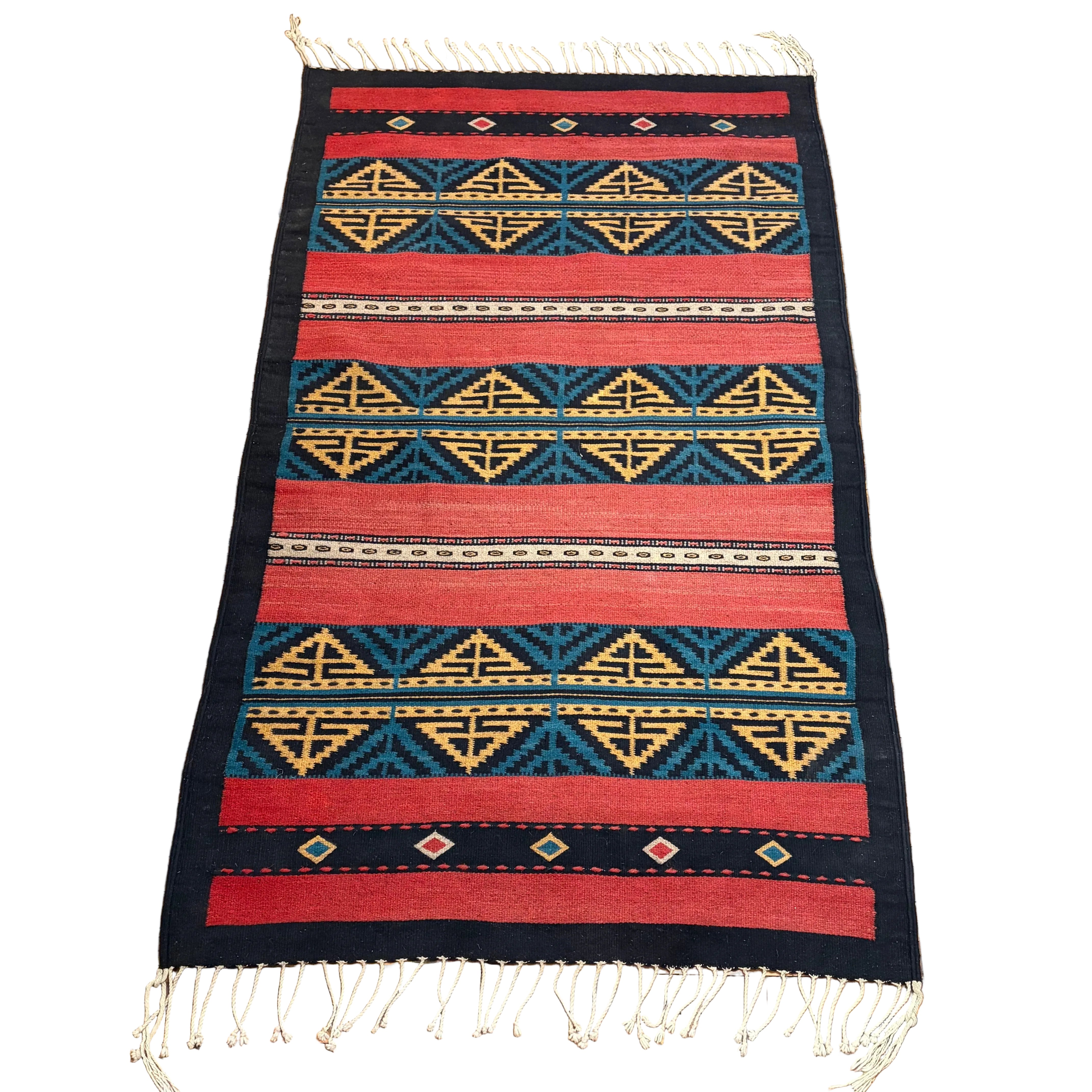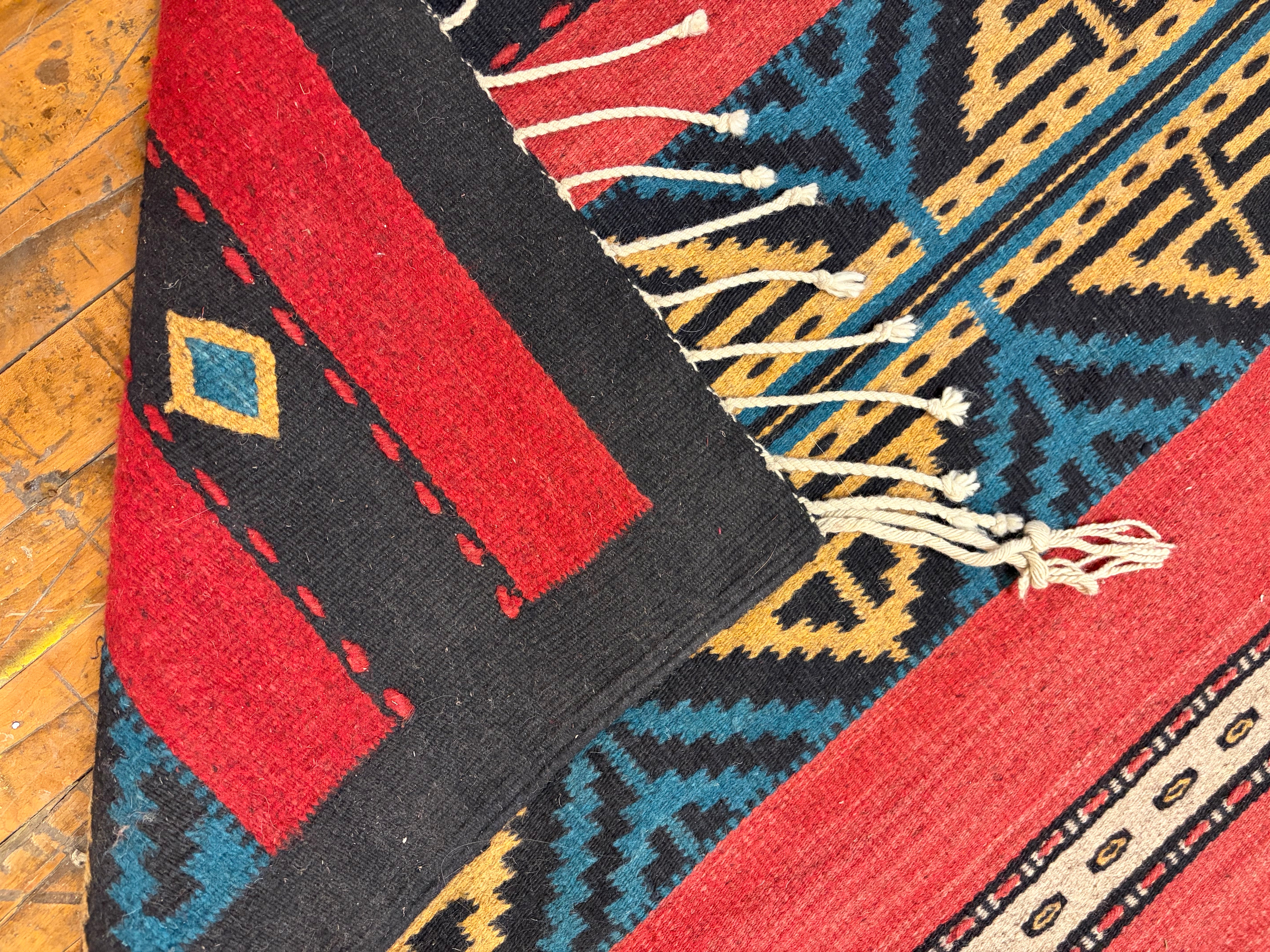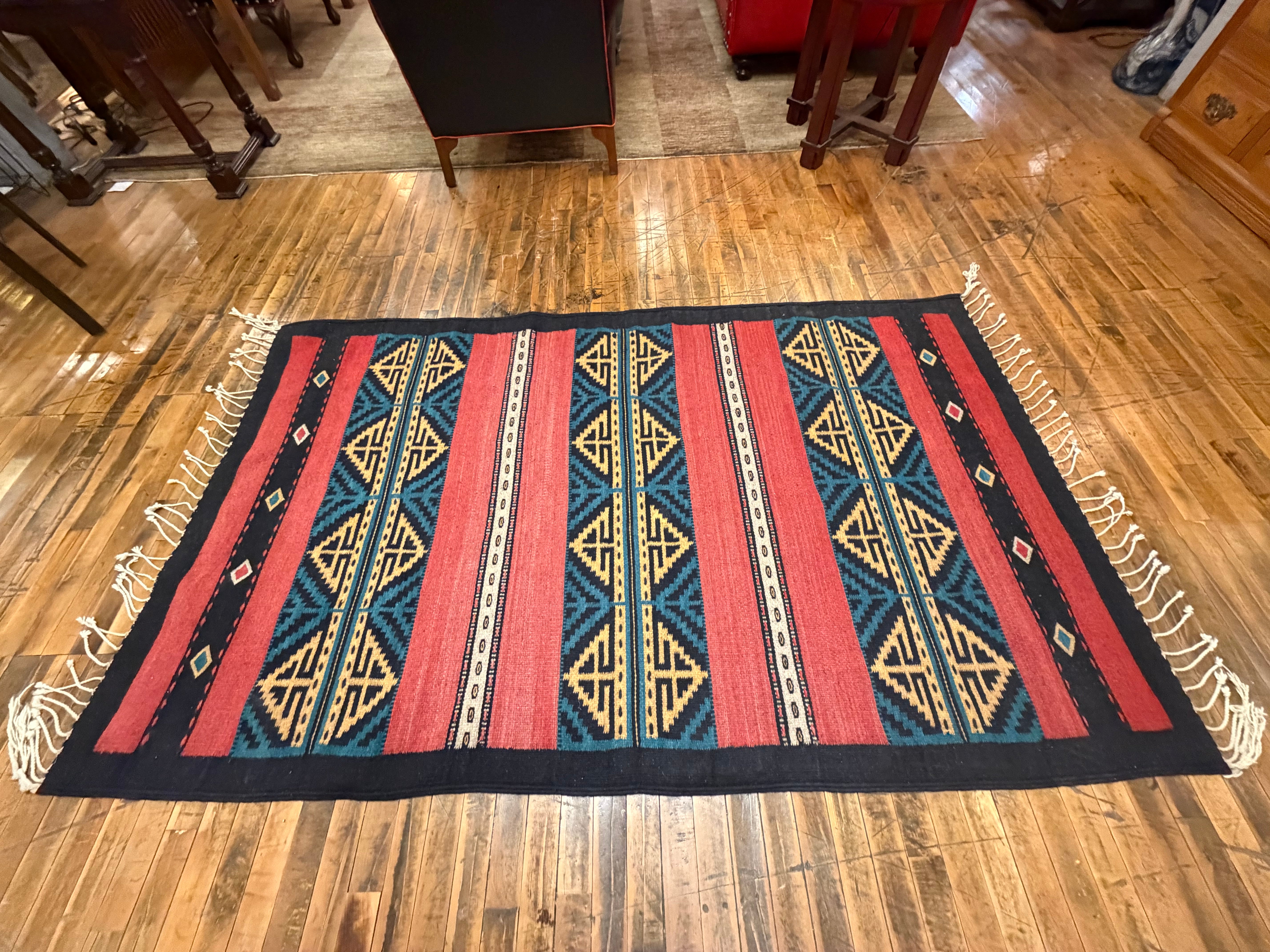 Wool Area Rug, 100% Wool, South West Style in Colors of Red, Black, Green, Yellow, and Brick Red. Hand Crafted in Mexico by the Zapotec Indians.