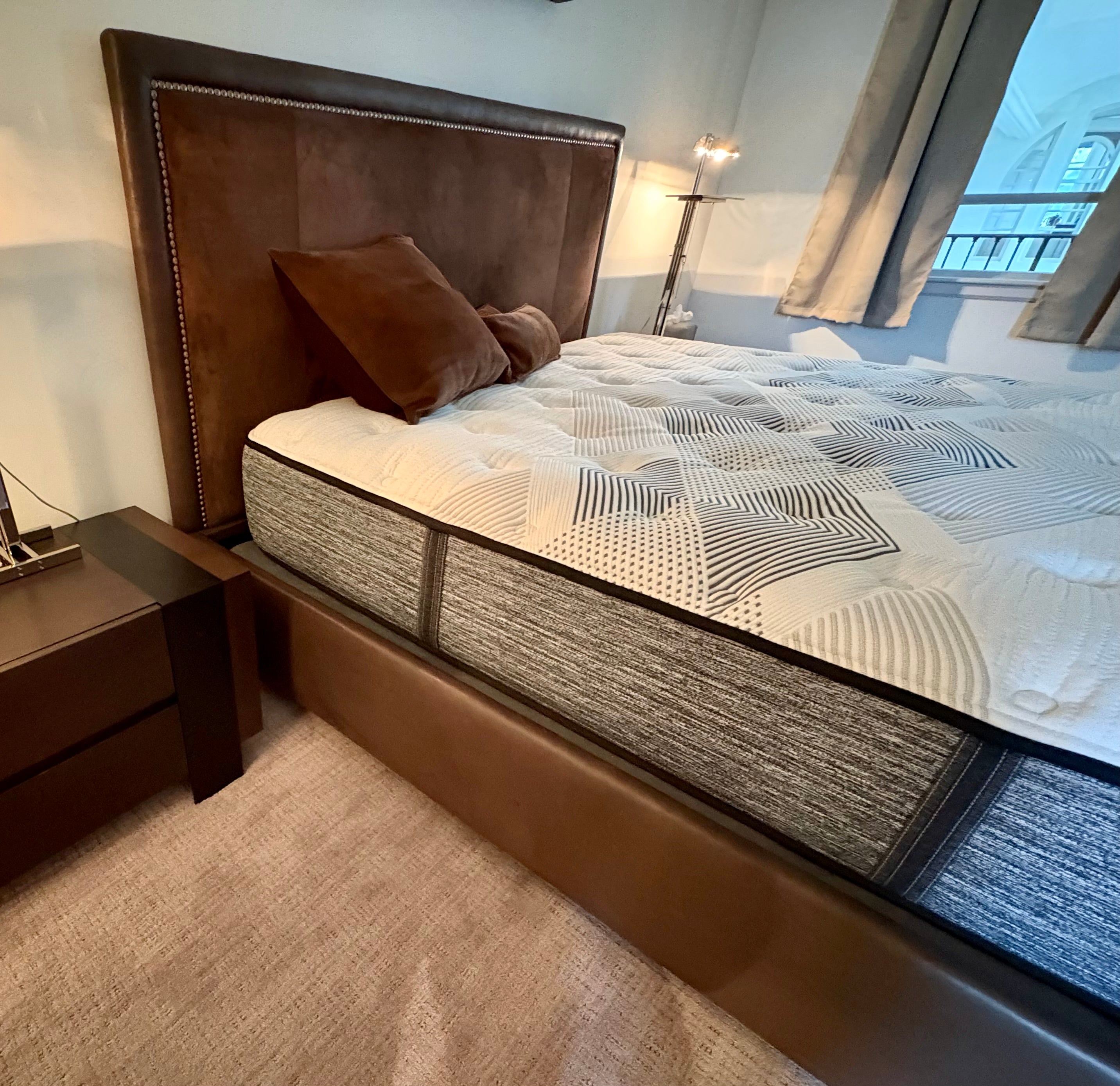 King size suede bed frame with bass nailhead headboard and leather sideboards. Note: this bed came out of a luxury home in Aspen, Co. and has had very little wear.