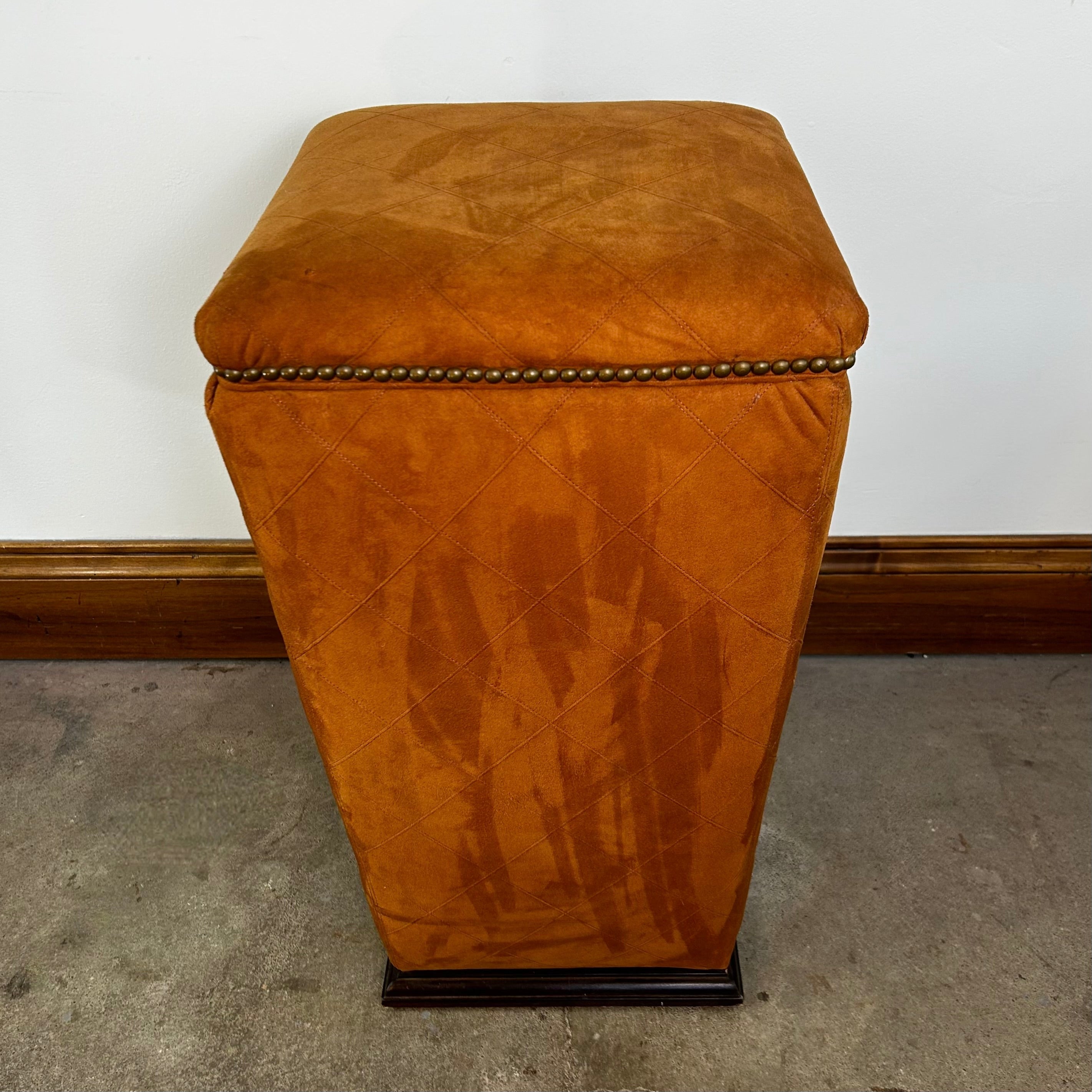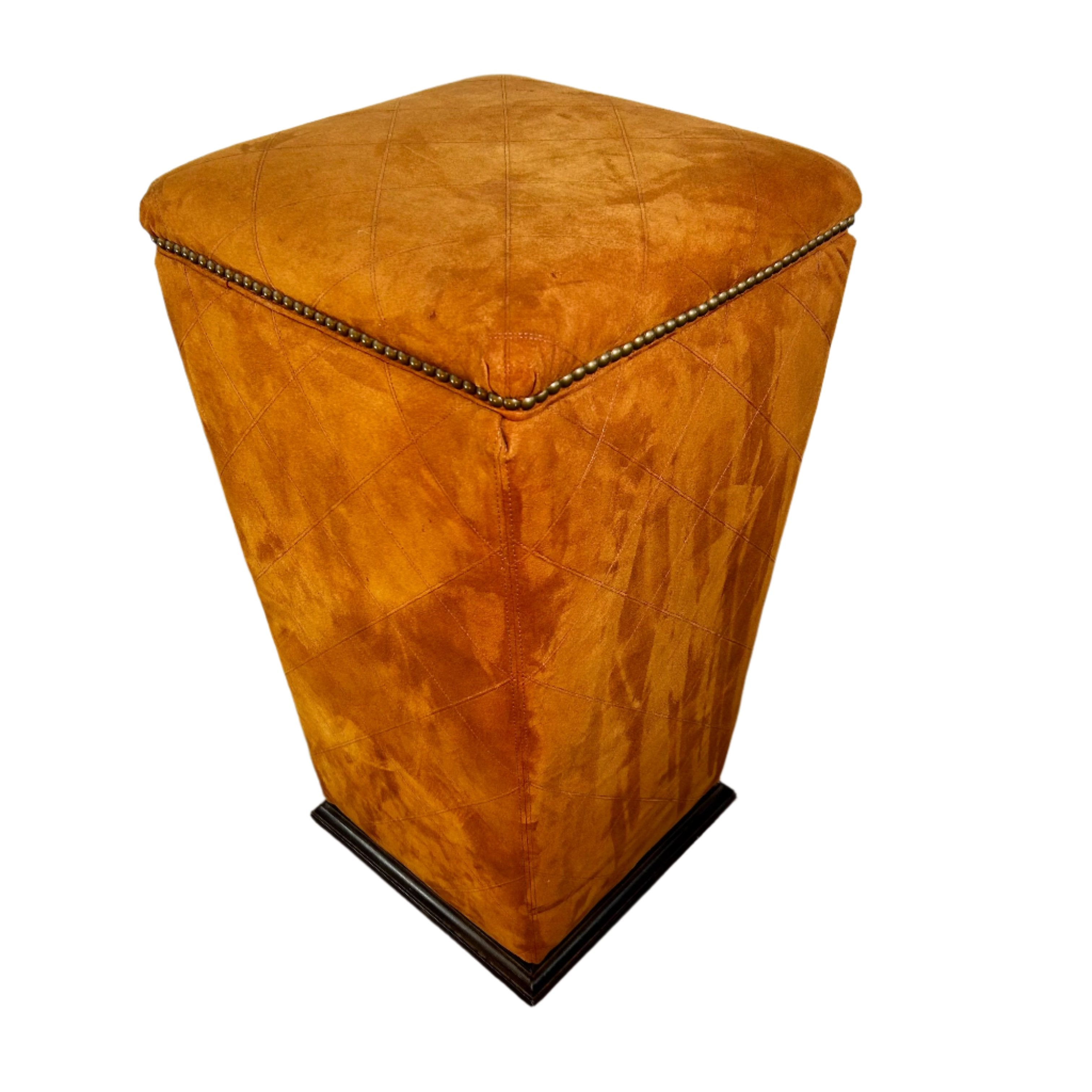 The ginger suede pedestal bar stool boasts a dark stained wood base and bronze nail head trim, adding a touch of sophistication to any space. Its soft suede leather upholstery provides both comfort and style.